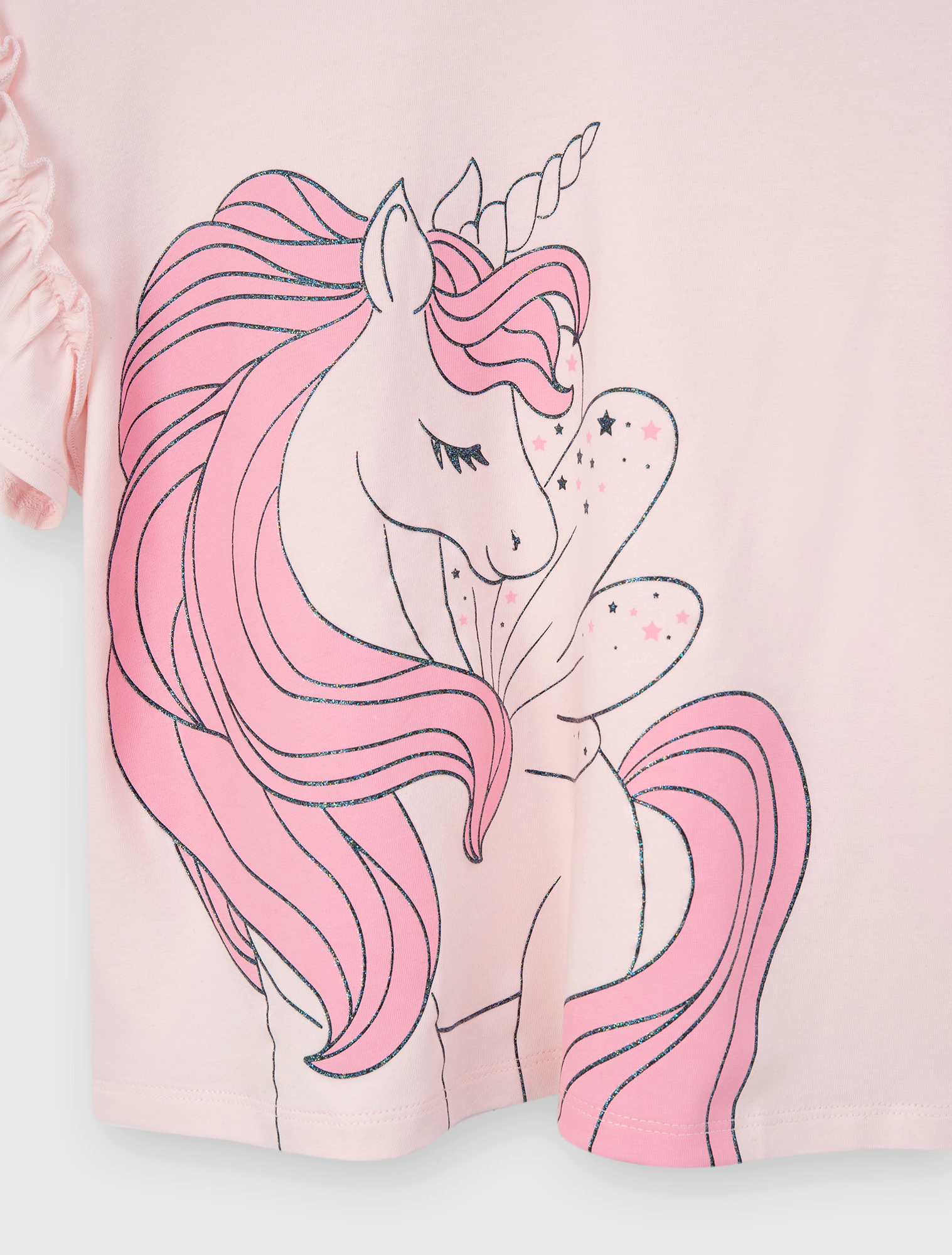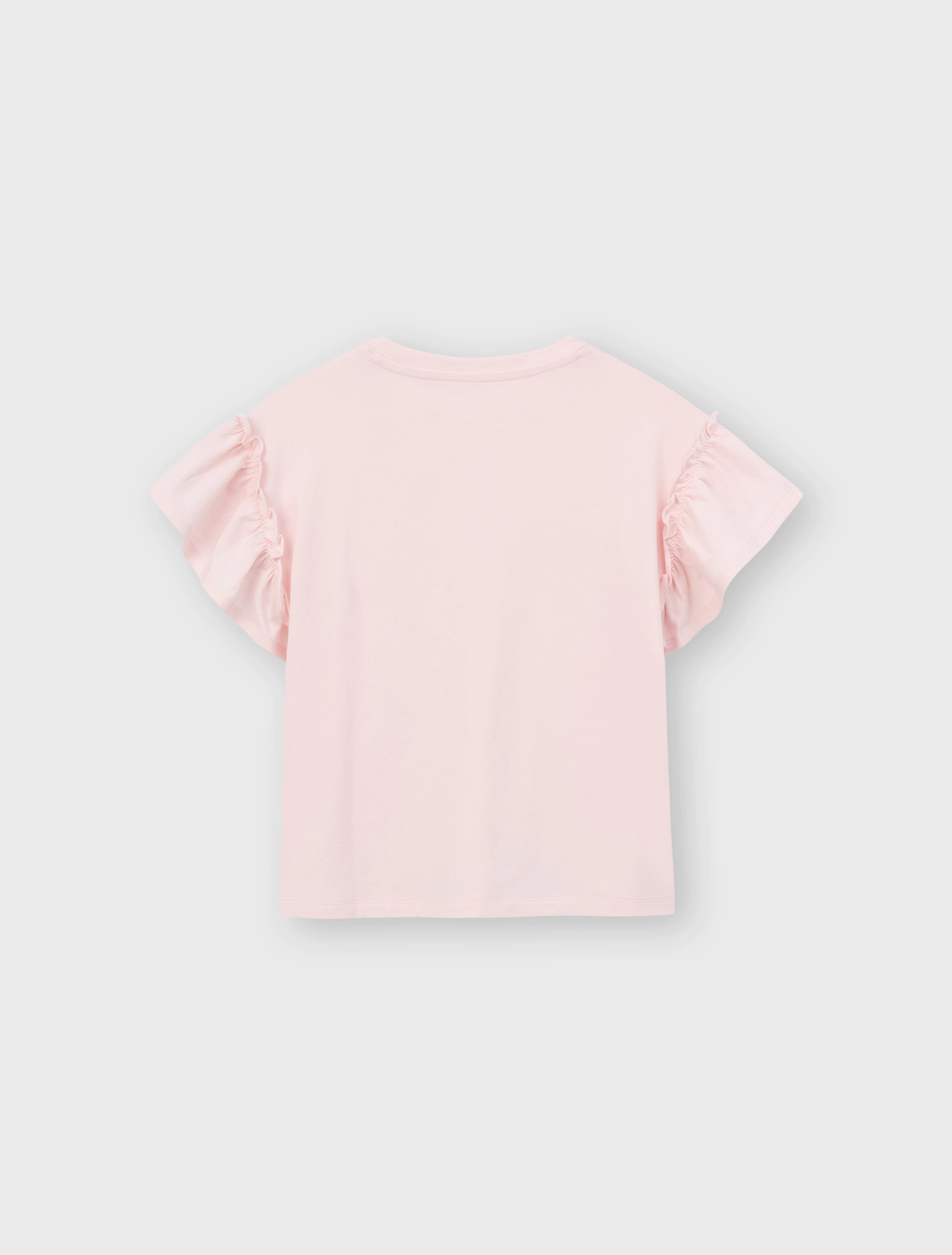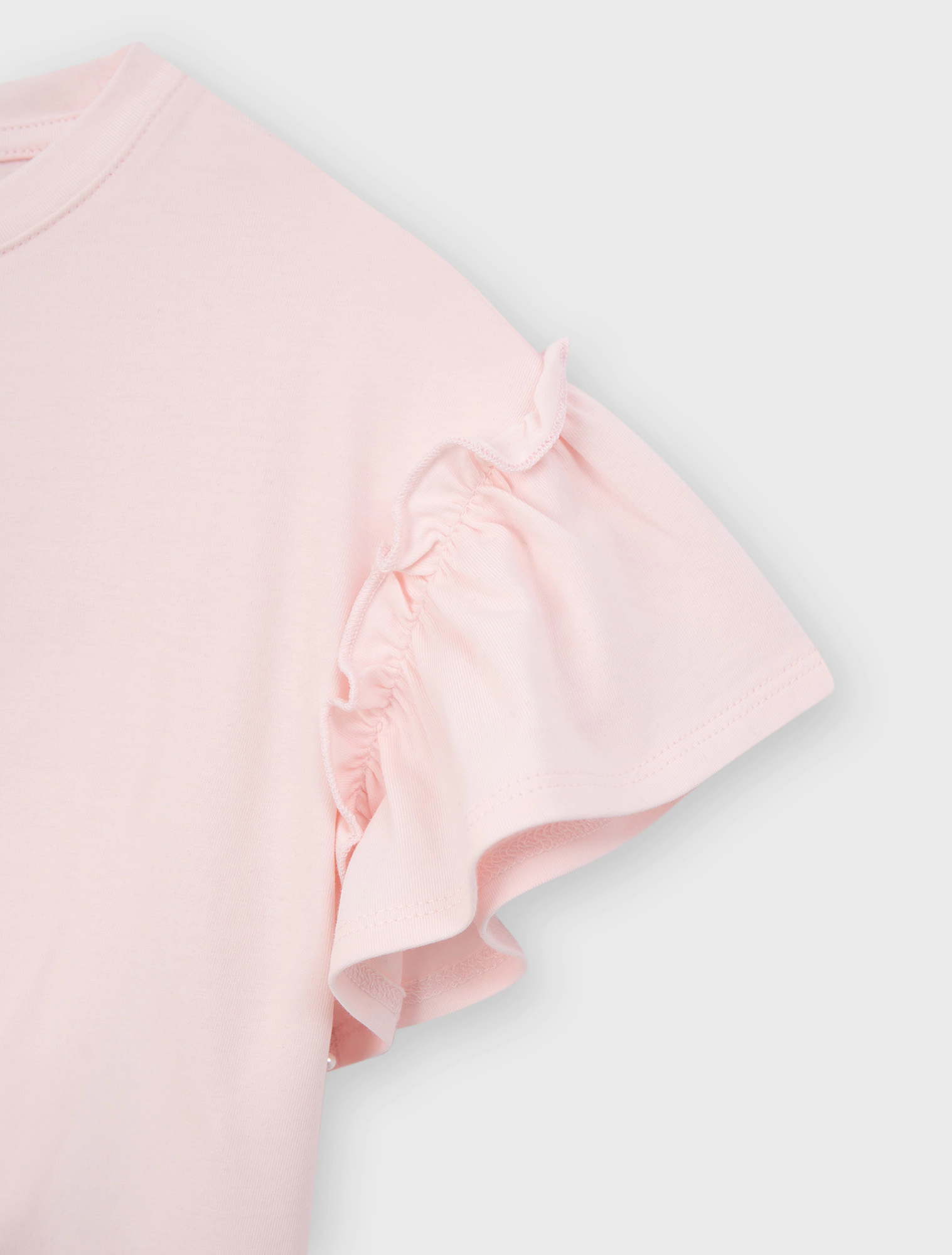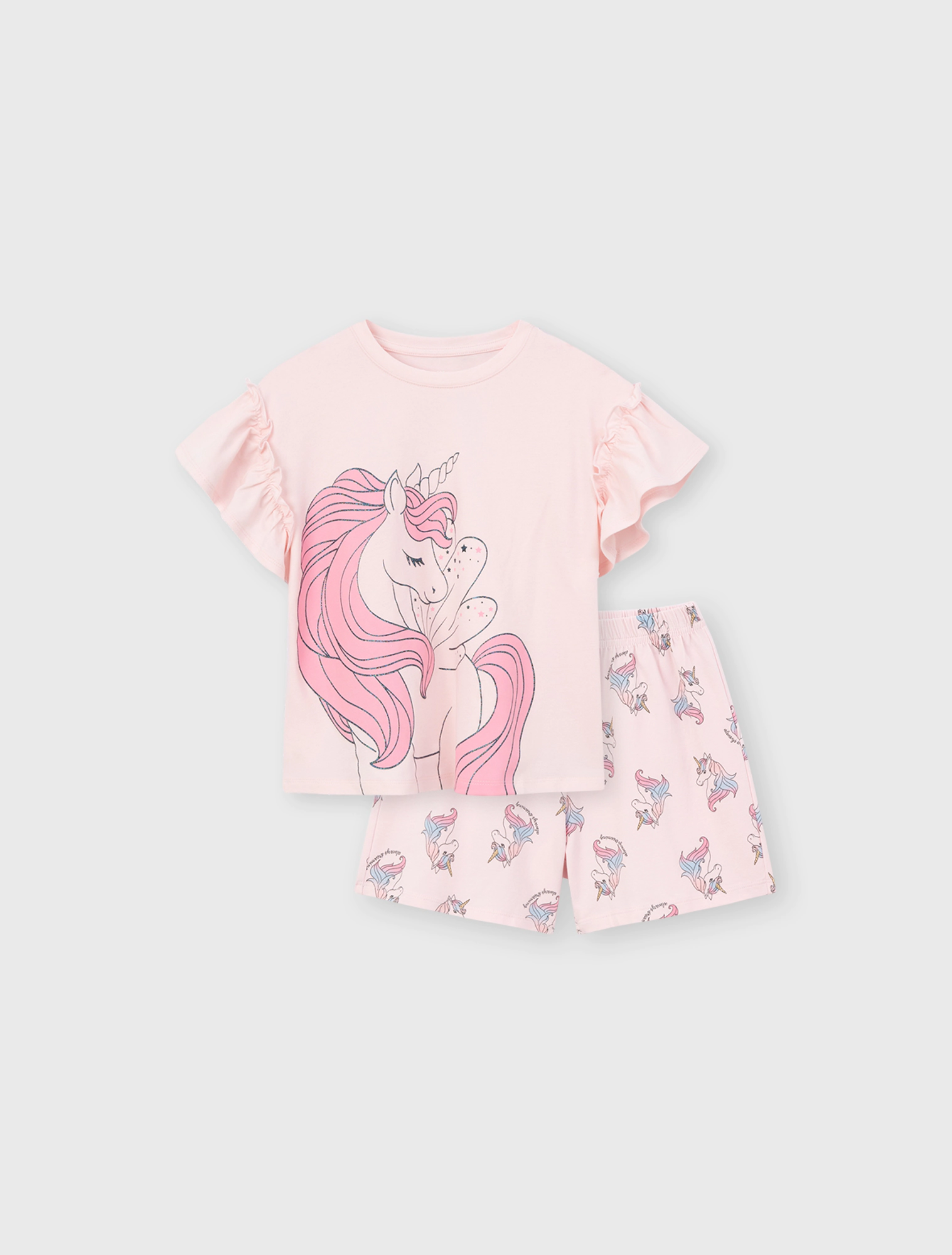 Bộ mặc nhà bé gái có hình in, phom dáng suông thoải mái, tay áo nhún bèo nữ tính.