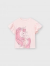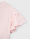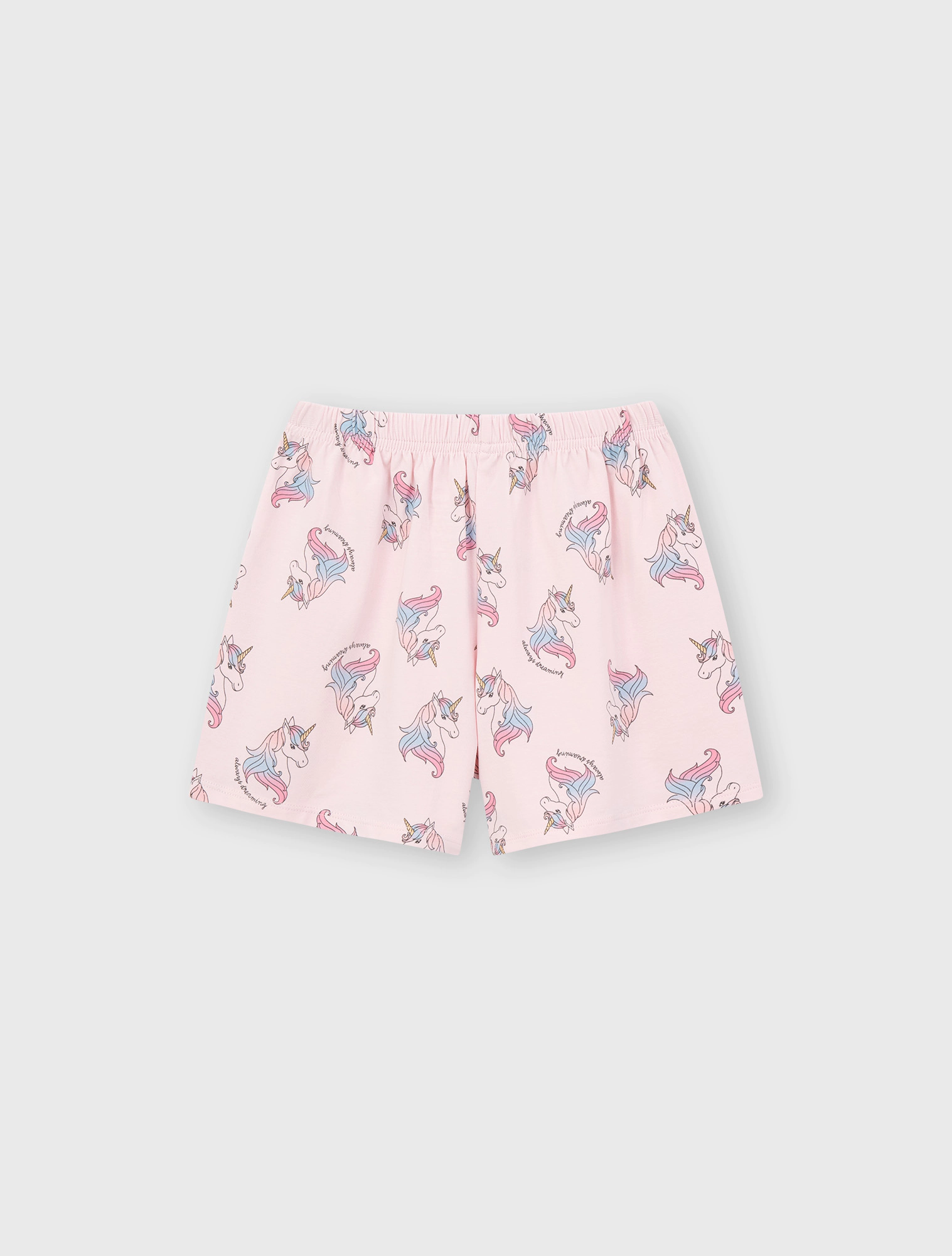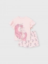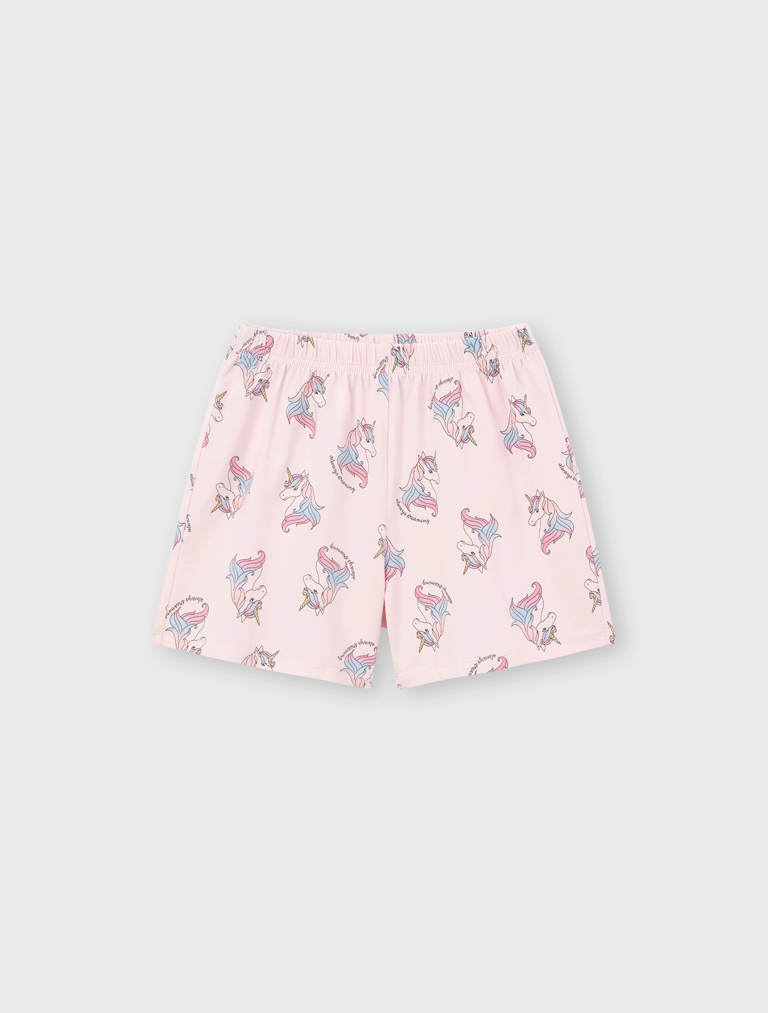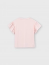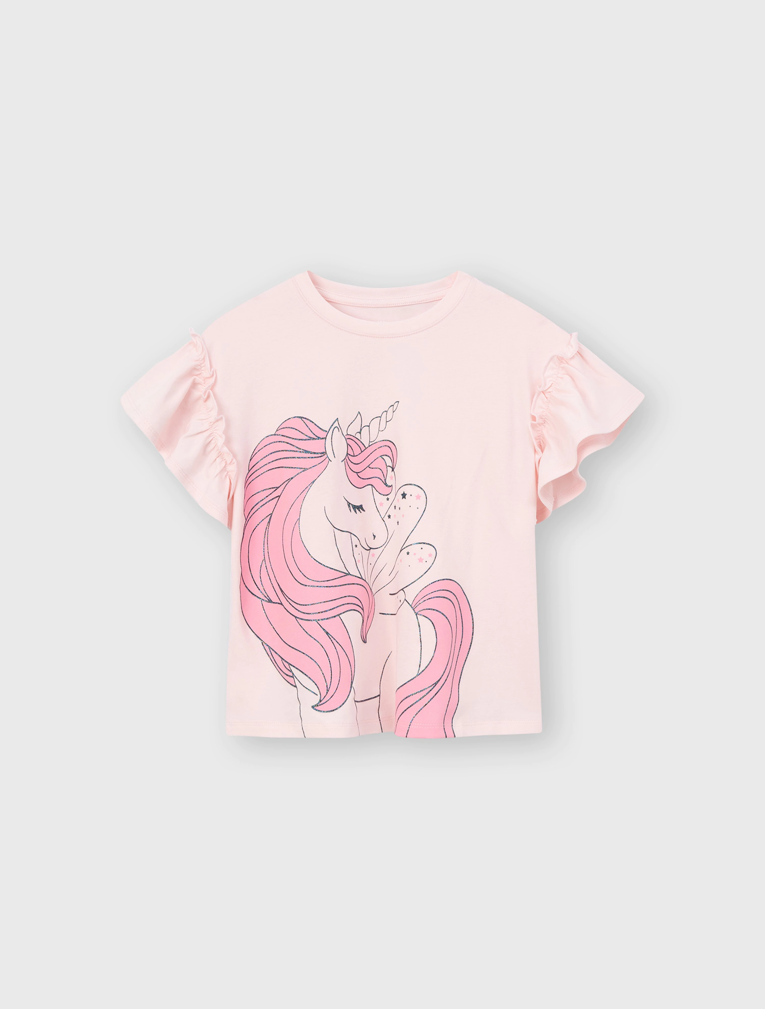 Bộ mặc nhà bé gái có hình in, phom dáng suông thoải mái, tay áo nhún bèo nữ tính.