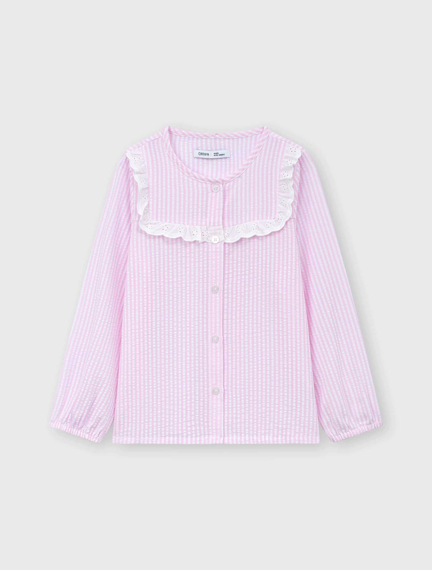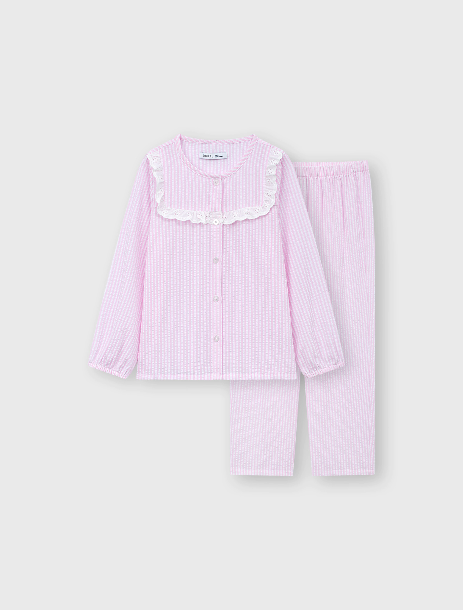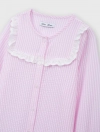 Bộ mặc nhà bé gái thu đông, phom dáng cơ bản dễ mặc. Quần dài, áo dài tay cổ tròn, ngực kẹp bèo ren trang trí nữ tính. Màu sắc, họa tiết tươi sáng, đáng yêu, phù hợp các hoạt động nghỉ ngơi cho bé gái. Nguyên liệu cotton pha mềm mại, dễ chịu
