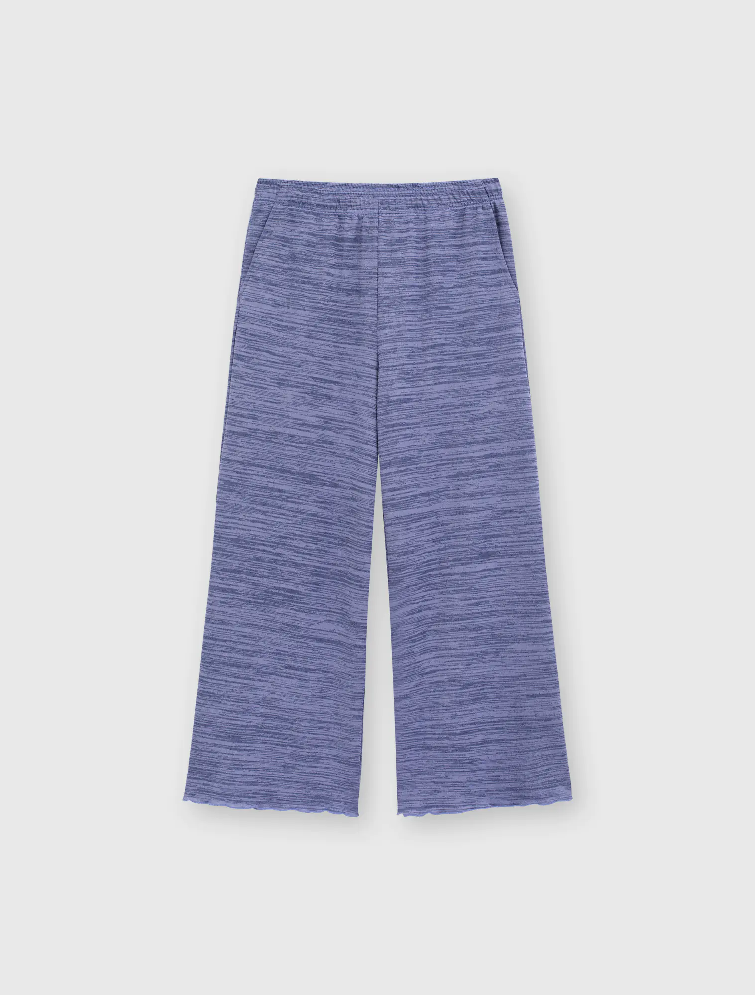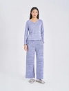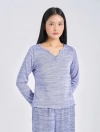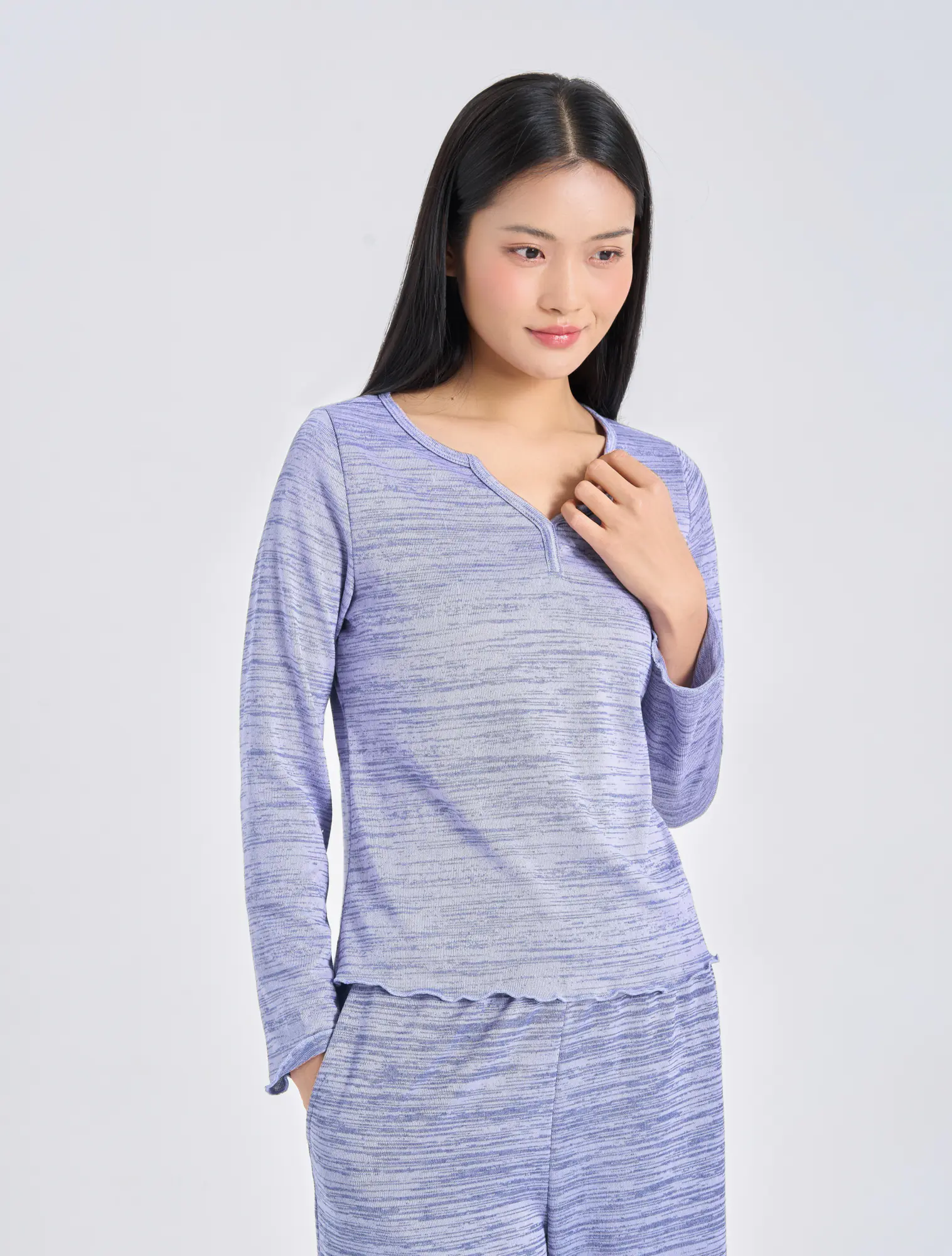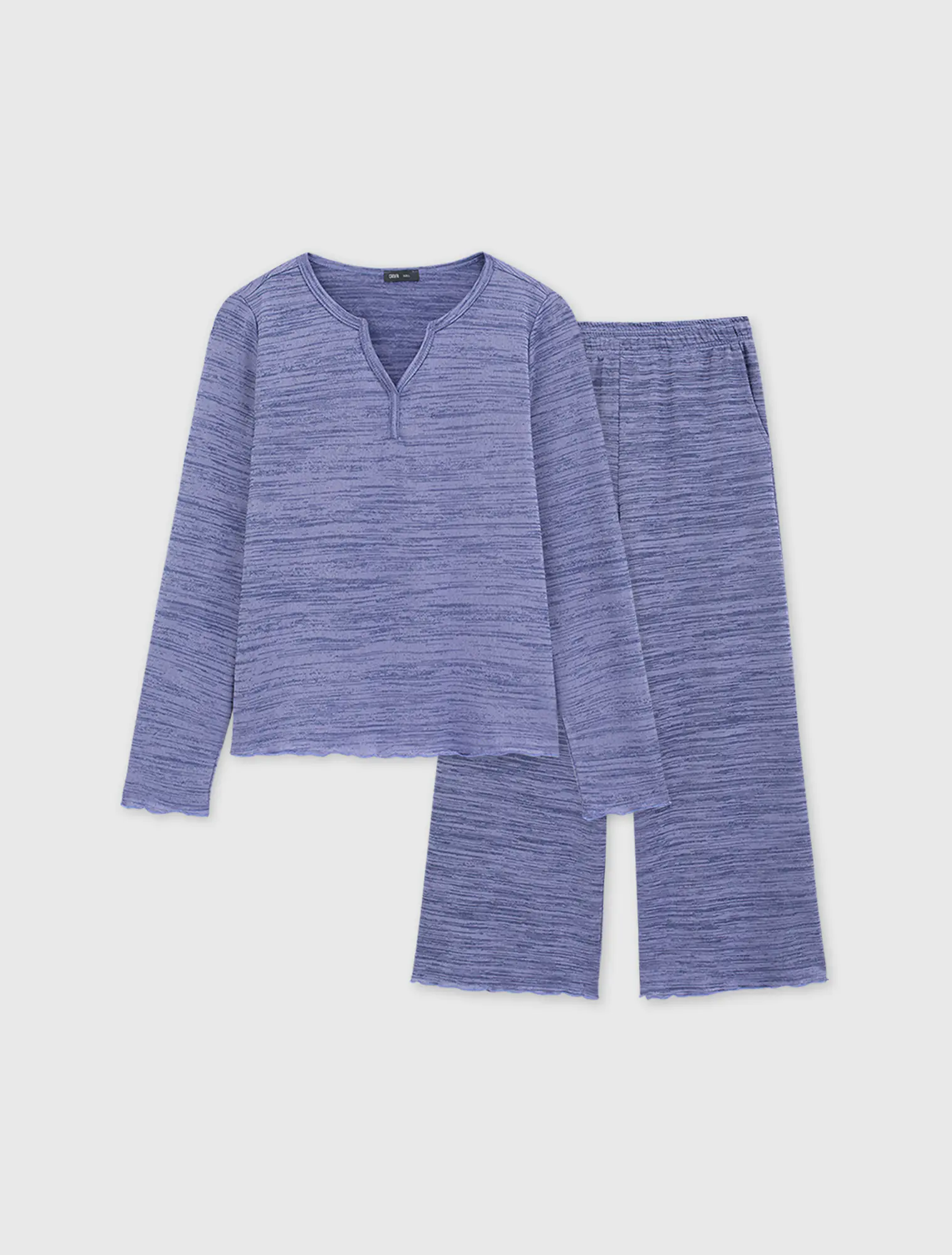 Bộ mặc nhà nữ quần suông, áo cổ cách điệu với các điểm nhấn cuốn bèo gấu tạo sự mềm mại nữ tính. Bề mặt vải dệt mix các sợi màu tạo nên 1 bộ sản phẩm đẹp và mới lạ.