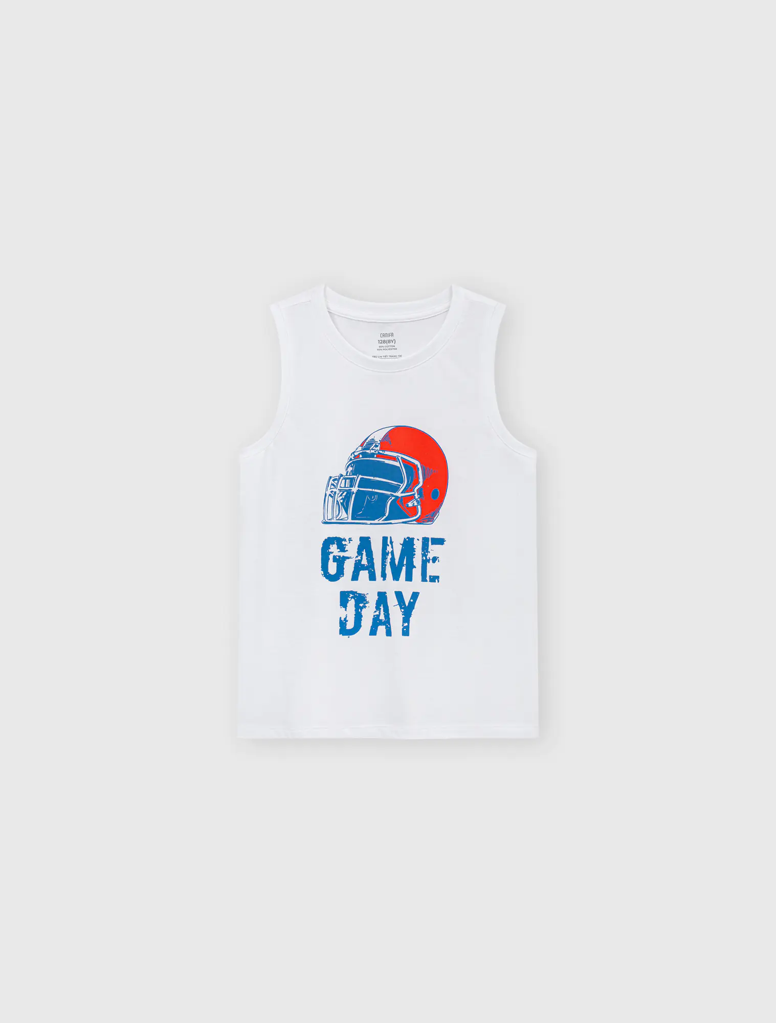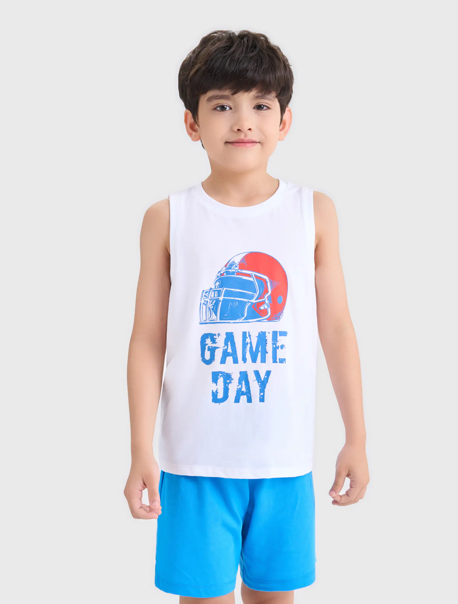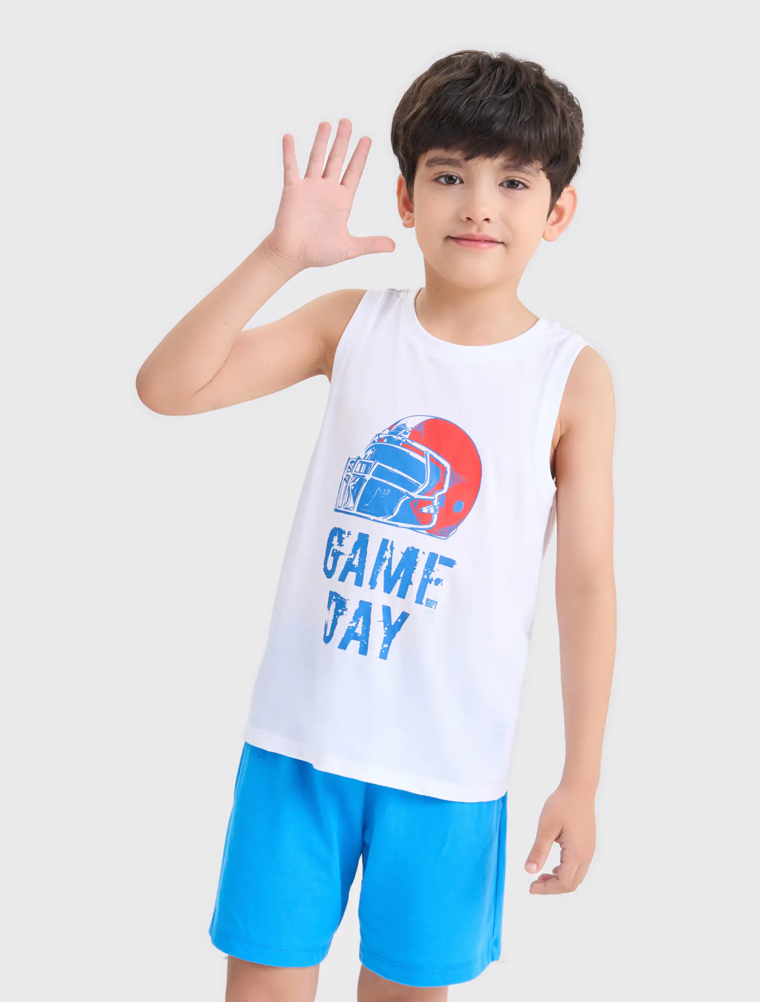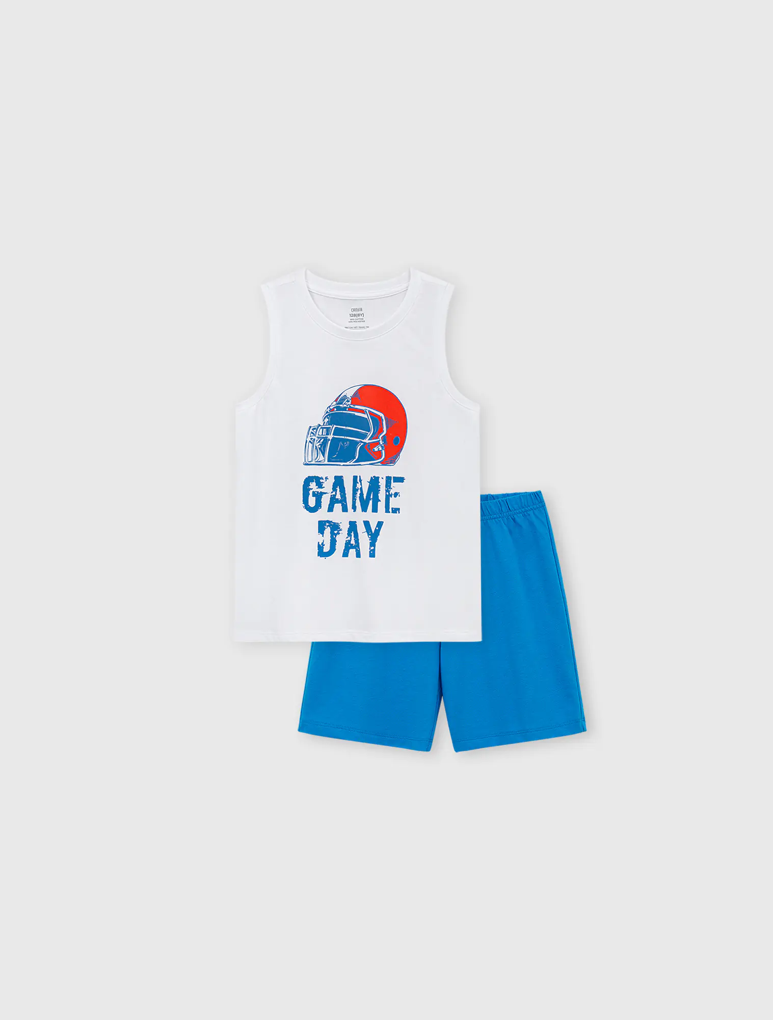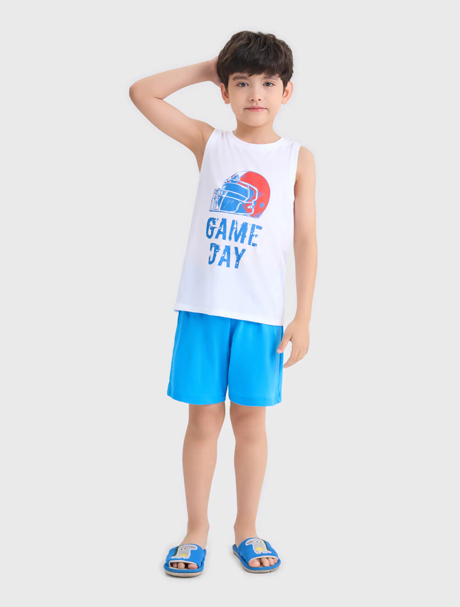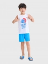 Bộ mặc nhà bé trai áo sát nách, quần cộc. Kiểu dáng cơ bản, dễ sử dụng. Màu sắc, hình in nam tính.