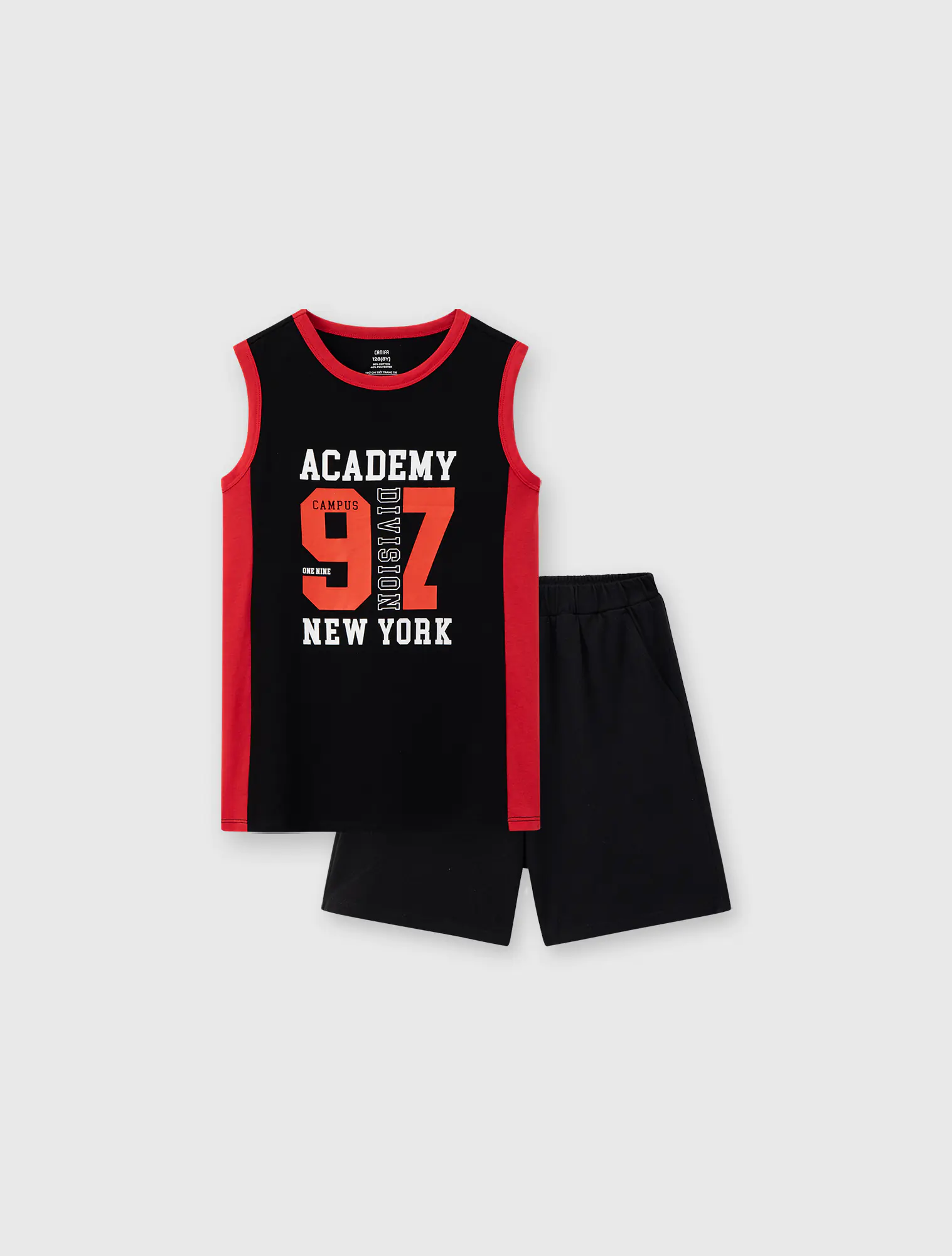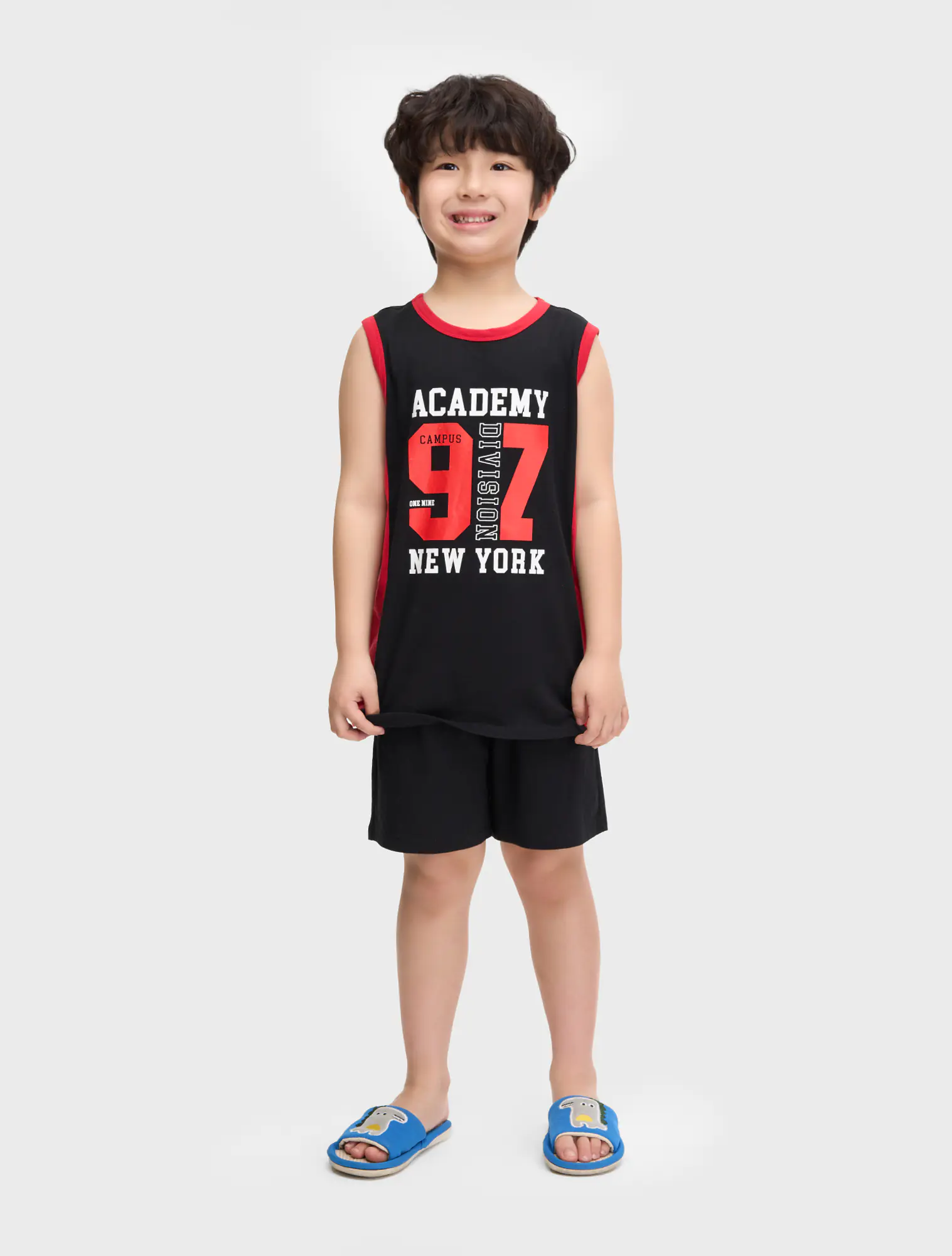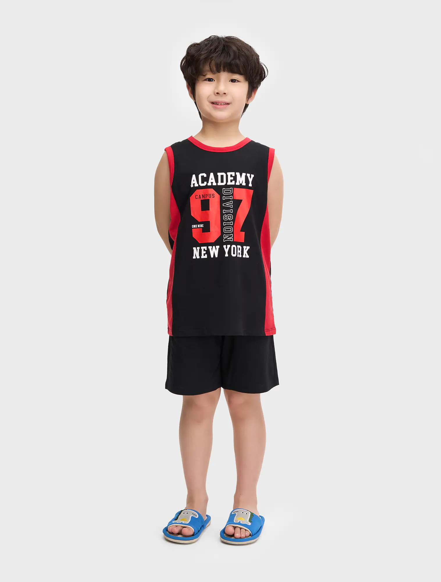 Bộ mặc nhà bé trai áo ba lỗ, quần sooc. Phom dáng cơ bản dễ mặc, màu sắc và hình in phù hợp bé trai.