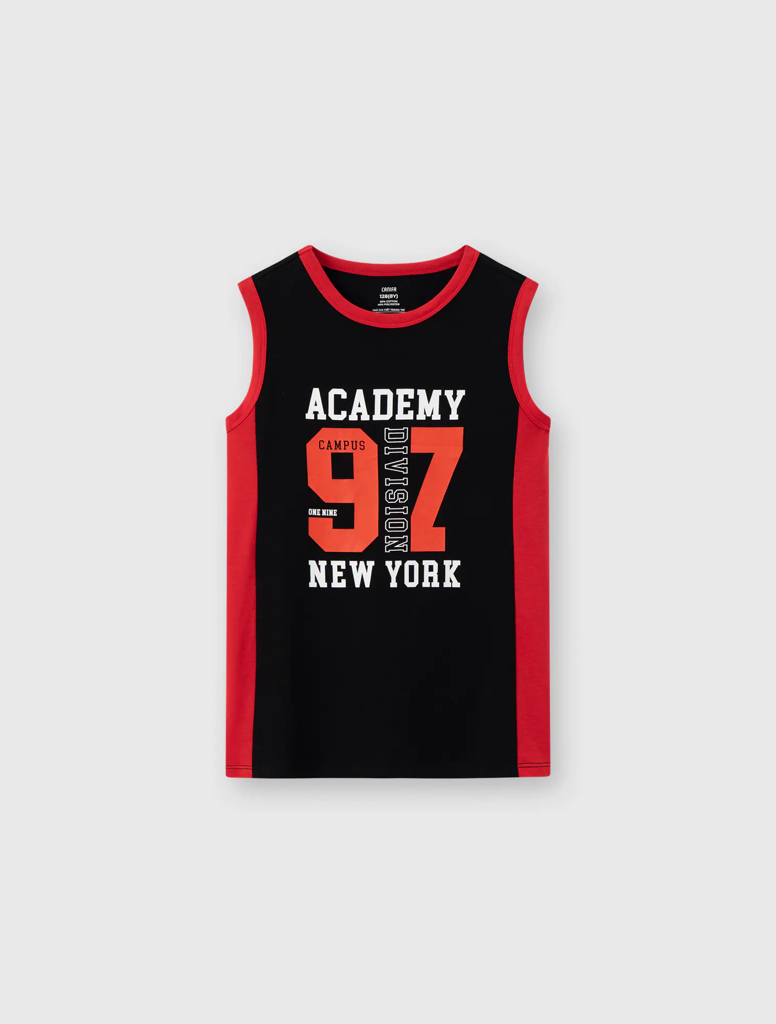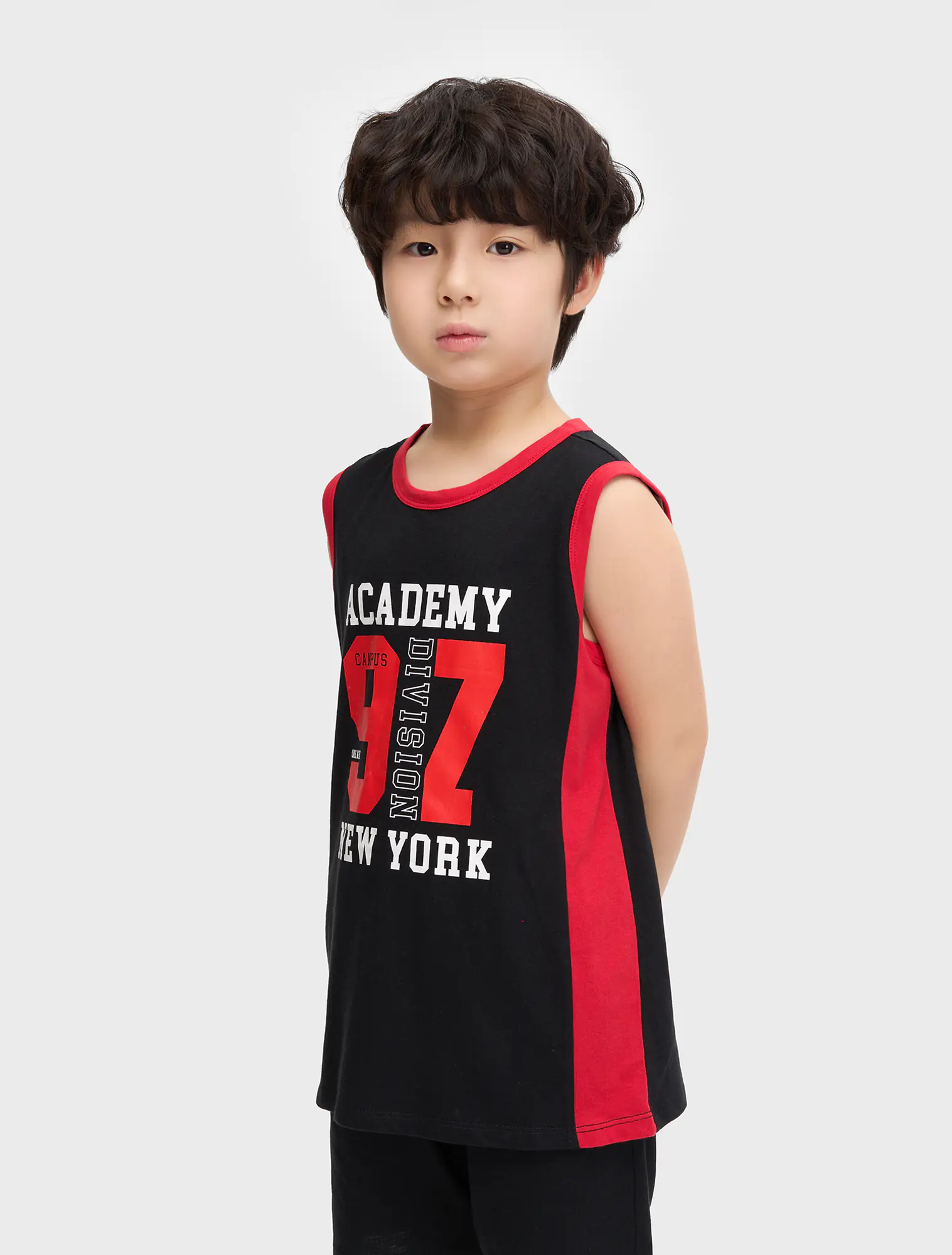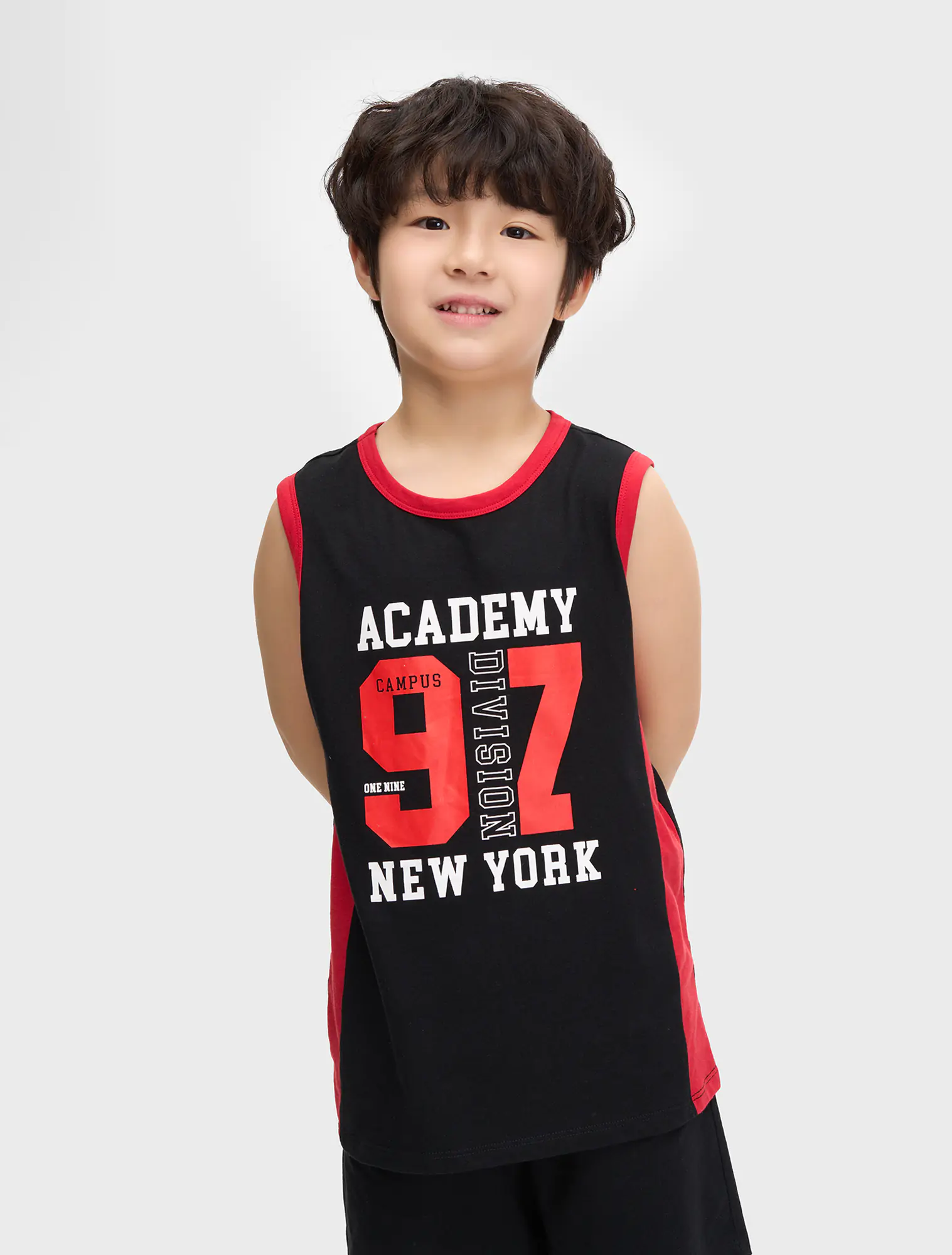 Bộ mặc nhà bé trai áo ba lỗ, quần sooc. Phom dáng cơ bản dễ mặc, màu sắc và hình in phù hợp bé trai.