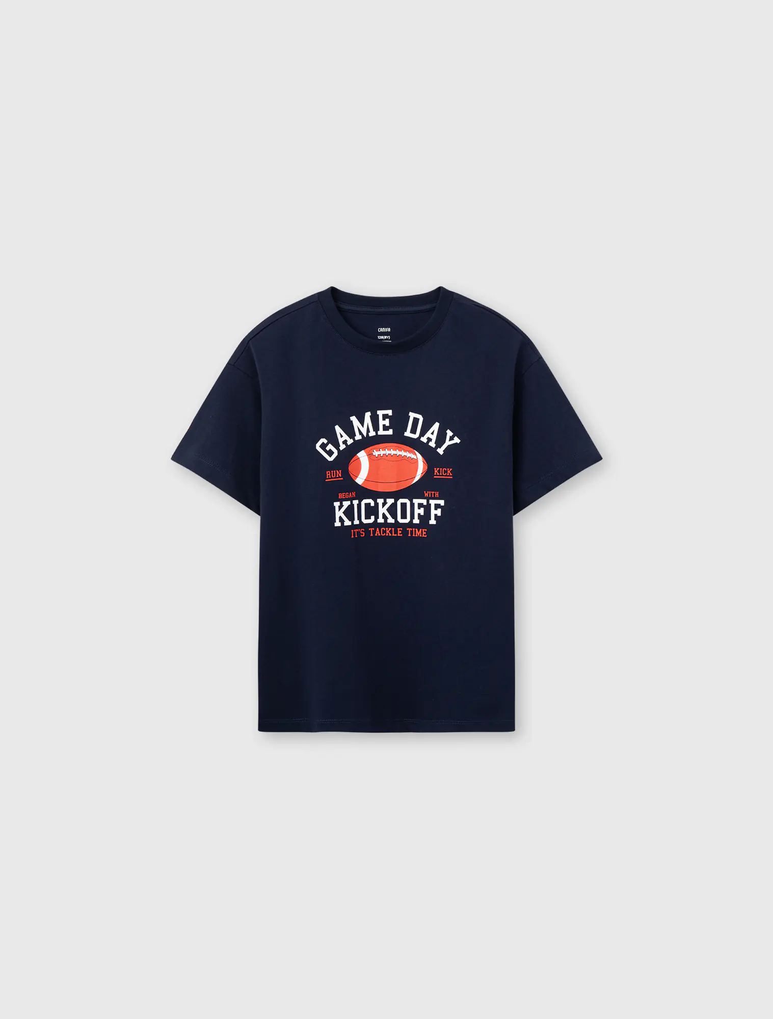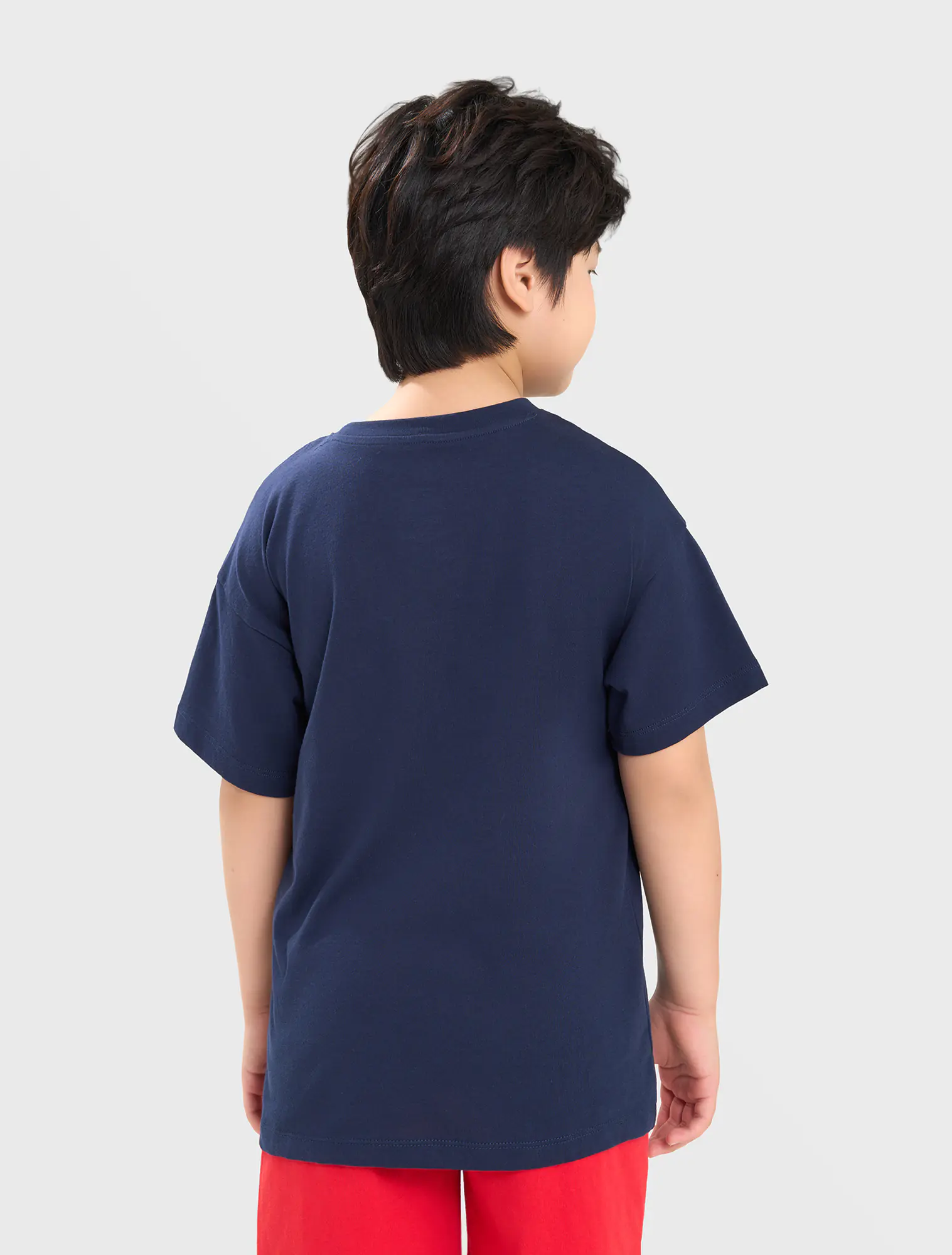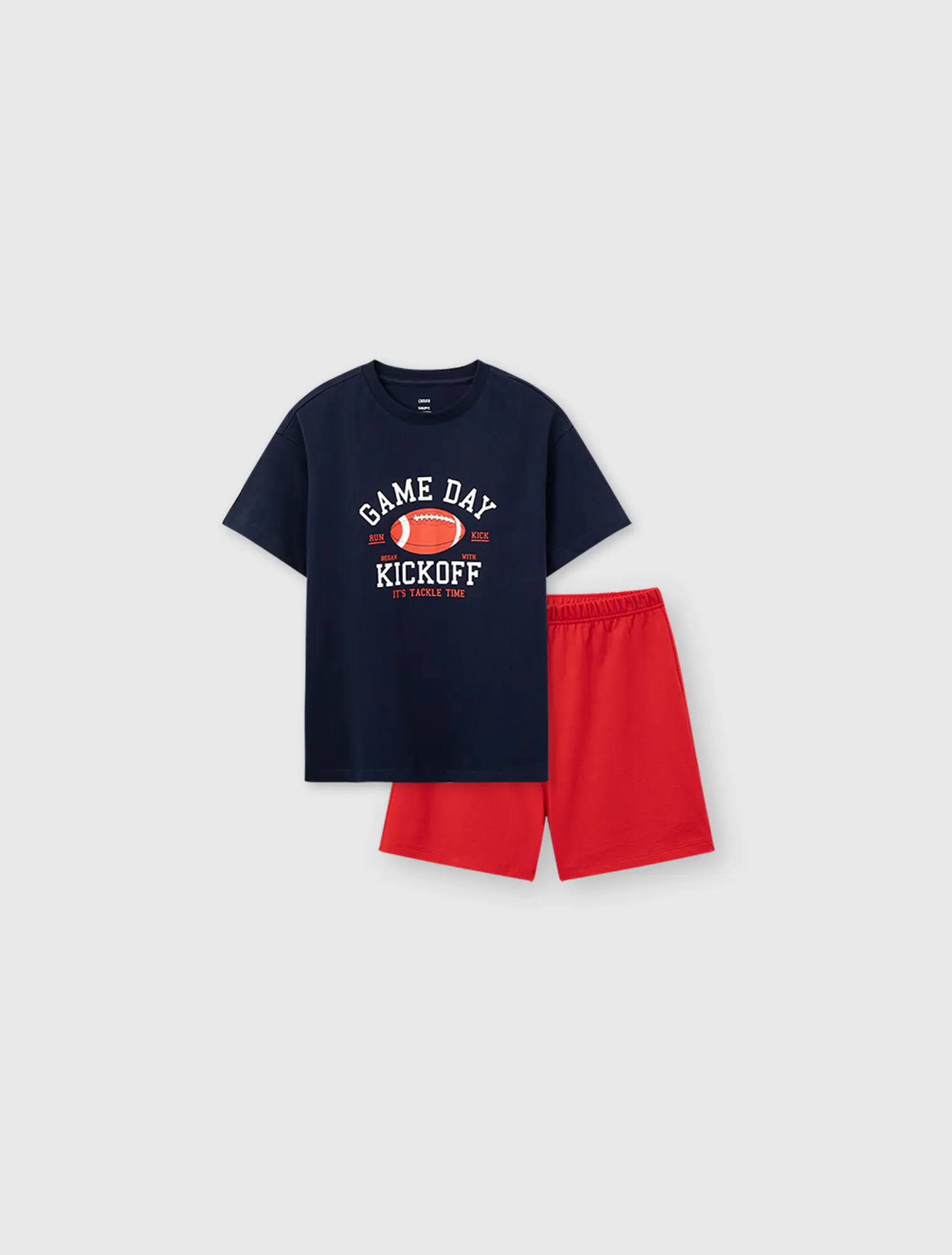 Bộ đồ ngủ bé trai, áo phông quần đùi. Phom dáng cơ bản, kết hợp màu áo quần khác nhau, hình in khỏe khoắn, nam tính.