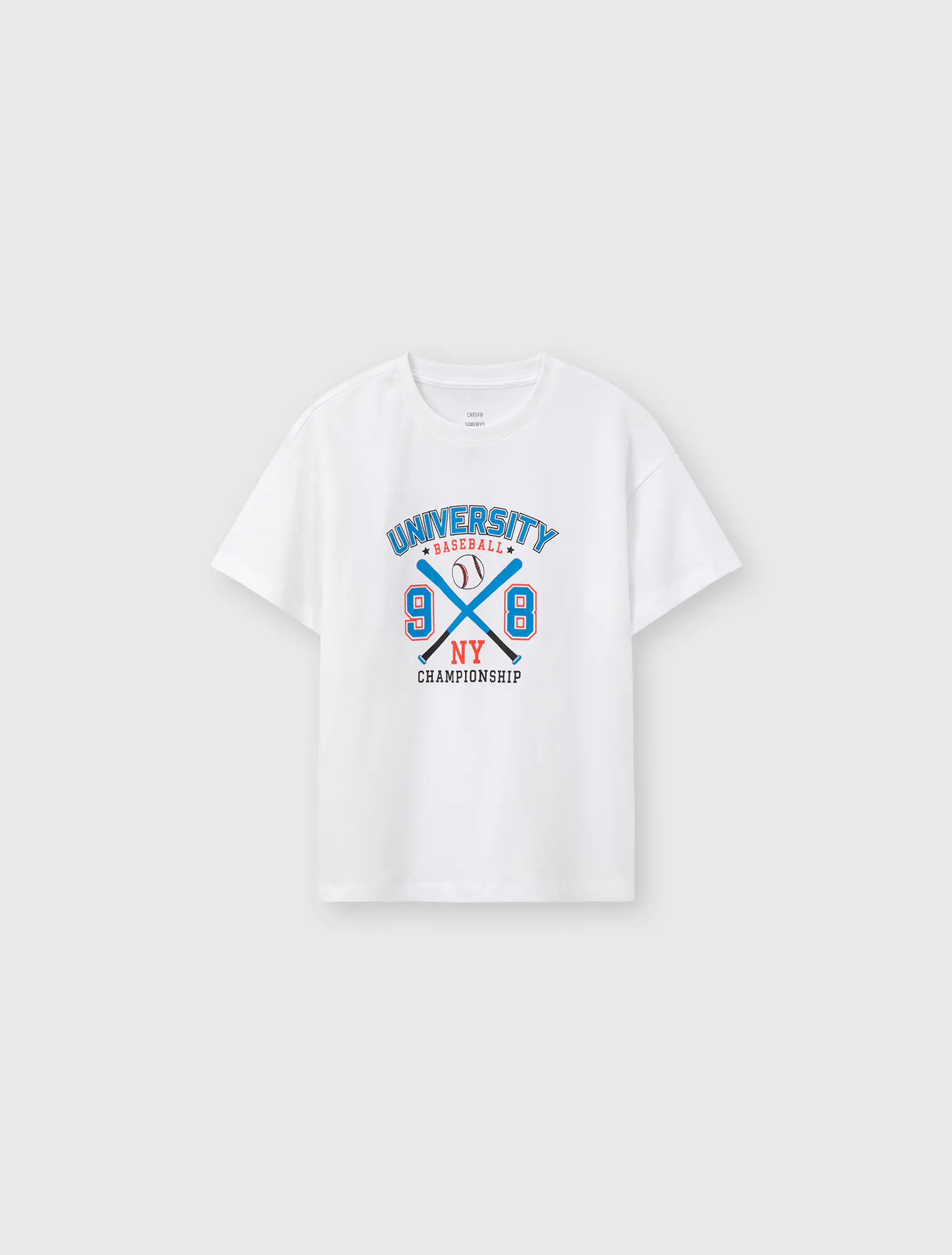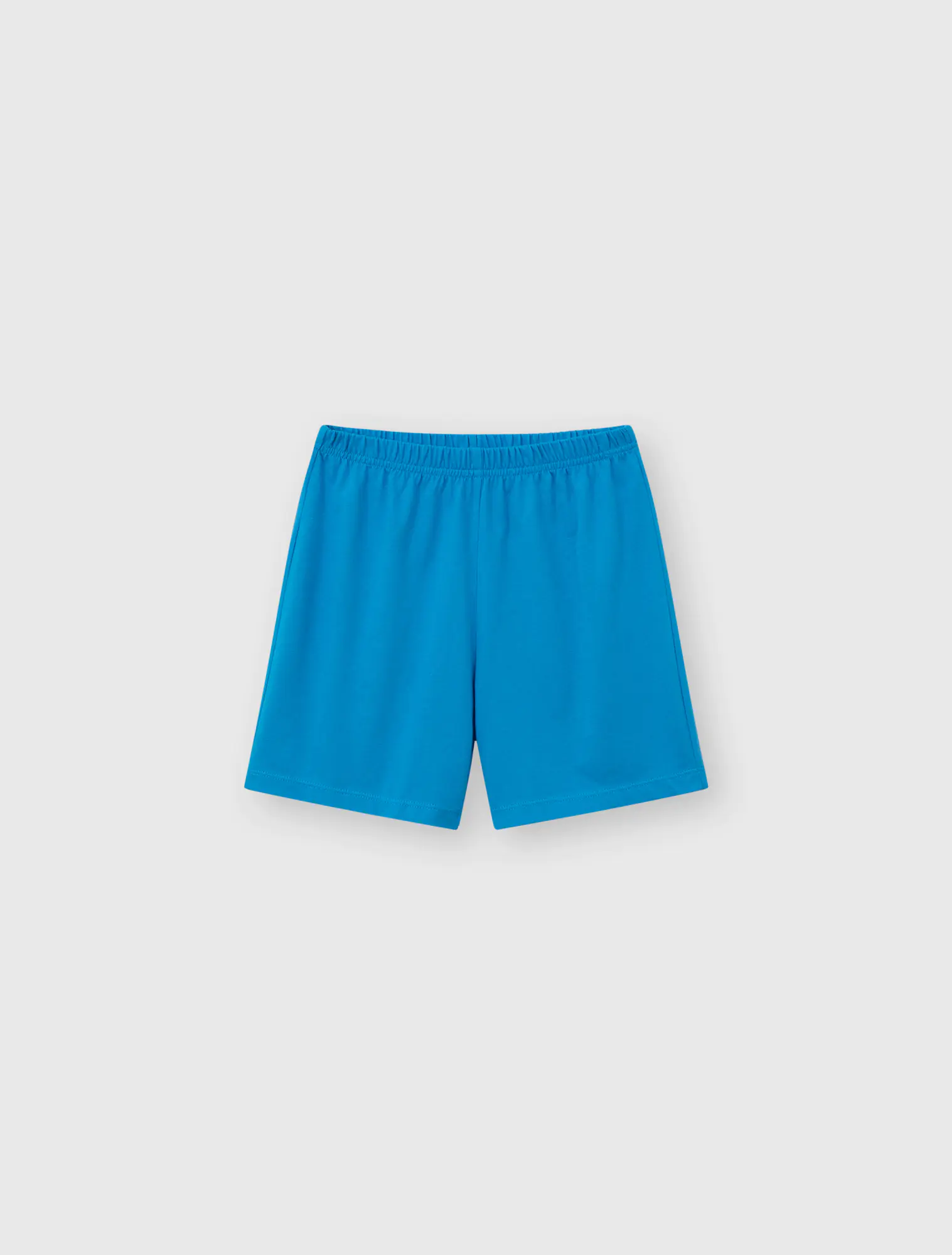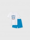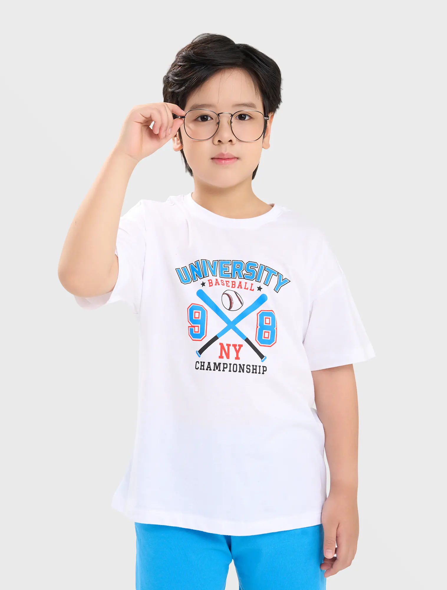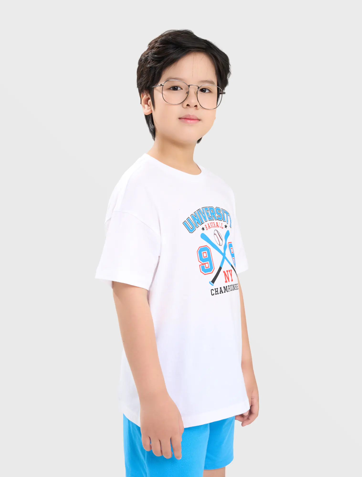 Bộ đồ ngủ bé trai, áo phông quần đùi. Phom dáng cơ bản, kết hợp màu áo quần khác nhau, hình in khỏe khoắn, nam tính.