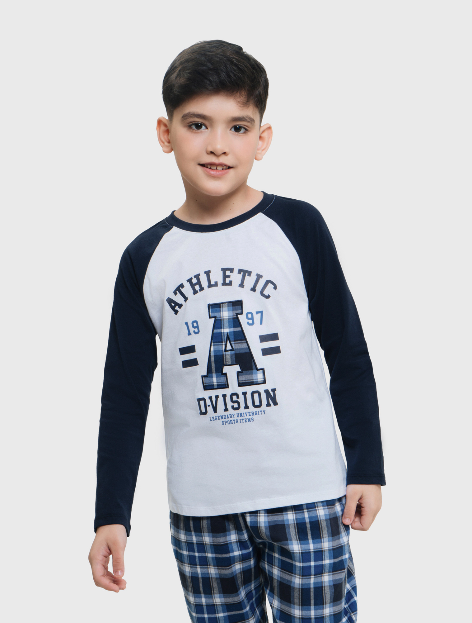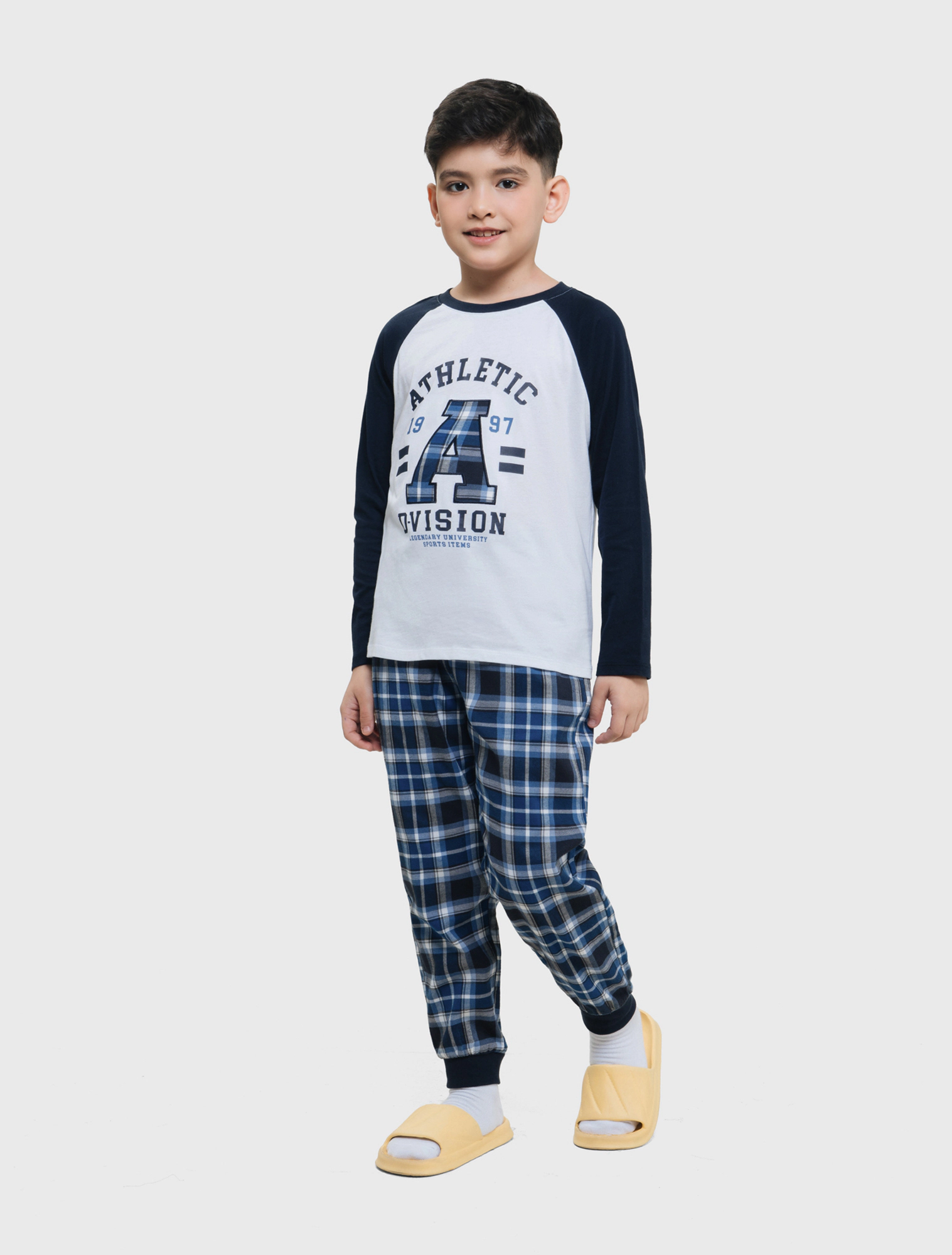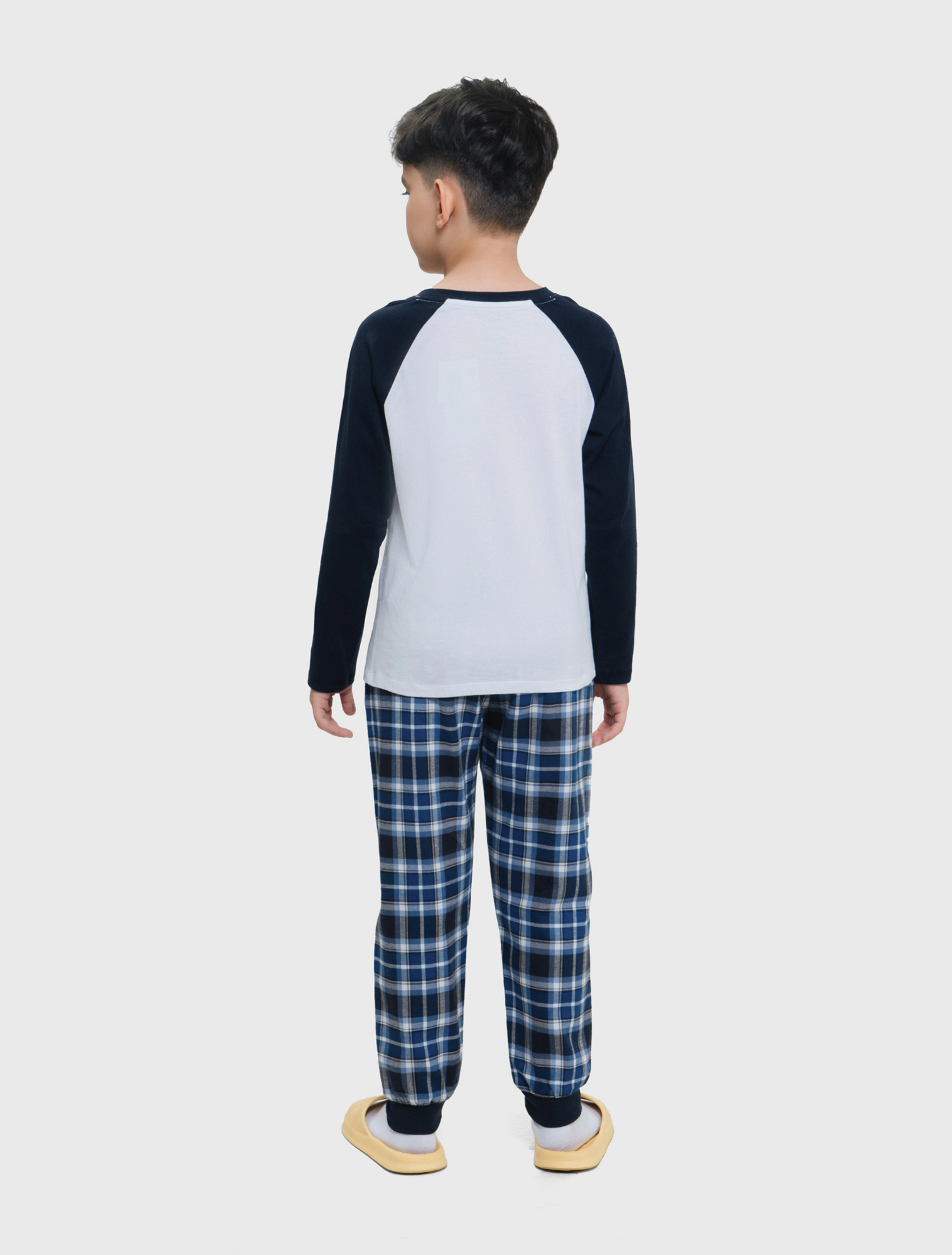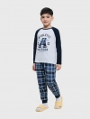 Bộ mặc nhà bé trai có hình in, áo cotton quần dệt thoi kẻ, phom dáng cơ bản dễ mặc hình in phù hợp với sở thích của trể nhỏ.