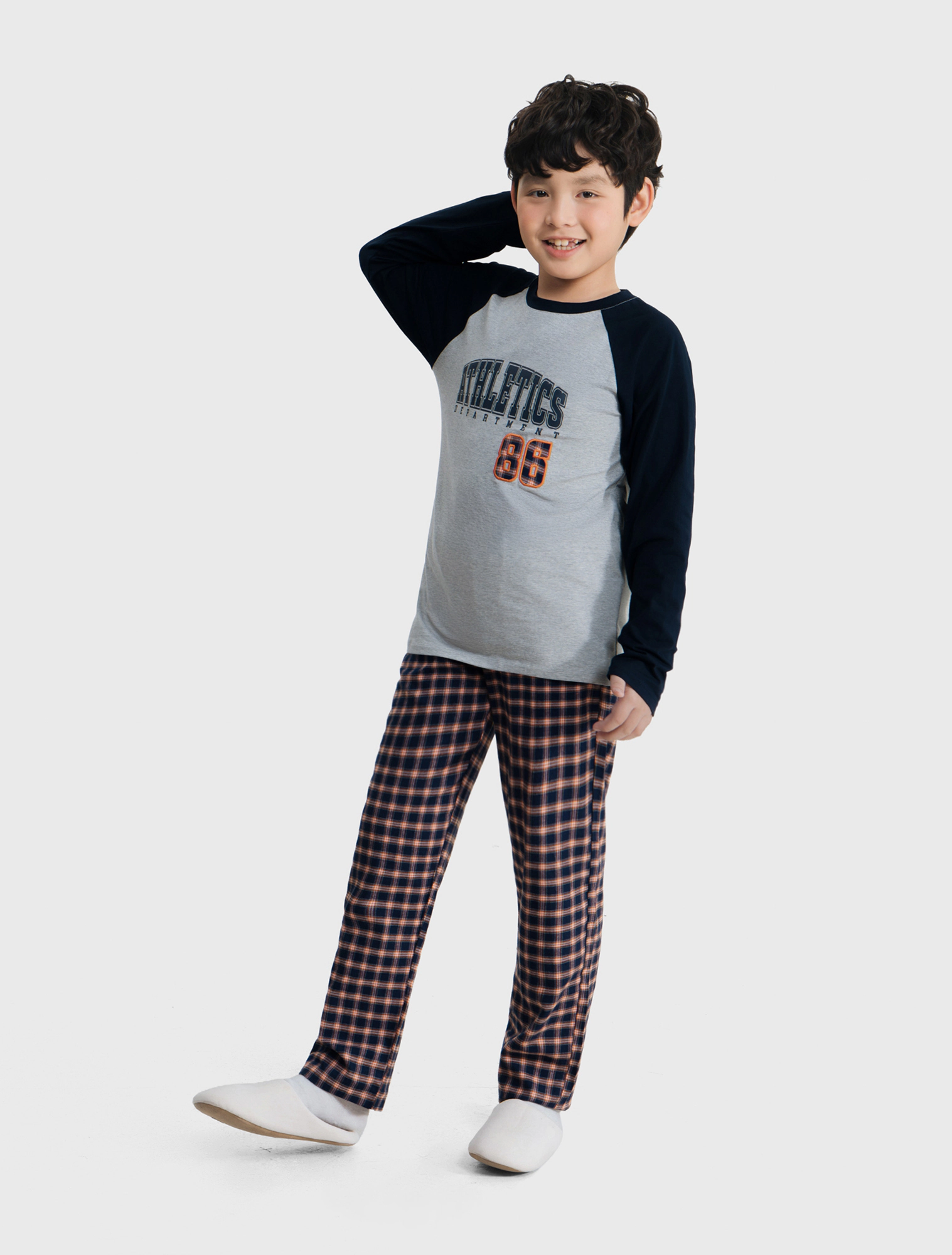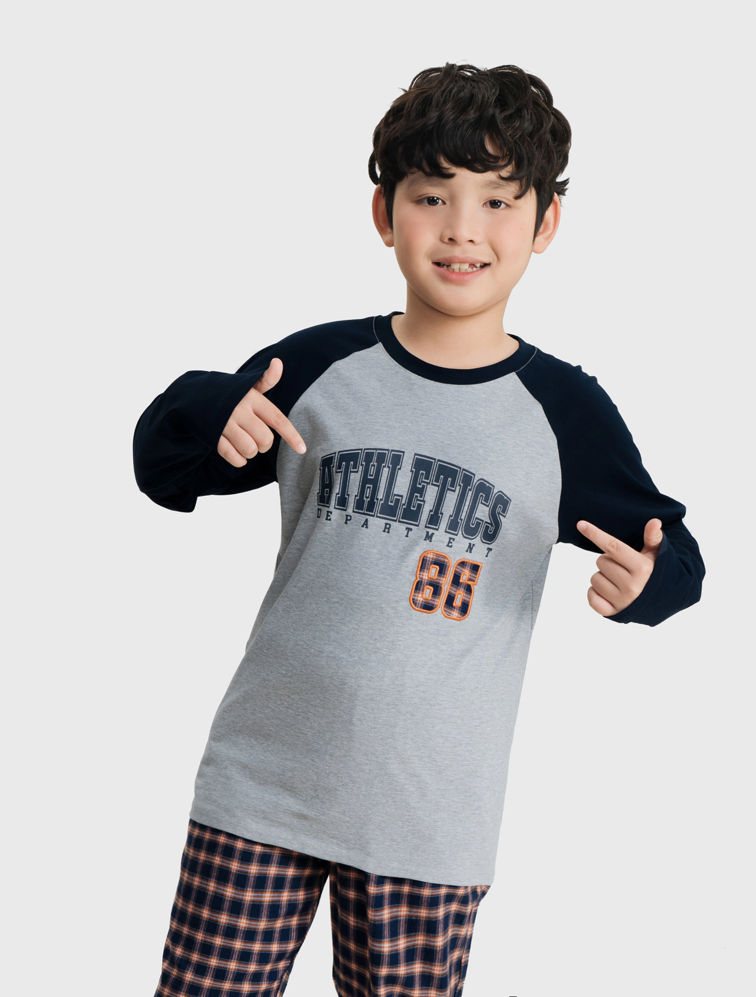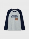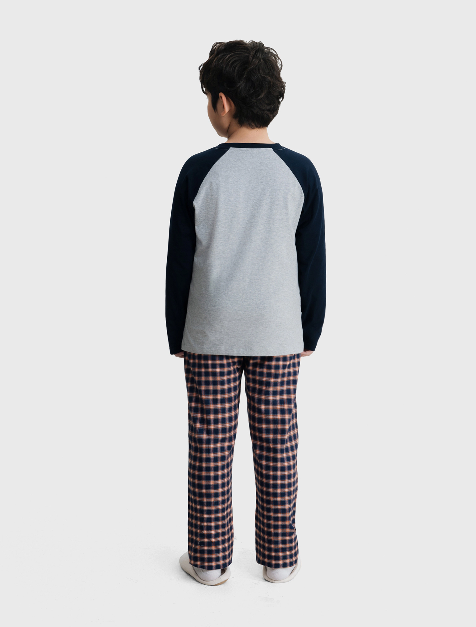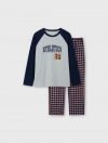 Bộ mặc nhà bé trai có hình in, áo cotton mix màu quần dệt thoi kẻ, phom dáng cơ bản dễ mặc hình in phù hợp với sở thích của trẻ nhỏ.
