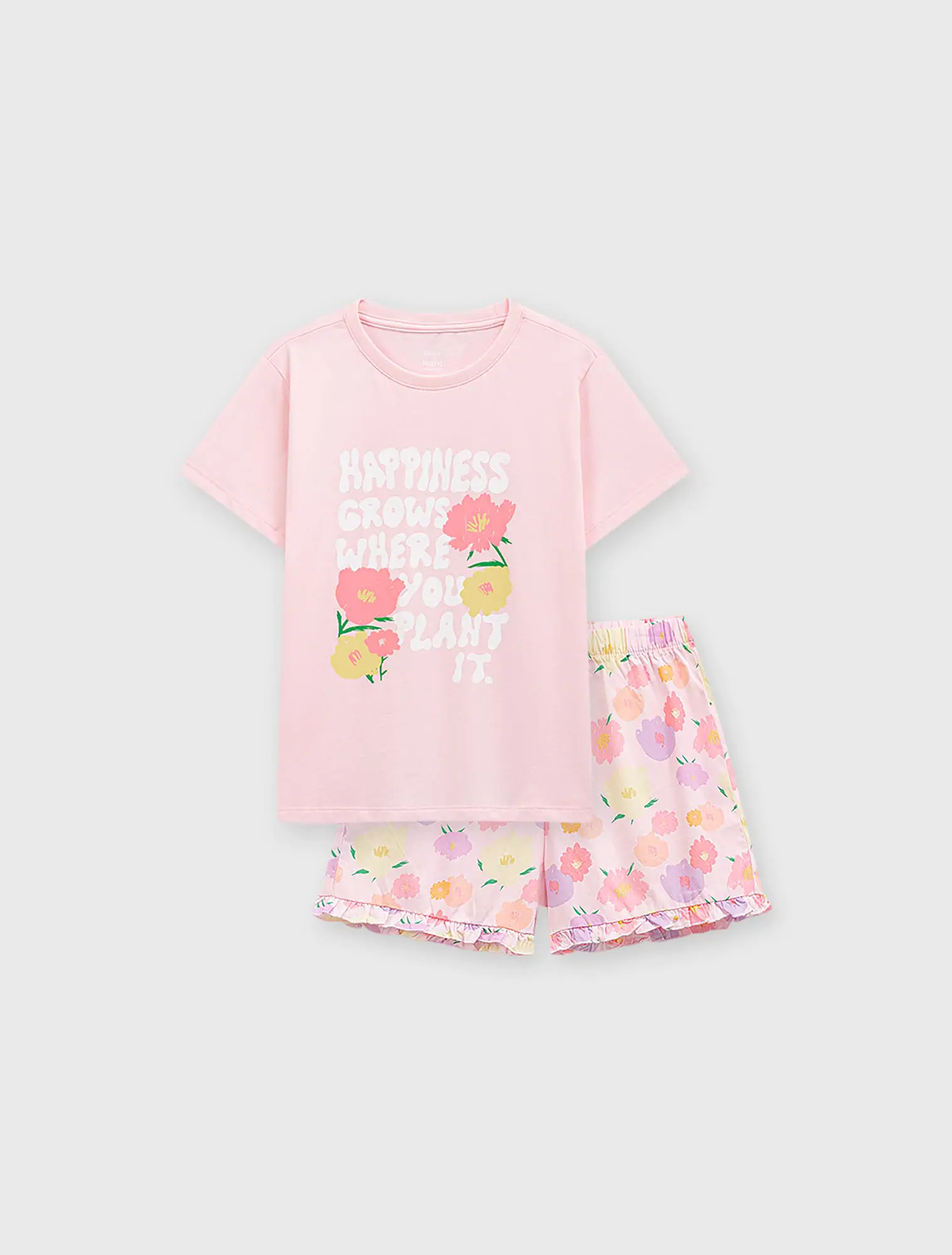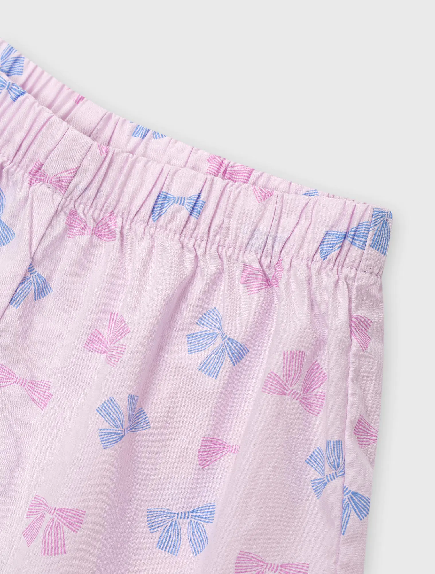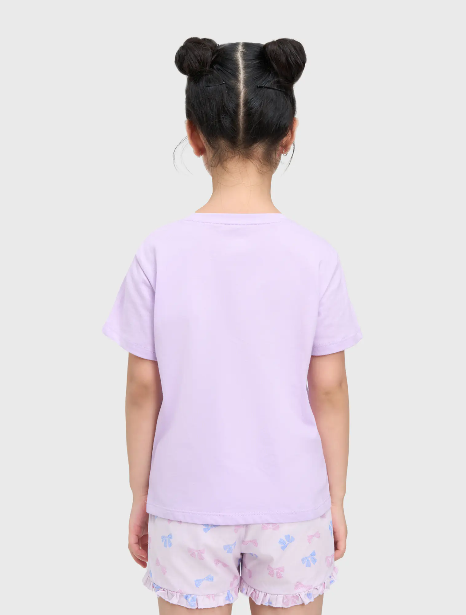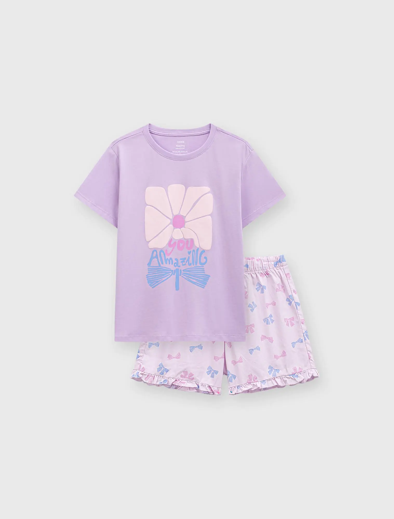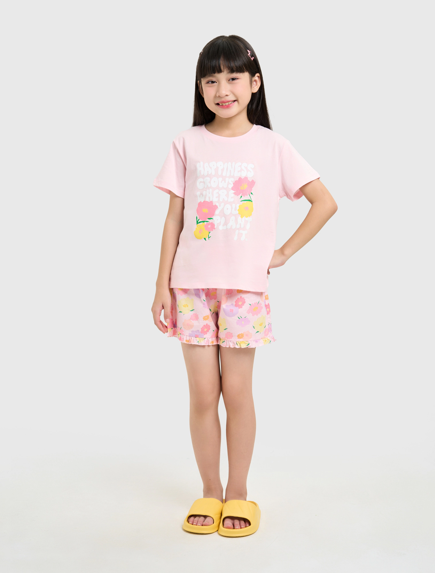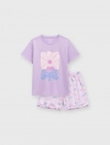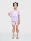 Bộ mặc nhà bé gái. Phom dáng cơ bản dễ mặc. Áo ngắn tay chất liệu dệt kim mềm mại kết hợp quần sooc chất liệu dệt thoi 100% cotton họa tiết in tràn thoáng mát phù hợp với các hoạt động nghỉ ngơi. Hình in đáng yêu, màu sắc tươi sáng dễ thương phù hợp bé gái.
