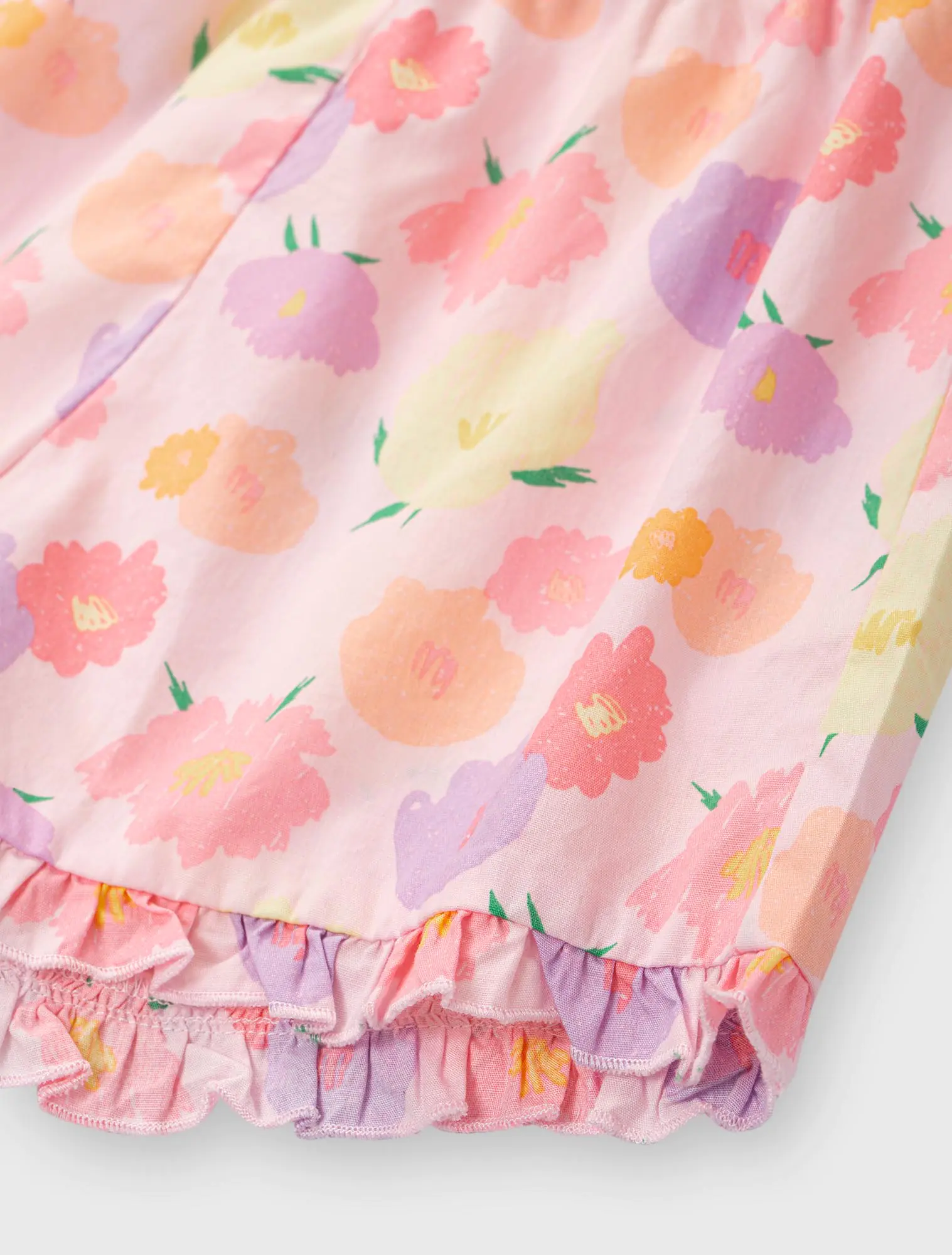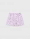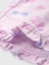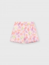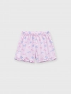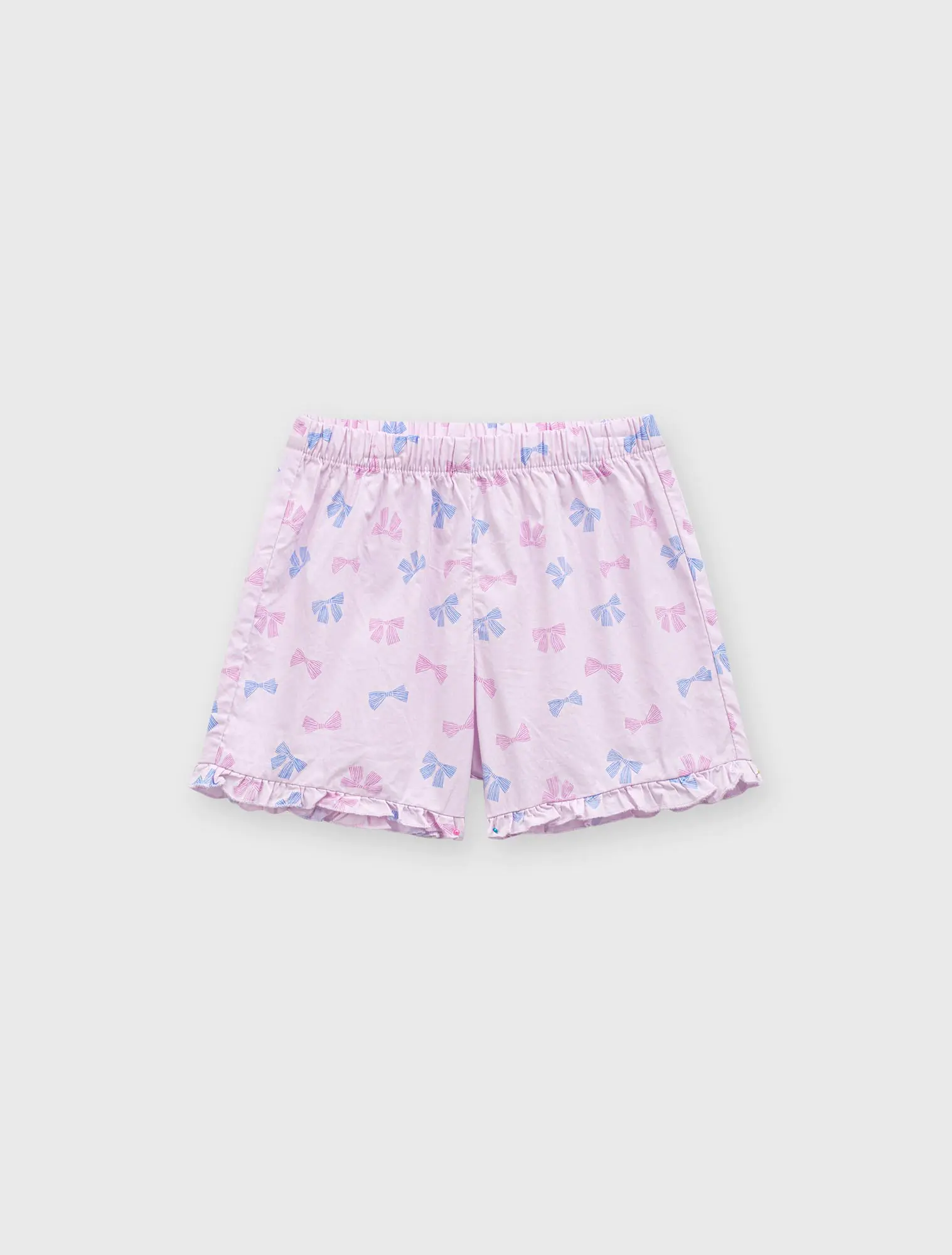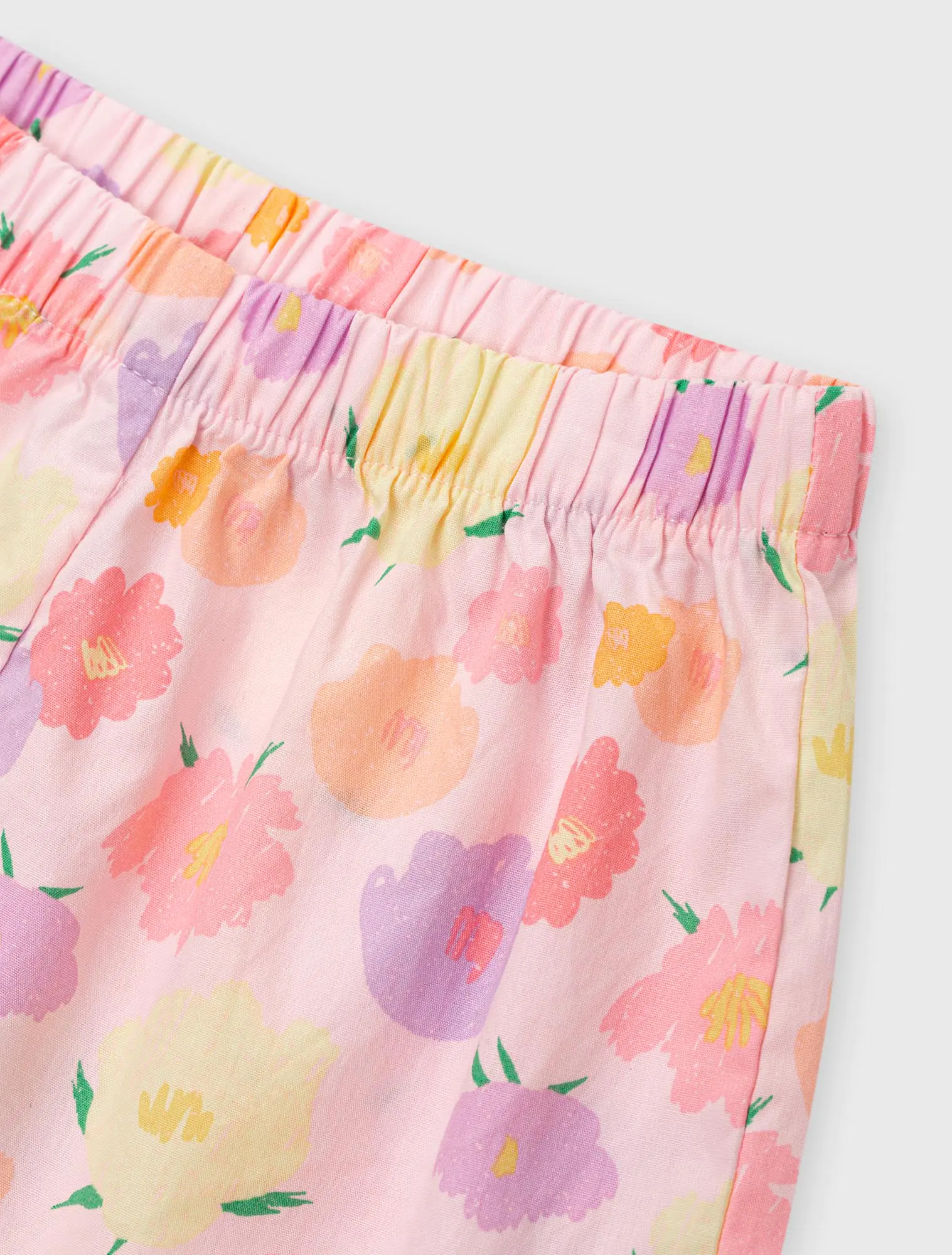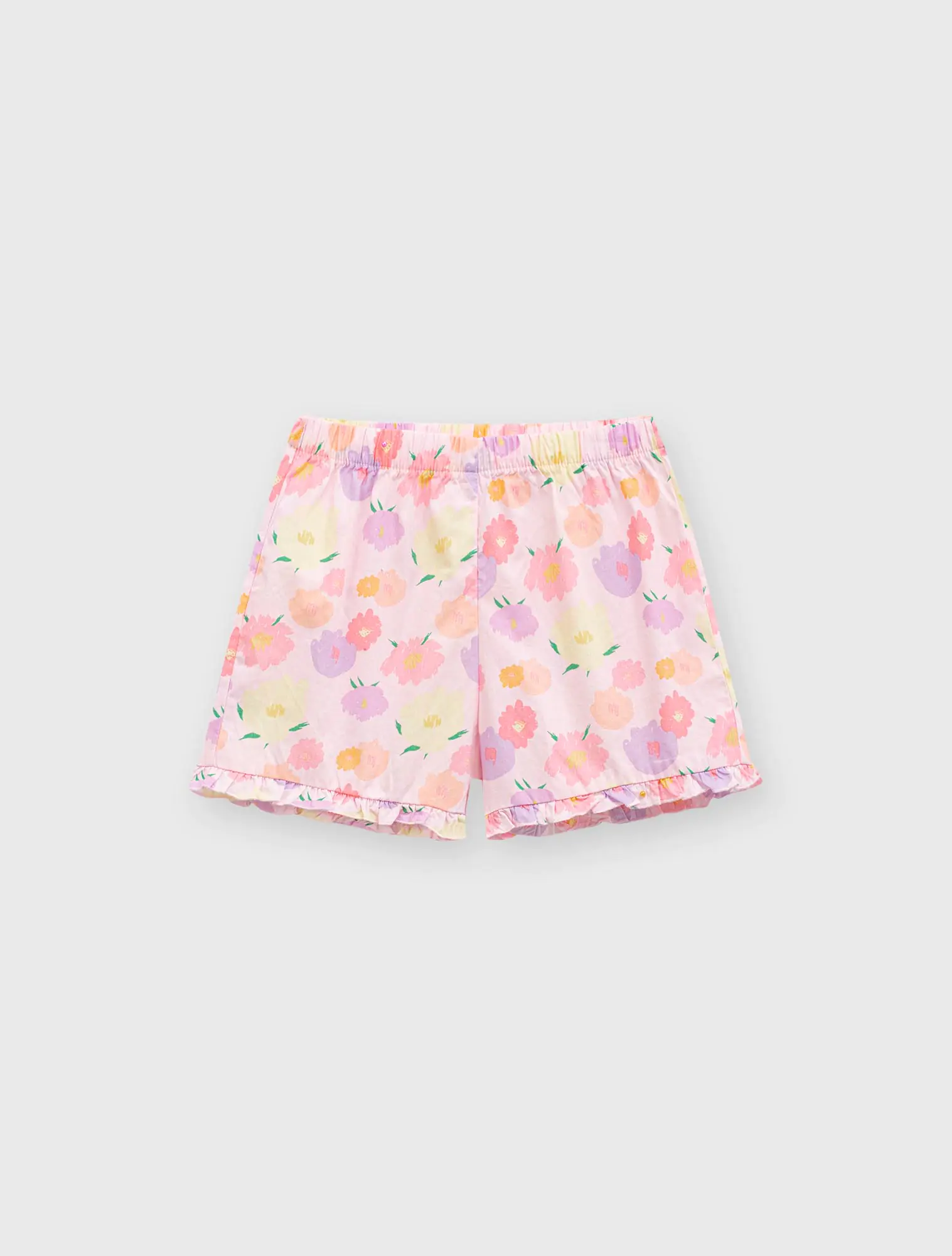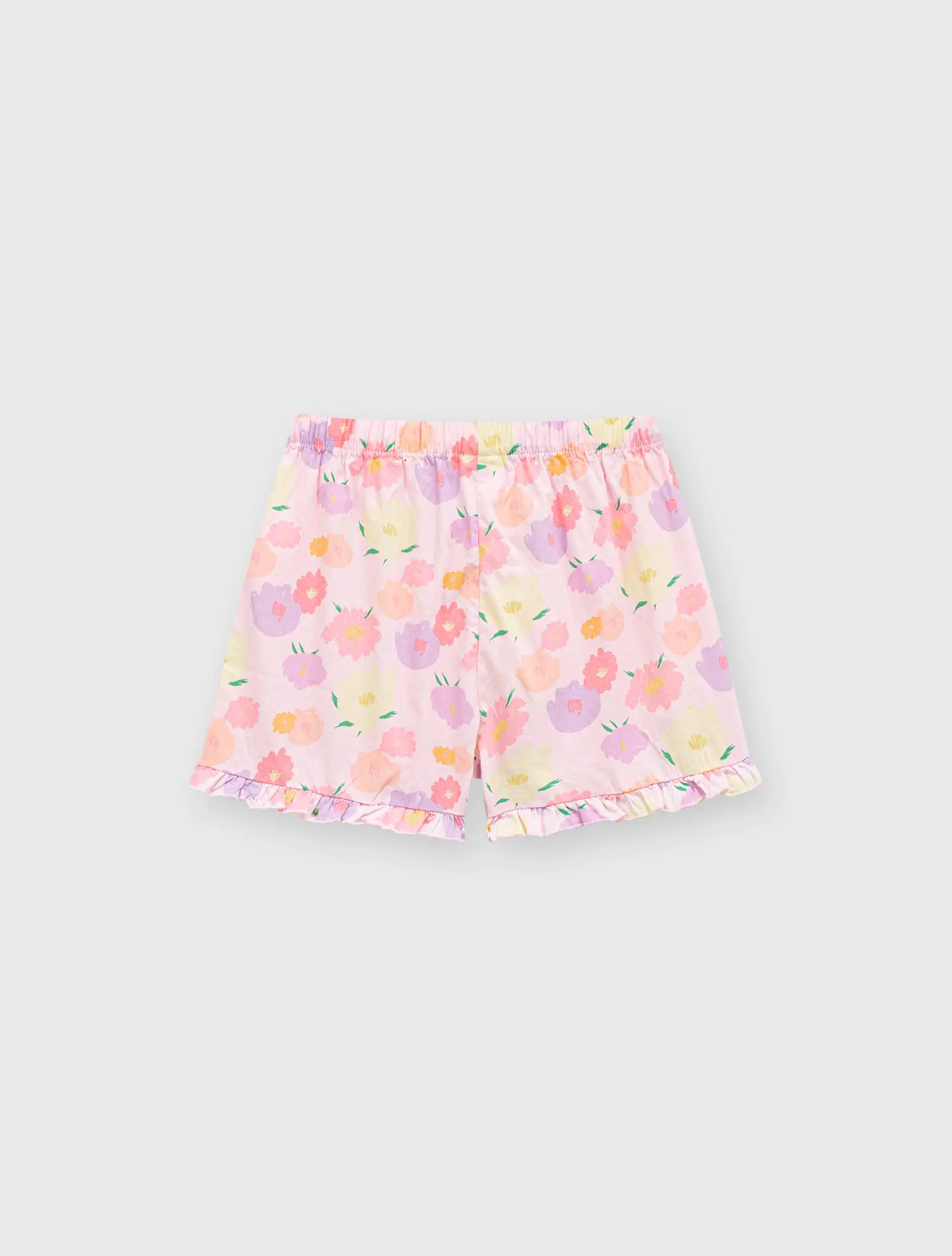 Bộ mặc nhà bé gái. Phom dáng cơ bản dễ mặc. Áo ngắn tay chất liệu dệt kim mềm mại kết hợp quần sooc chất liệu dệt thoi 100% cotton họa tiết in tràn thoáng mát phù hợp với các hoạt động nghỉ ngơi. Hình in đáng yêu, màu sắc tươi sáng dễ thương phù hợp bé gái.
