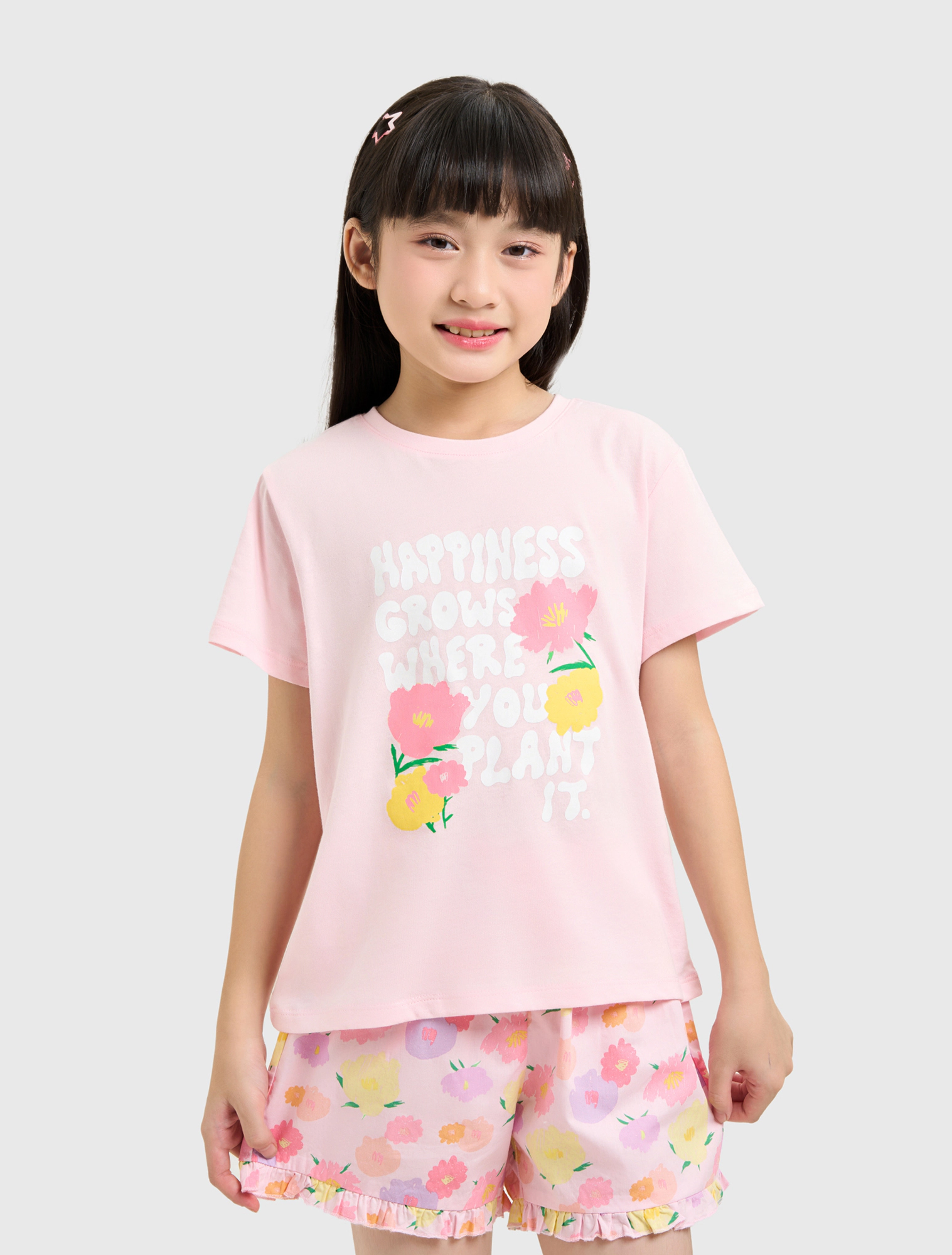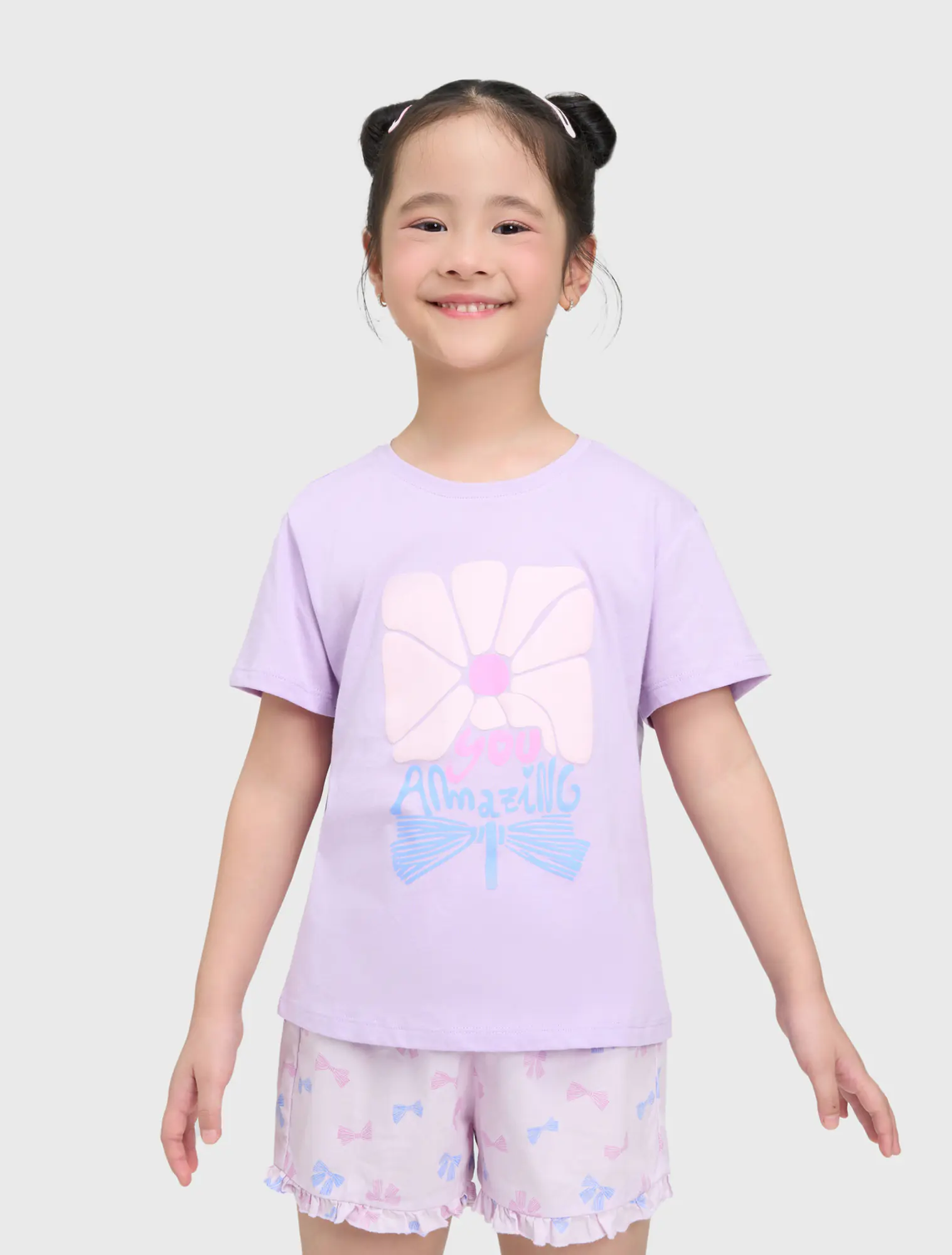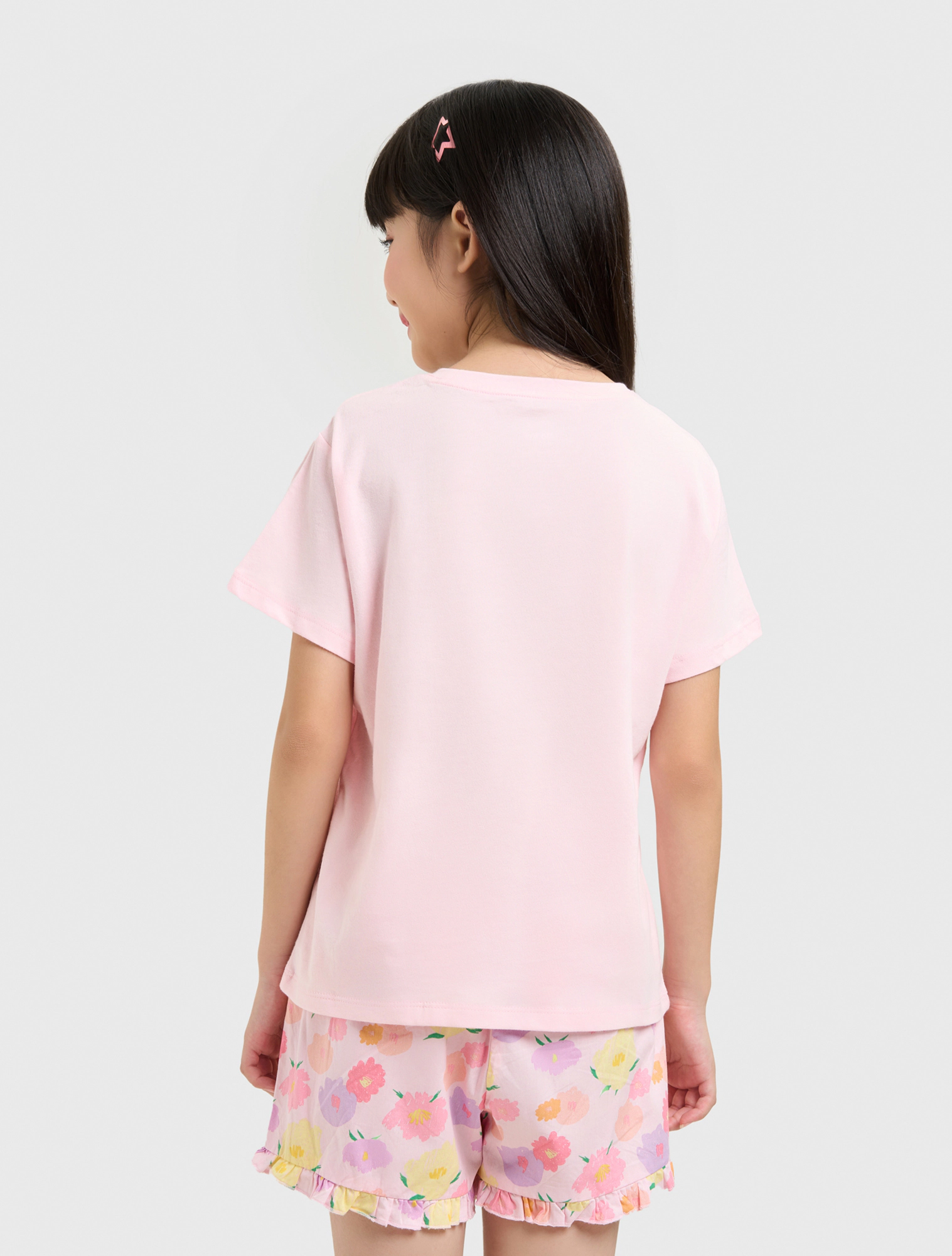 Bộ mặc nhà bé gái áo cộc tay cổ tròn quần chun có hình in