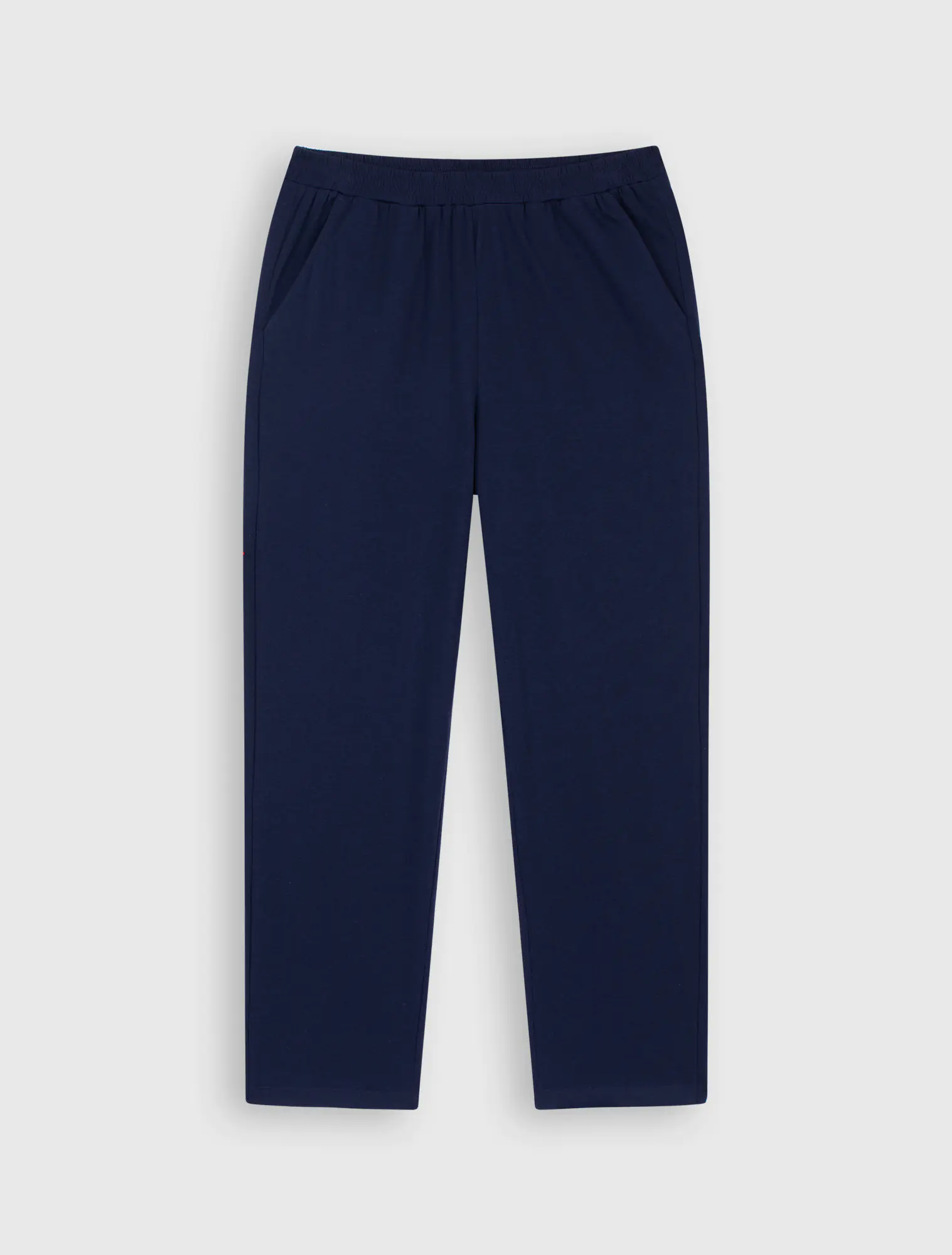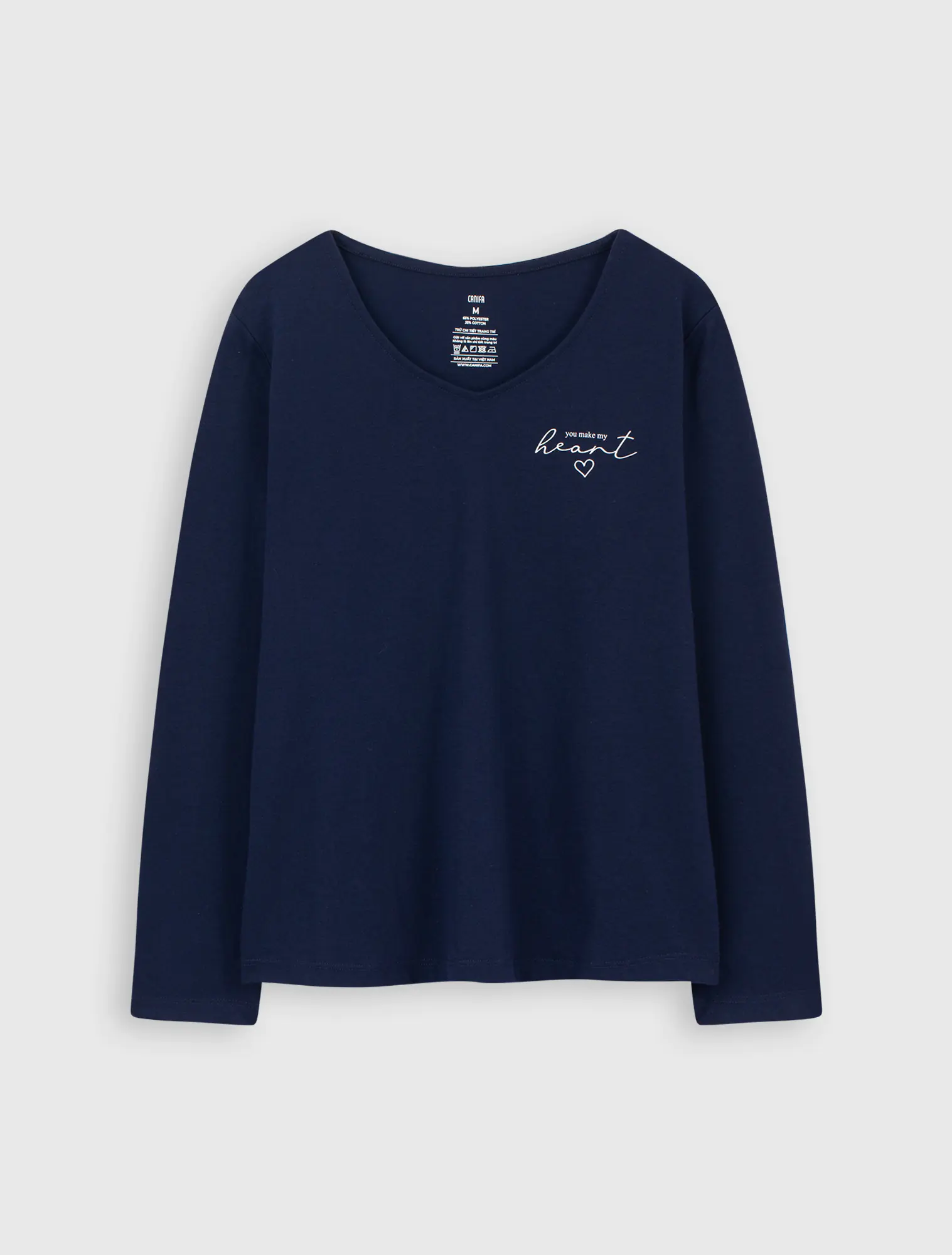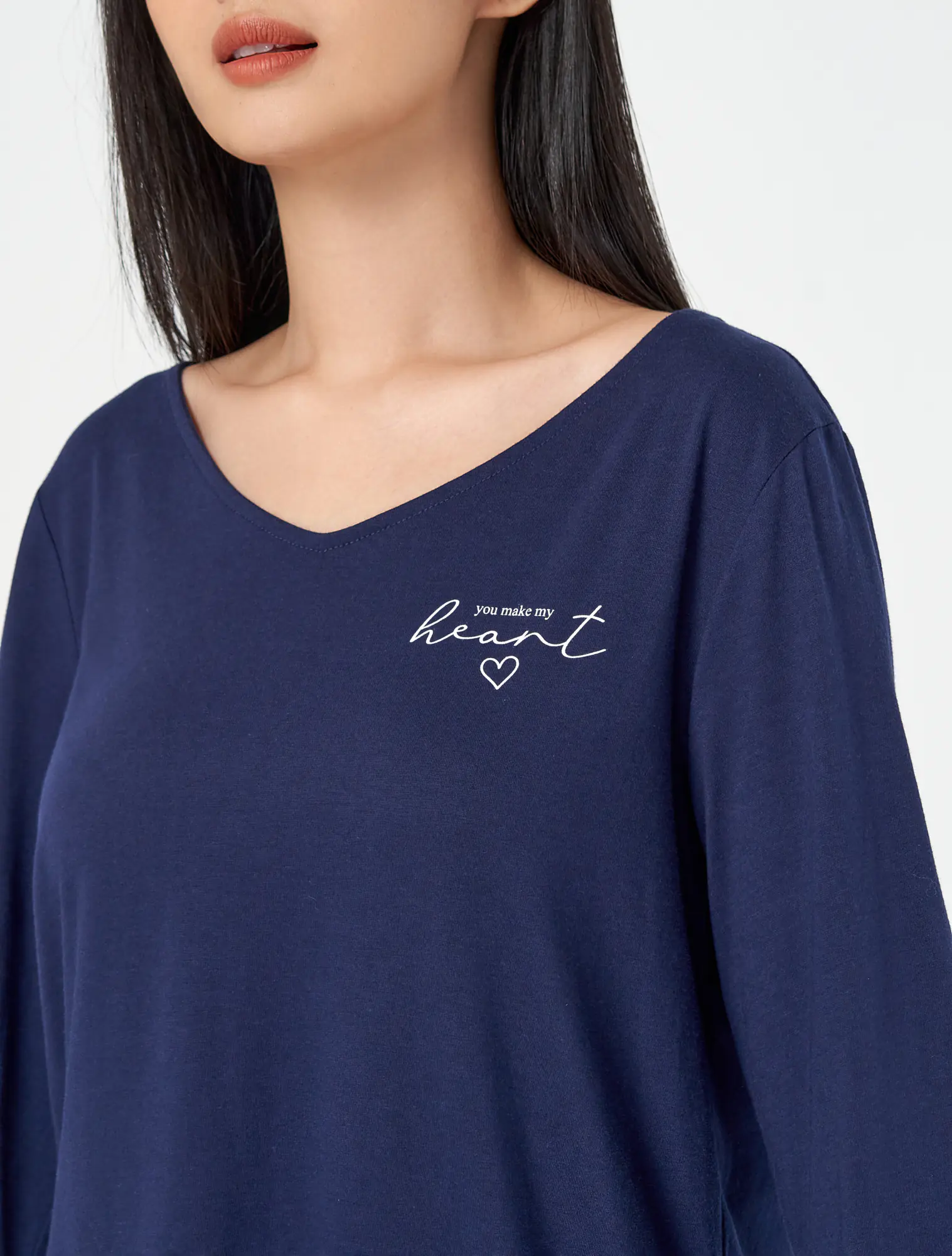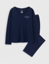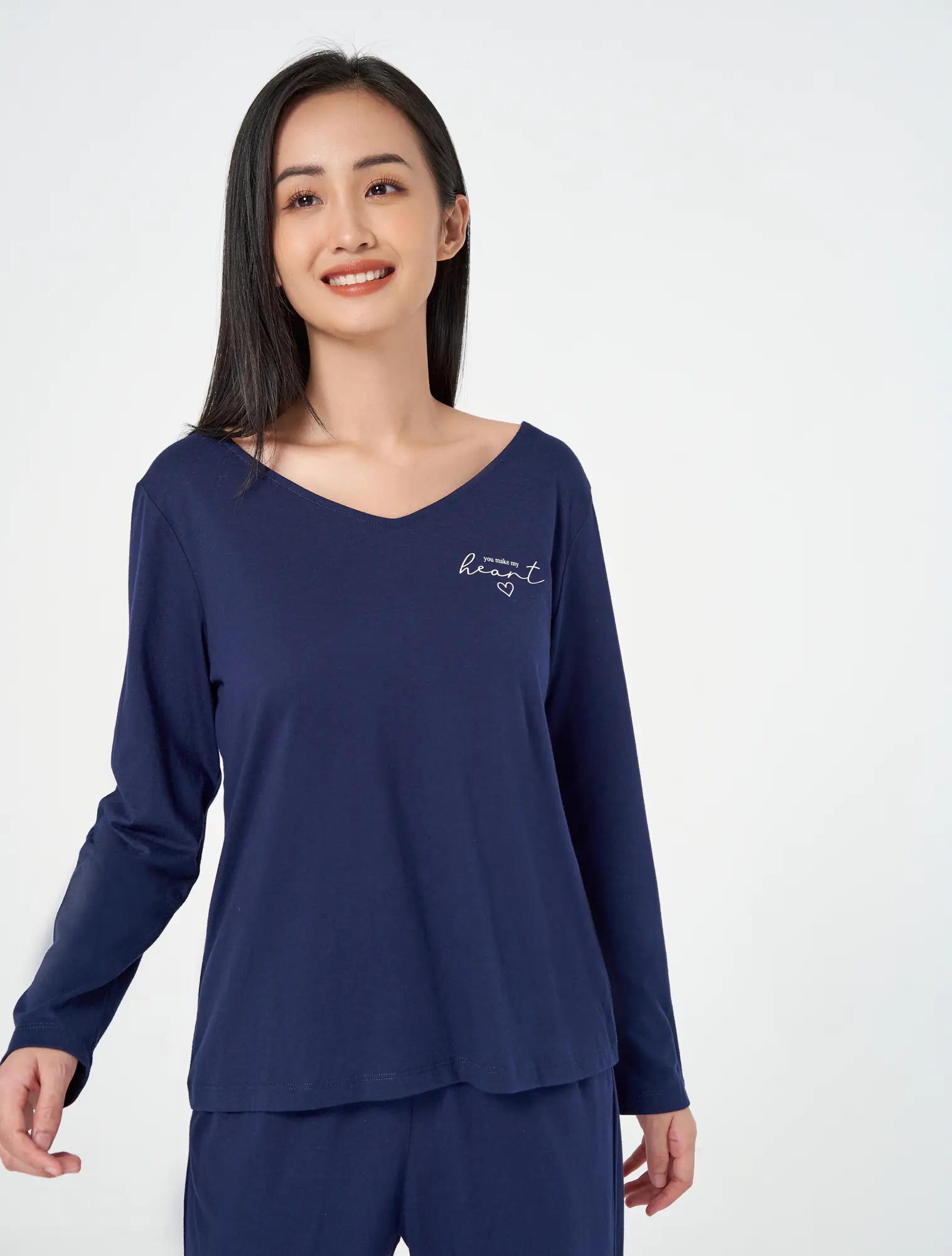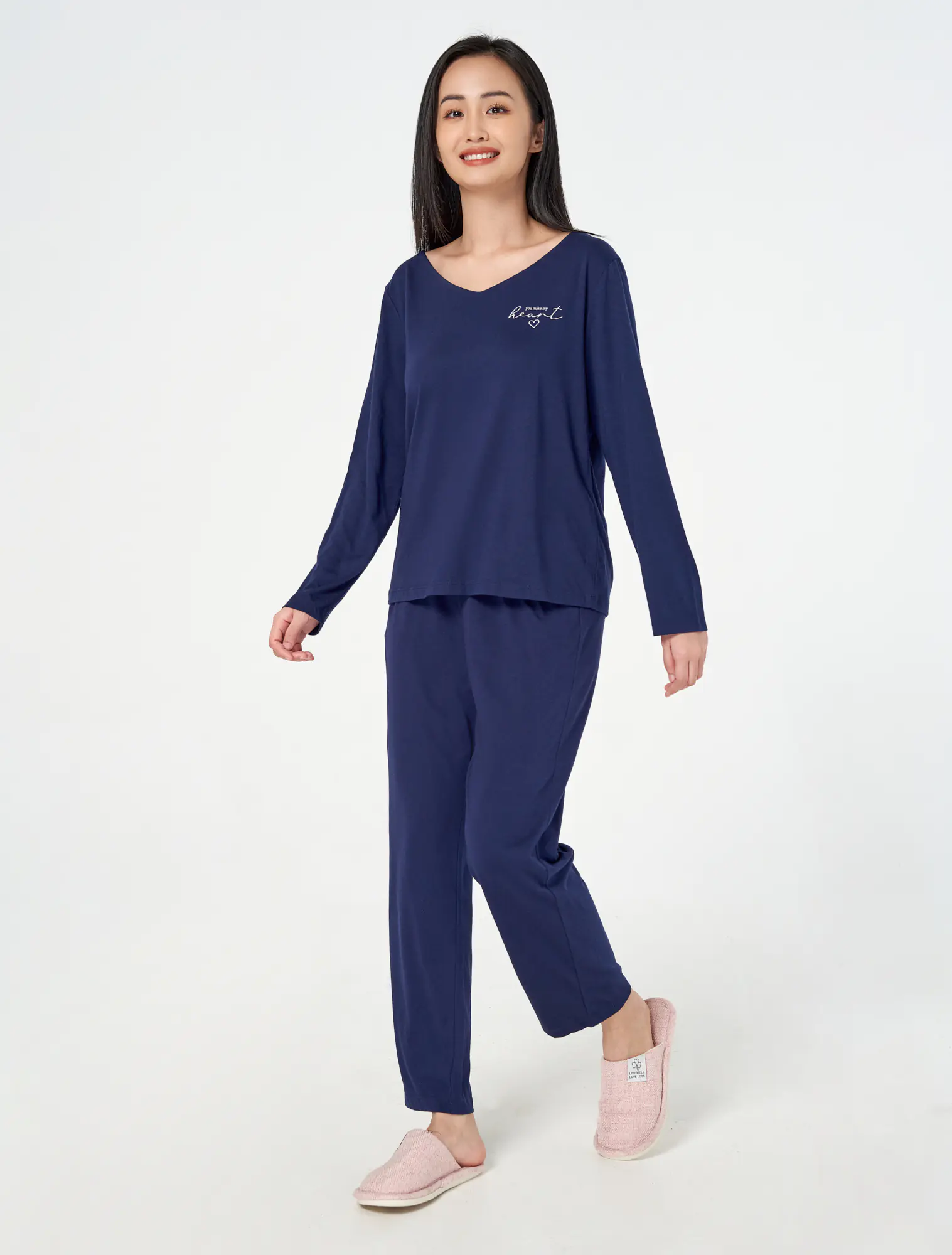 Bộ mặc nhà chất liệu polyester pha, áo cổ tim dài tay, quần dài cạp chun.
