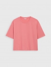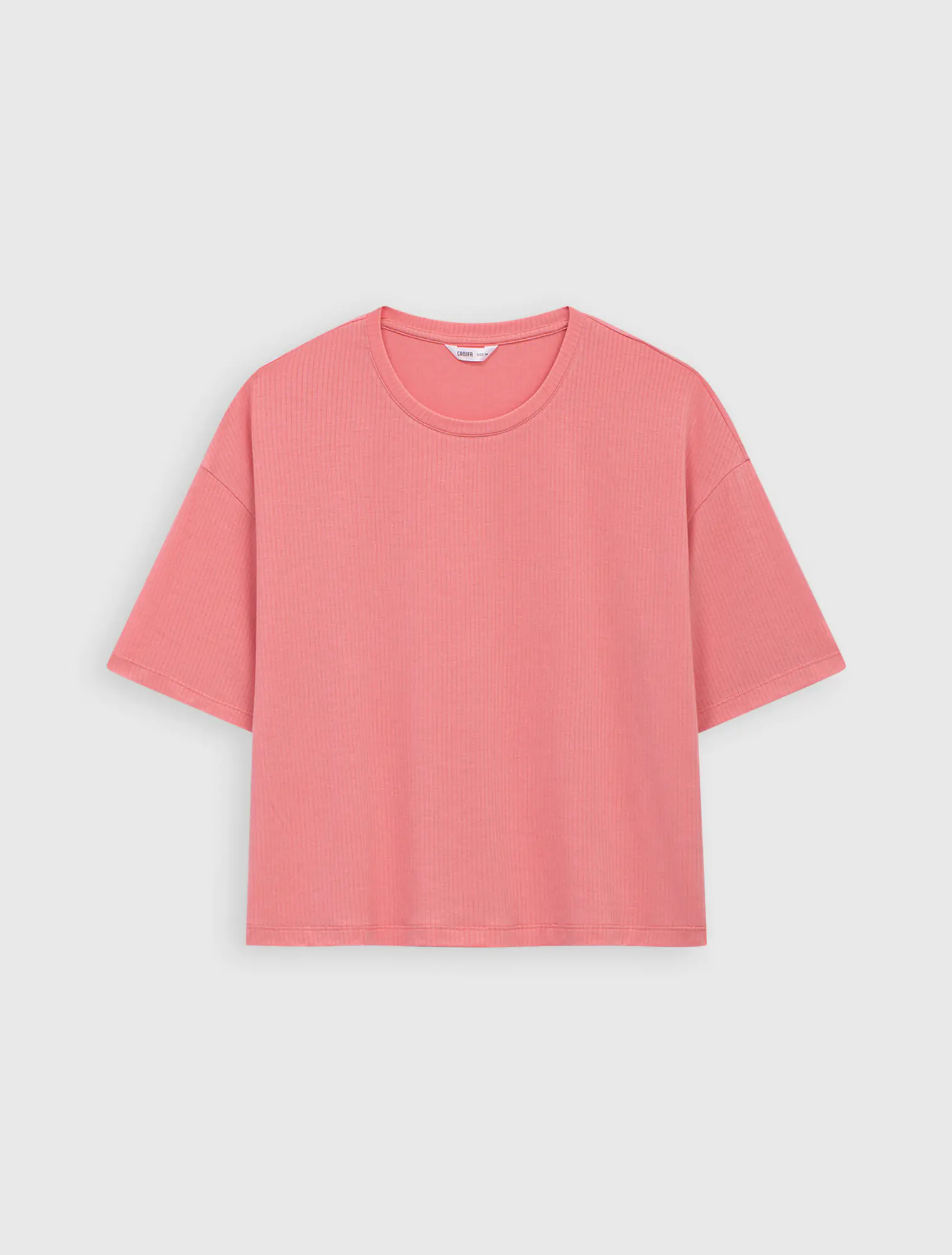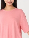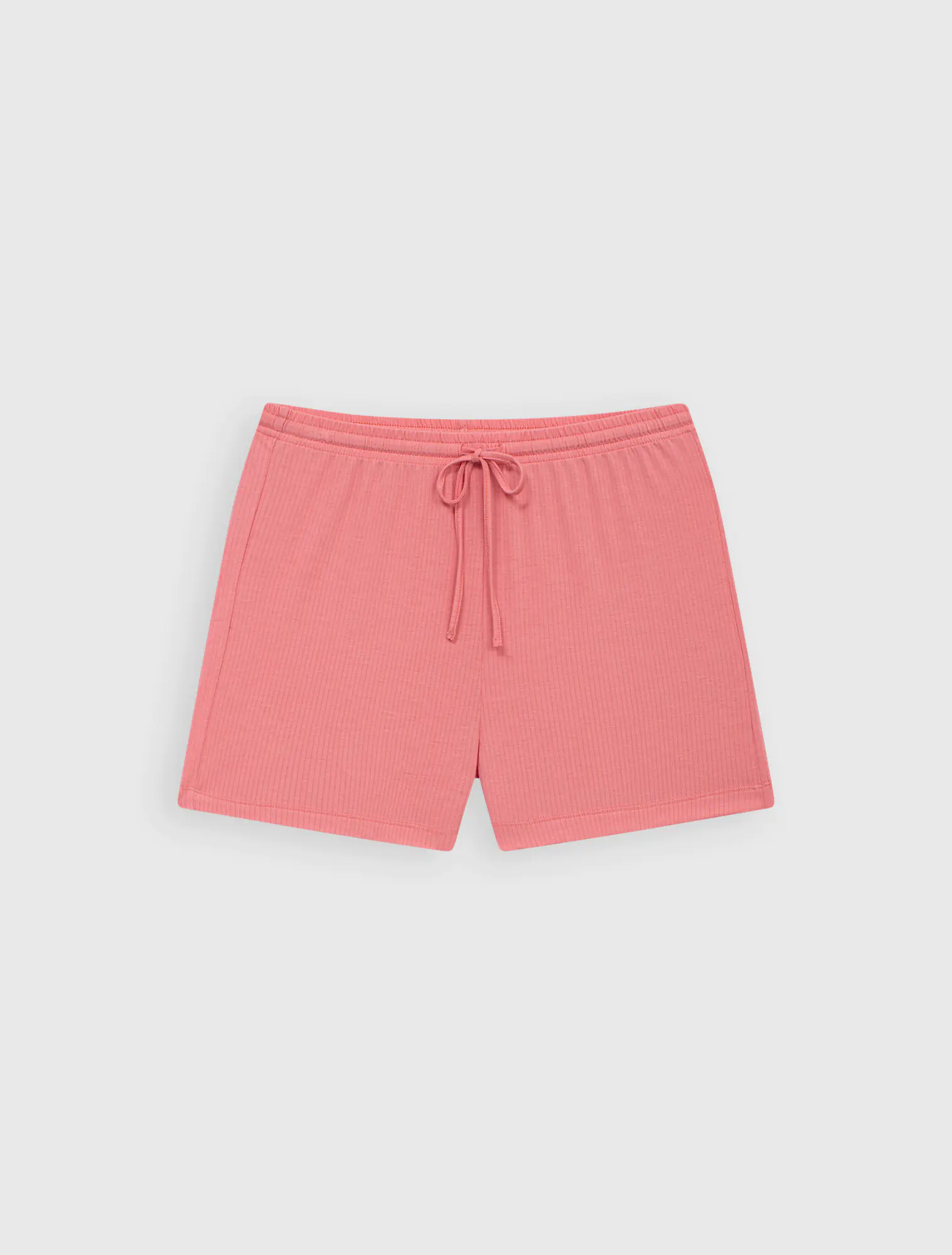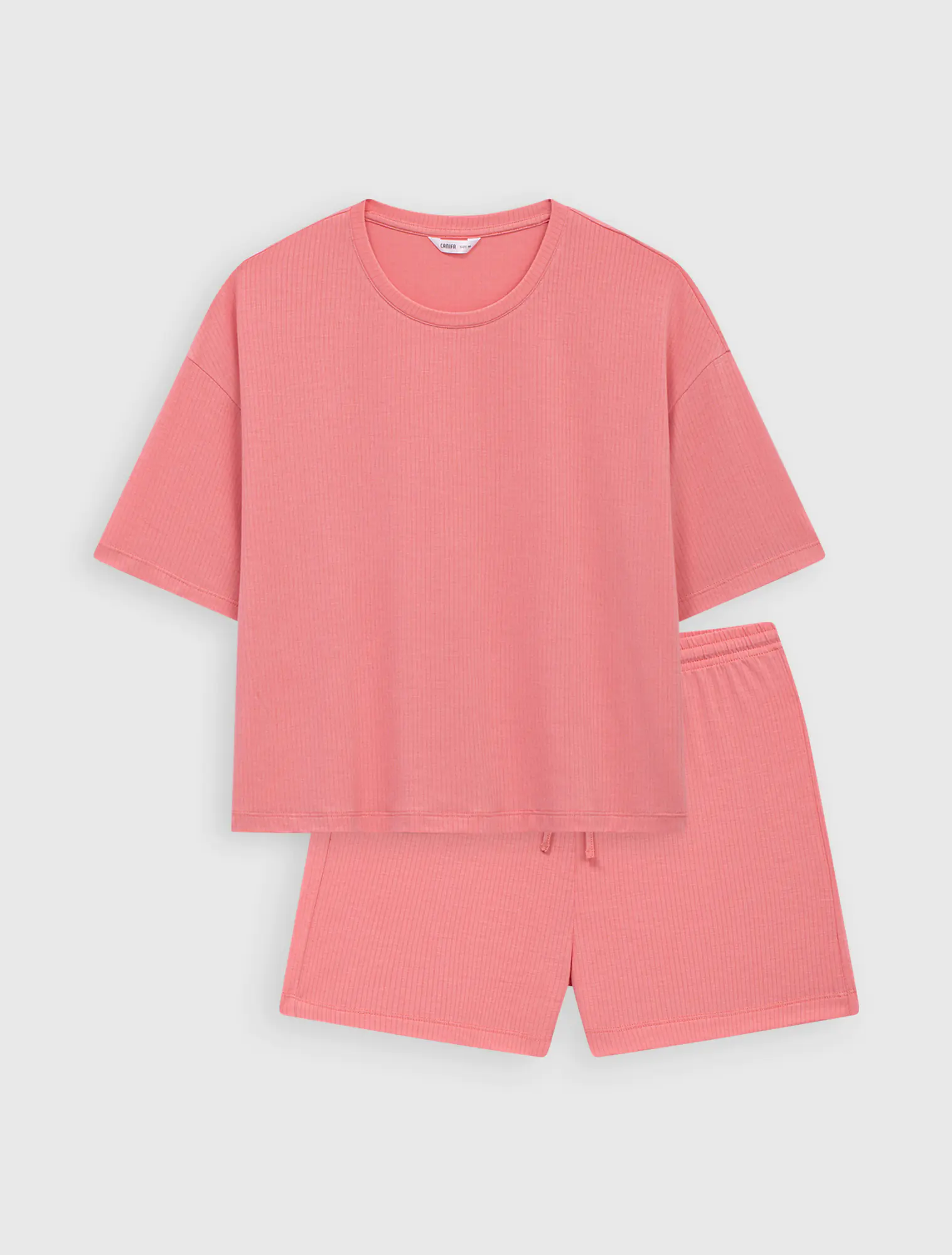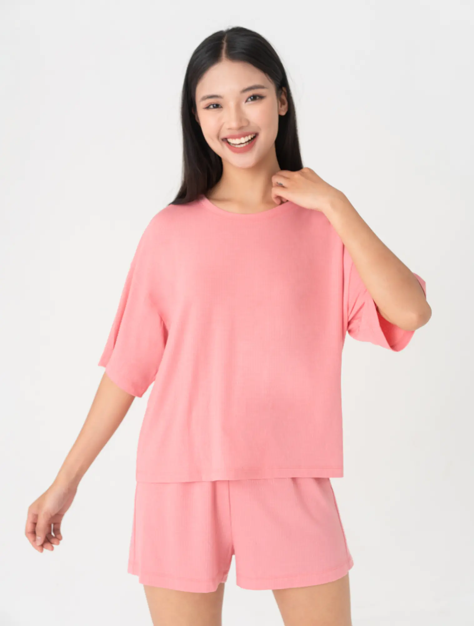 Bộ mặc nhà chất liệu polyester pha, cổ tim tròn tay cộc, quần soóc cạp chun.