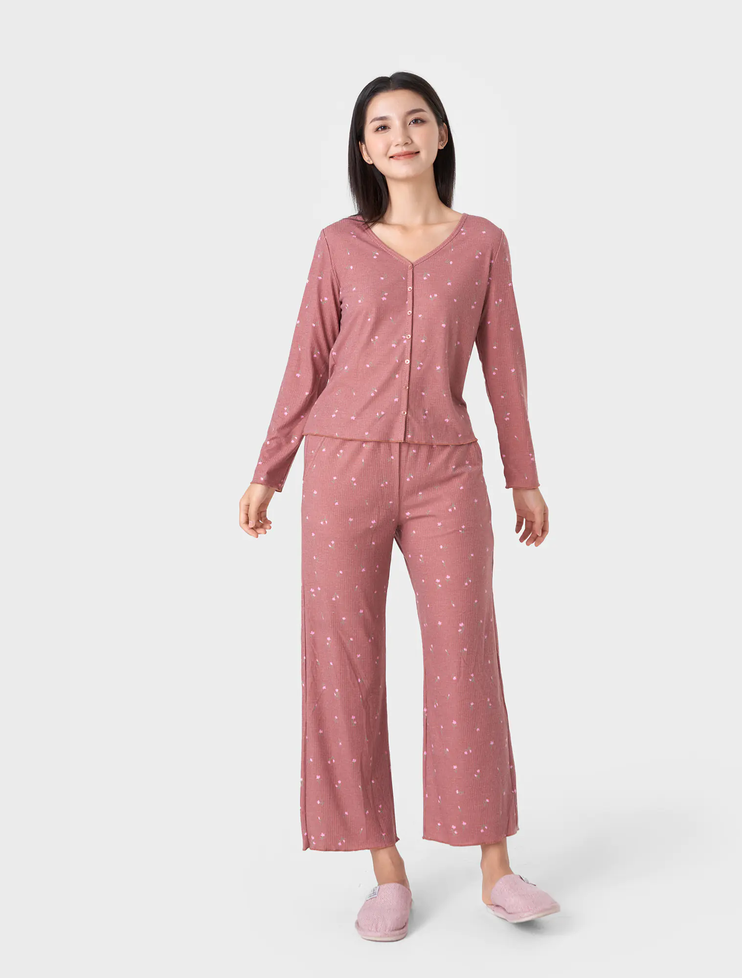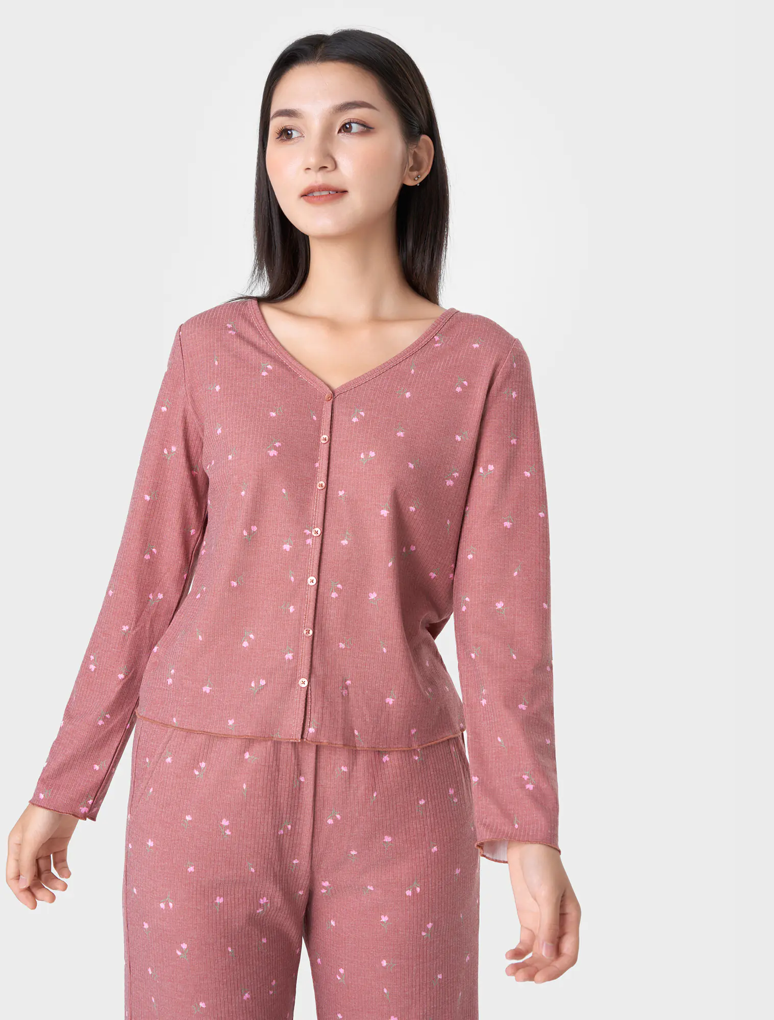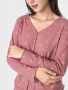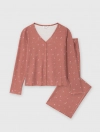 Bộ mặc nhà dáng suông rủ vừa phải, gọn gàng nhưng vẫn rộng rãi thoải mái. Nguyên liệu Rib dệt kim mềm mại, mỏng nhẹ, họa tiết và màu sắc tràm ấm, nhẹ nhàng nữ tính tạo cảm giác dễ chịu khi mặc, phù hợp các hoạt động nghỉ ngơi.