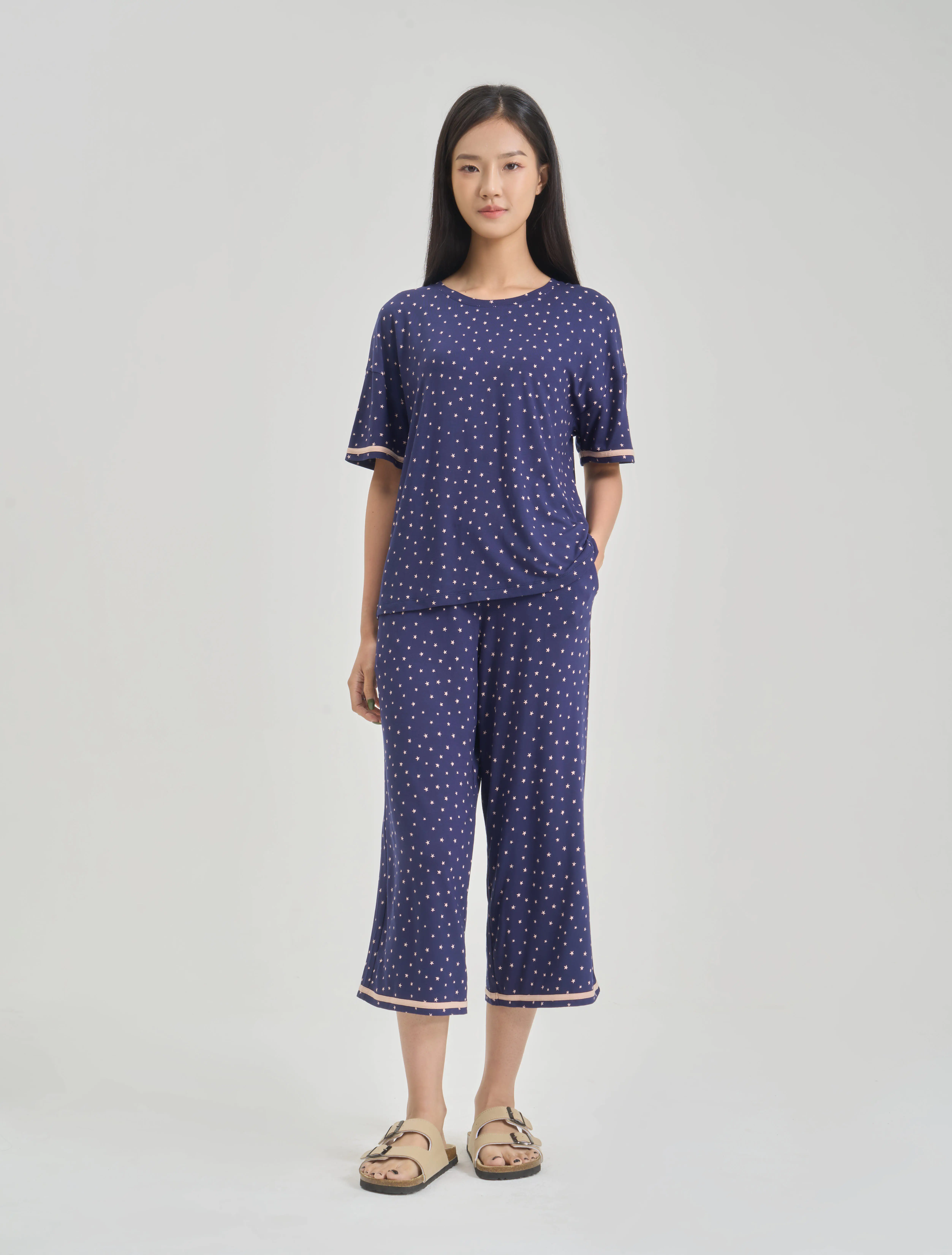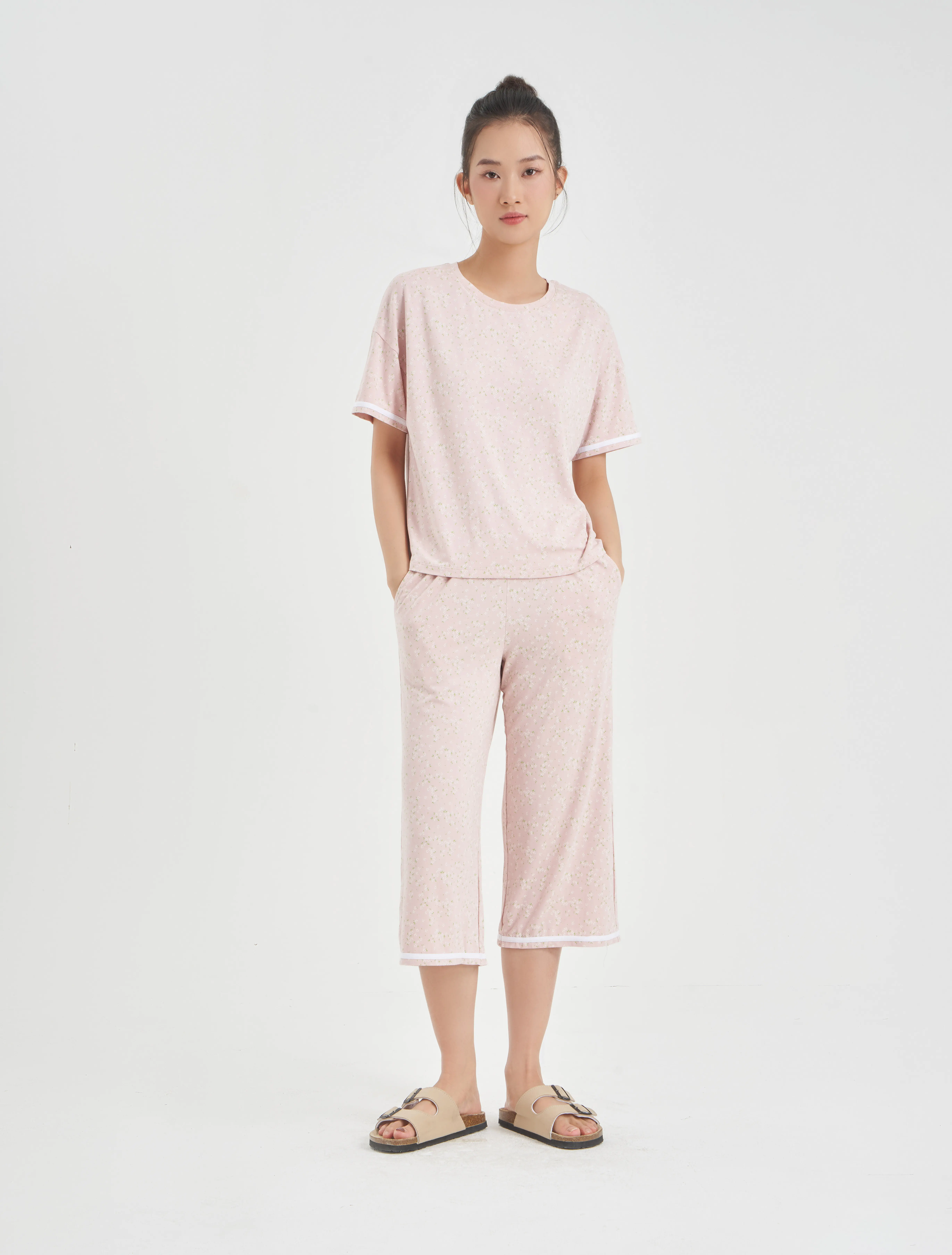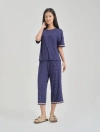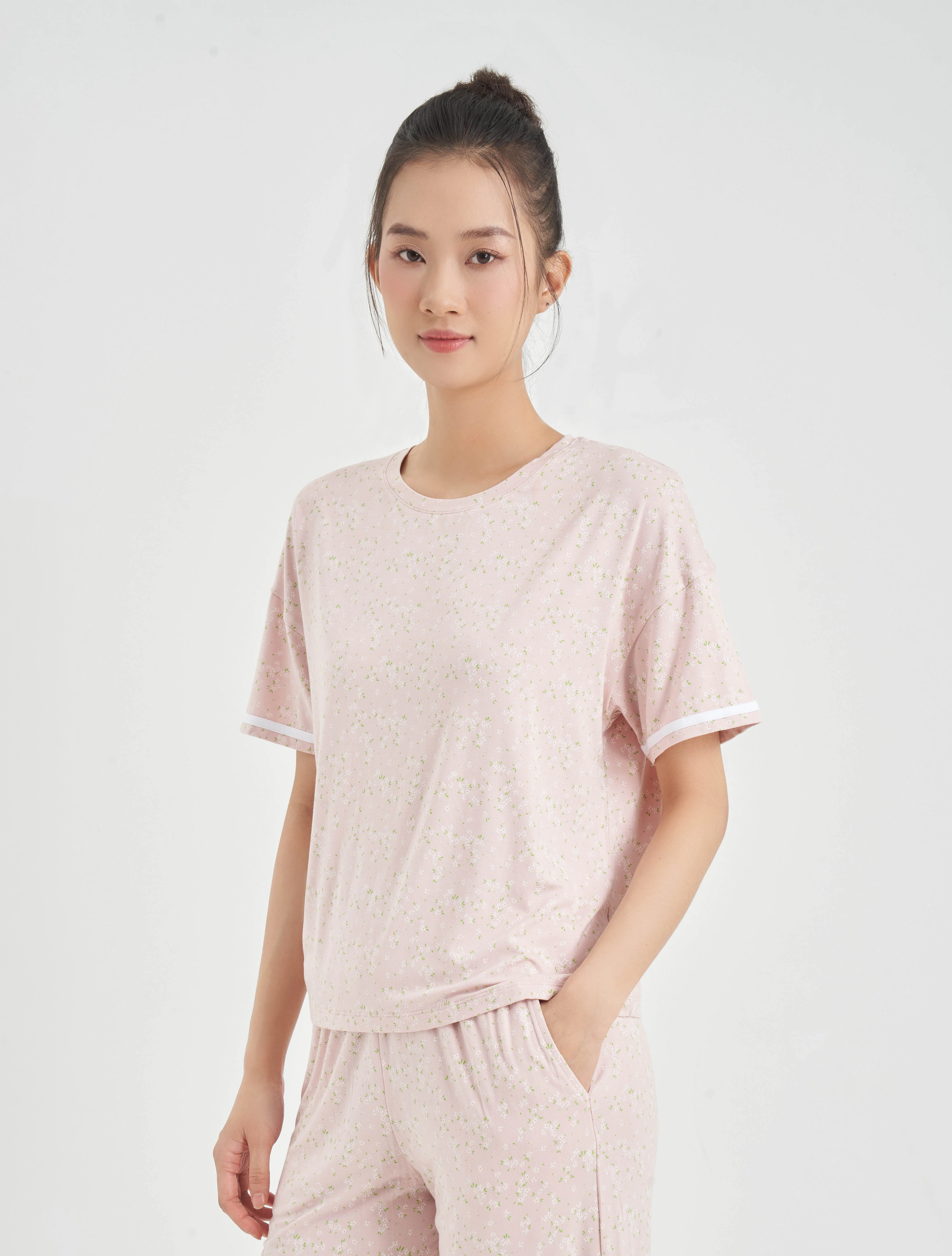 Bộ mặc nhà nữ áo ngắn tay quần dài lịch sự, nữ tính. Màu sắc và chi tiết trang trí hiện đại, tinh tế, phù hợp các hoạt động nghỉ ngơi thư giãn.