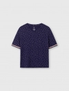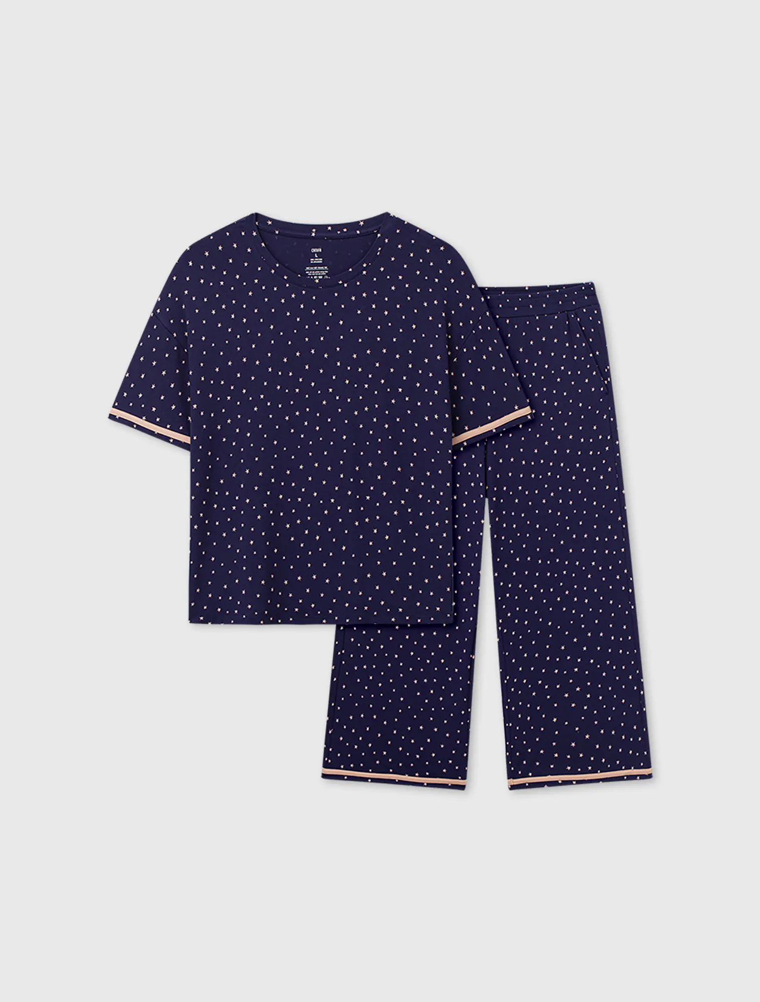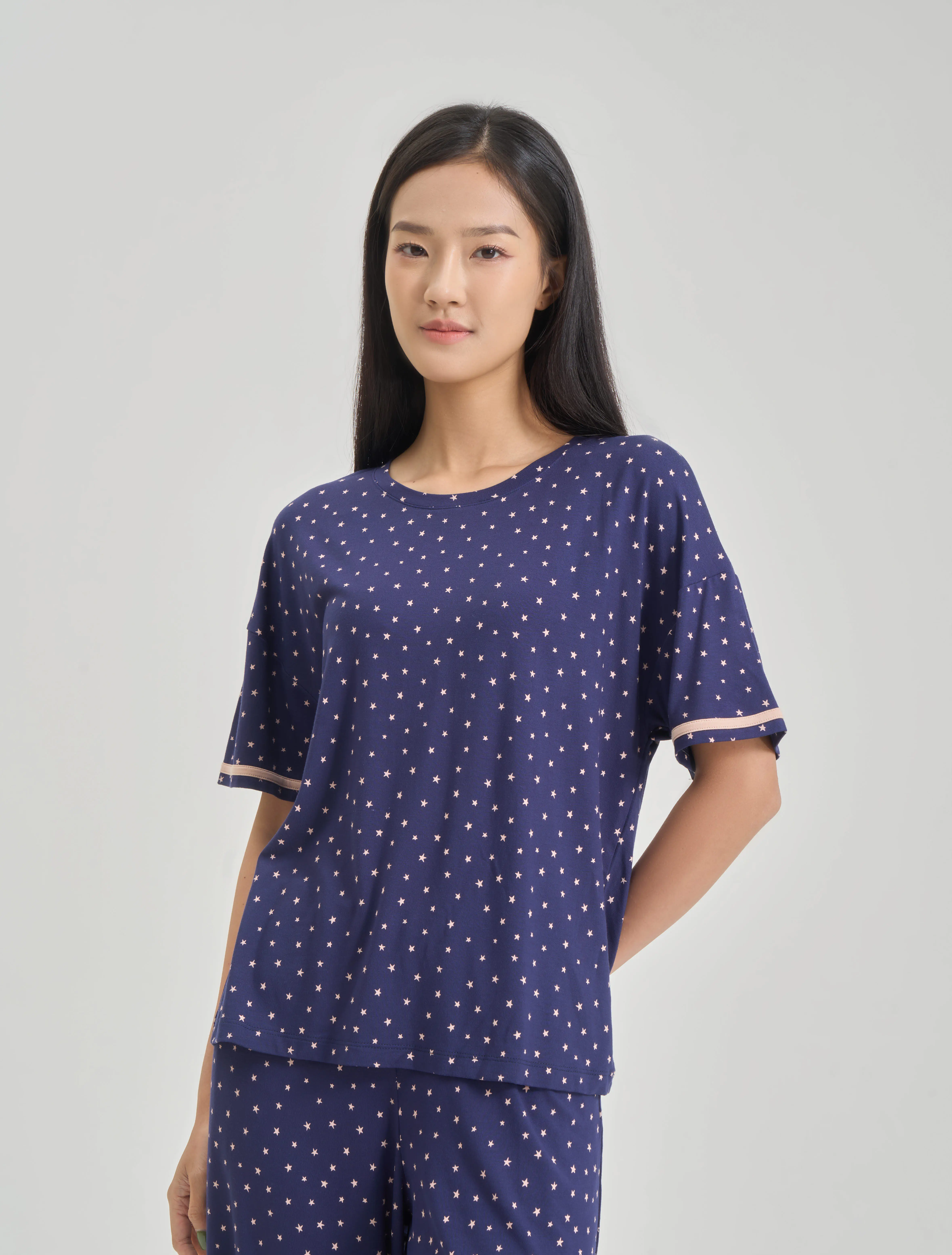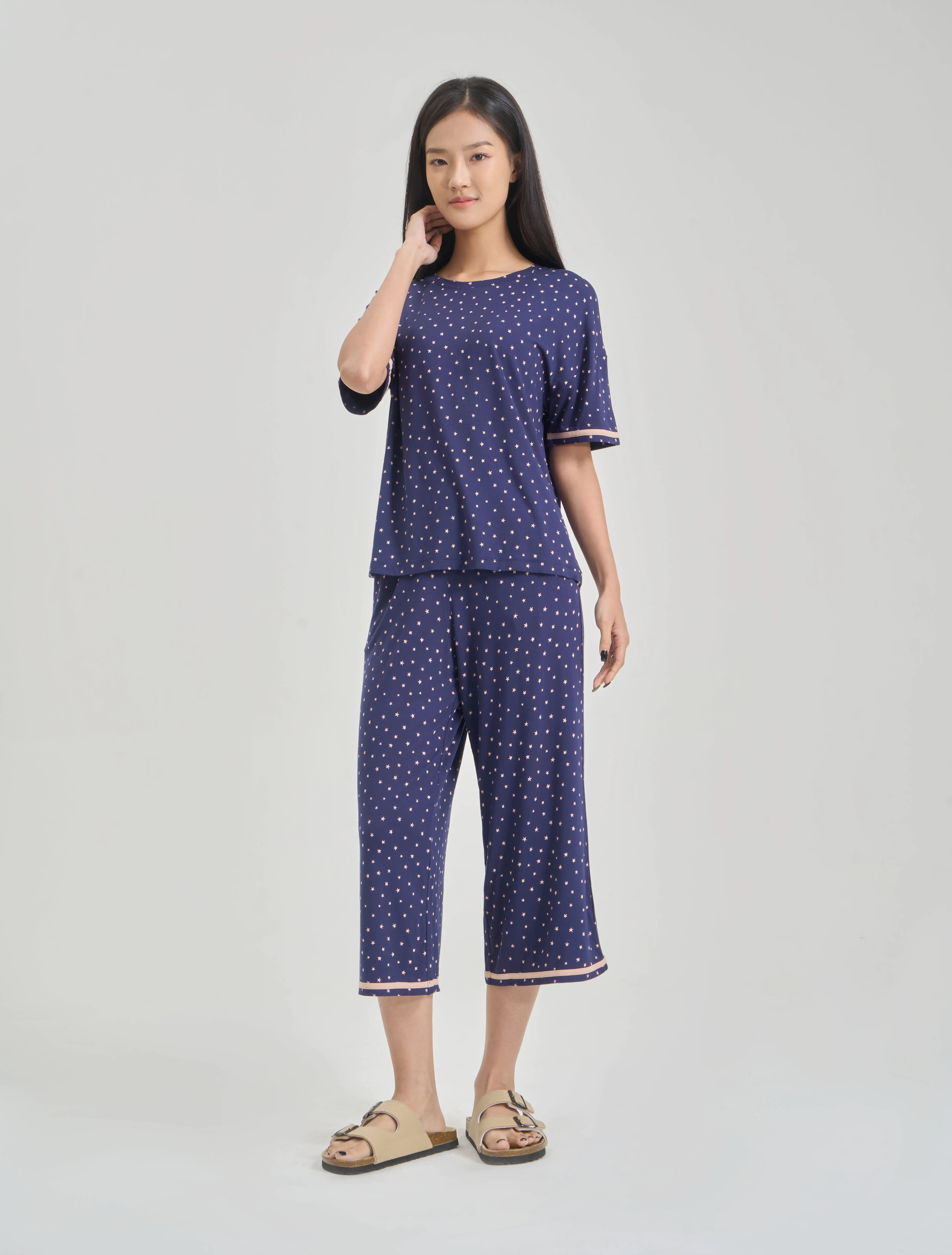 Bộ mặc nhà nữ áo ngắn tay quần dài lịch sự, nữ tính. Màu sắc và chi tiết trang trí hiện đại, tinh tế, phù hợp các hoạt động nghỉ ngơi thư giãn.