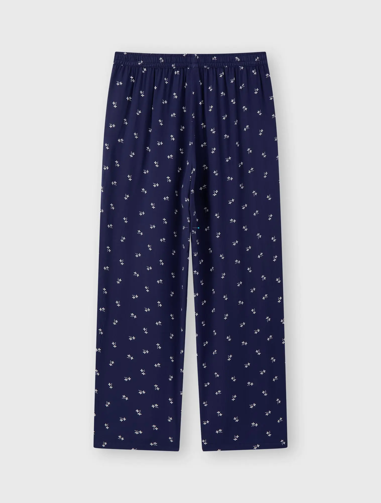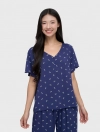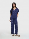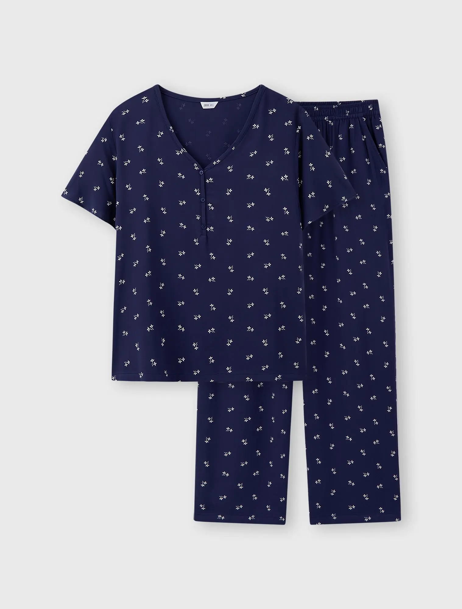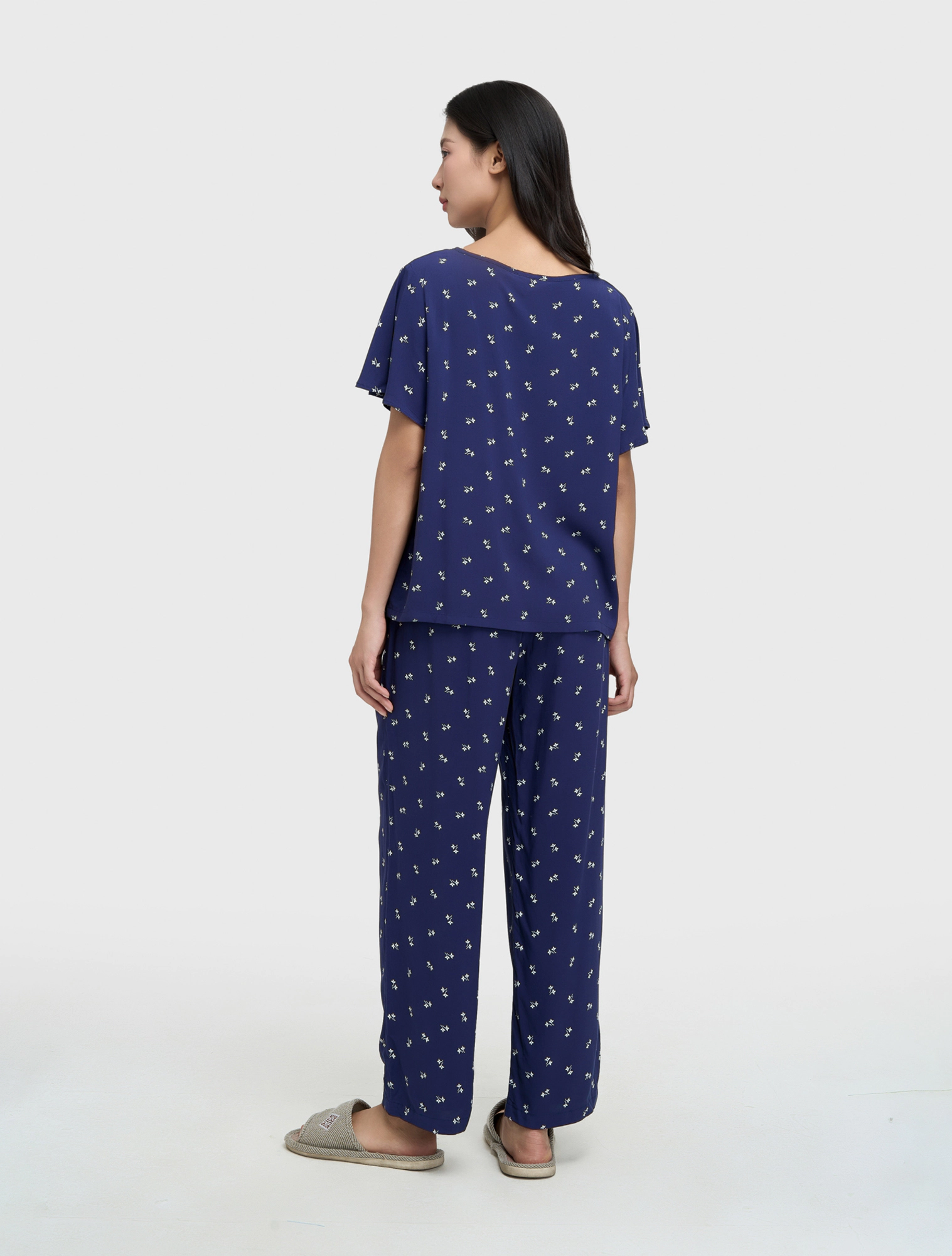 Bộ mặc nhà nữ với áo cộc và quần dài dáng suông, vải in họa tiết đơn giản và tinh tế, dễ dàng sử dụng.