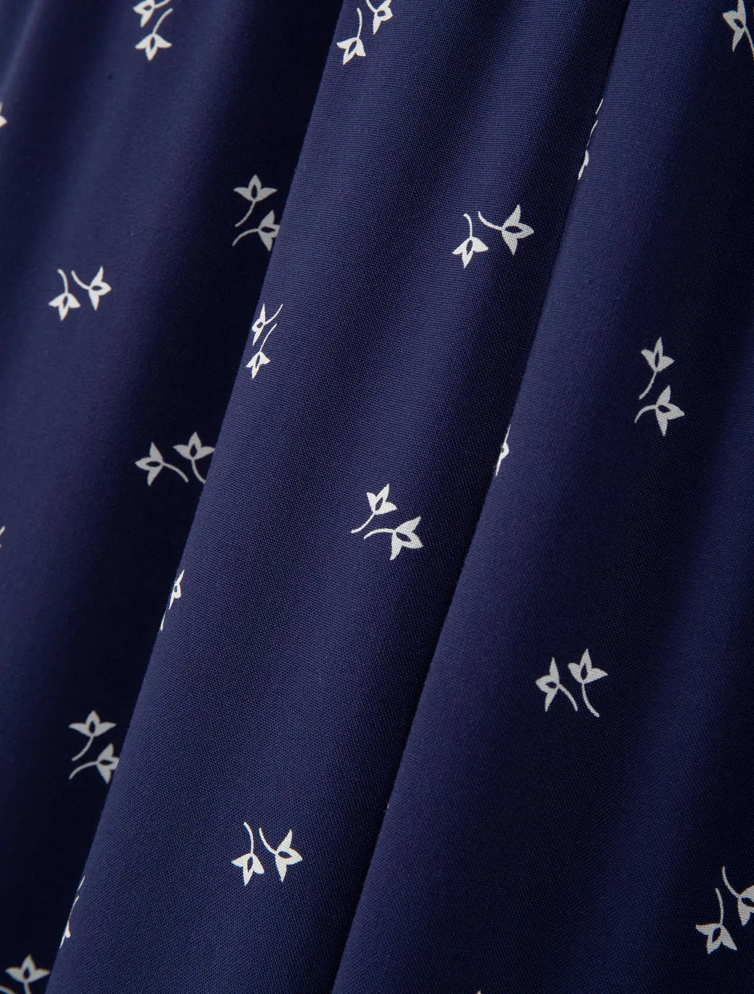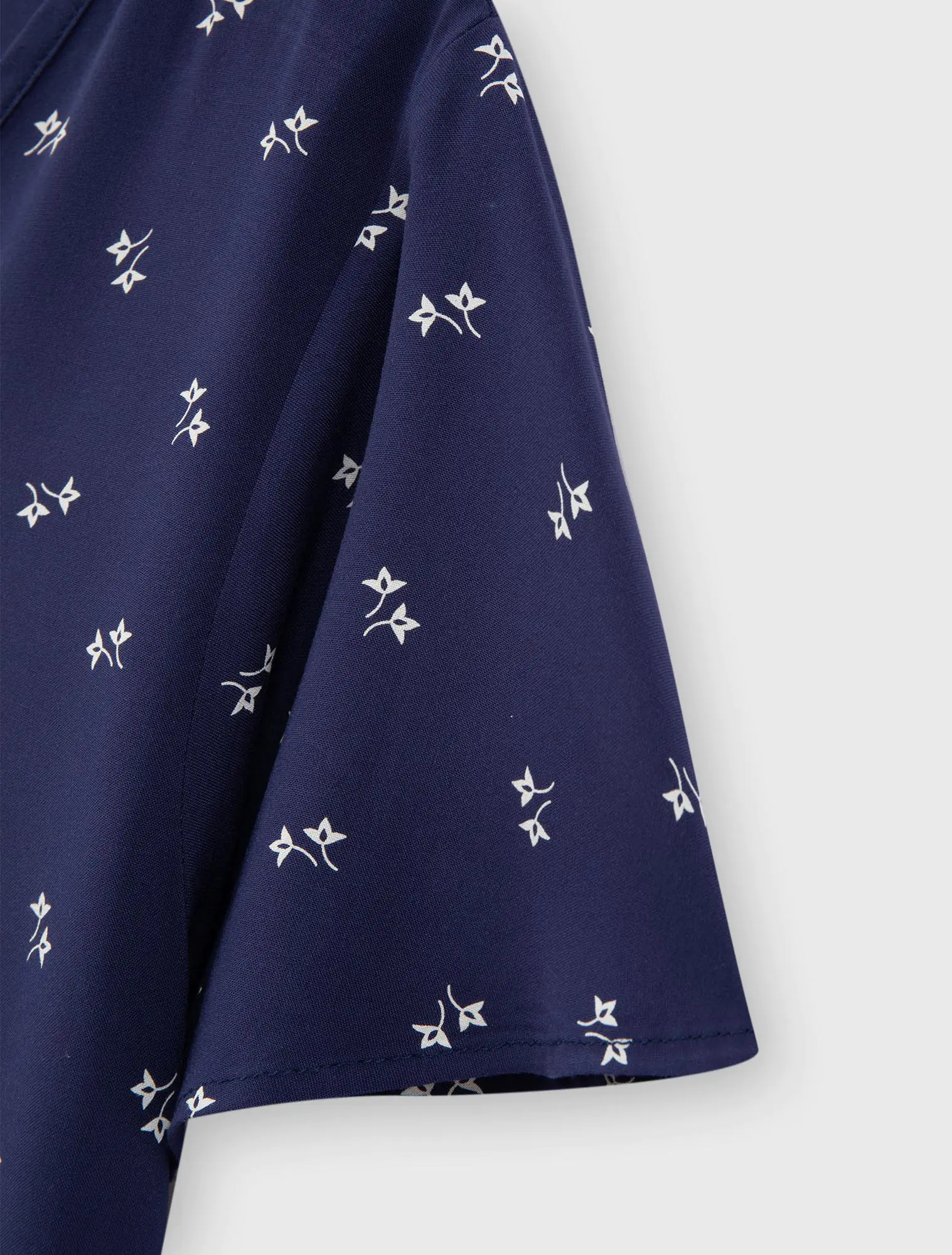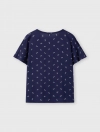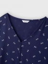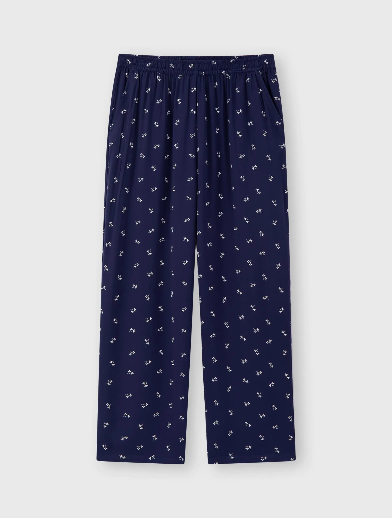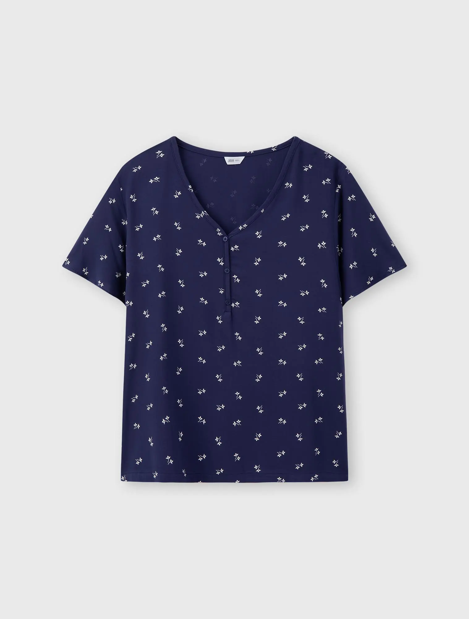 Bộ mặc nhà nữ với áo cộc và quần dài dáng suông, vải in họa tiết đơn giản và tinh tế, dễ dàng sử dụng.