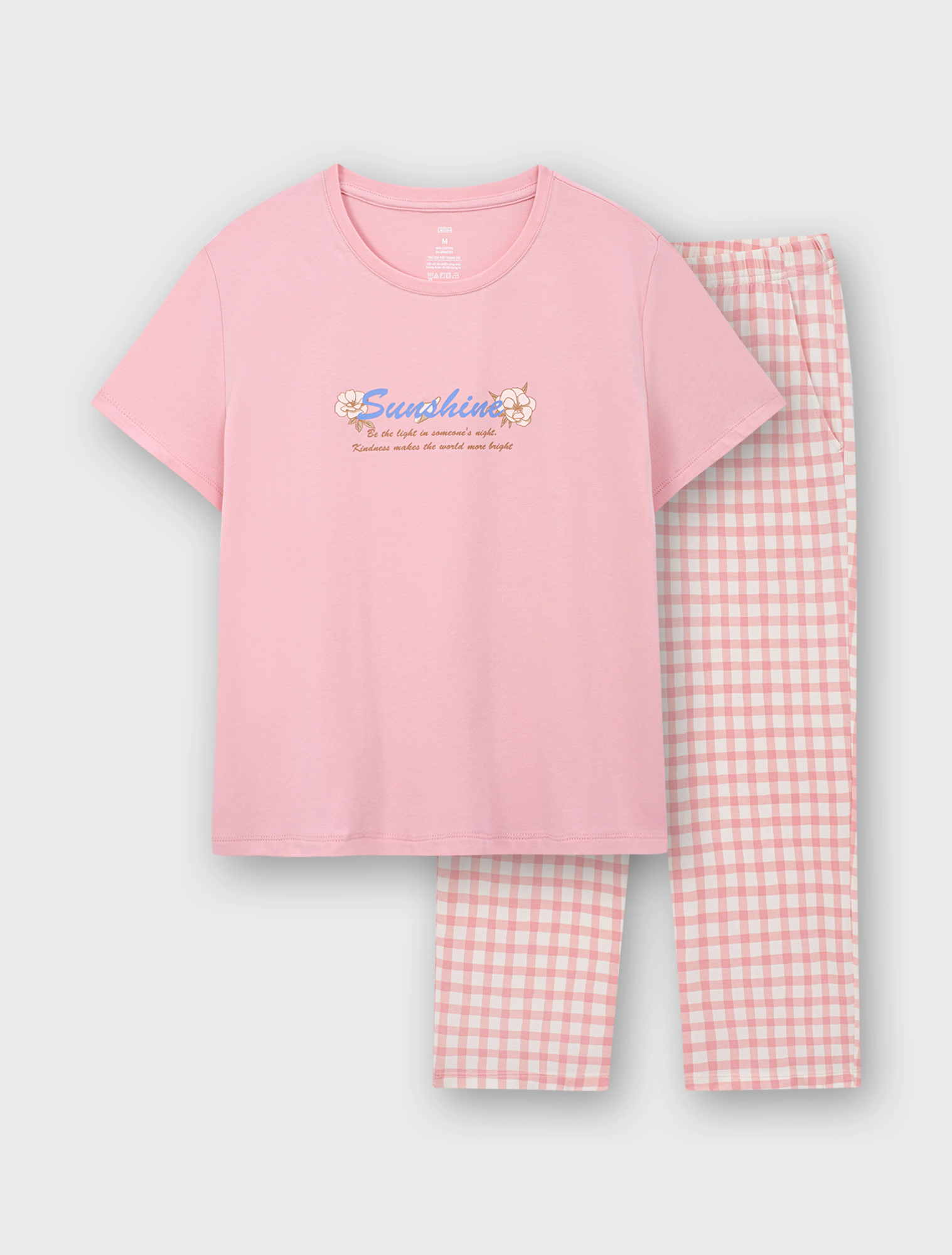 Bộ mặc nhà nữ có hình in, dáng lửng, với áo cộc tay và quần lửng qua gối, chất liệu vải cotton có co dãn tạo sự thoải mái tối đa khi sử dụng.