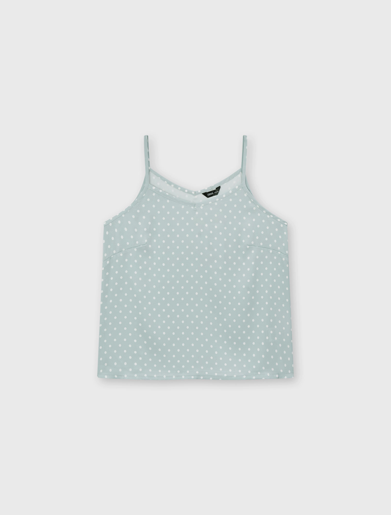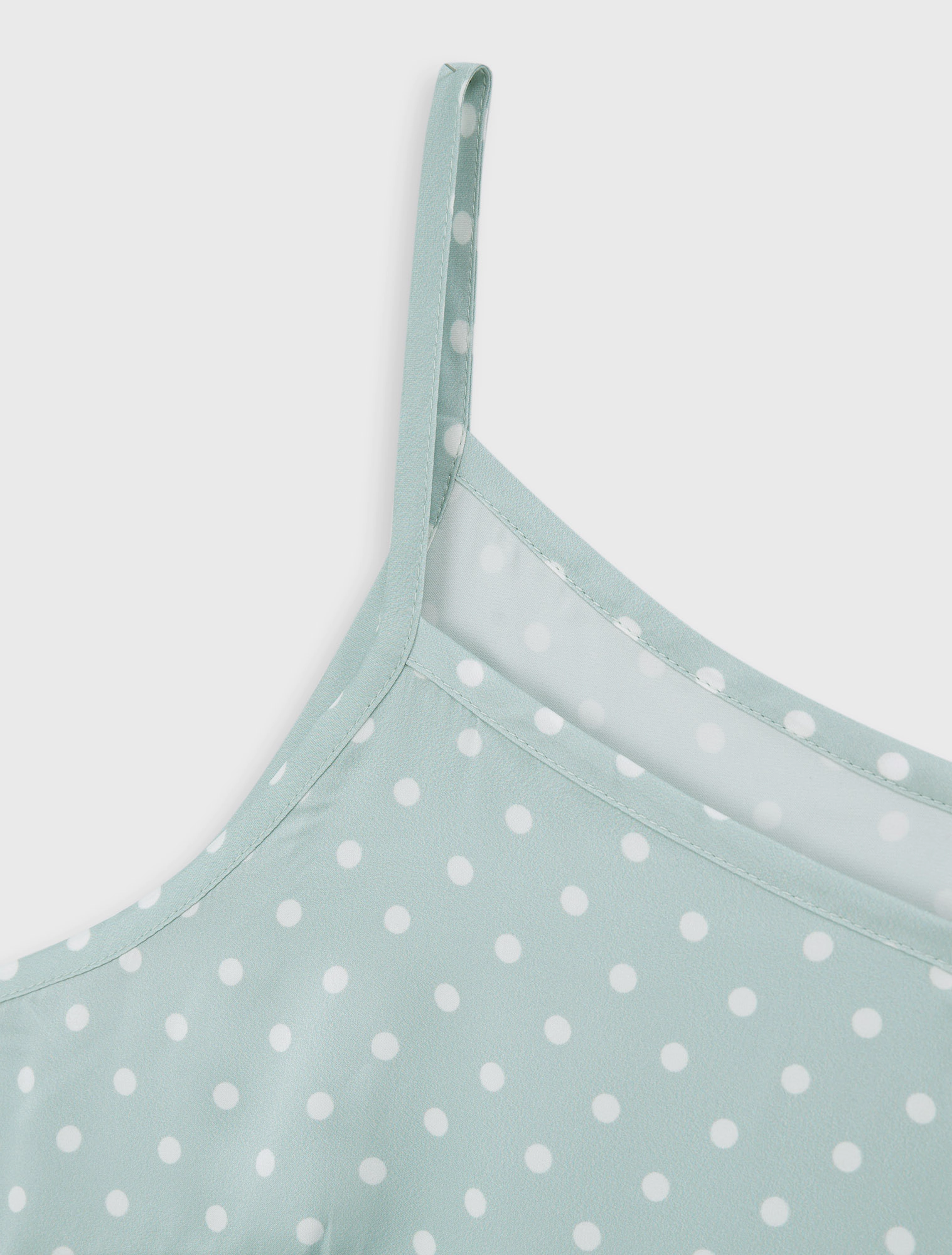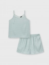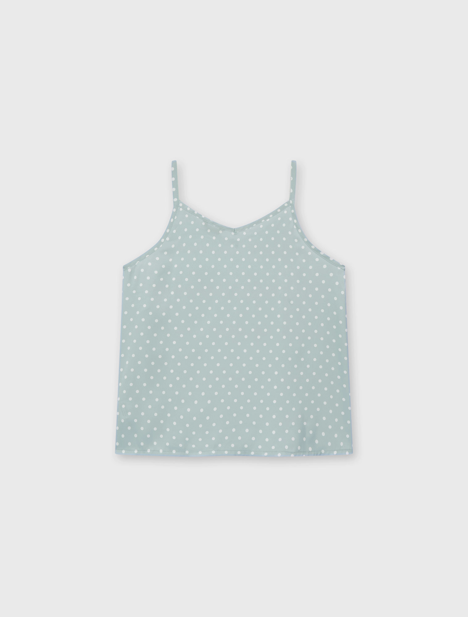 Bộ pyjama nữ dáng regular, với thiết kế áo 2 dây, quần shorts và hoạ tiết vải chấm bi trên chất liệu lụa poly mềm mại, tạo nên một item cơ bản nhưng vẫn trẻ trung và tươi mới.
