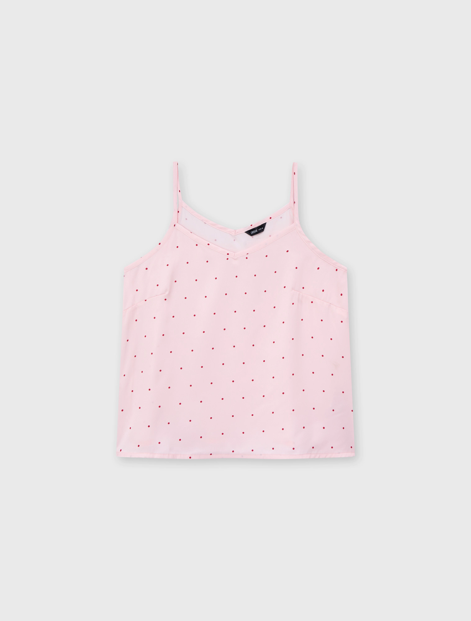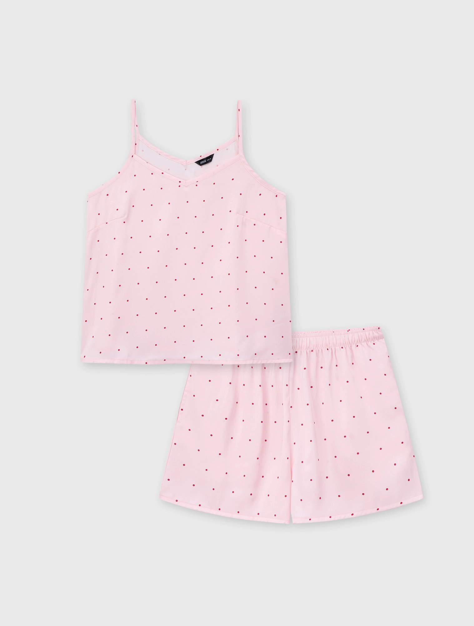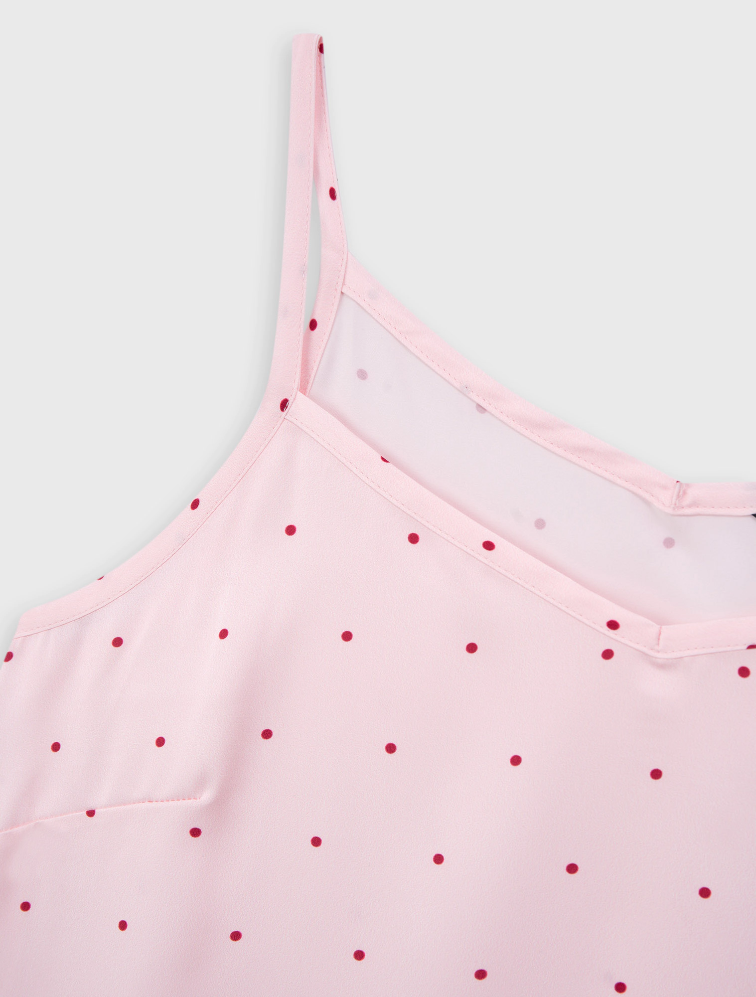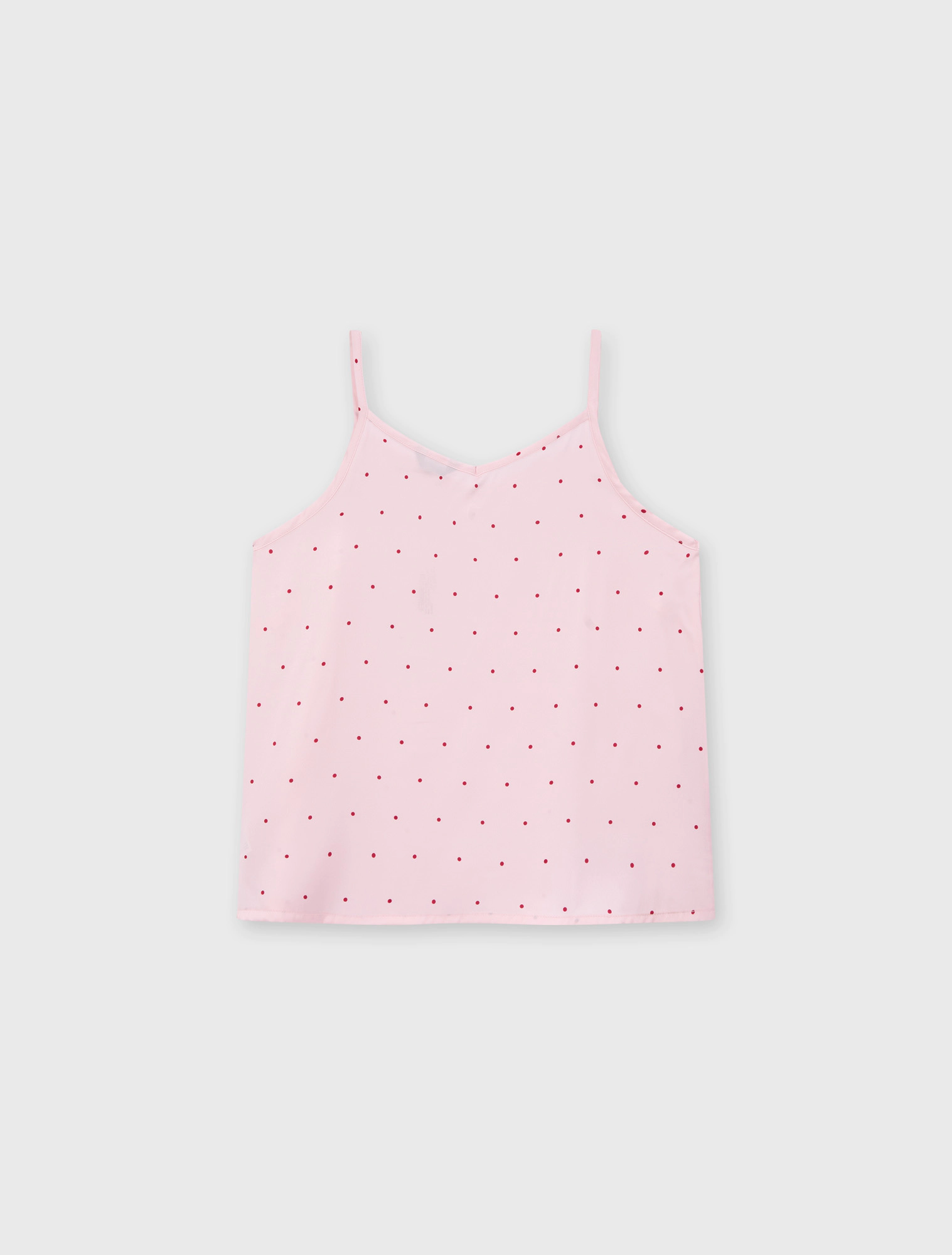 Bộ pyjama nữ dáng regular, với thiết kế áo 2 dây, quần shorts và hoạ tiết vải chấm bi trên chất liệu lụa poly mềm mại, tạo nên một item cơ bản nhưng vẫn trẻ trung và tươi mới.