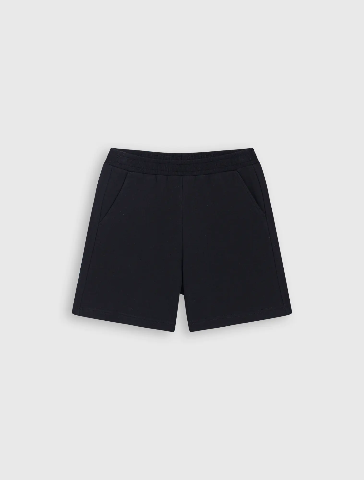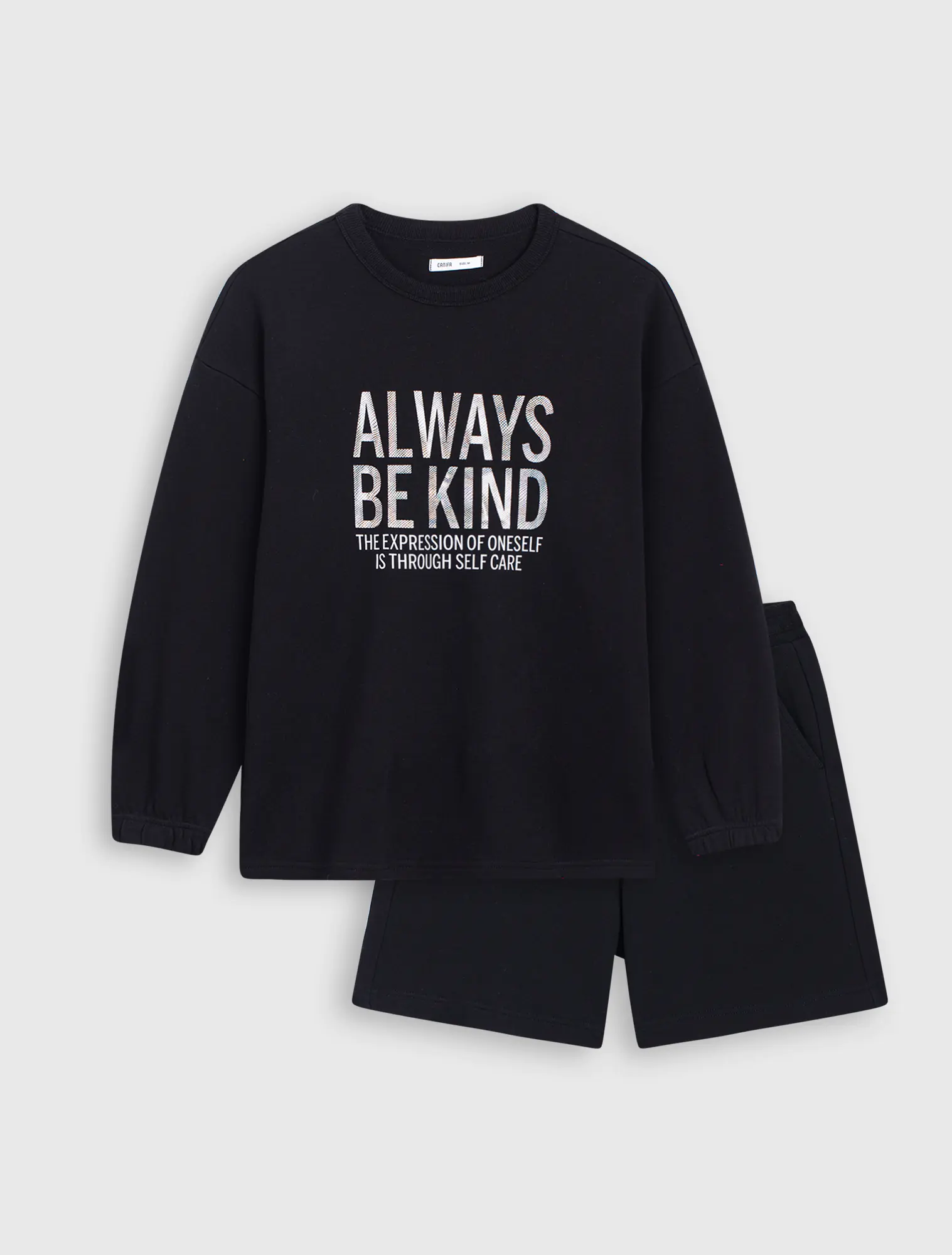 Bộ quần áo chất liệu cotton pha, áo cổ tròn tay dài, quần soóc cạp chun.
