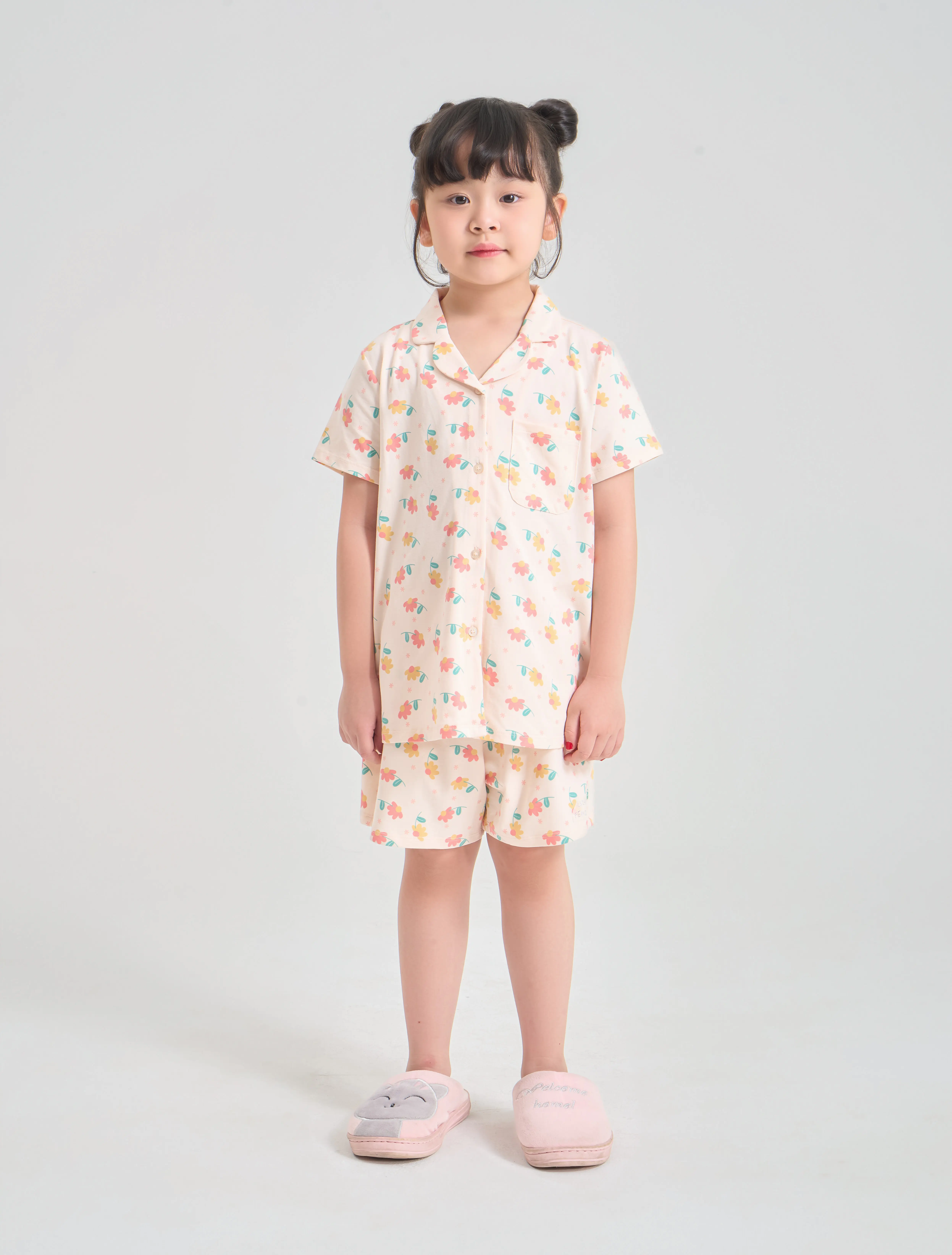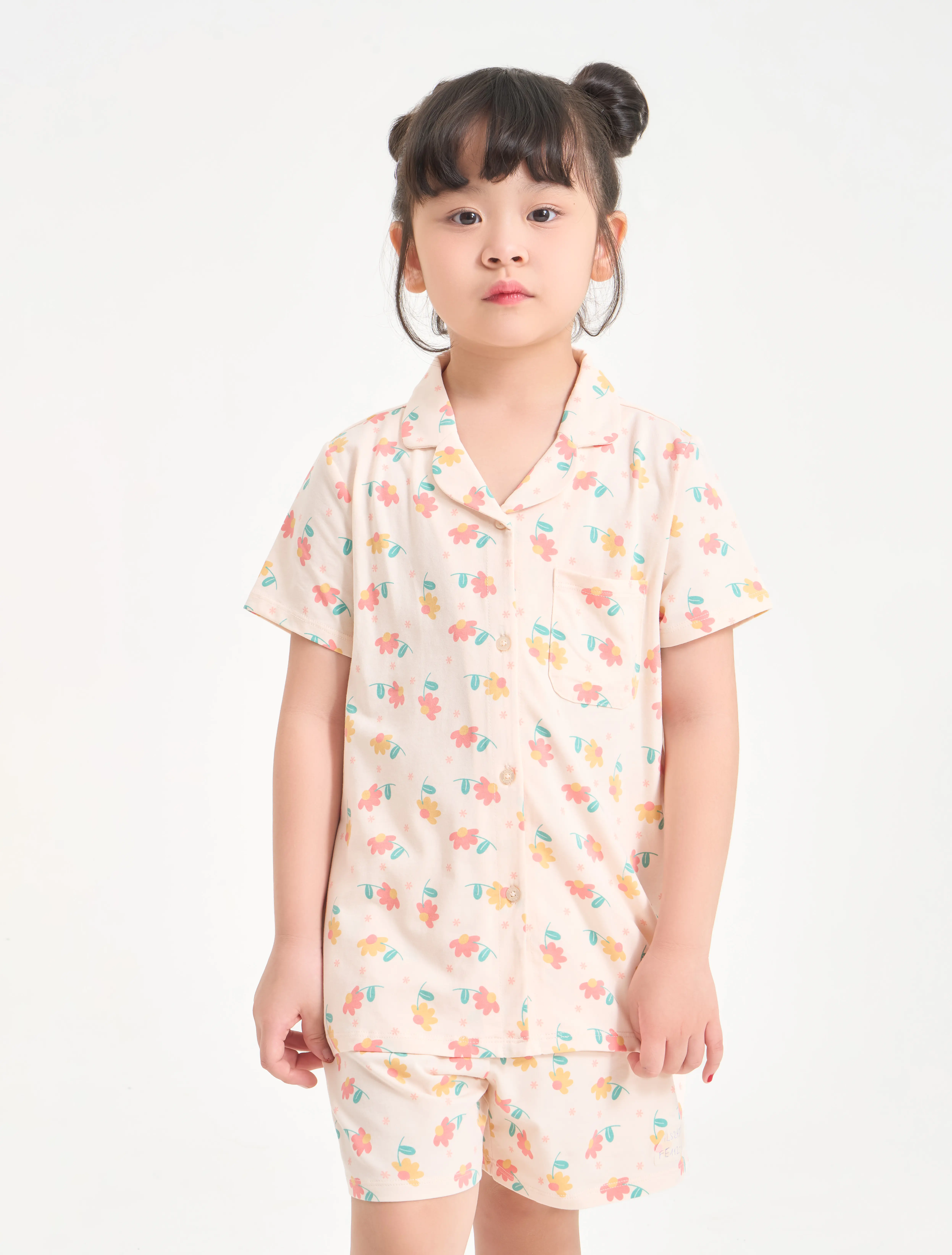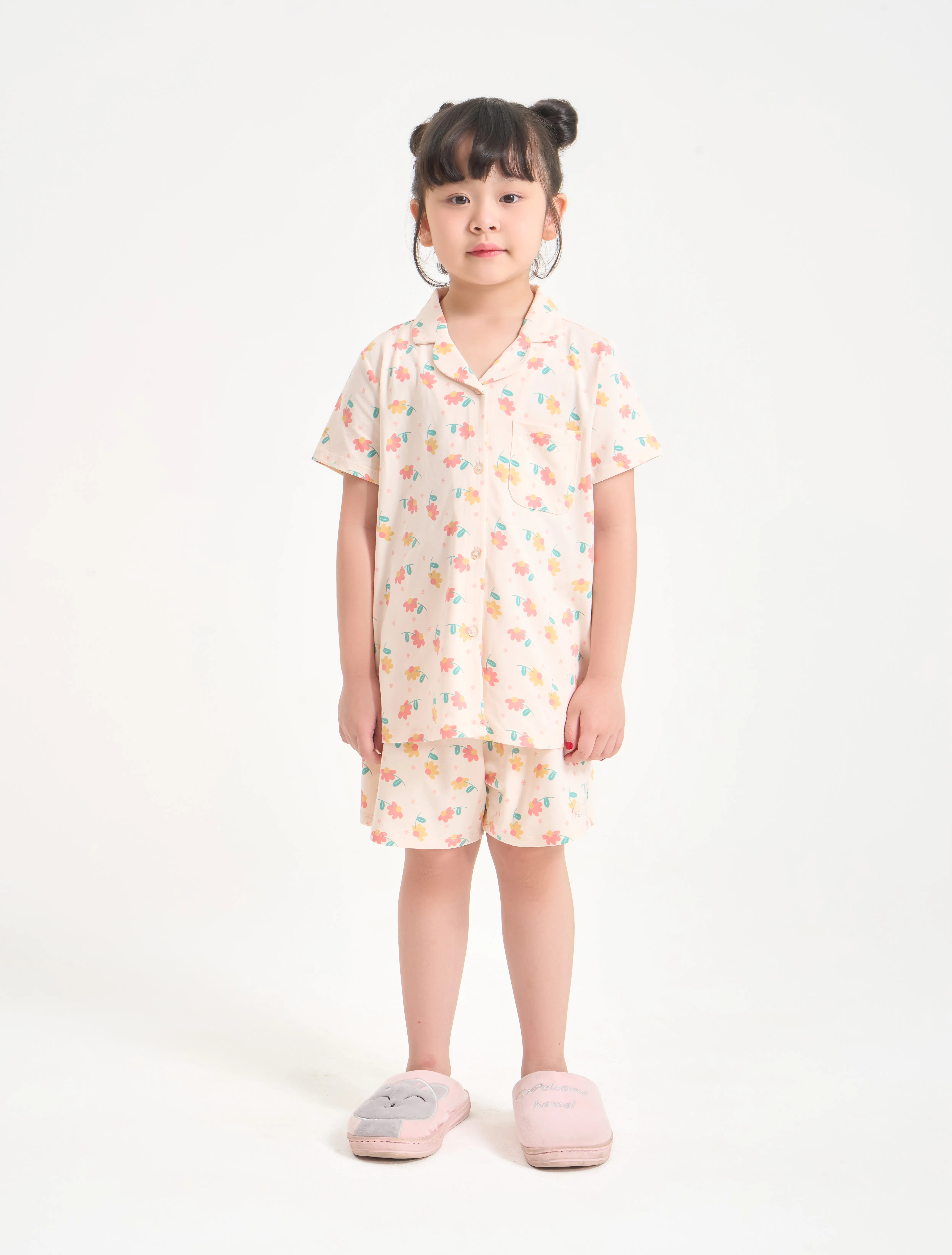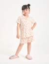 Bộ mặc nhà pyjamas áo cộc tay quần sooc bé gái. Kiểu dáng cơ bản dễ sử dụng. Mùa sắc, họa tiết tươi sáng, dễ thương, phù hợp bé gái.