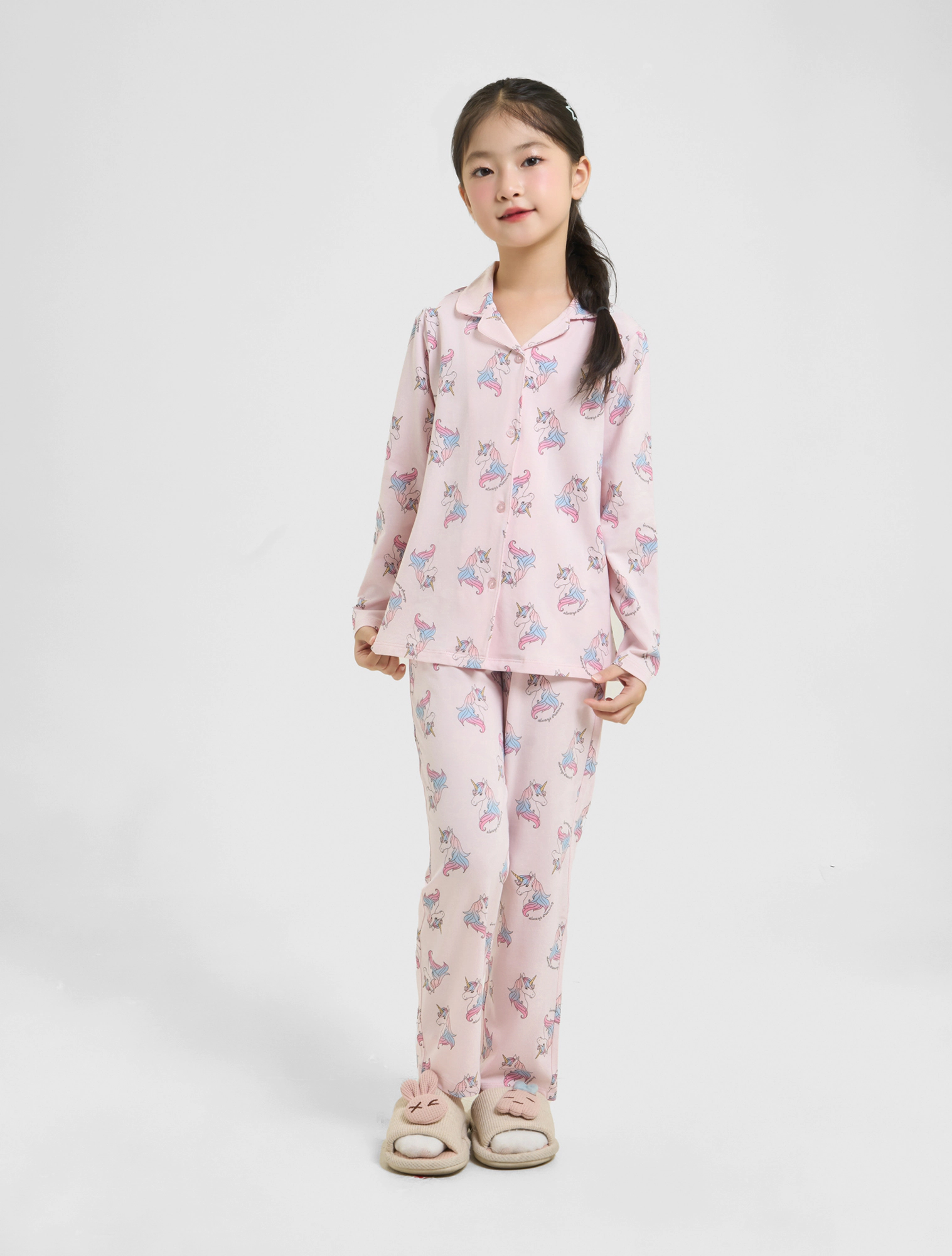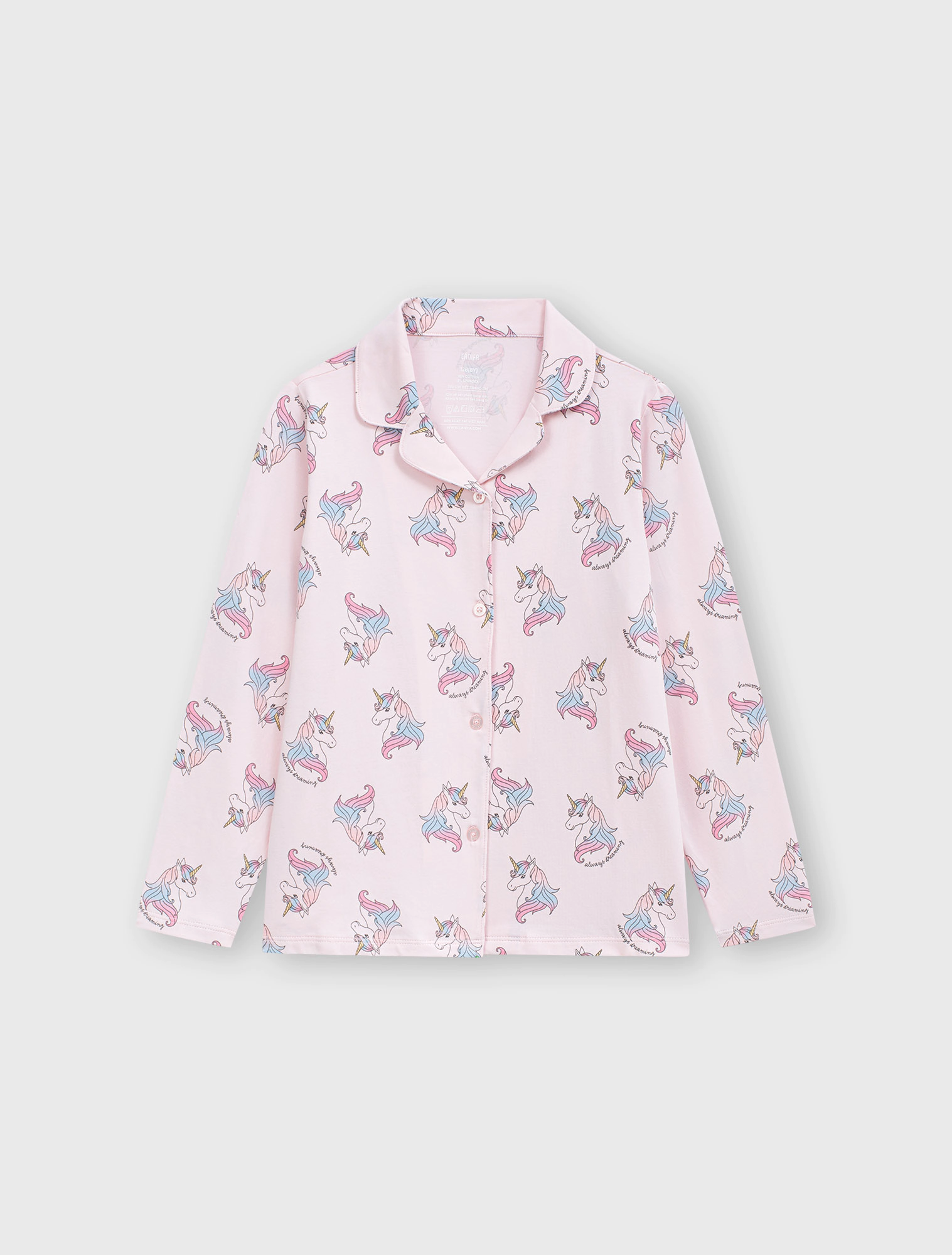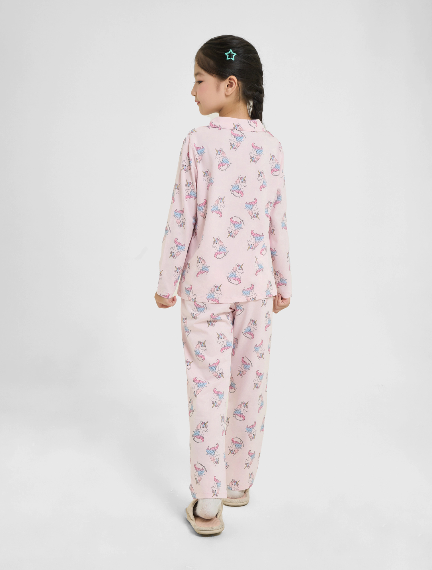 Bộ mặc nhà pyjama bé gái họa tiết,áo dài tay, quần dài dáng suông.