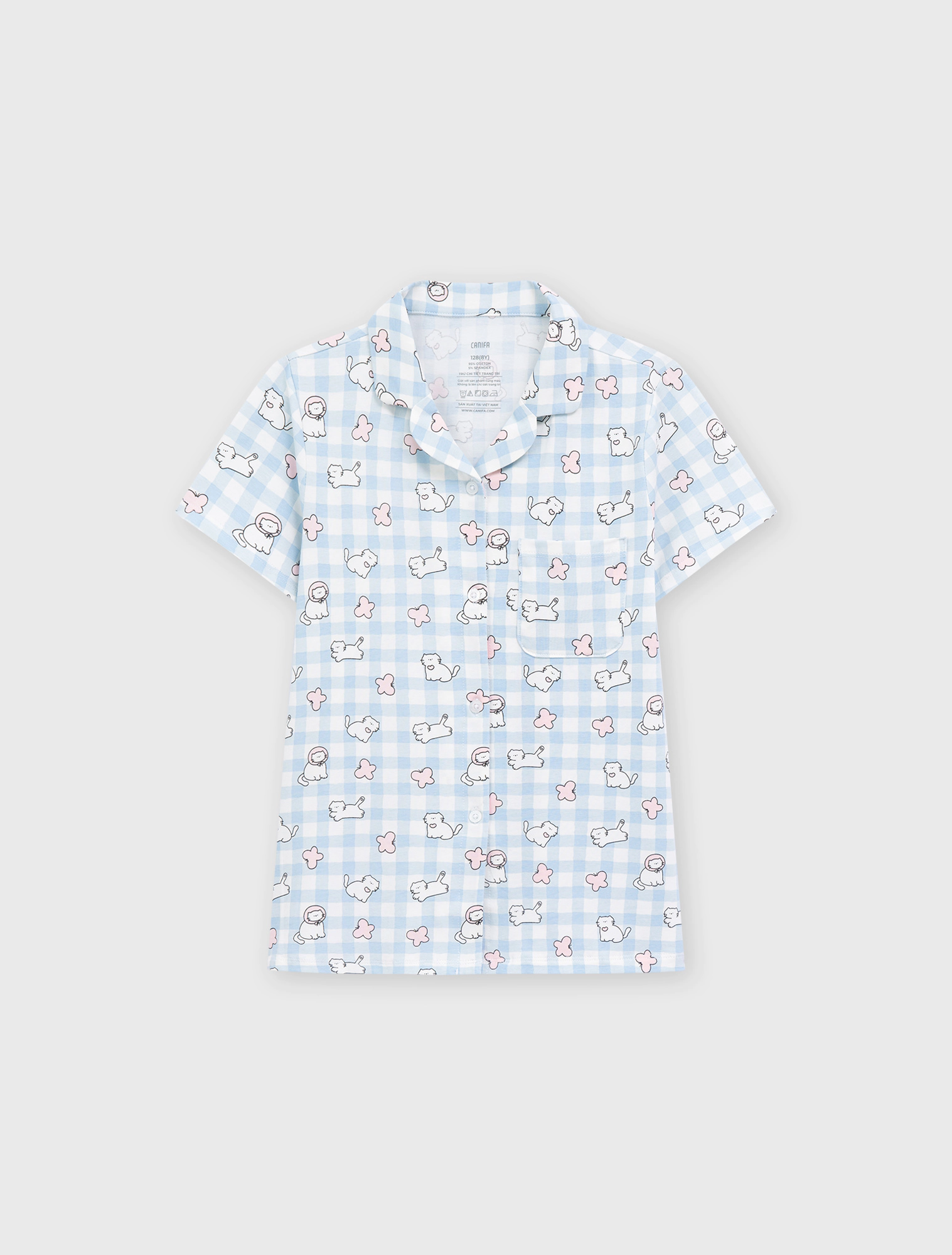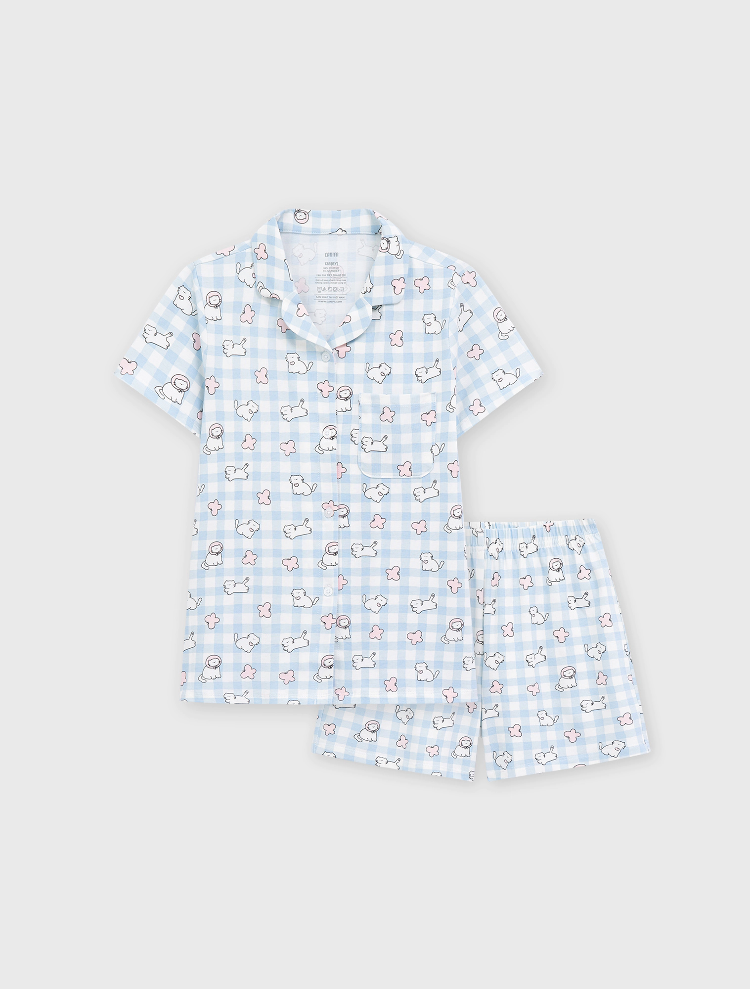 Bộ mặc nhà pyjama bé gái áo ngắn tay, quần shorts. Phom dáng cơ bản dễ mặc. Màu sắc và hình in tươi sáng, dễ thương.