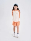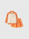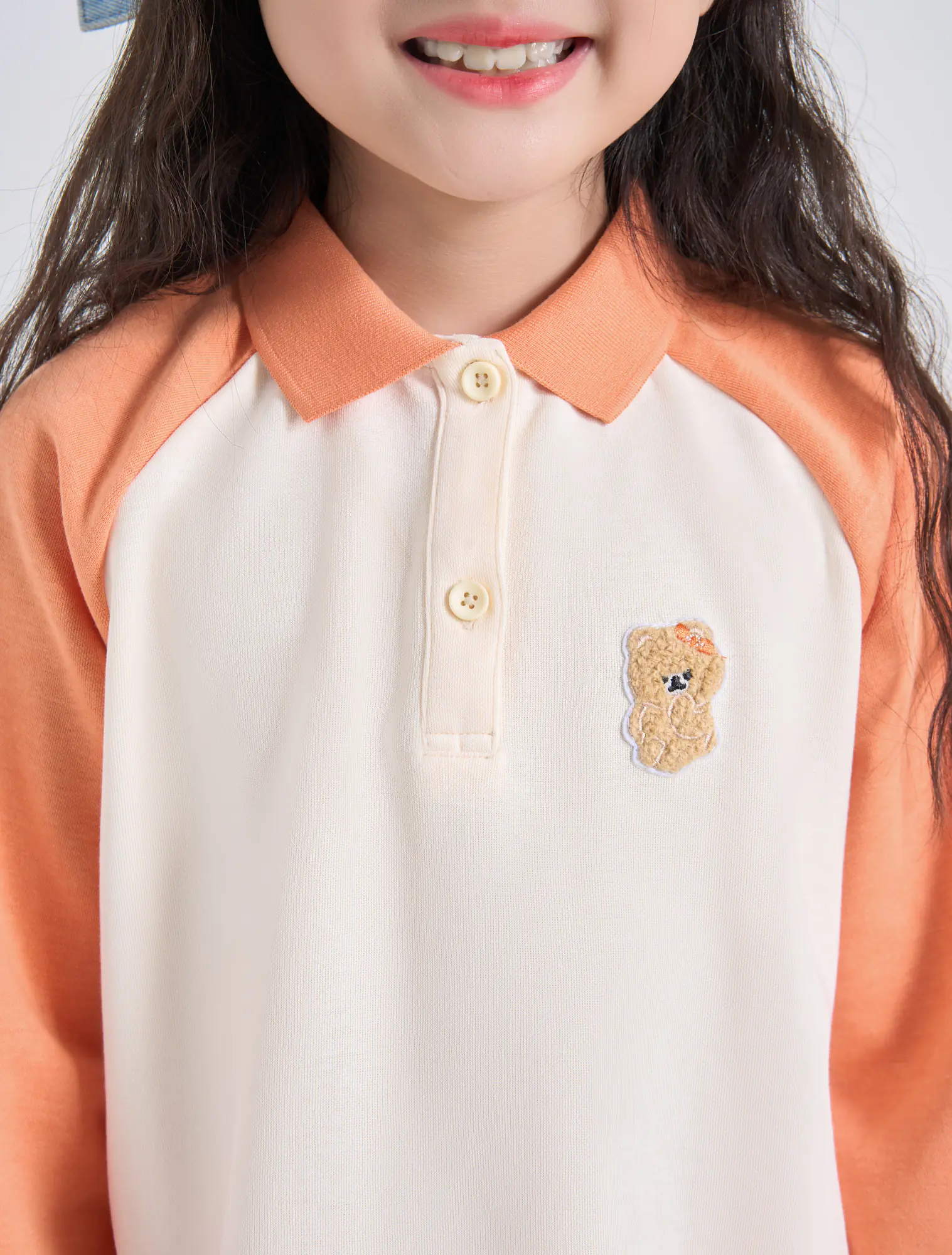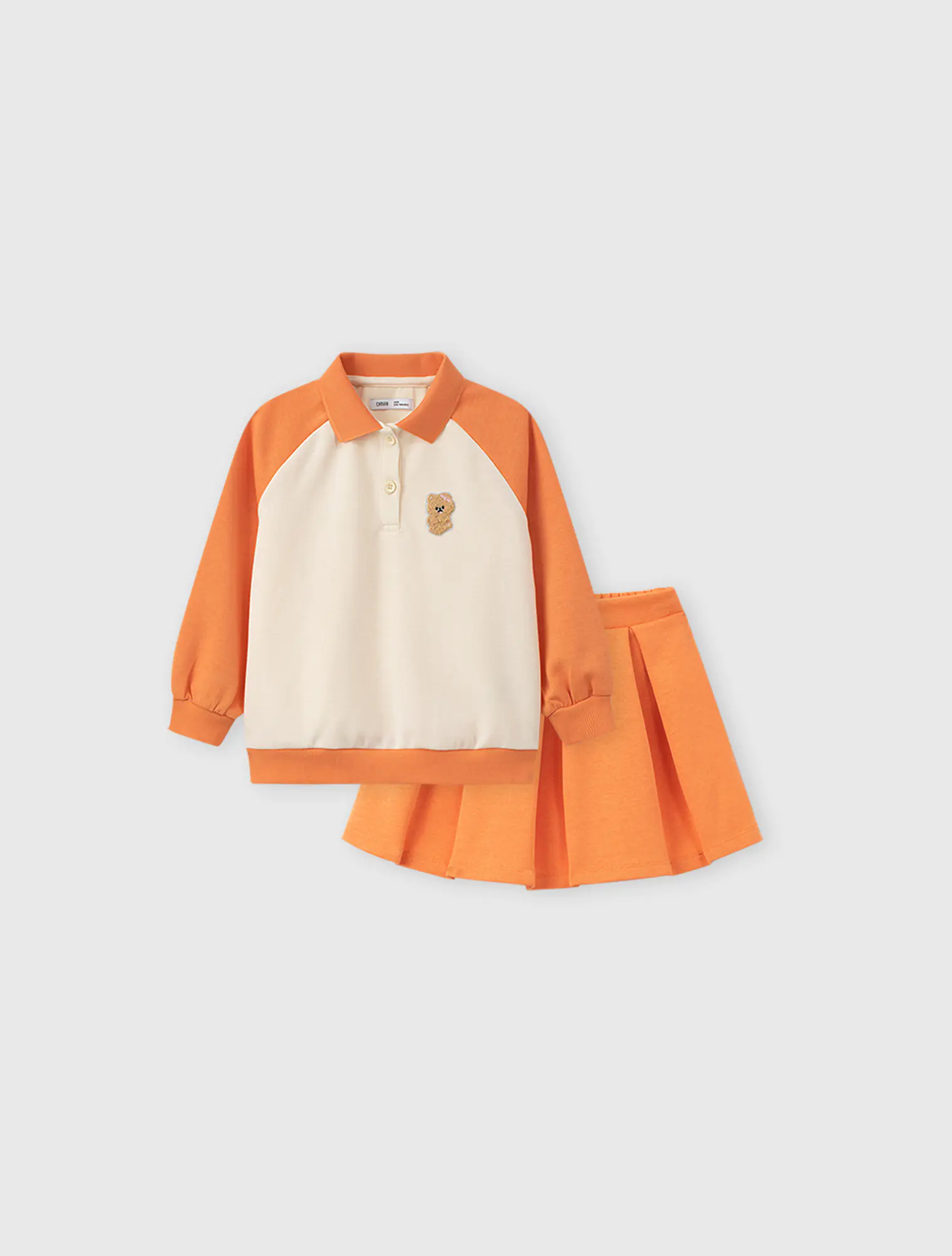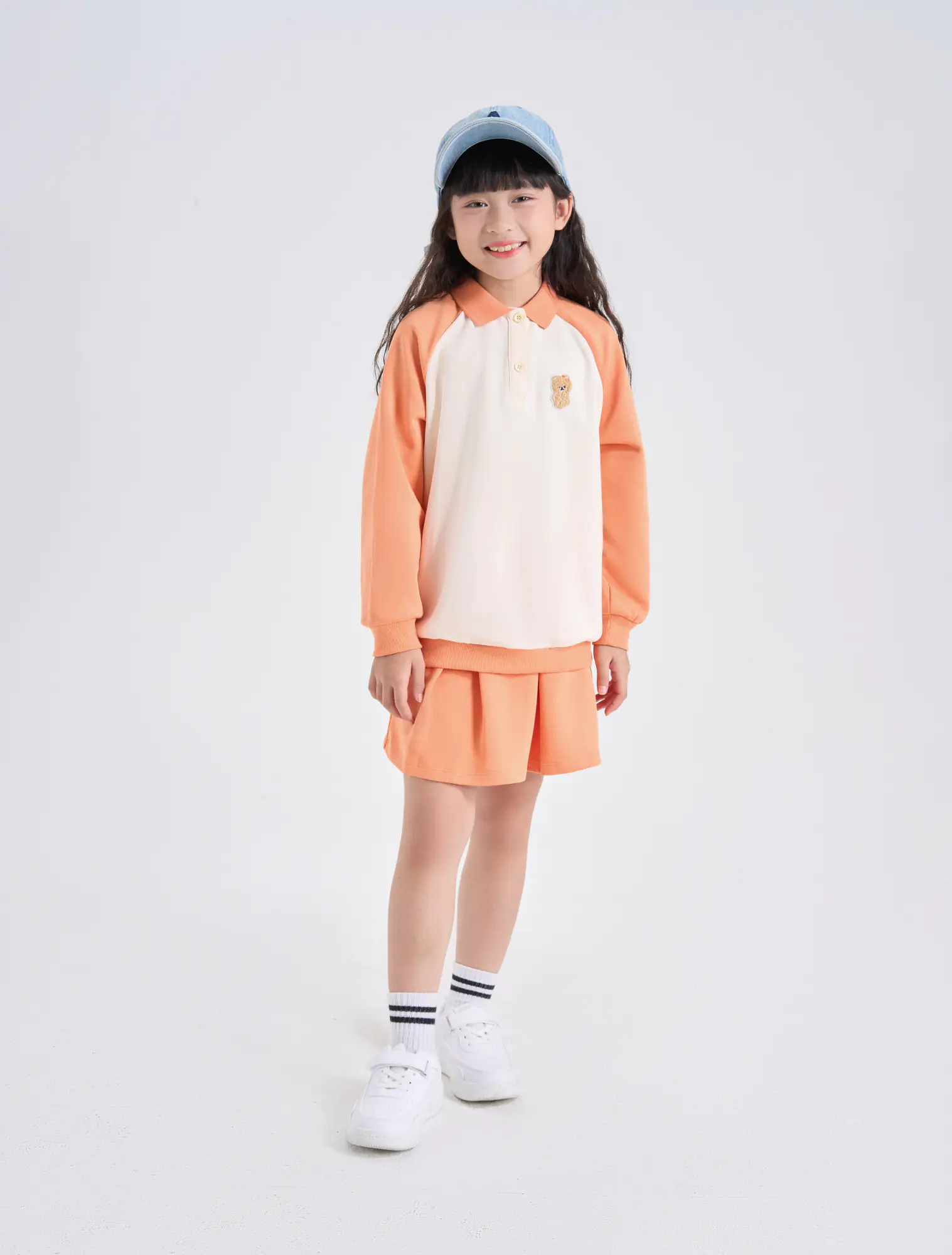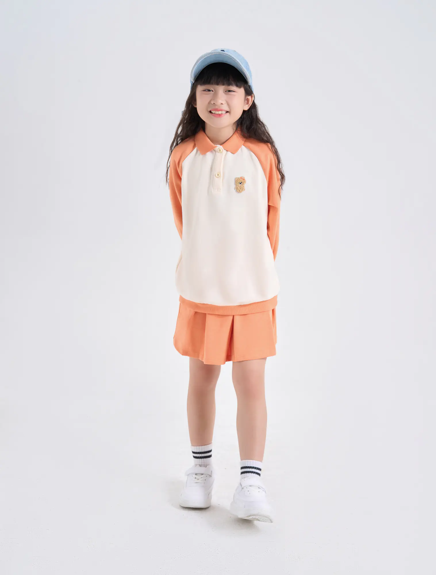 Bộ áo dài tay và chân váy xòe bé gái, phom dáng hiện đại, pha phối màu thời trang, nữ tính, đính patch trang trí đáng yêu.
