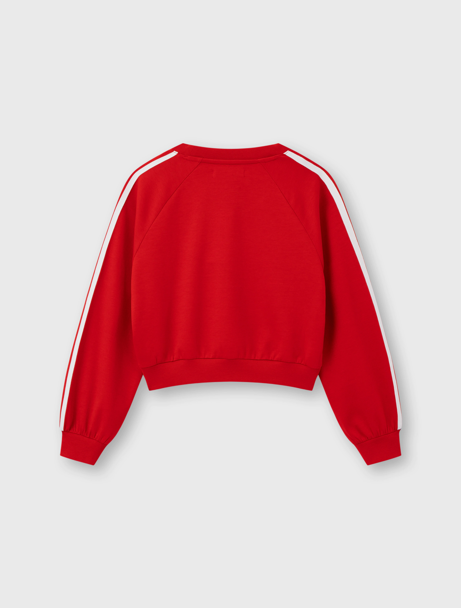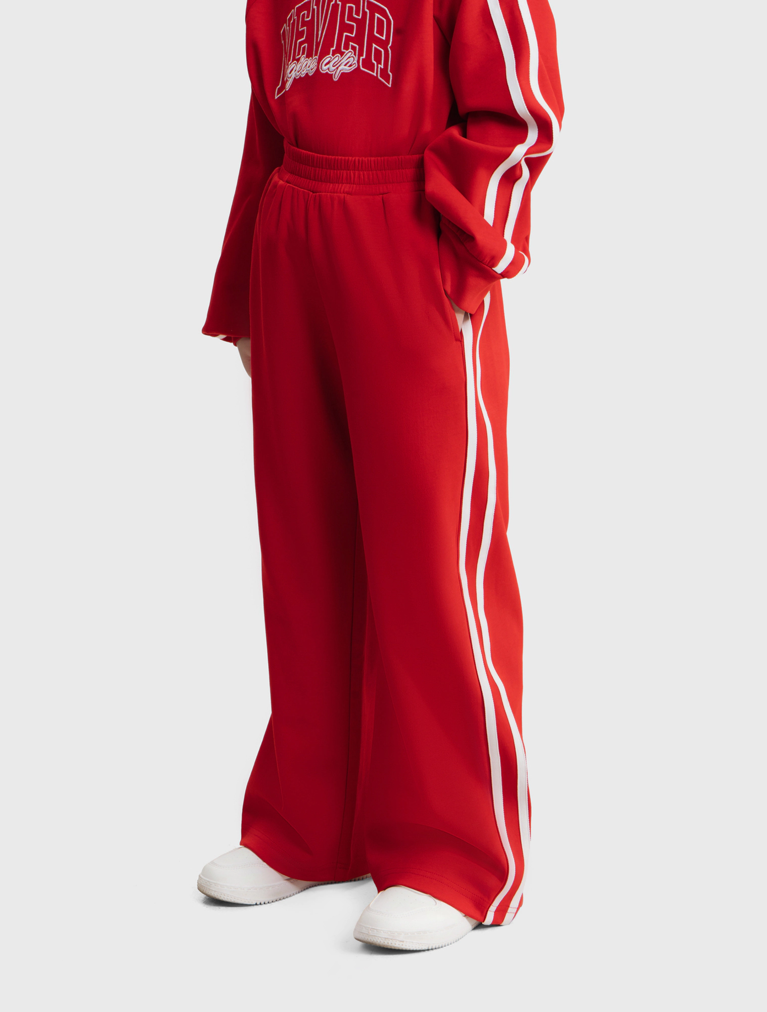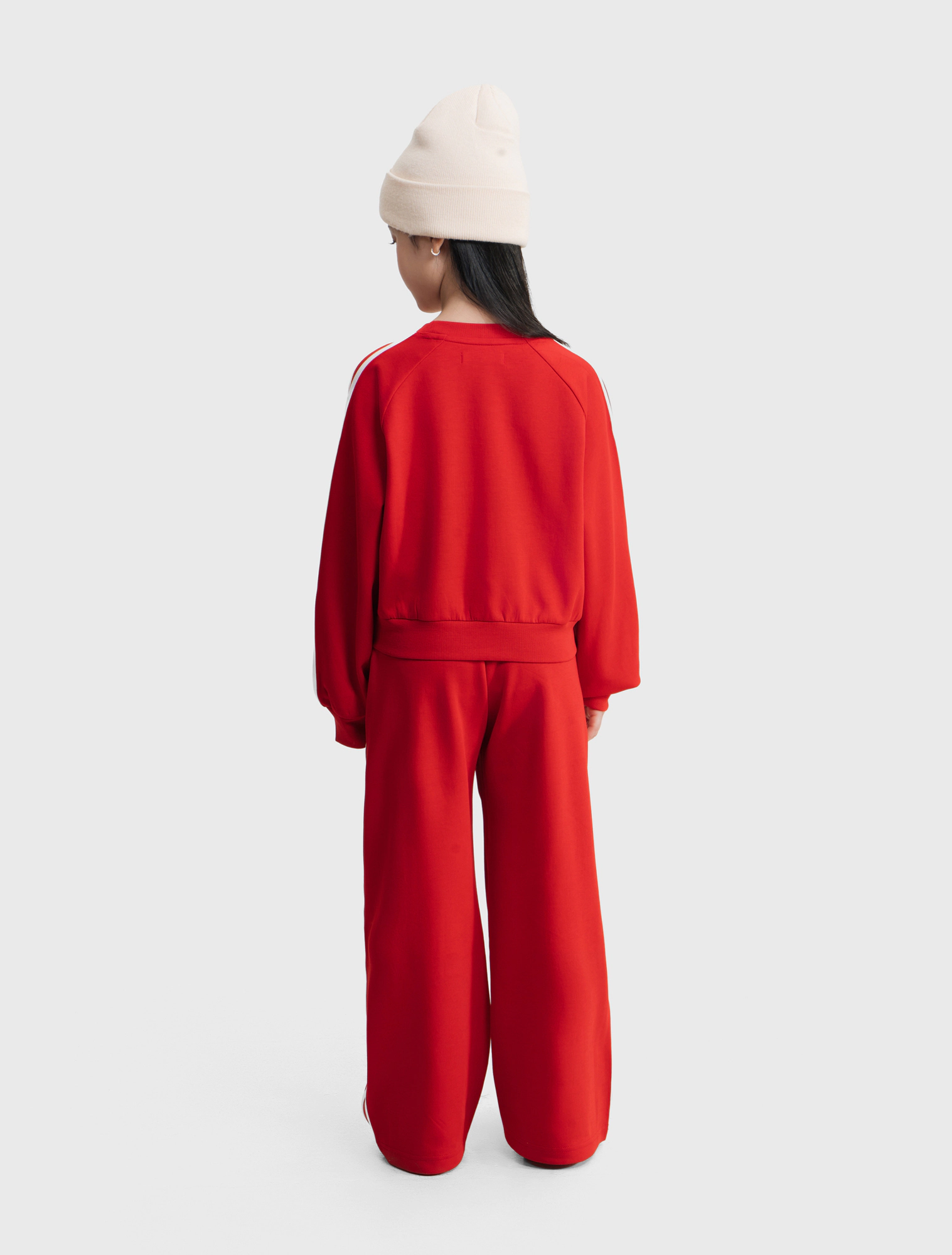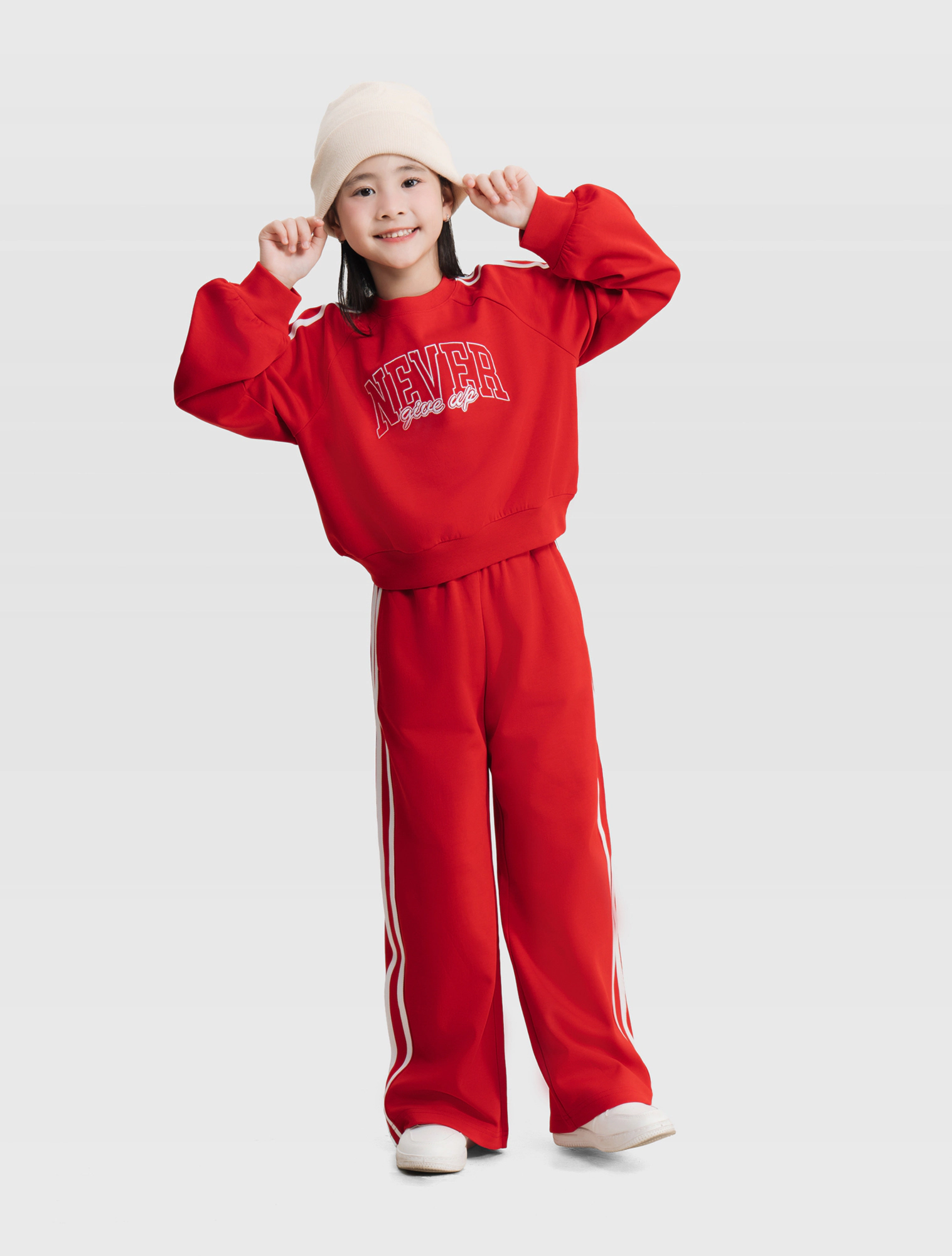 Bộ quần áo bé gái. Áo dài tay kết hợp quần suông trẻ trung hiện đại. Màu đỏ nổi bật, sống tay và sườn quần đè dây dệt trắng trang trí cá tính, đồ họa phù hợp bé gái. Chất liệu Interlock mềm mại, giữ ấm tốt, đứng phom.