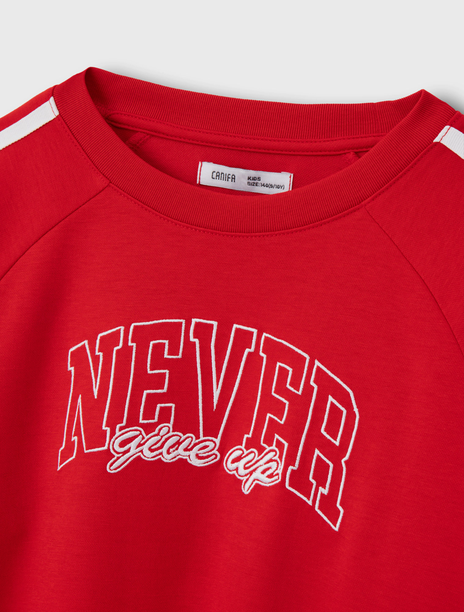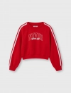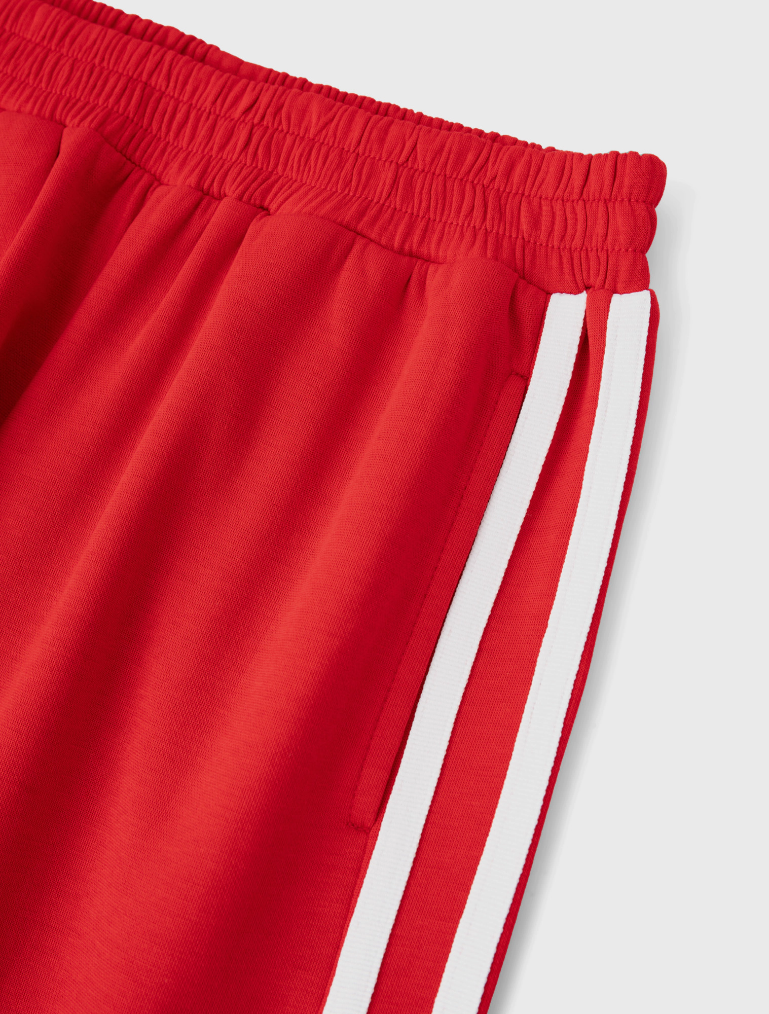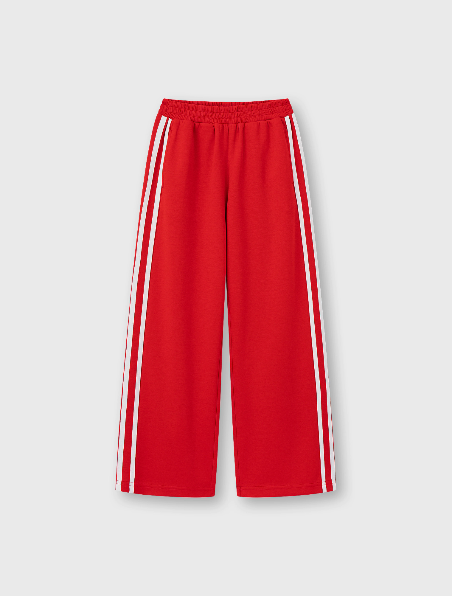 Bộ quần áo bé gái. Áo dài tay kết hợp quần suông trẻ trung hiện đại. Màu đỏ nổi bật, sống tay và sườn quần đè dây dệt trắng trang trí cá tính, đồ họa phù hợp bé gái. Chất liệu Interlock mềm mại, giữ ấm tốt, đứng phom.