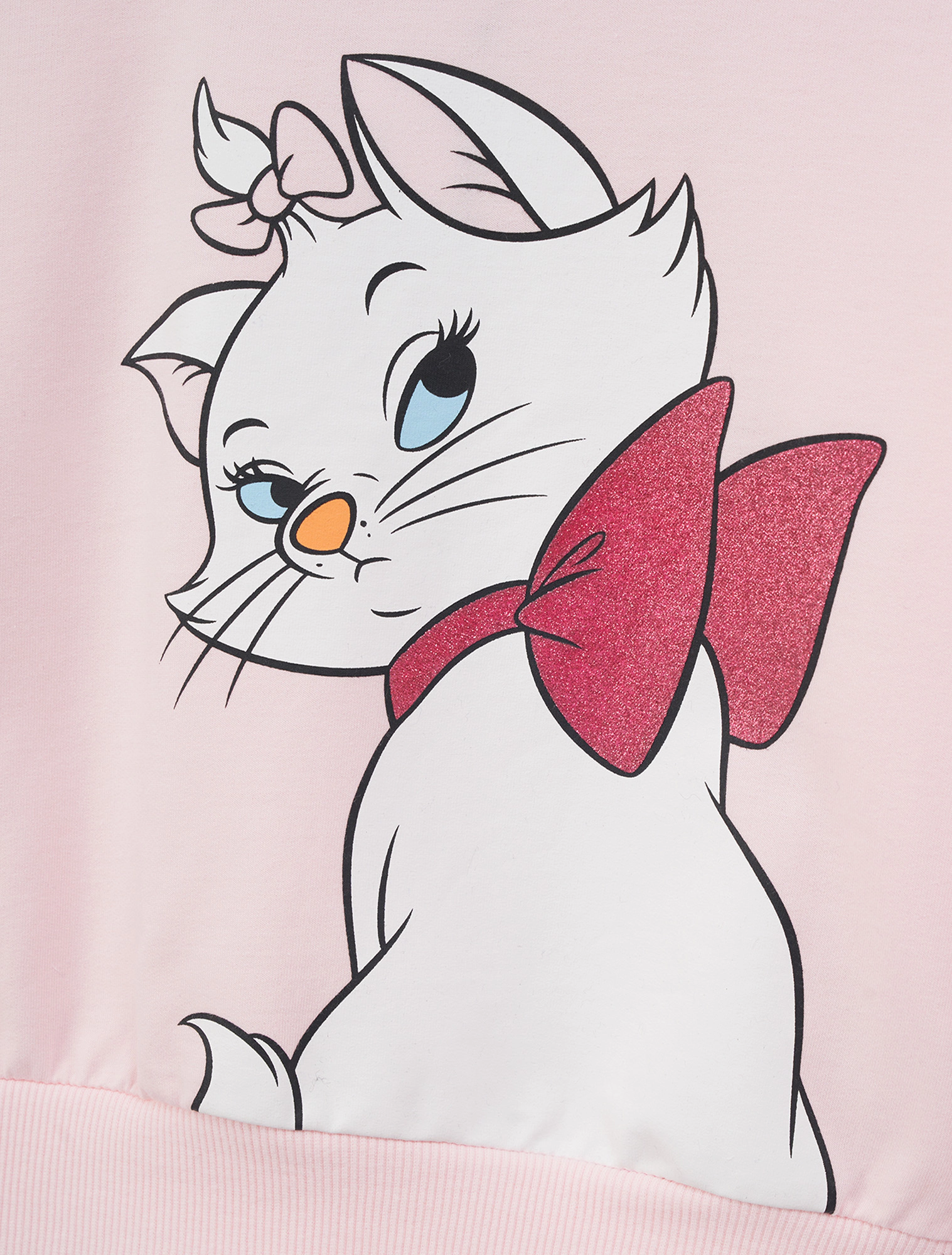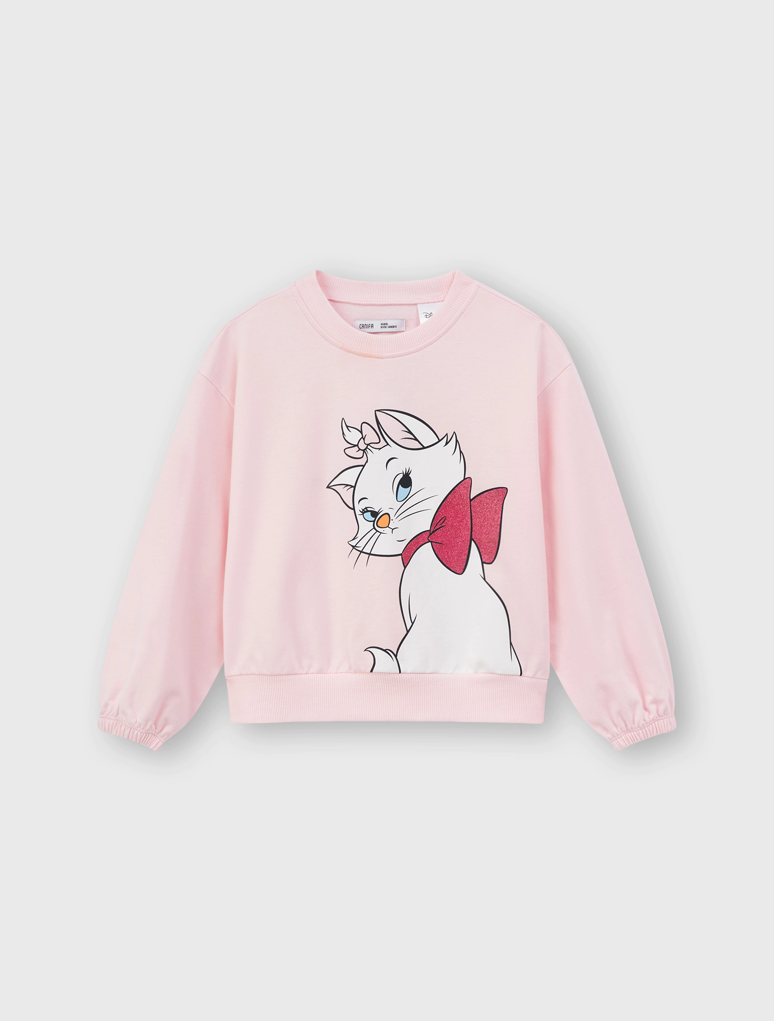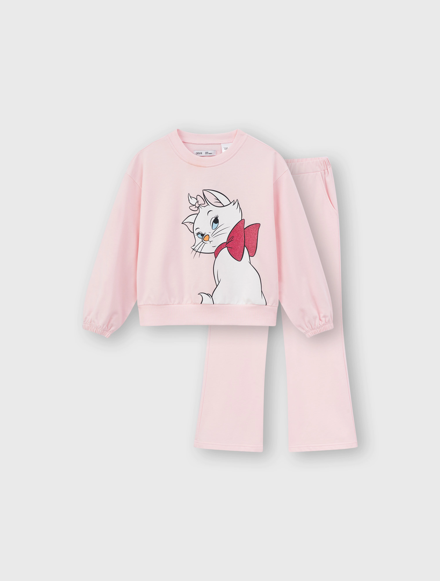 Bộ quần áo bé gái. Áo cổ tròn, tay phồng kết hợp quần dài ống vẩy thời trang. Màu sắc tươi sáng, hình in mèo Marie đáng yêu, phù hợp bé gái. Chất liệu Coton pha mềm mại, giữ ấm tốt.