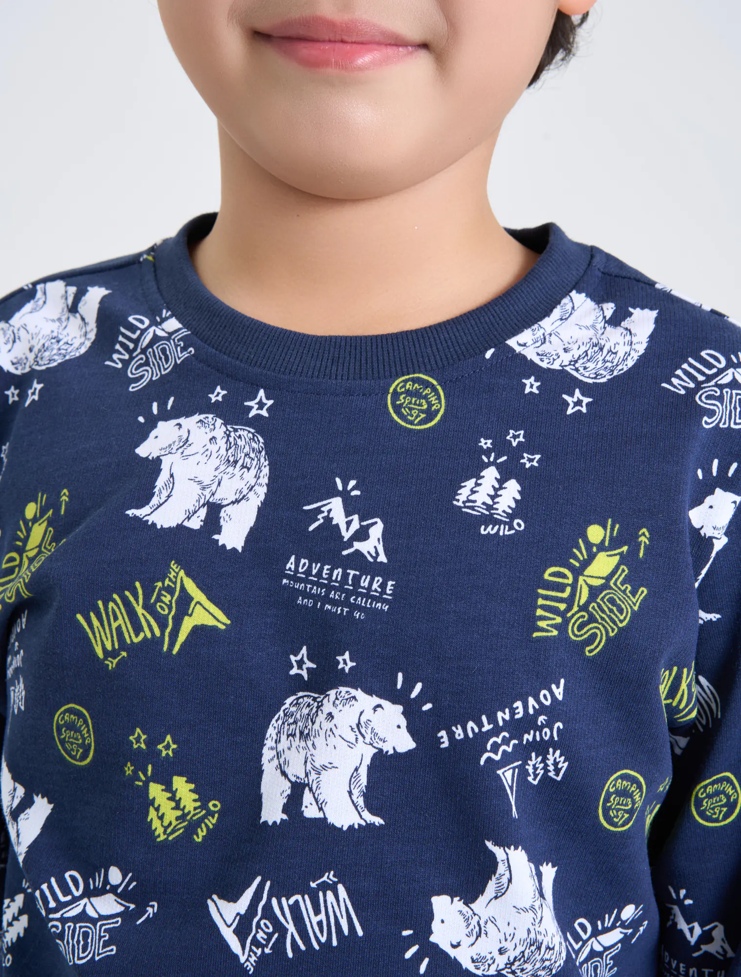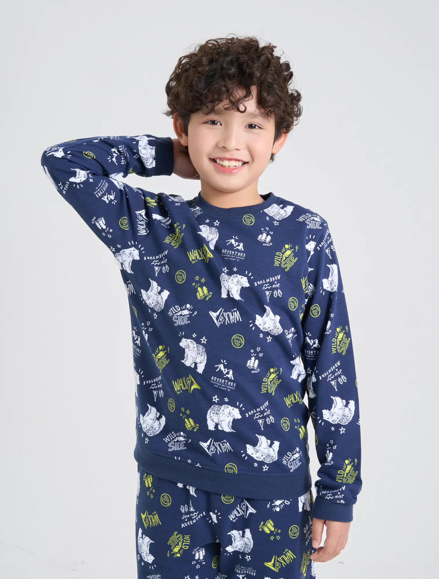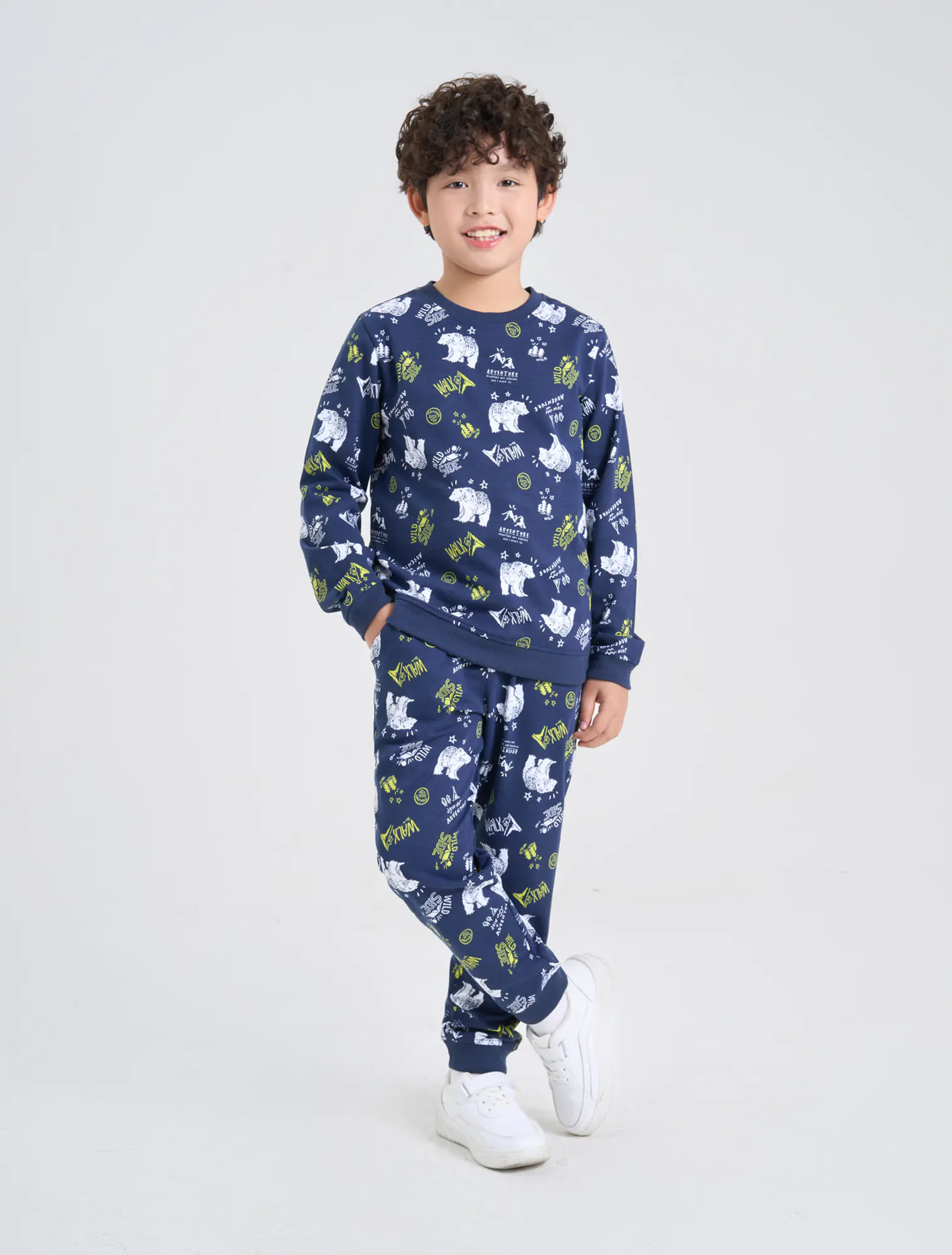 Bộ quần áo bé trai in tràn, chất liệu vảy cá, phom dáng basic phù hợp cho sự lựa chọn của các bé.