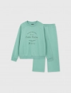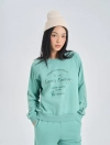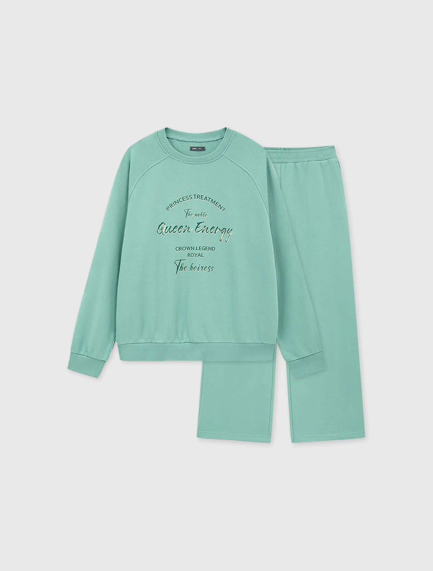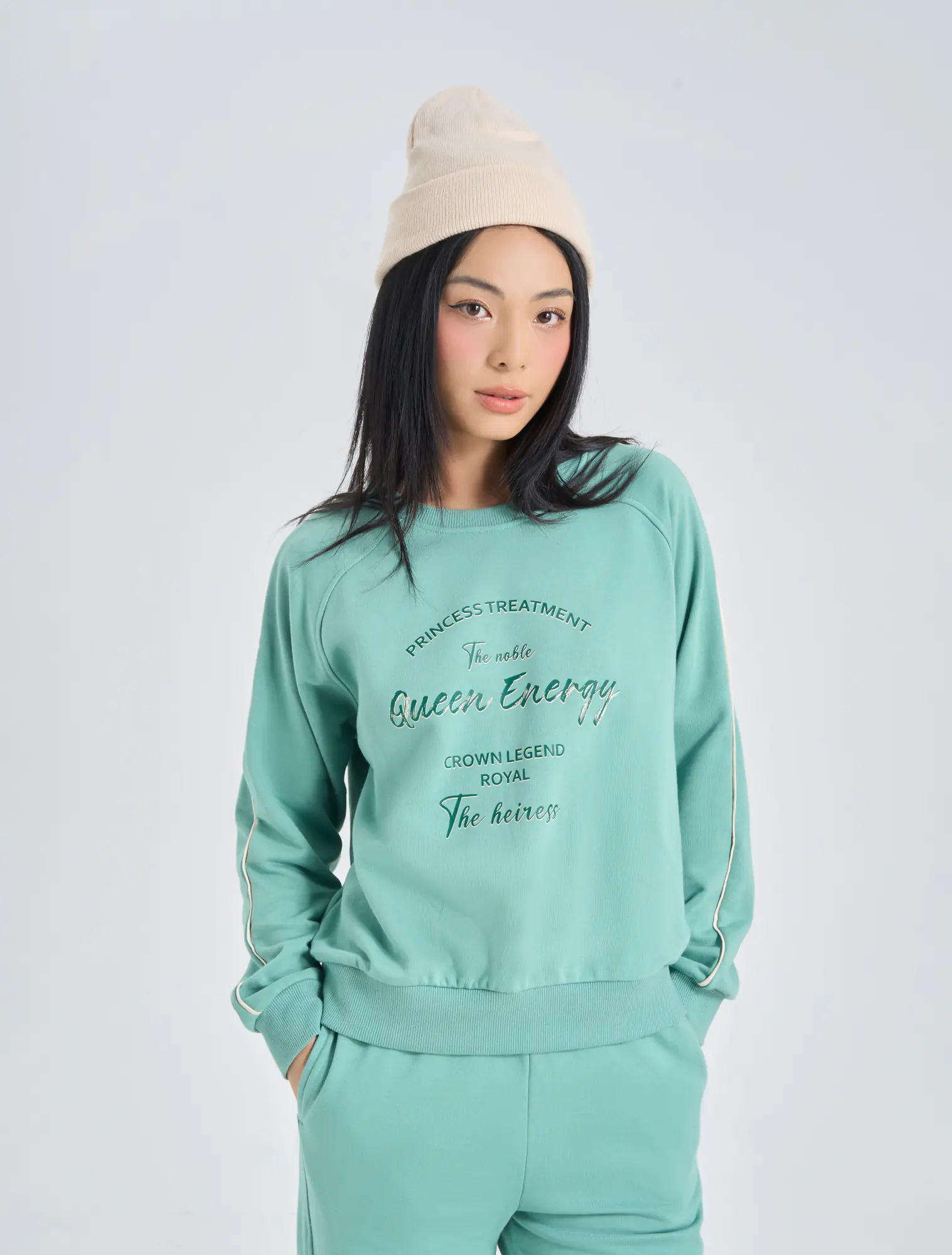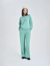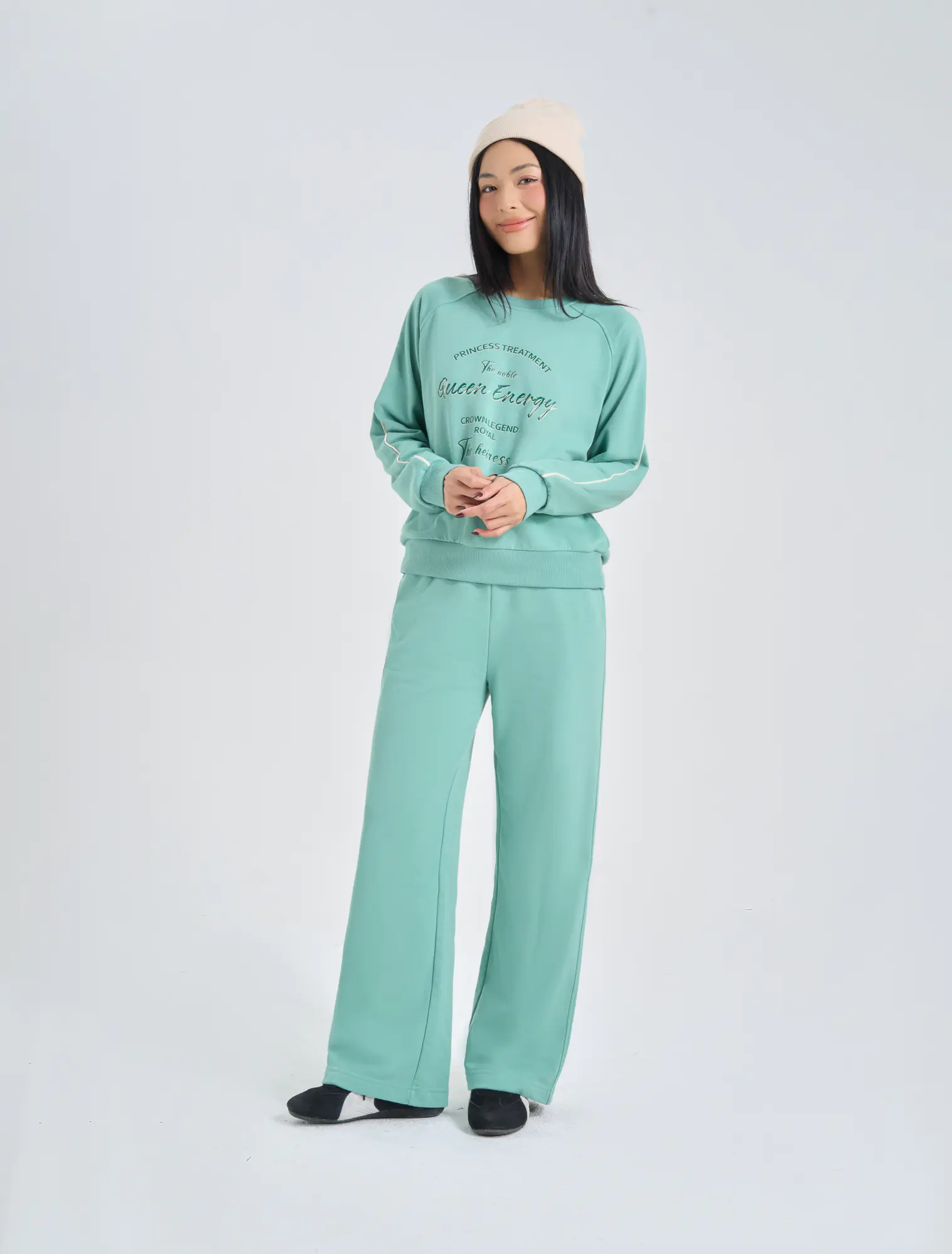 Bộ nỉ nữ quần suông kết hợp với áo bo gấu và chi tiết lé phối khớp màu với hình đồ họa, tạo nên một sự lựa chọn hoàn hảo cho khách hàng.