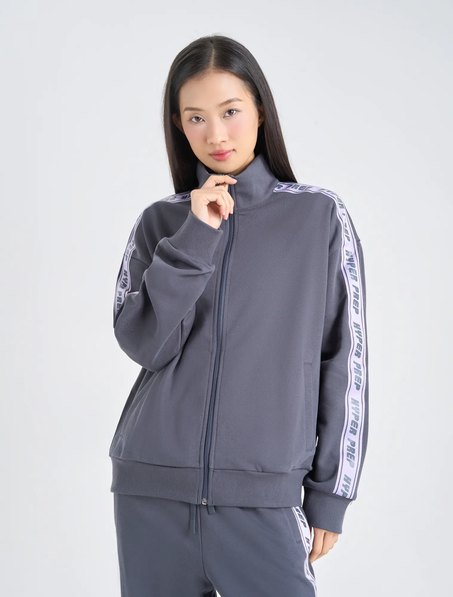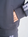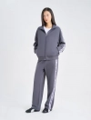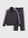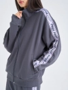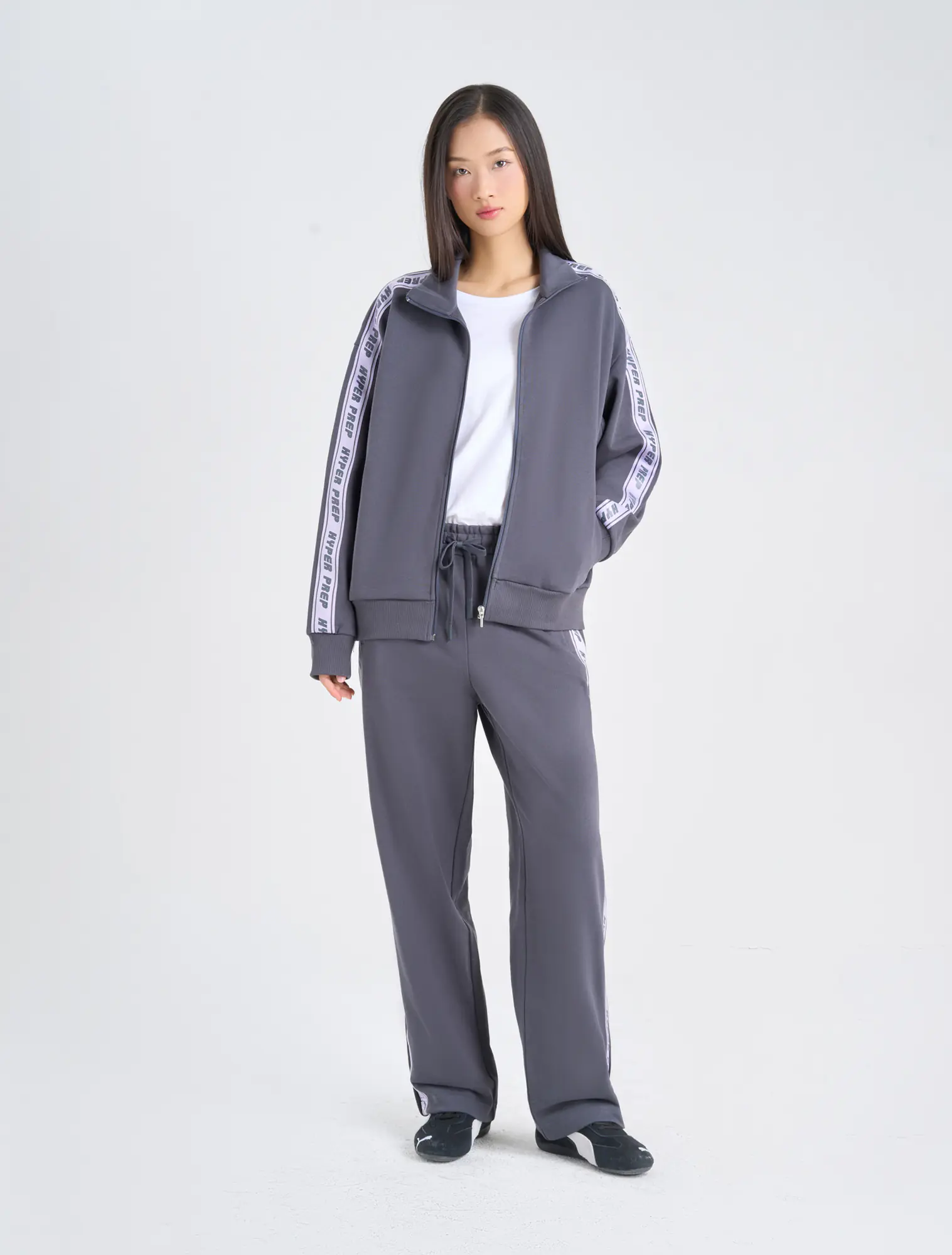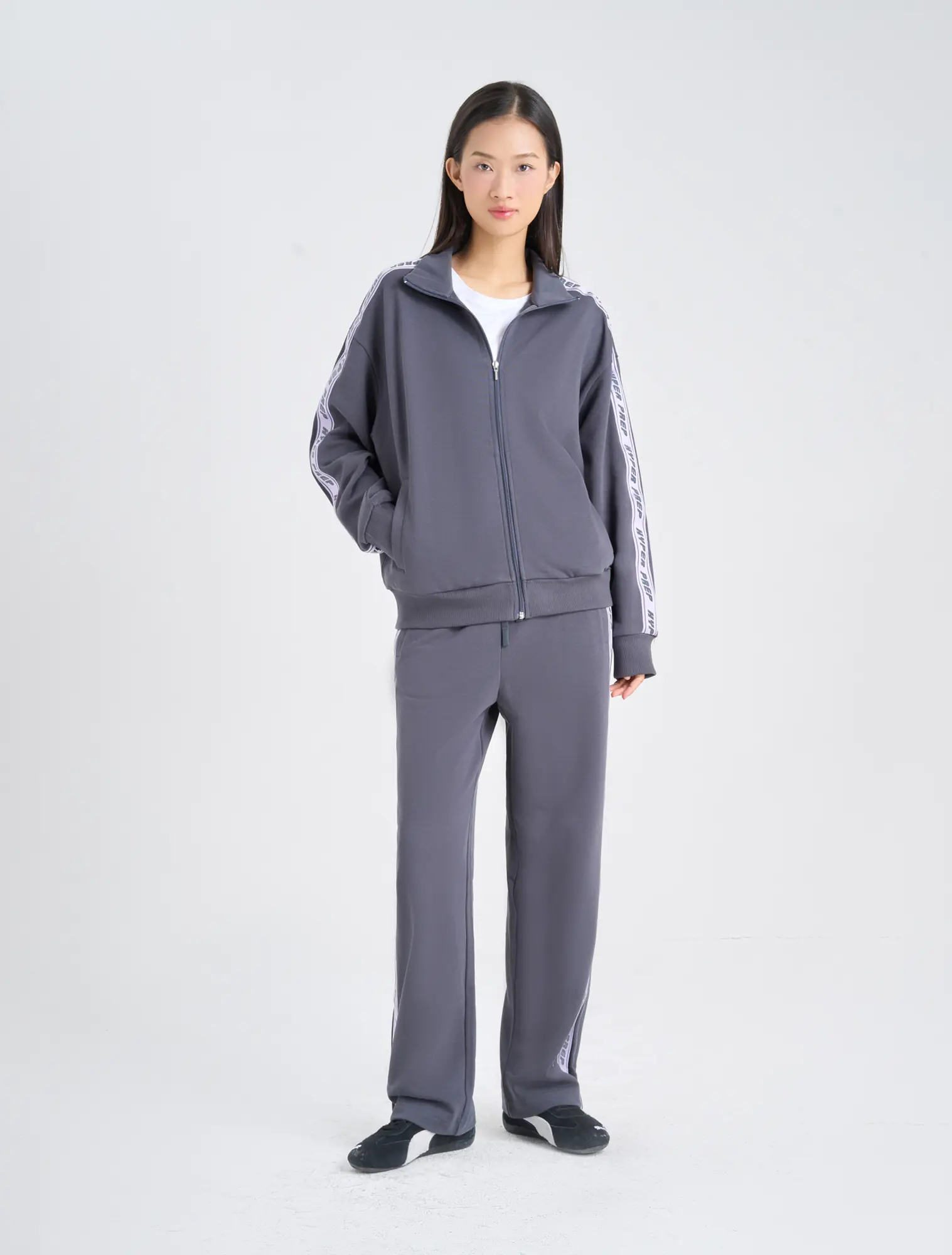 Bộ nỉ gồm quần suông và áo khoác dáng relax. Điểm nhấn là dây phối ốp toàn bộ tay áo và dọc sườn quần, chi tiết gấu quần có khóa kéo tạo ra nhiều kiểu dáng. Bộ sản phẩm mang phong cách thể thao nhưng vẫn lịch sự và dễ ứng dụng trong nhiều hoàn cảnh.