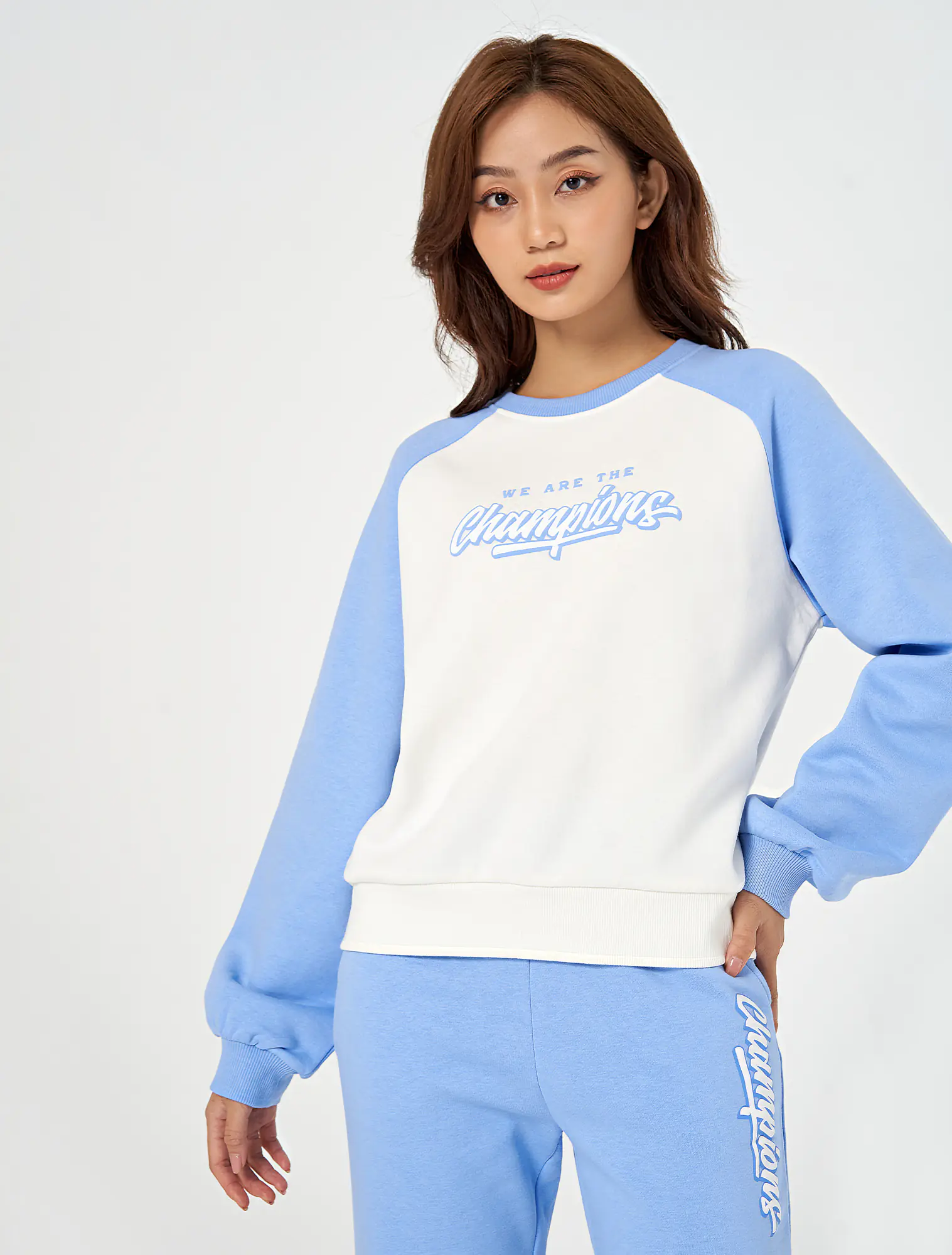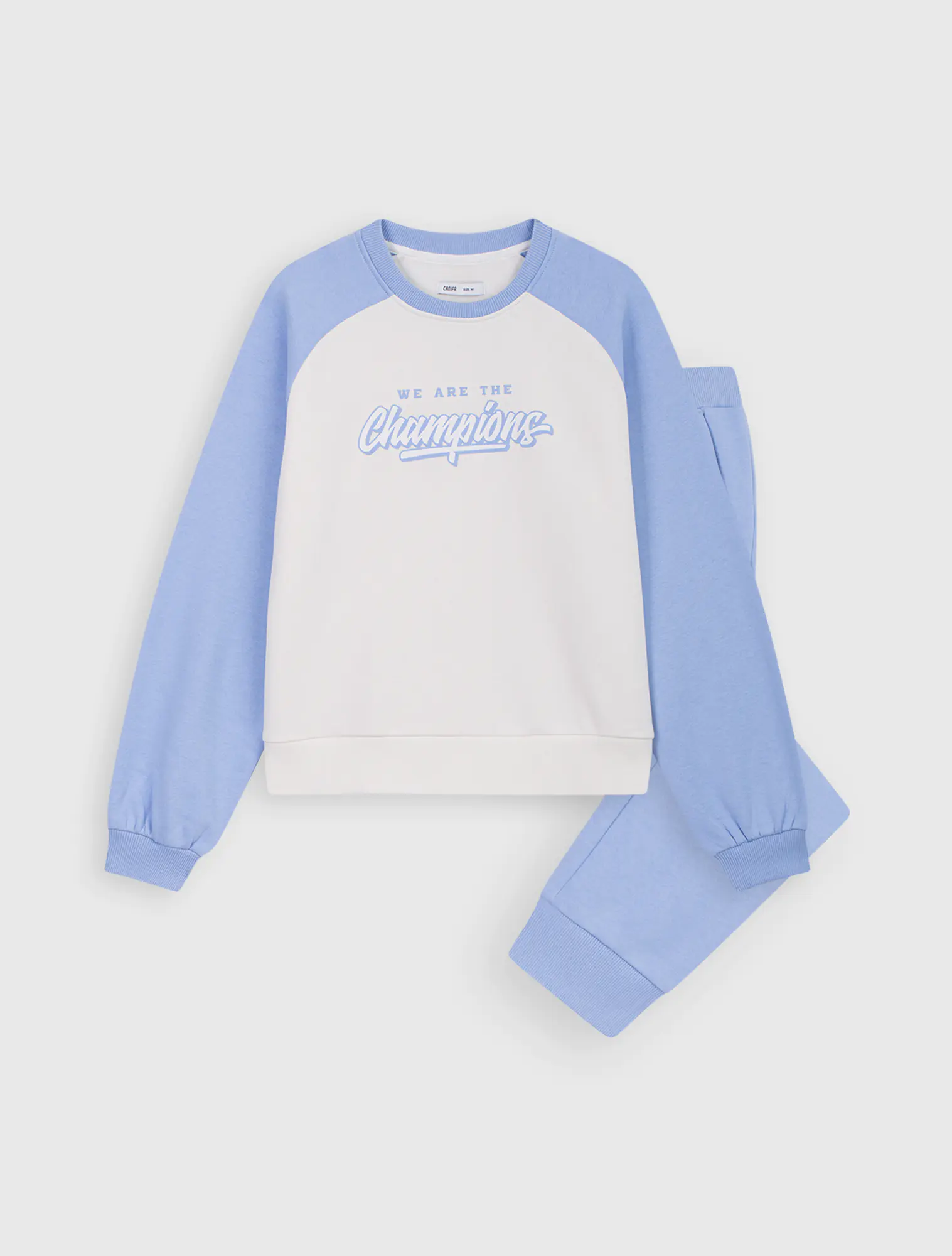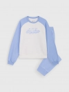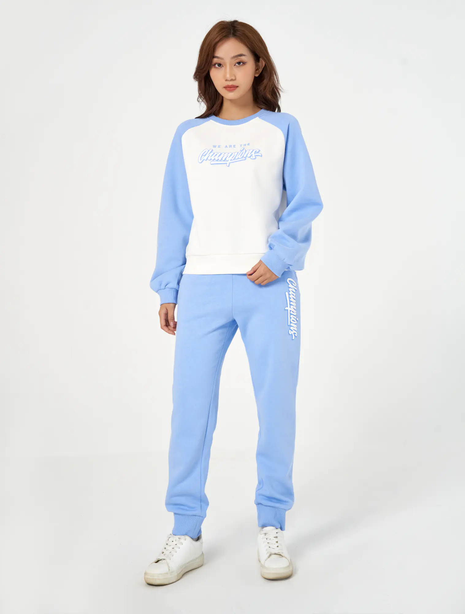 Bộ quần áo chất liệu cotton pha, áo cổ tròn tay dài, quần dài bo gấu.