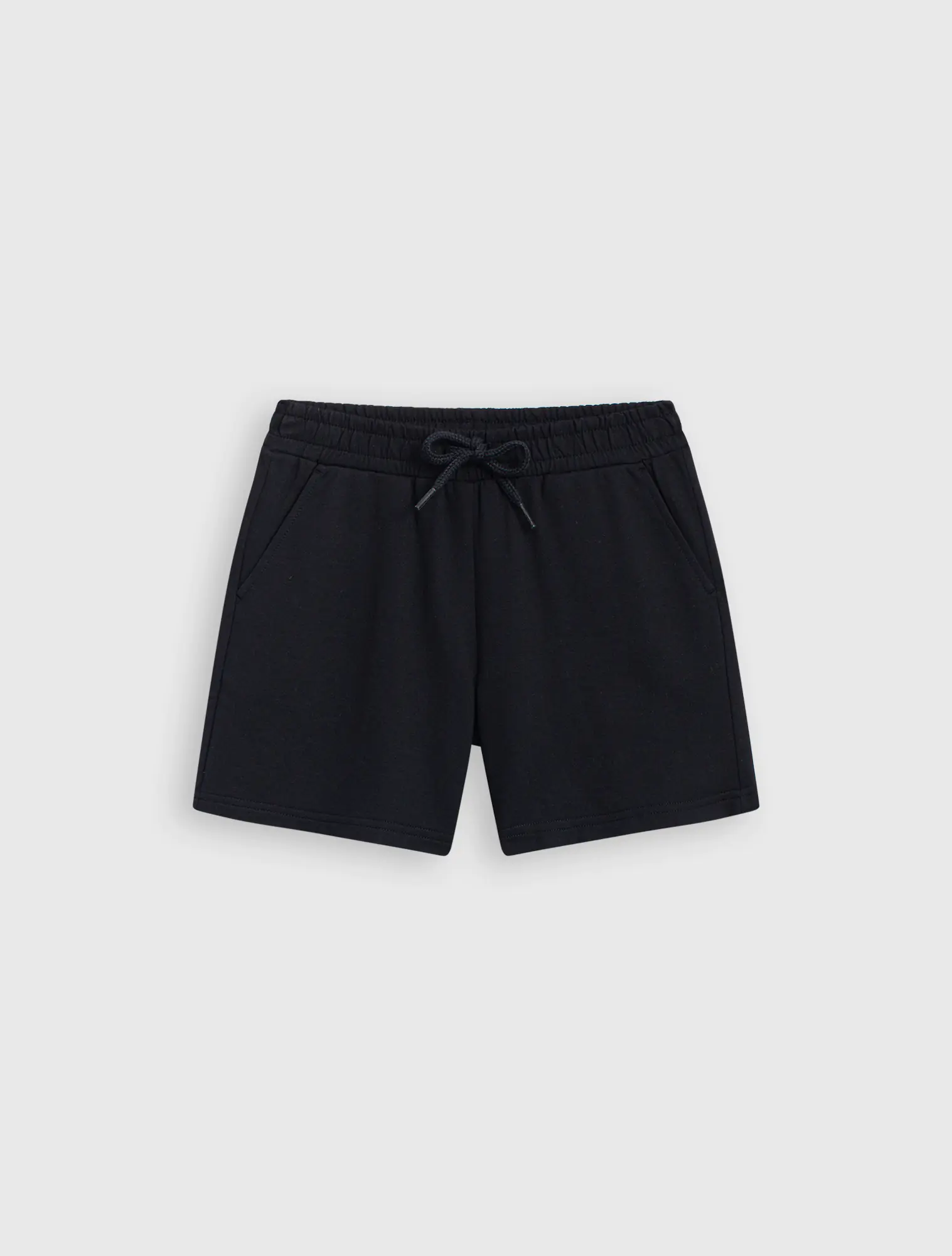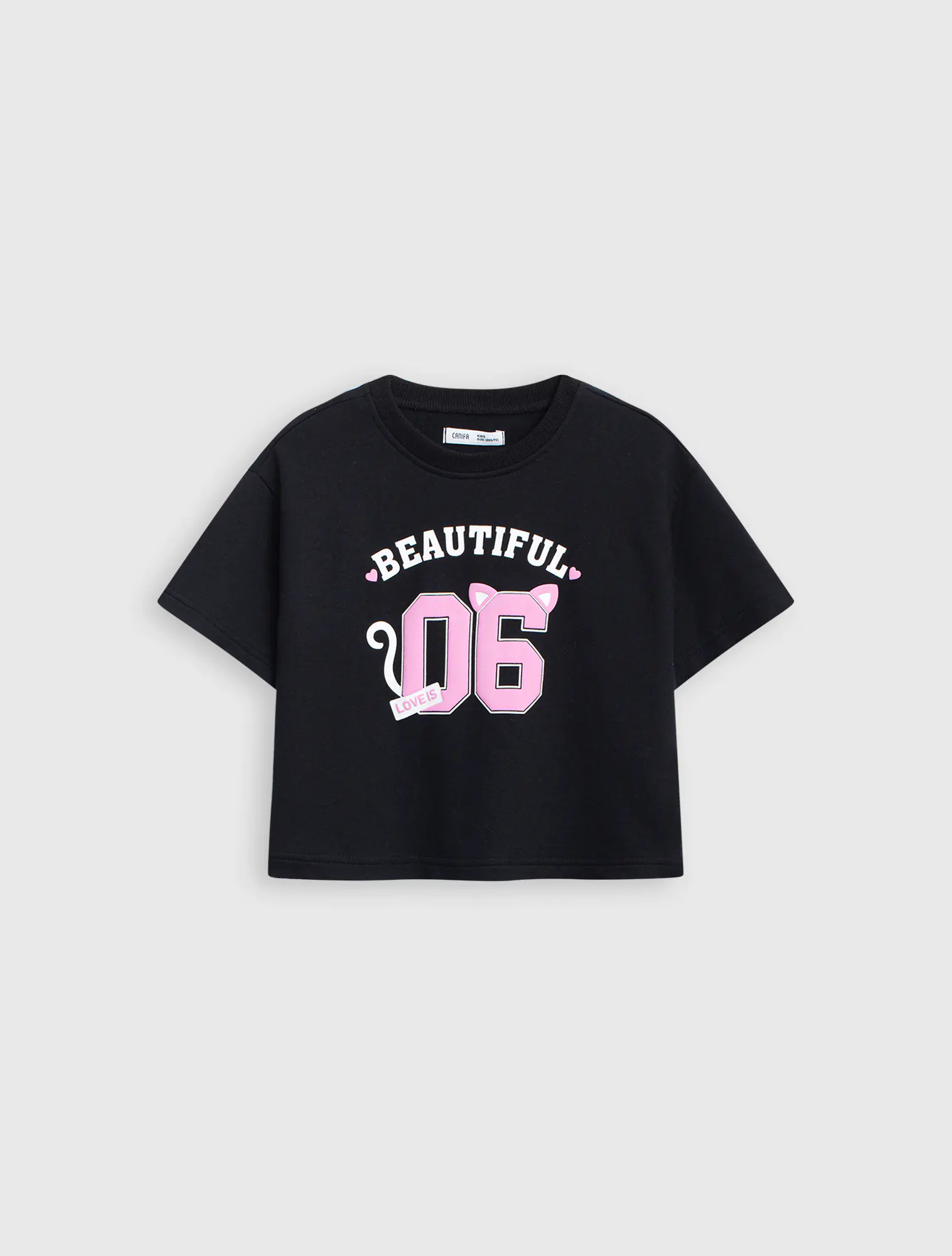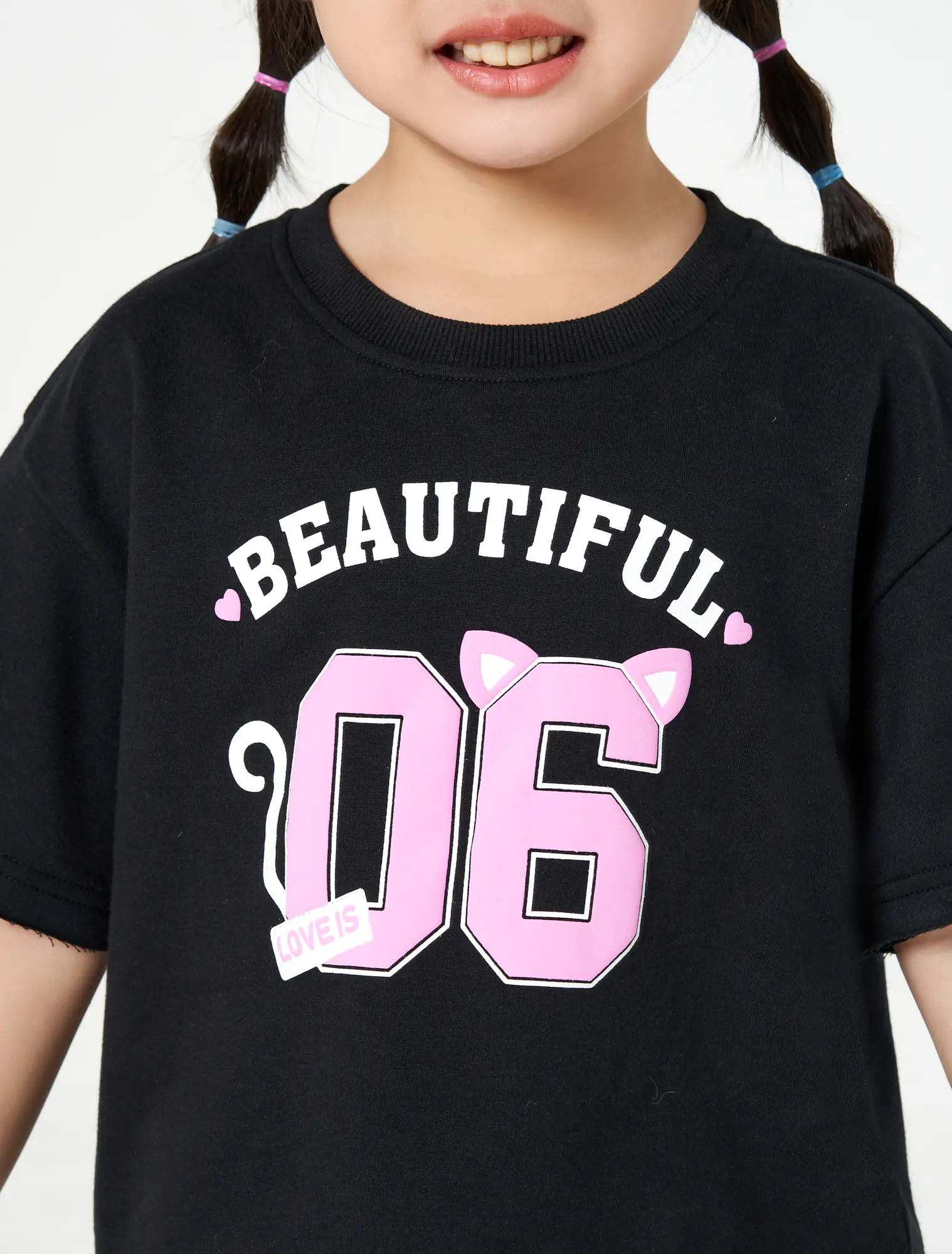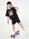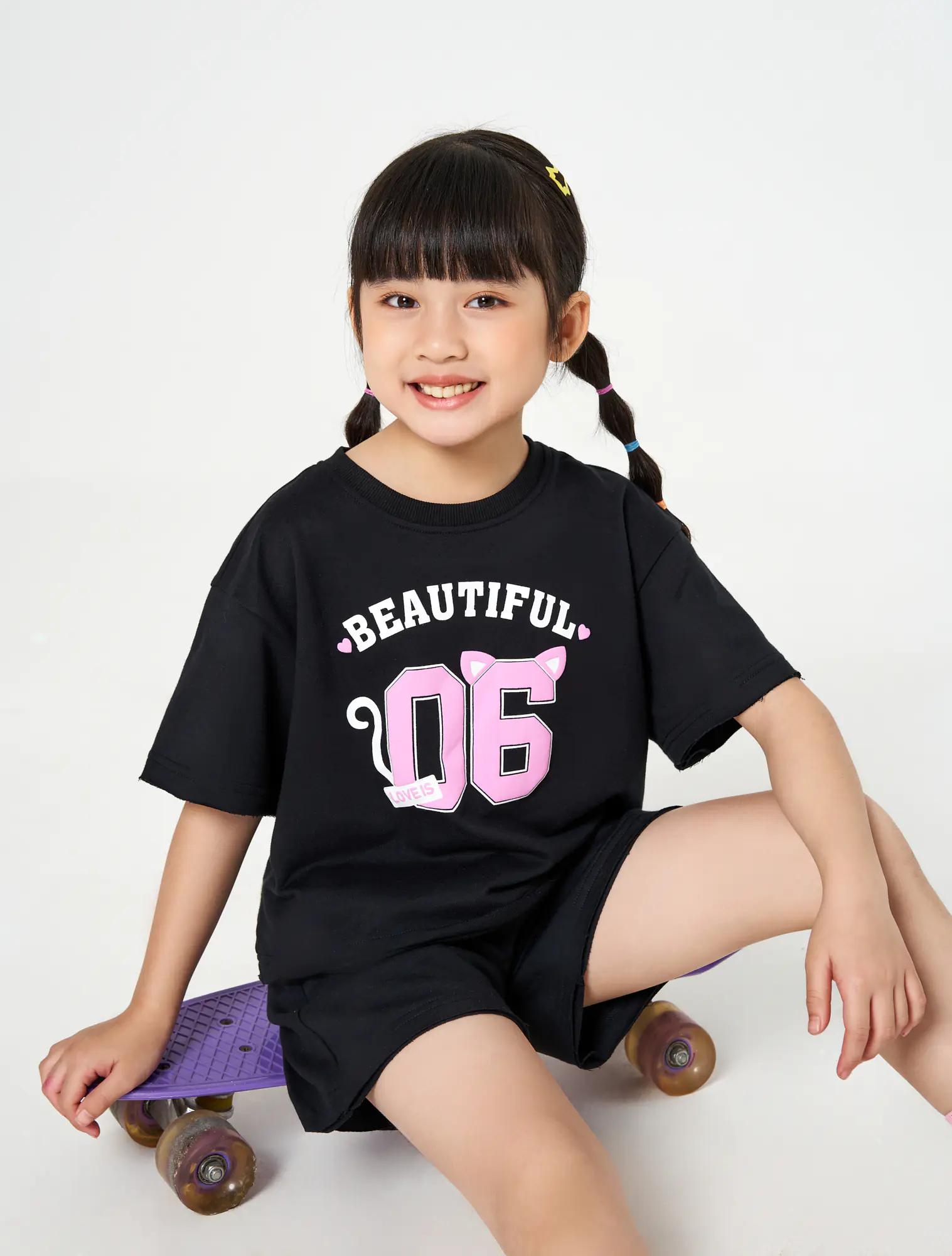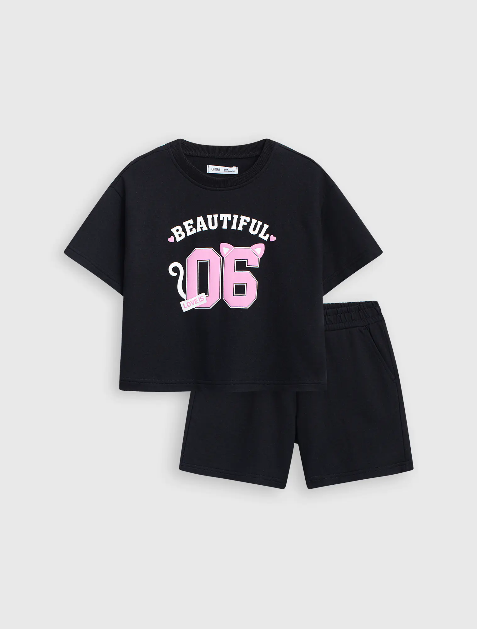 Bộ quần áo chất liệu cotton pha, áo cổ tròn tay cộc, quần soóc cạp chun.