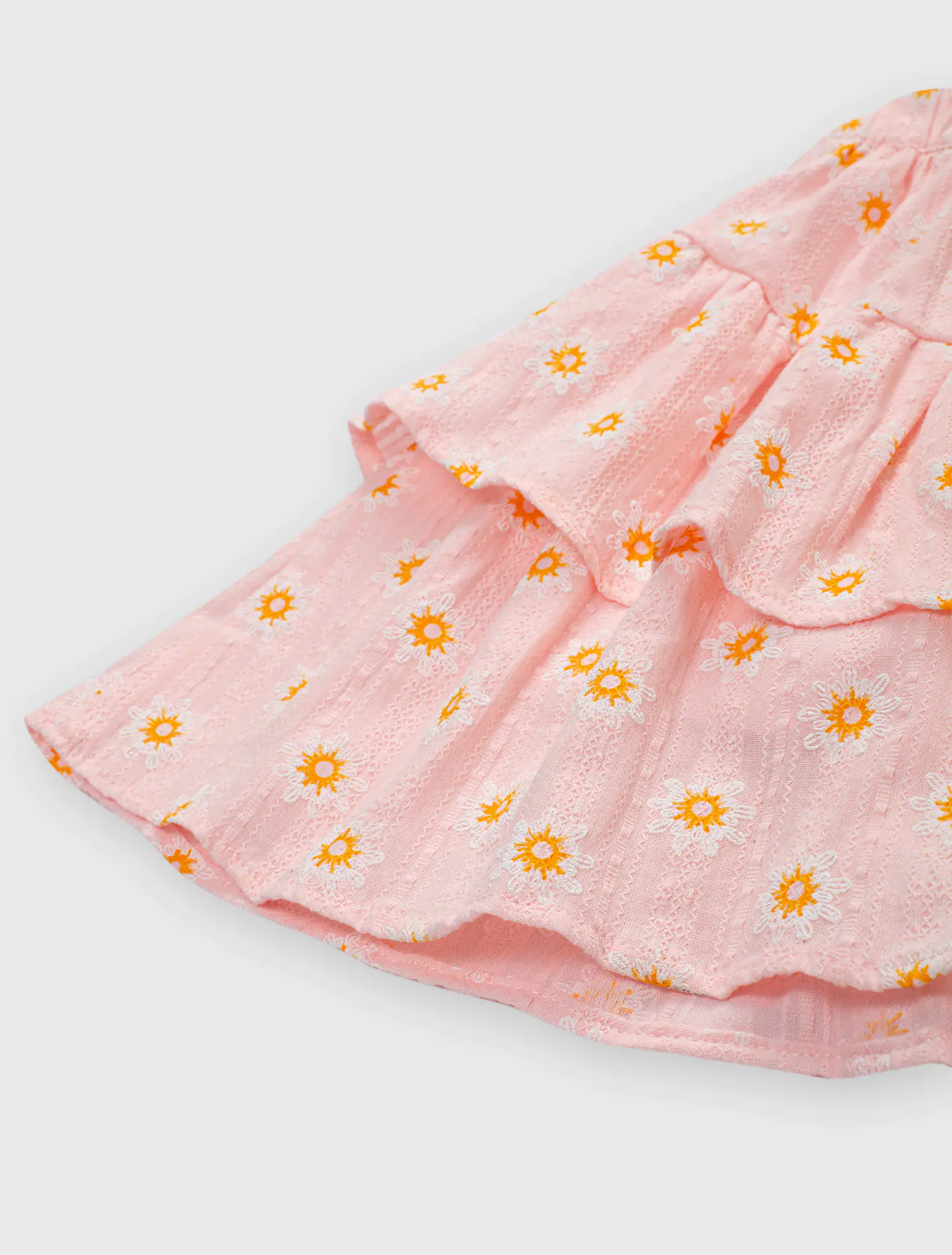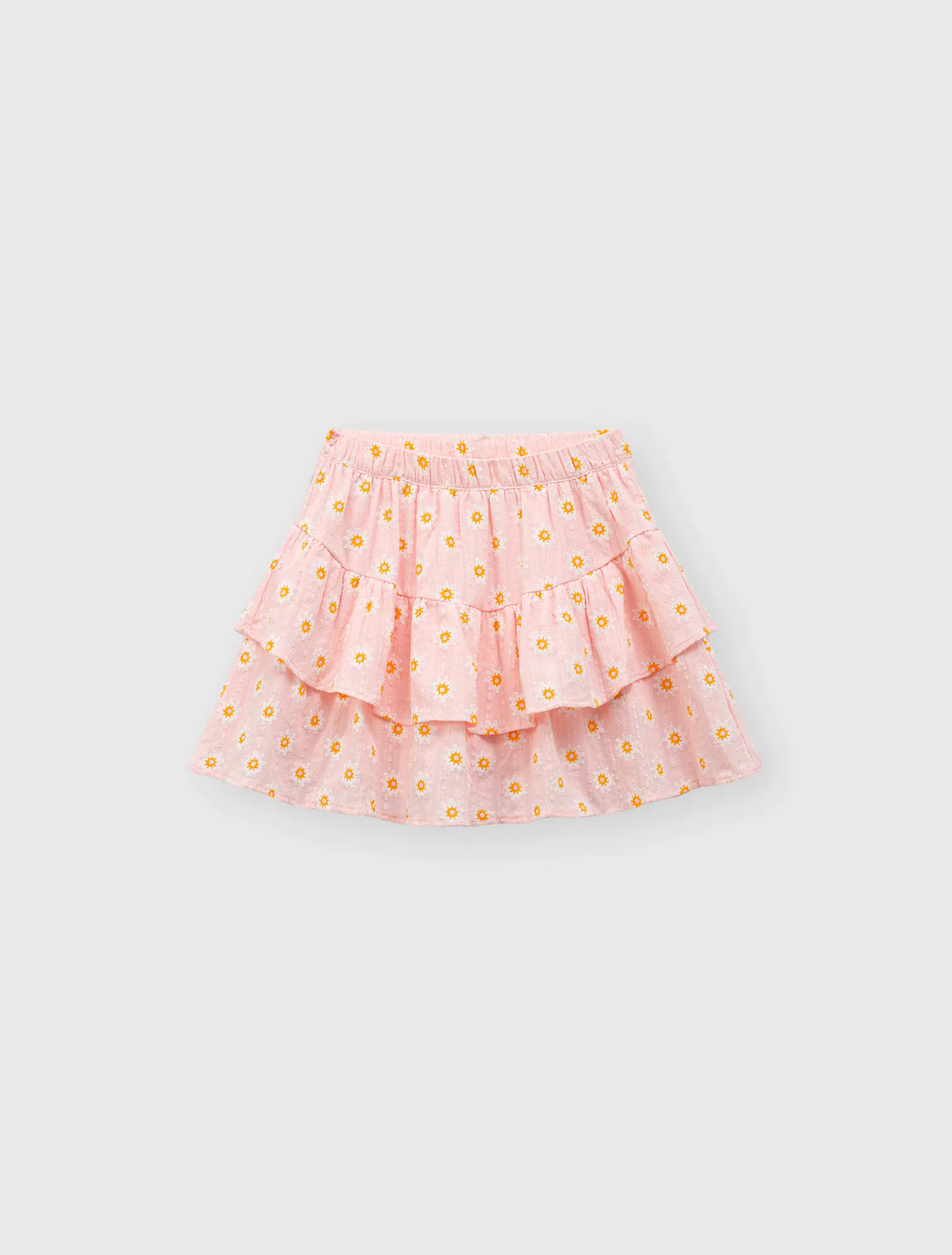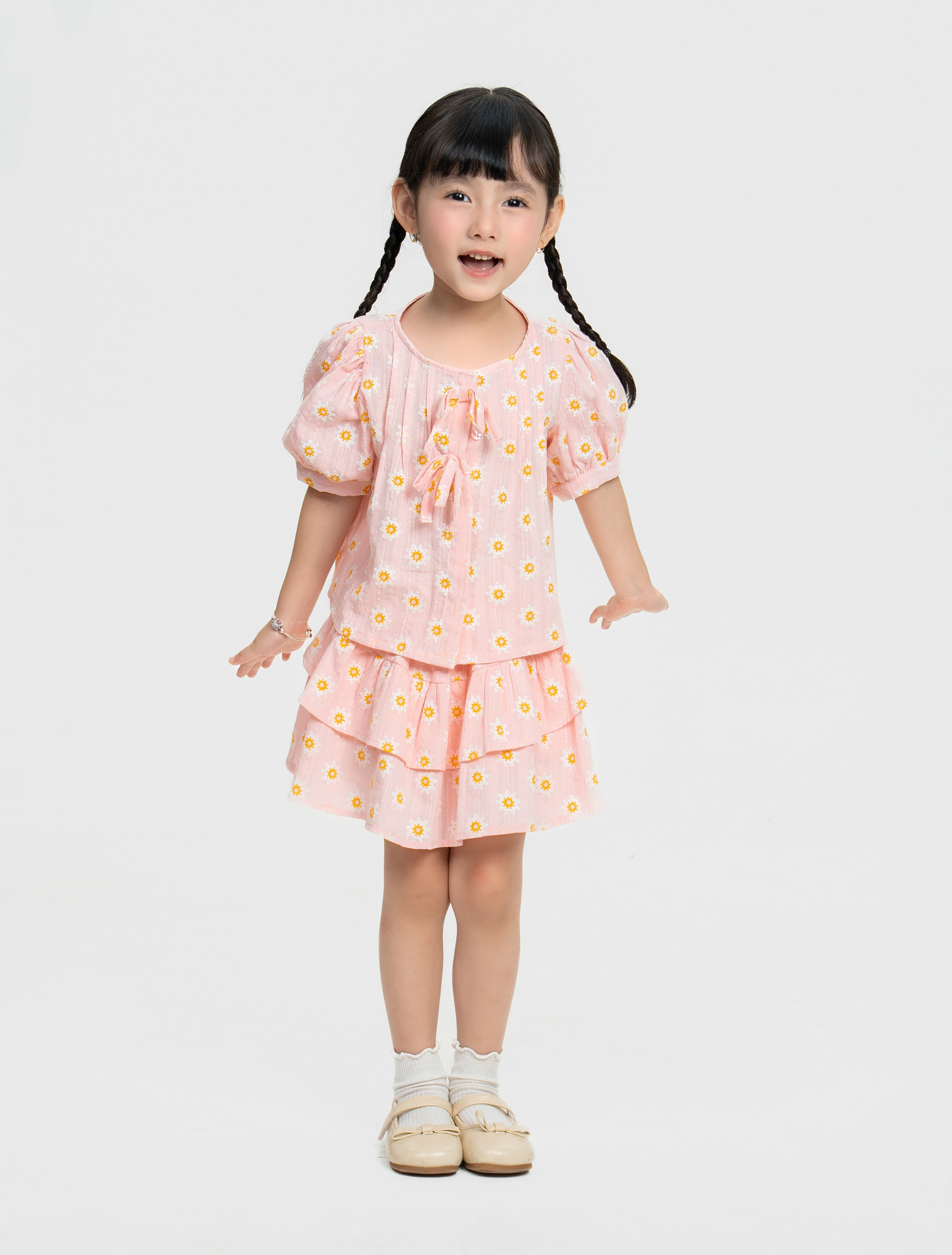 Chân váy bé gái xếp tầng họa tiết. Có lót quần bên trong giúp bé thoải mái hoạt động.
