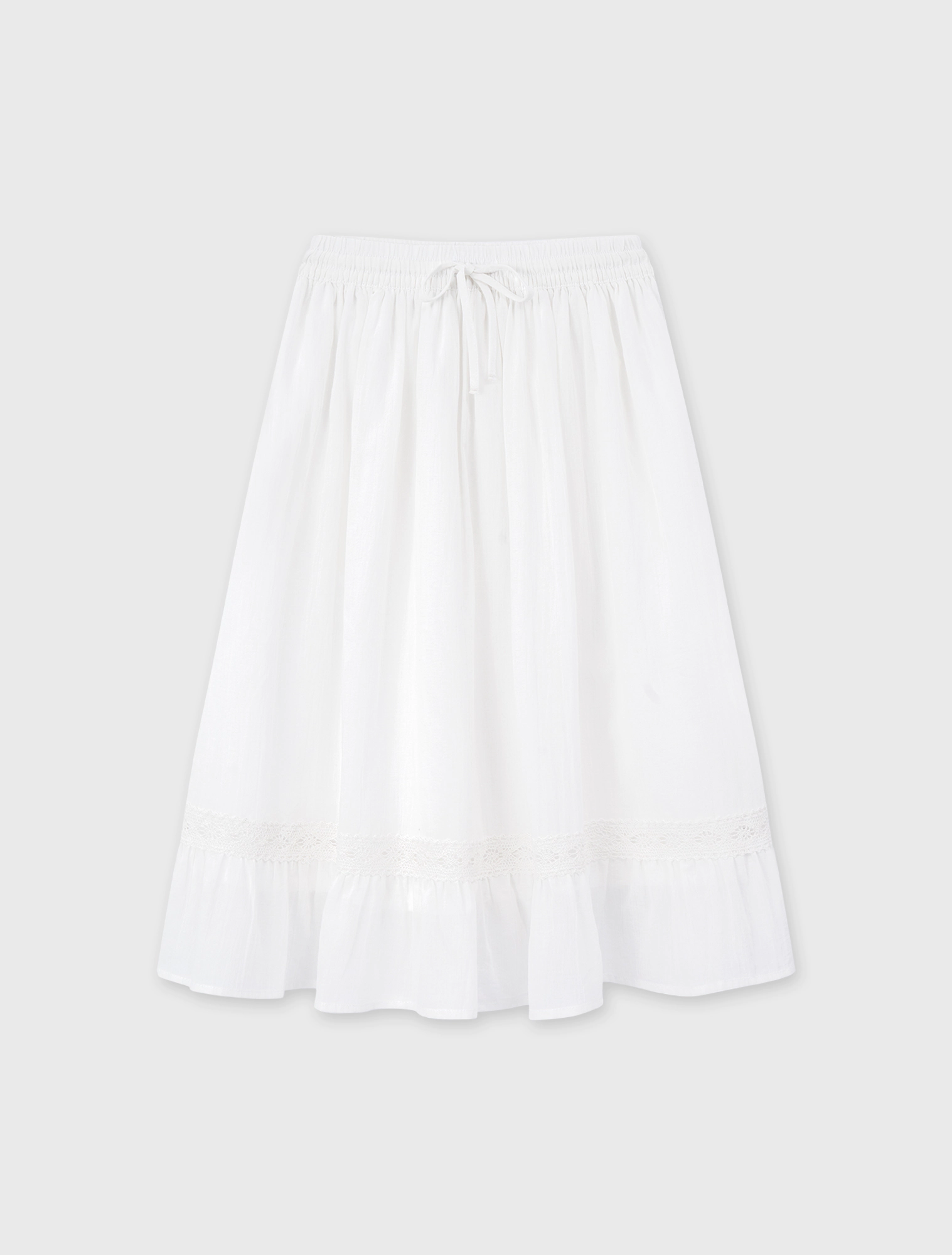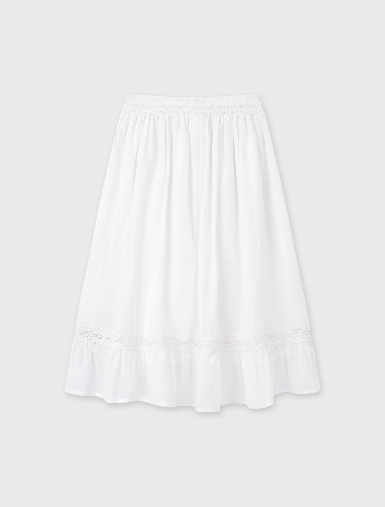 Chân váy bé gái cạp chun, dáng xòe, phối ren nữ tính. Chất liệu cotton mềm mại, phù hợp đi chơi, dạo phố.