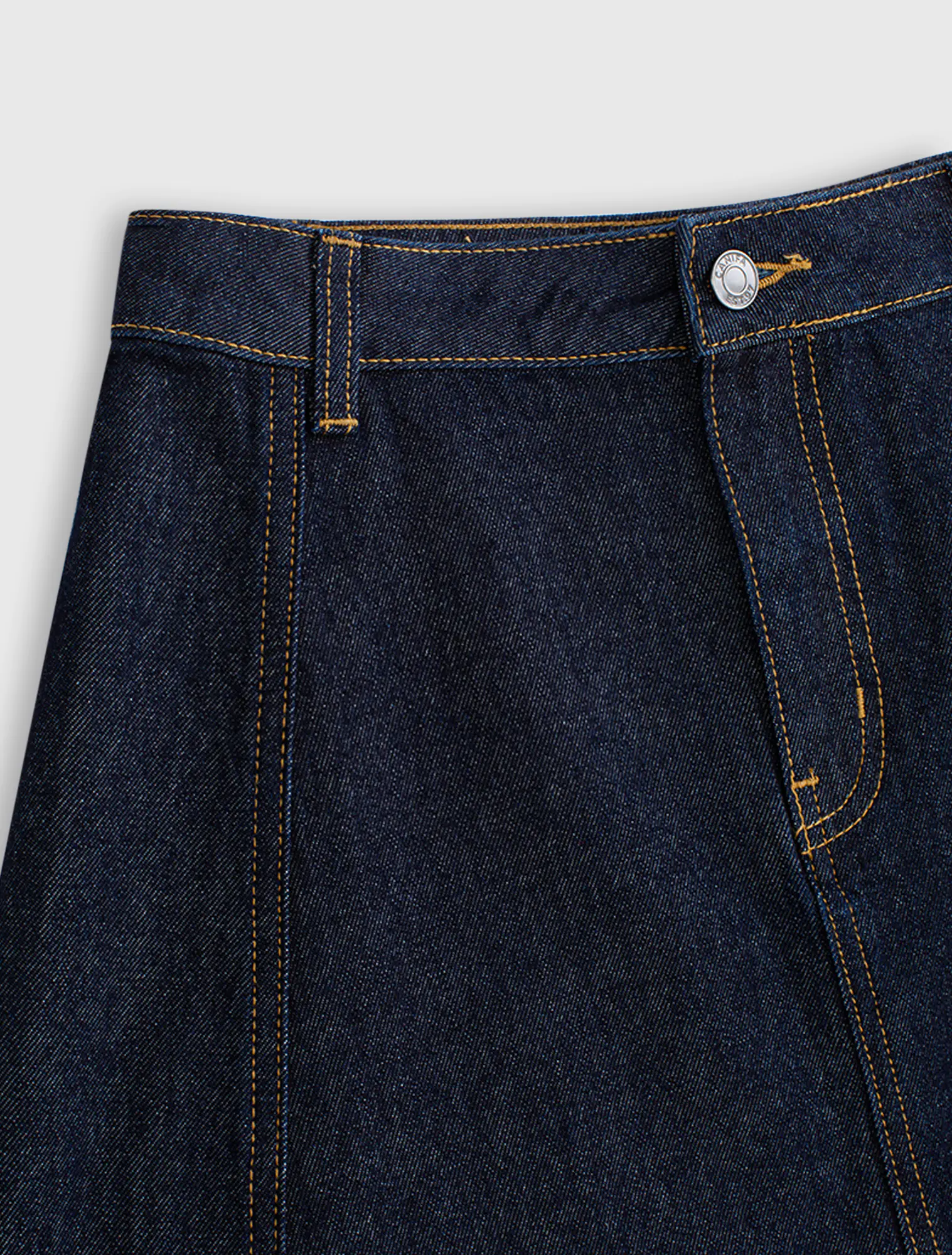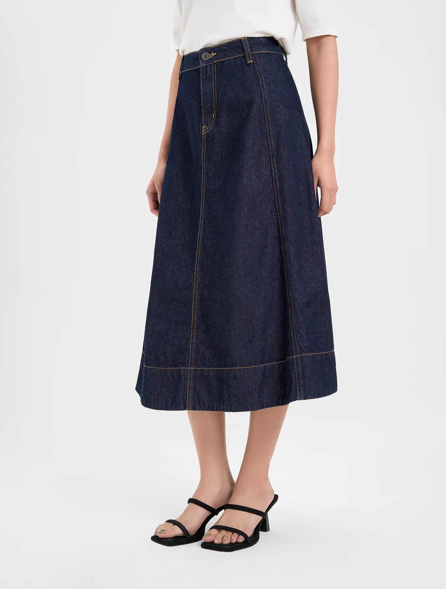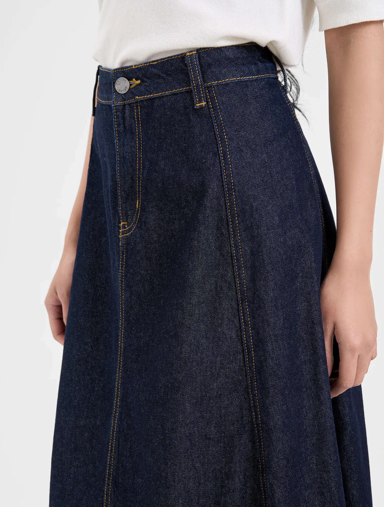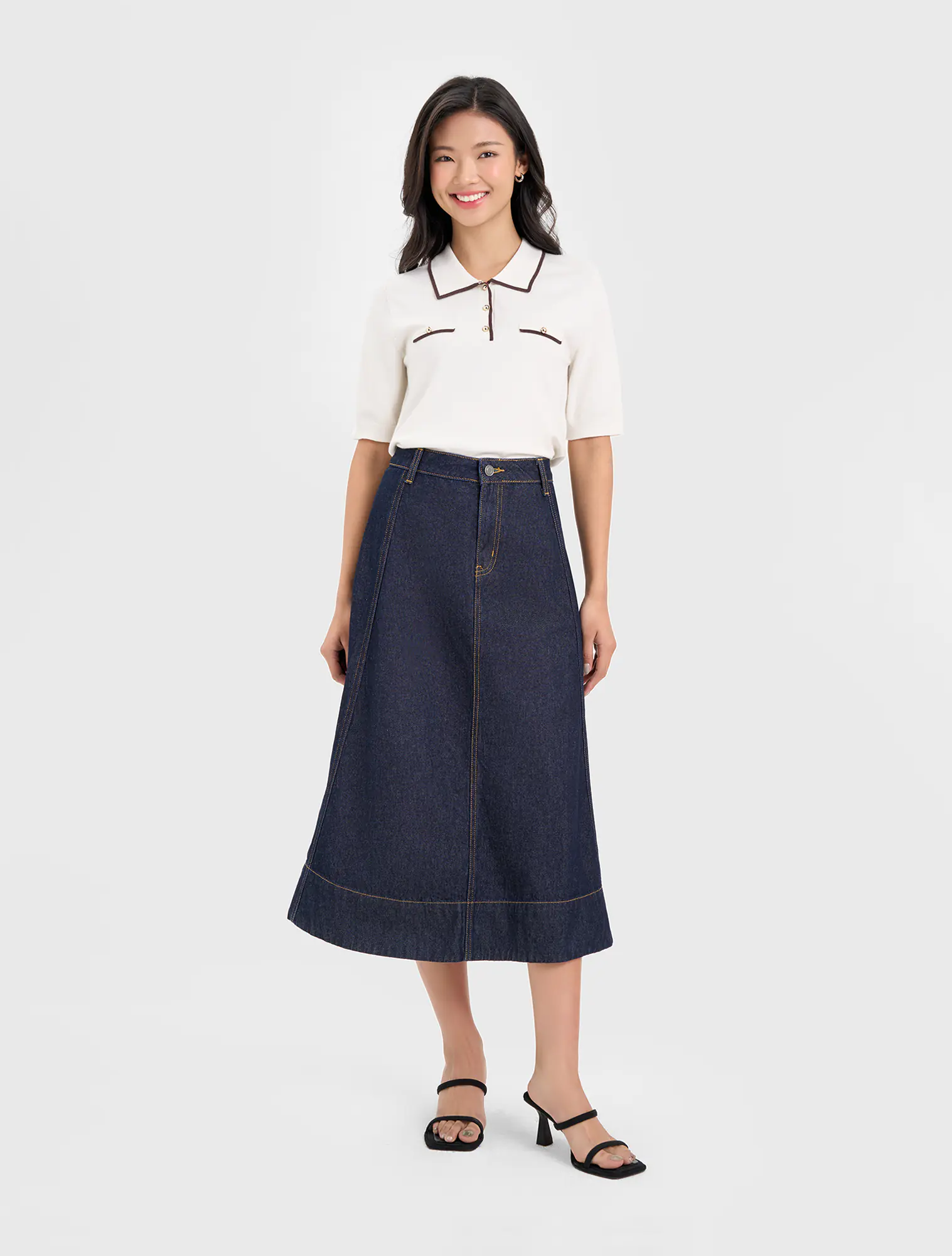 Chân váy jean nữ dáng A xòe, với chi tiết thiết kế cắt bổ 6 mảnh và bản gấu to tạo nên sự nữ tính cho khách hàng.