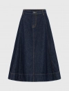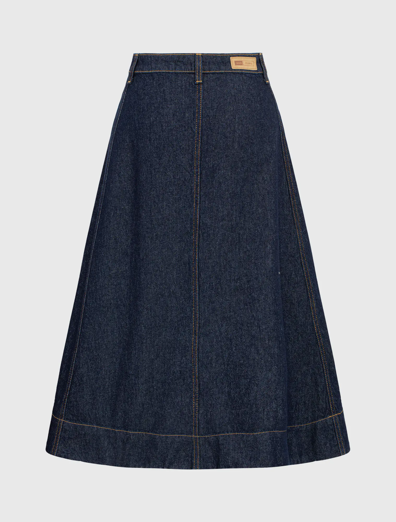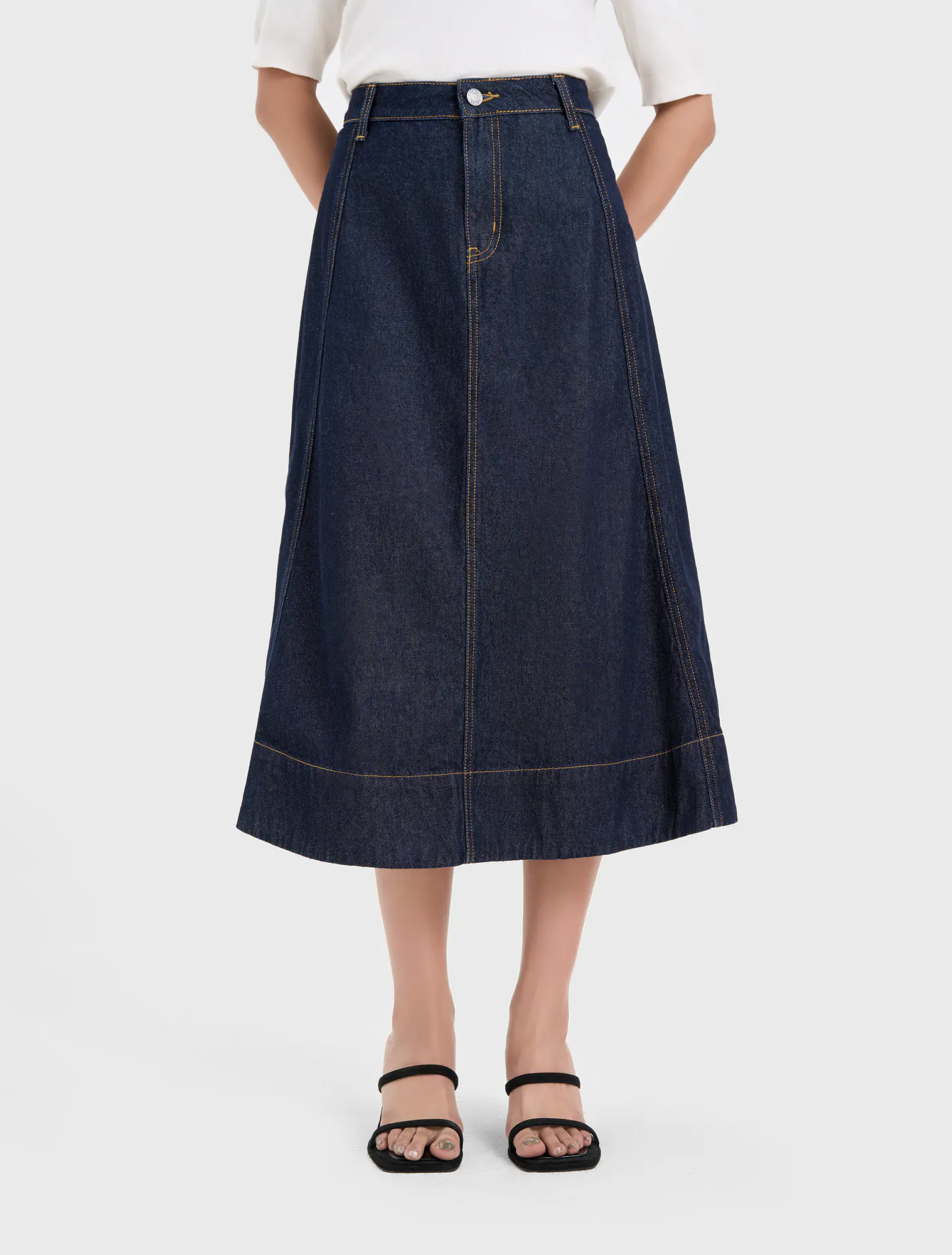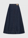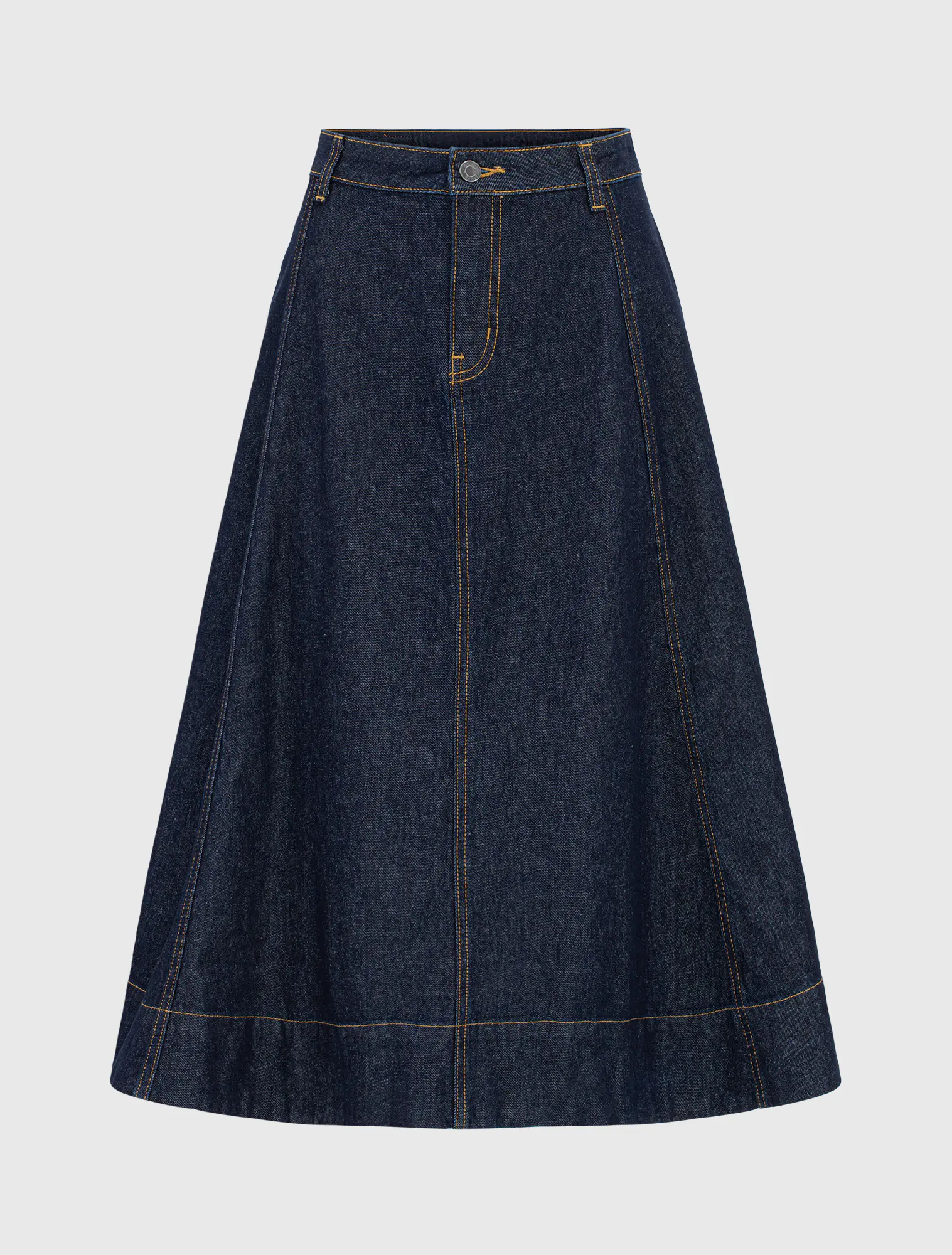 Chân váy jean nữ dáng A xòe, với chi tiết thiết kế cắt bổ 6 mảnh và bản gấu to tạo nên sự nữ tính cho khách hàng.