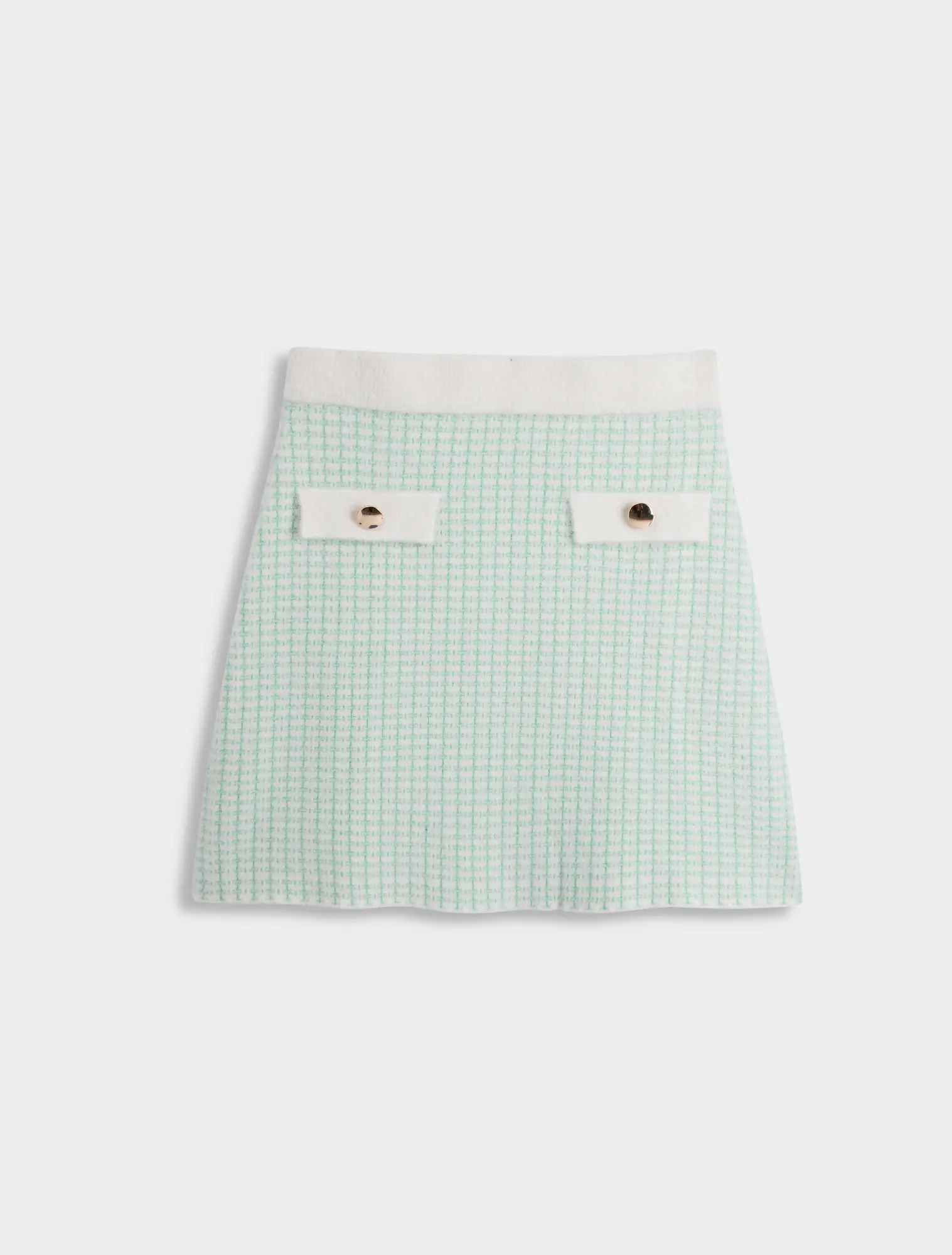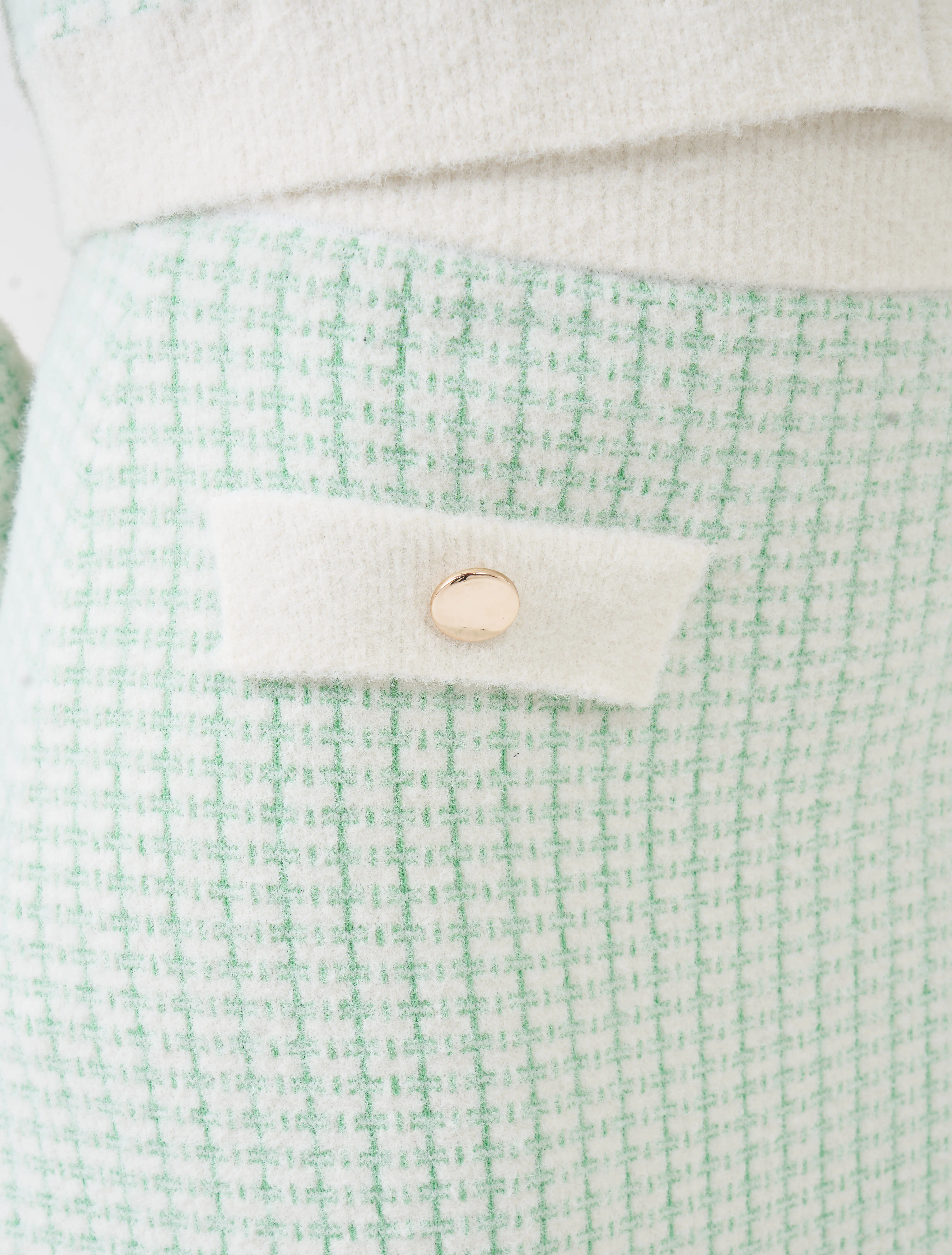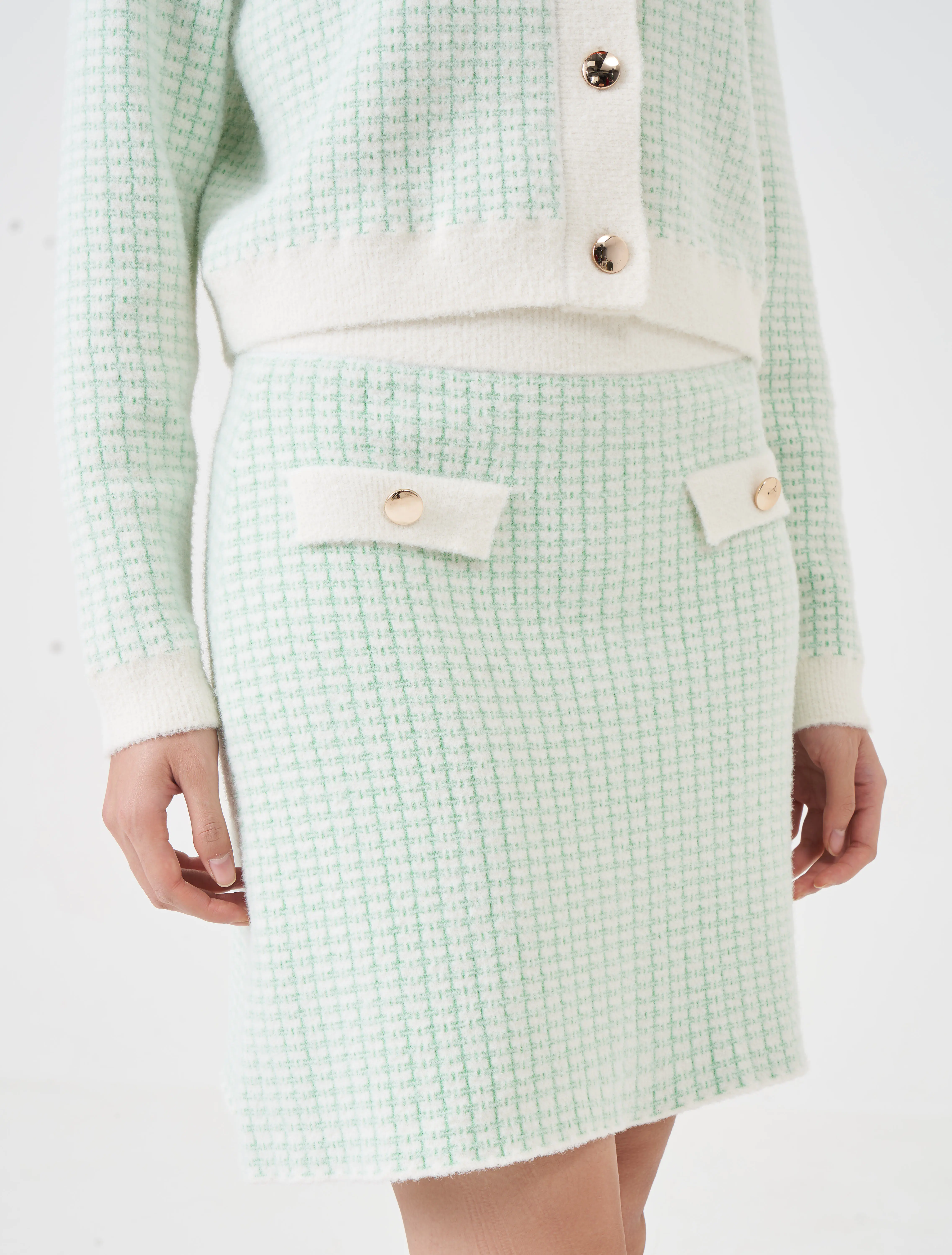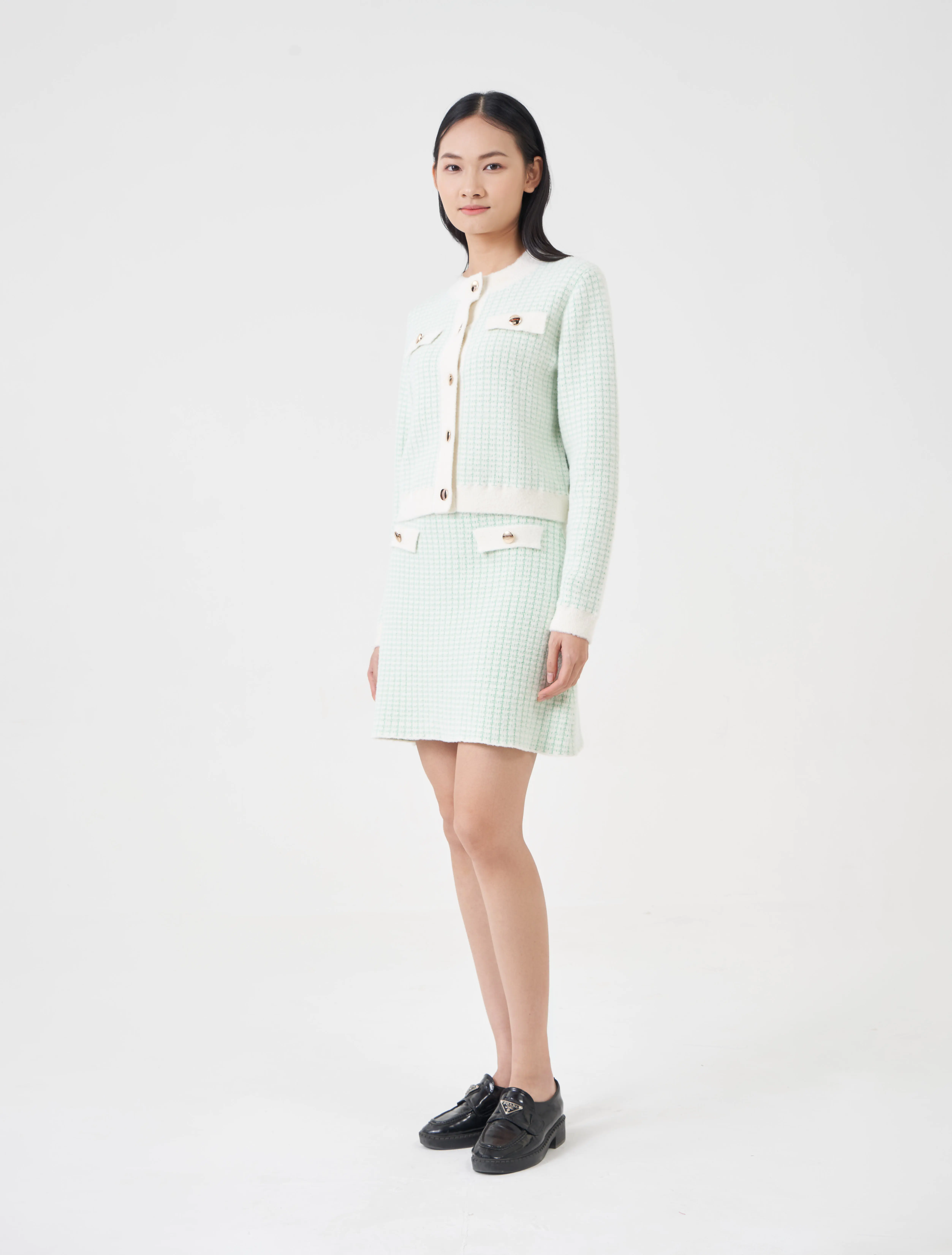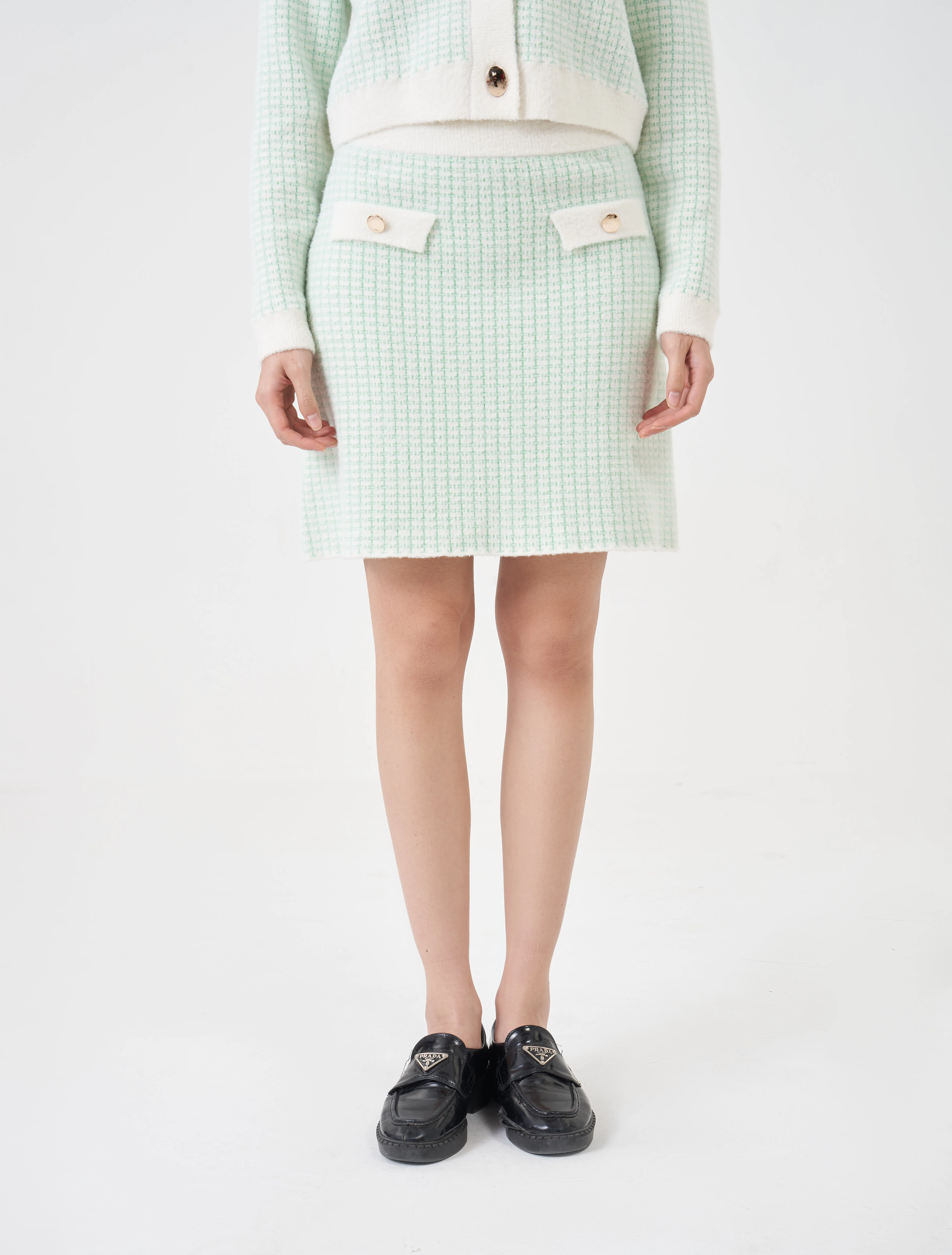 Chân váy len ngắn dáng A, dệt họa tiết kẻ. Chất liệu sợi len phối lông, mang lại cảm giác mềm mại và ấm áp.