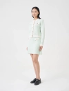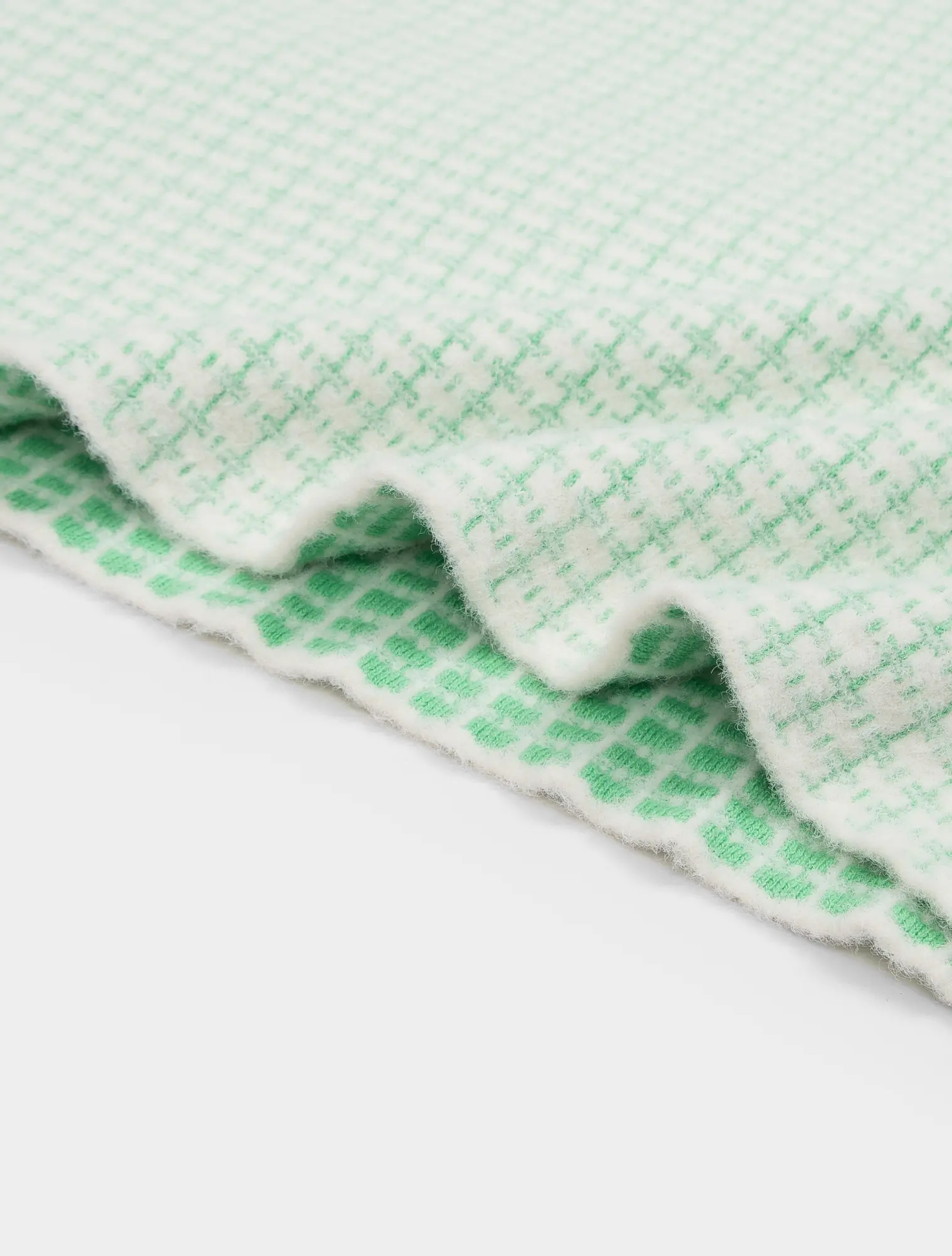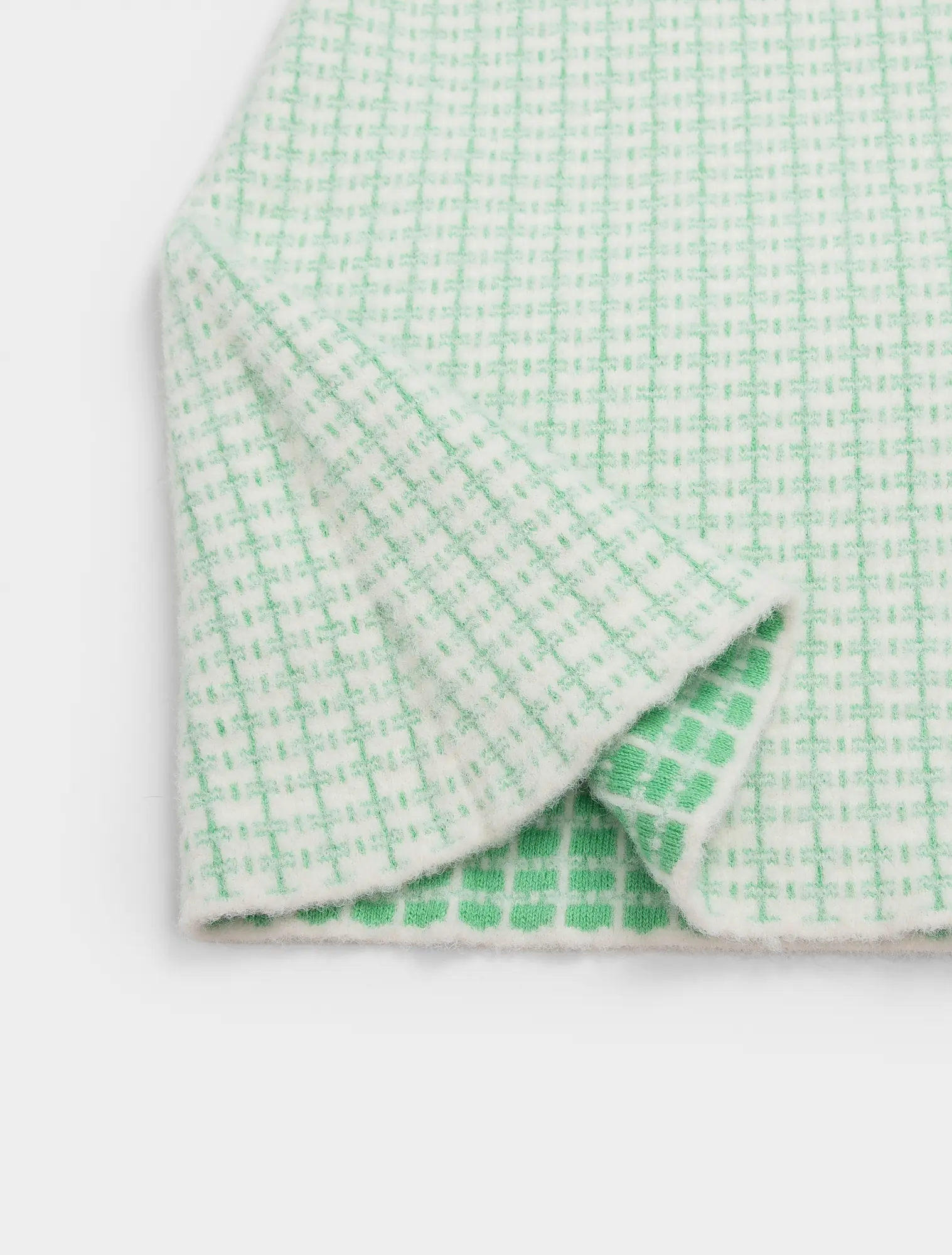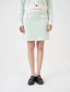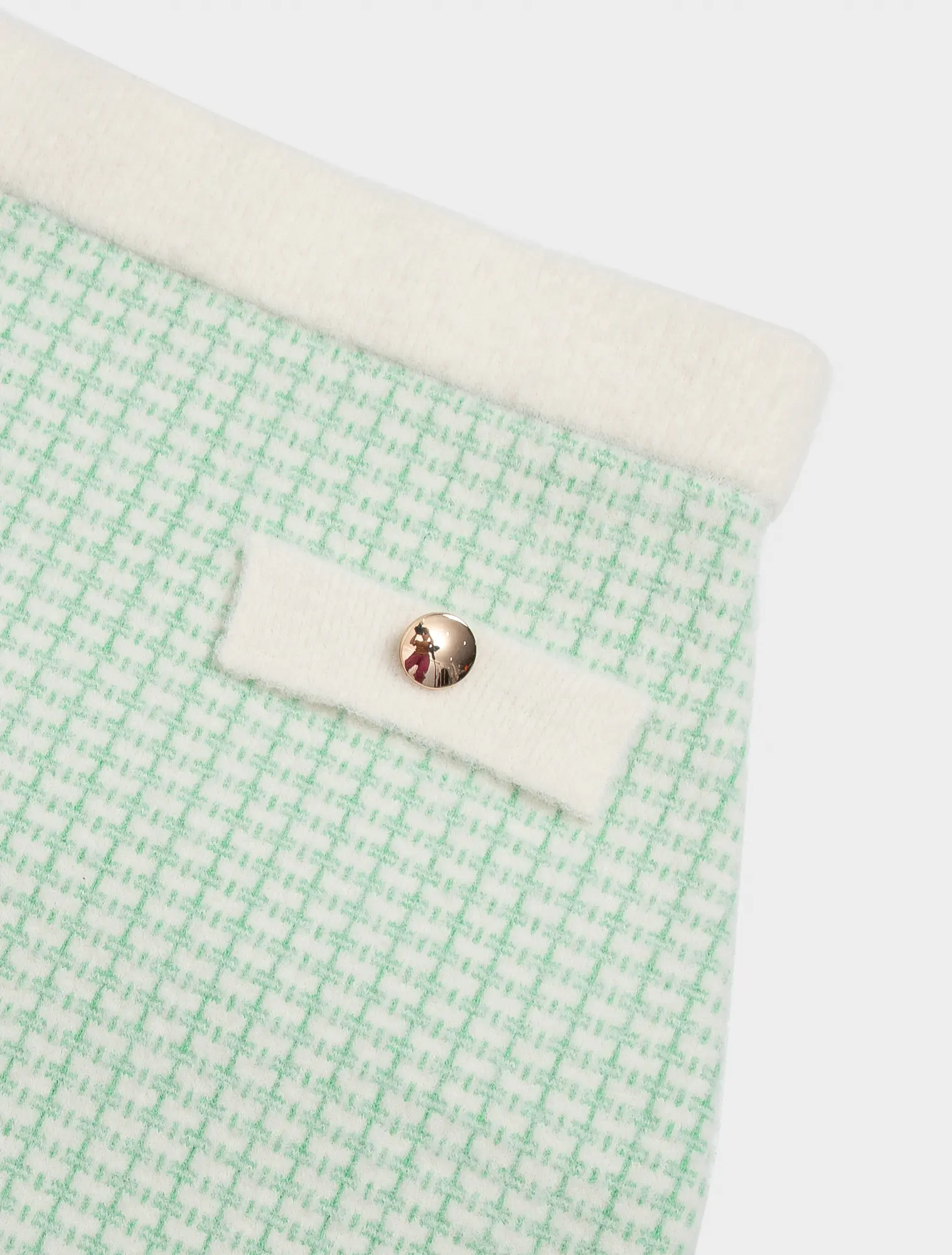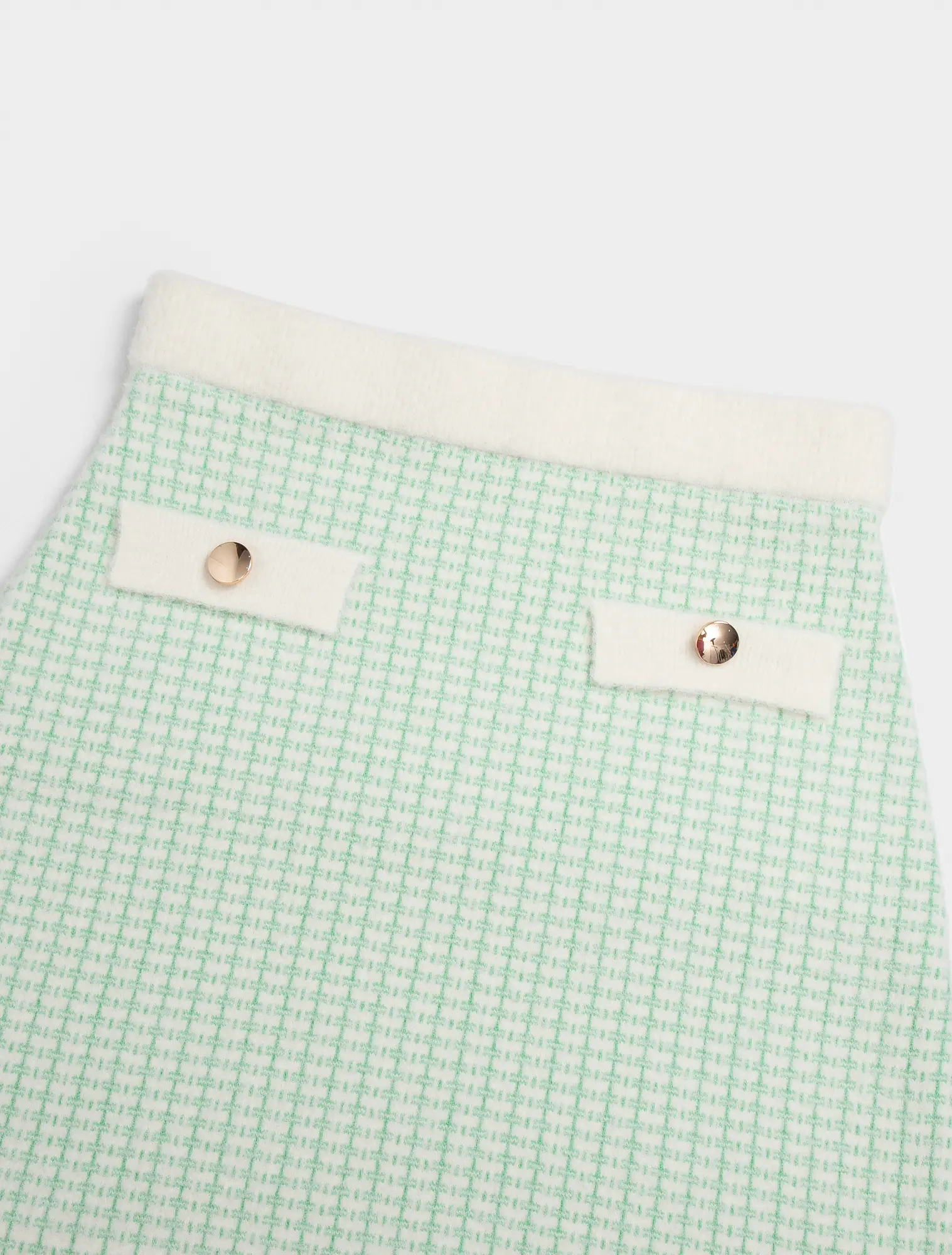 Chân váy len ngắn dáng A, dệt họa tiết kẻ. Chất liệu sợi len phối lông, mang lại cảm giác mềm mại và ấm áp.