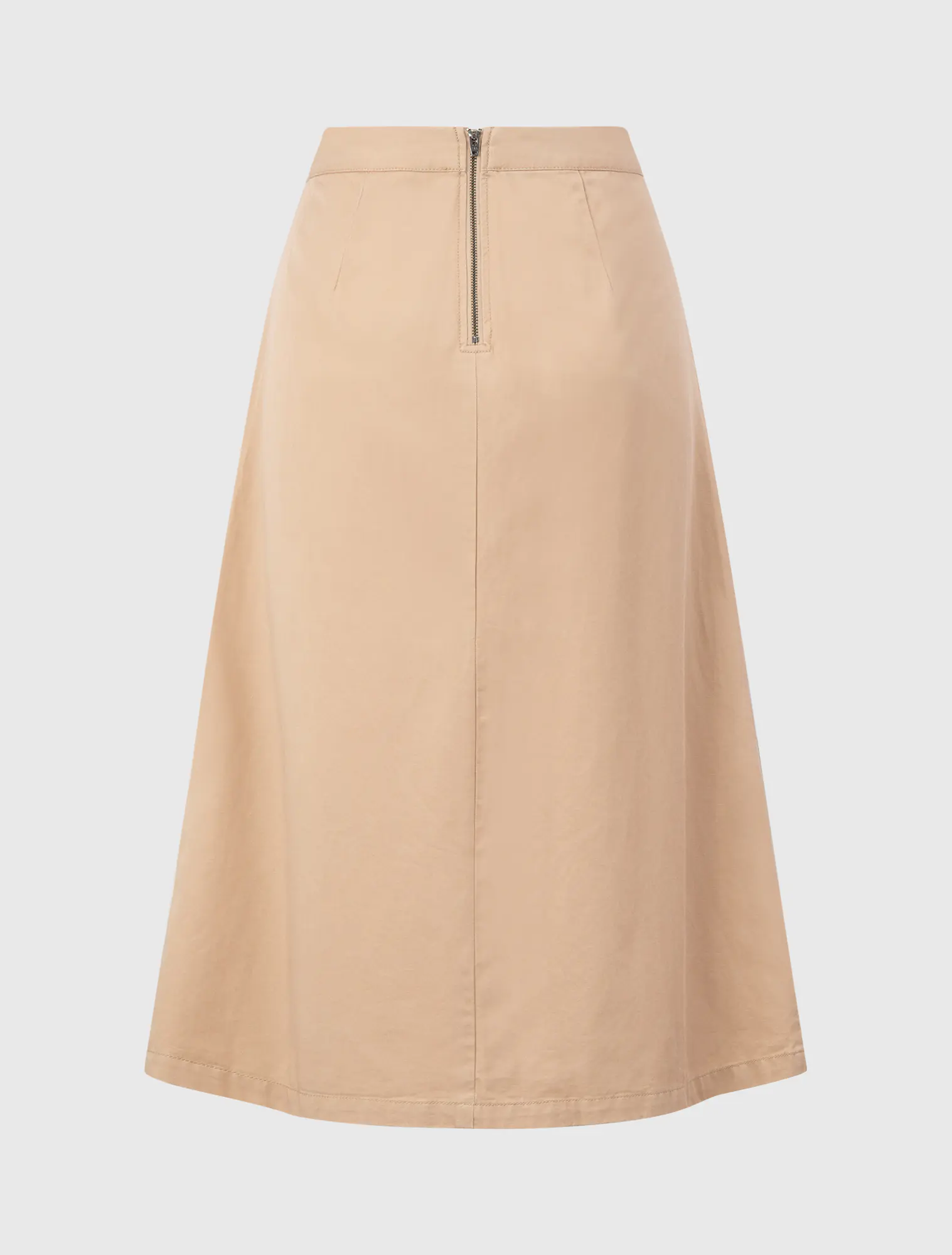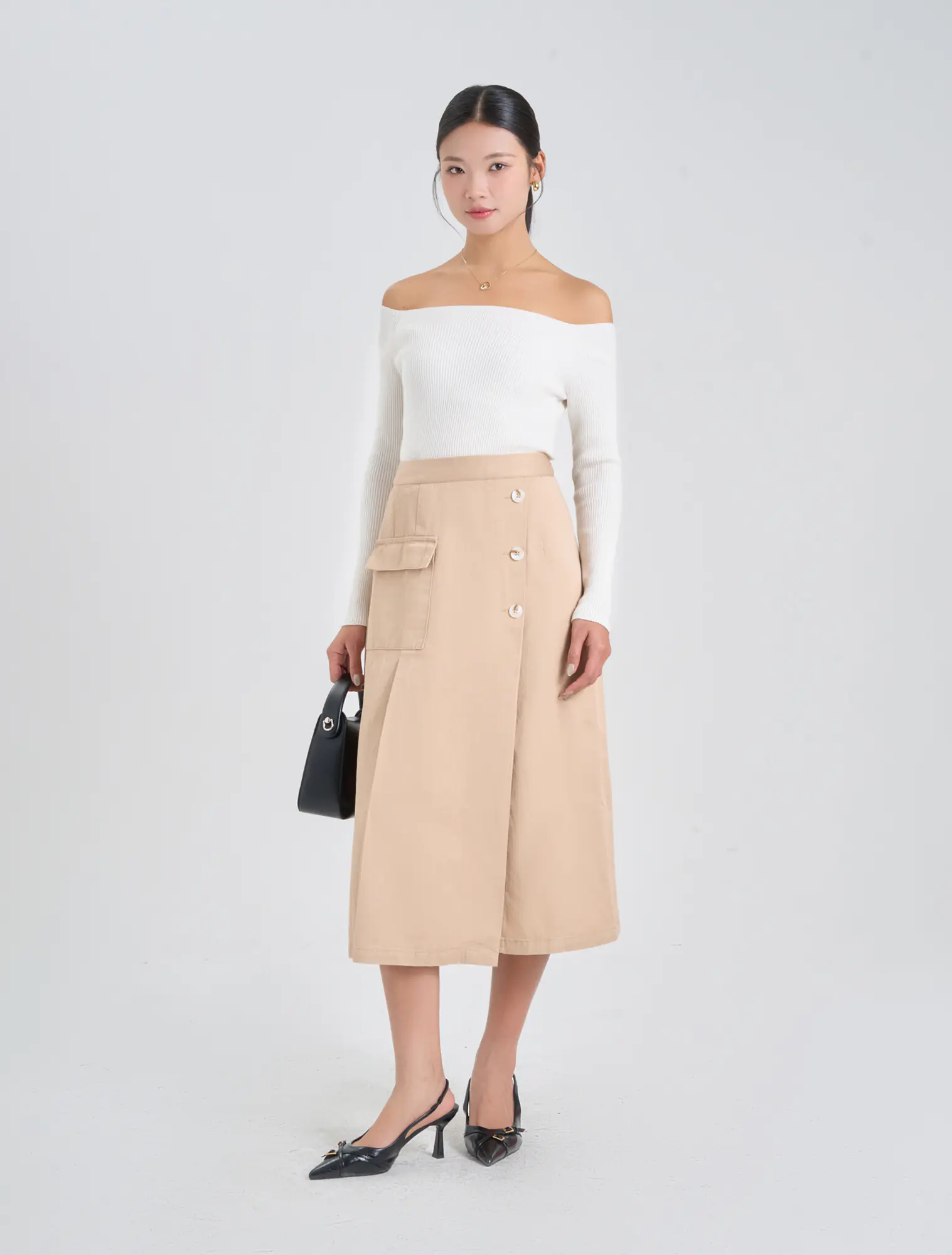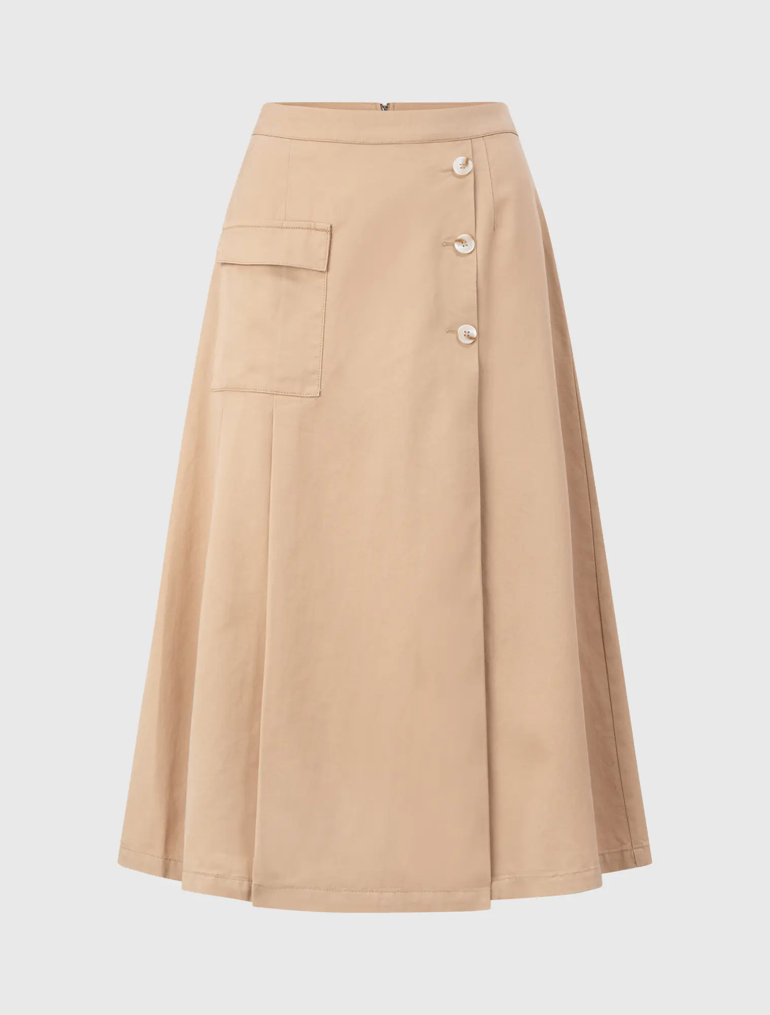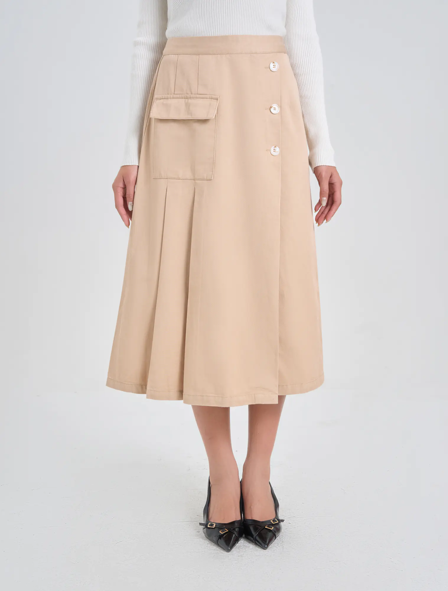 Chân váy khaki nữ dáng midi với các chi tiết túi hộp, xếp ly và vạt lệch tạo nên một sản phẩm thời trang theo xu hướng nhưng vẫn dễ mặc và kết hợp với nhiều sản phẩm.