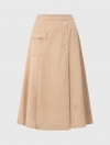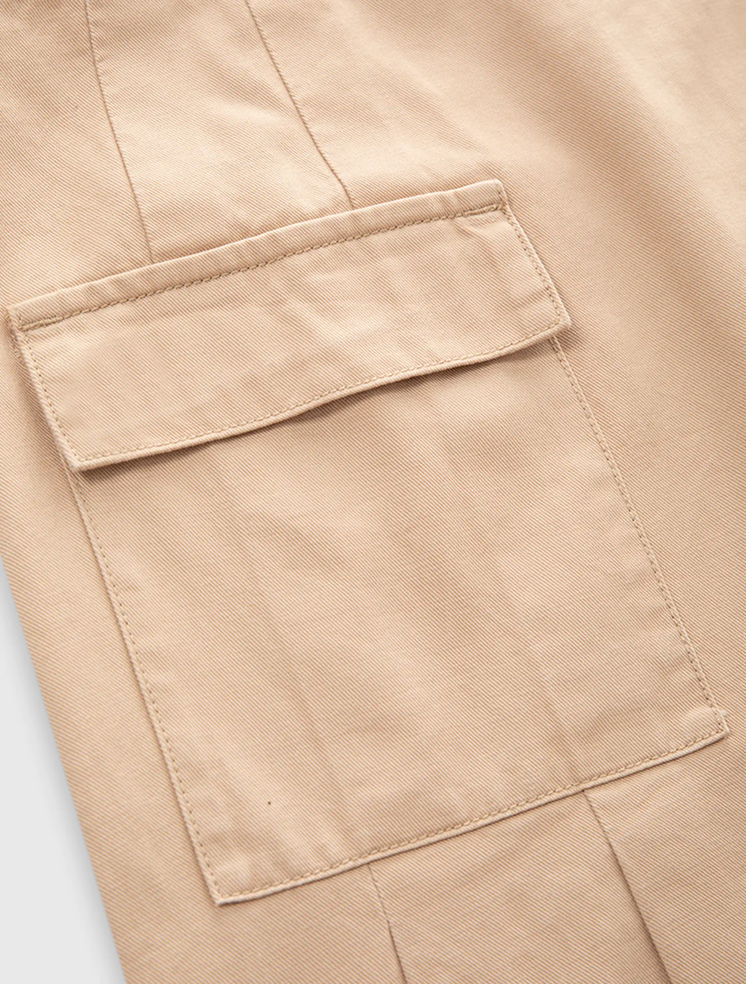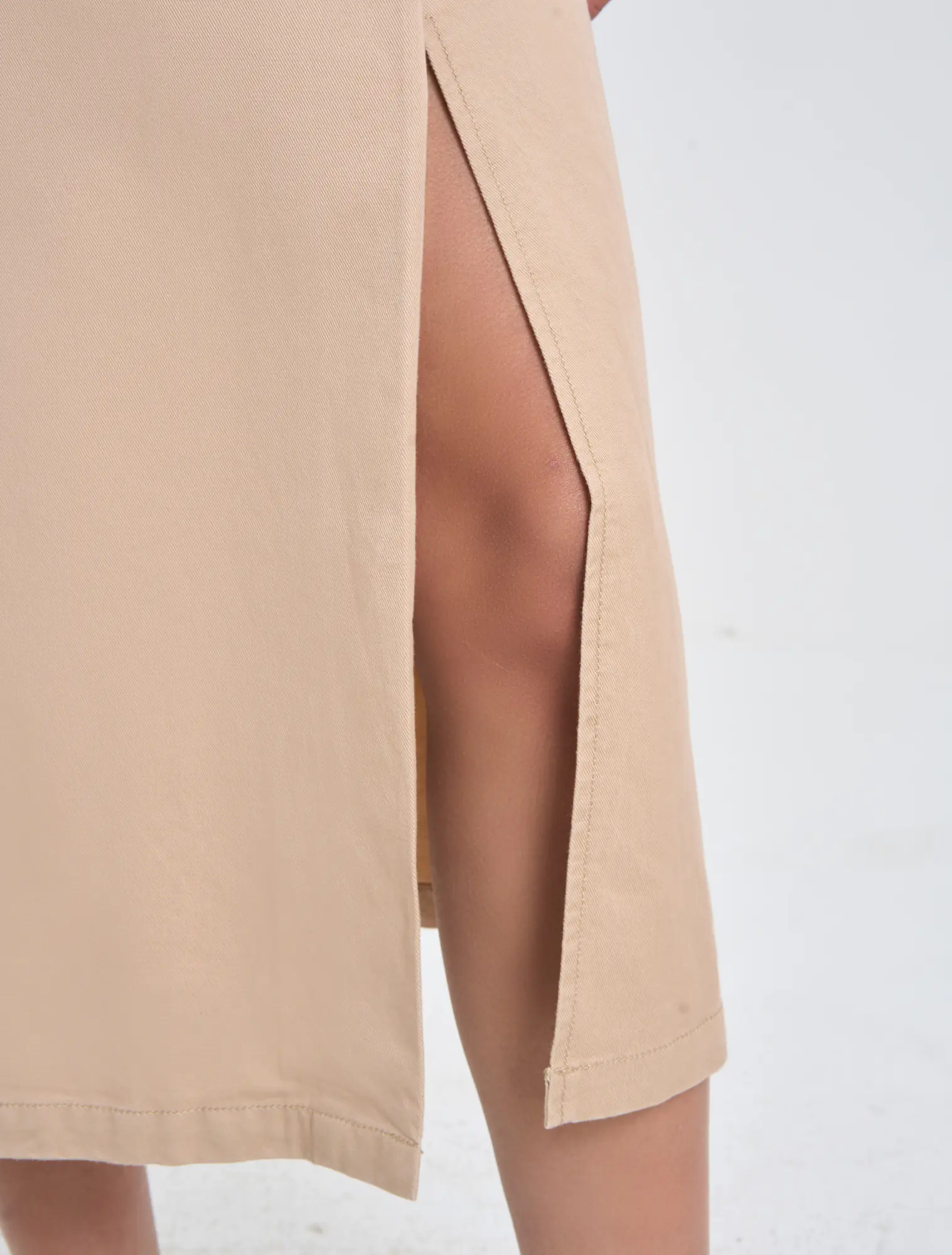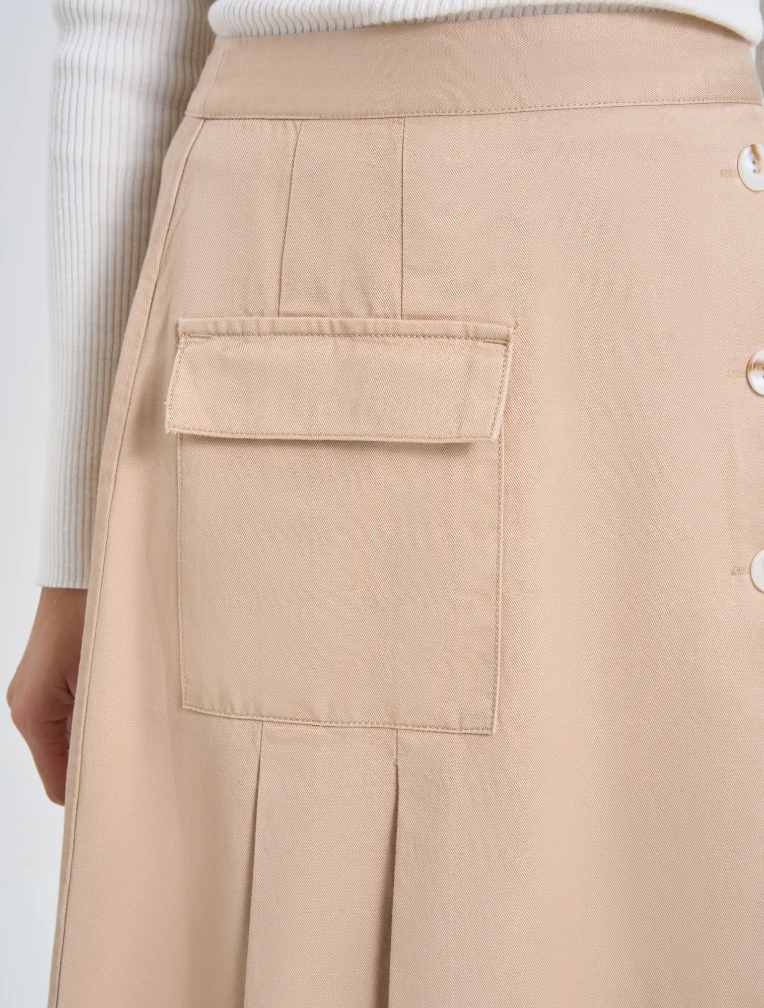 Chân váy khaki nữ dáng midi với các chi tiết túi hộp, xếp ly và vạt lệch tạo nên một sản phẩm thời trang theo xu hướng nhưng vẫn dễ mặc và kết hợp với nhiều sản phẩm.
