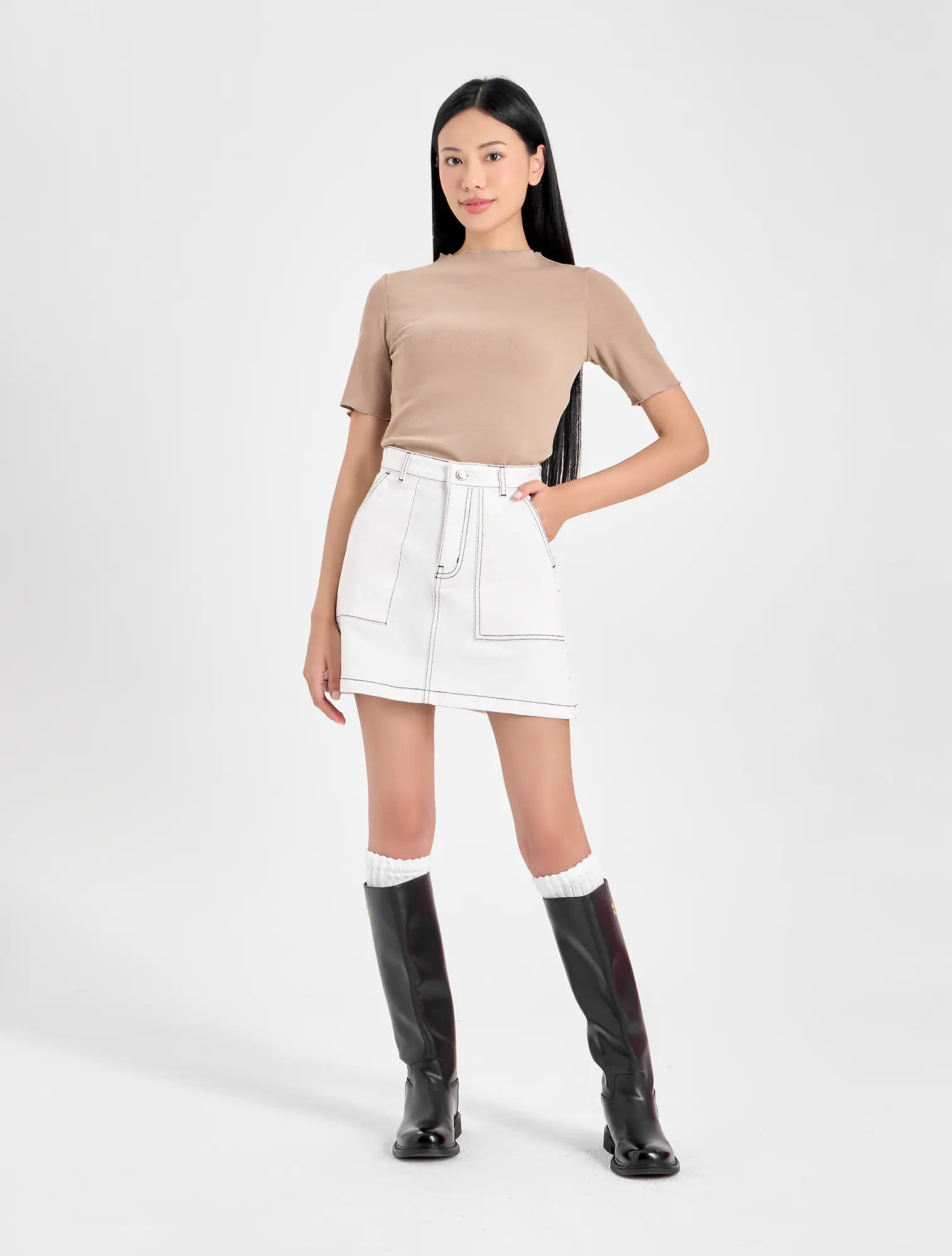 Chân váy khaki nữ dáng A với chi tiết điểm nhấn phối chỉ toàn bộ tạo nên phong cách trẻ trung và mới mẻ.