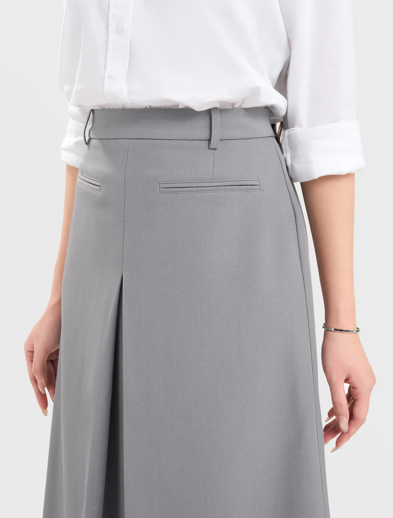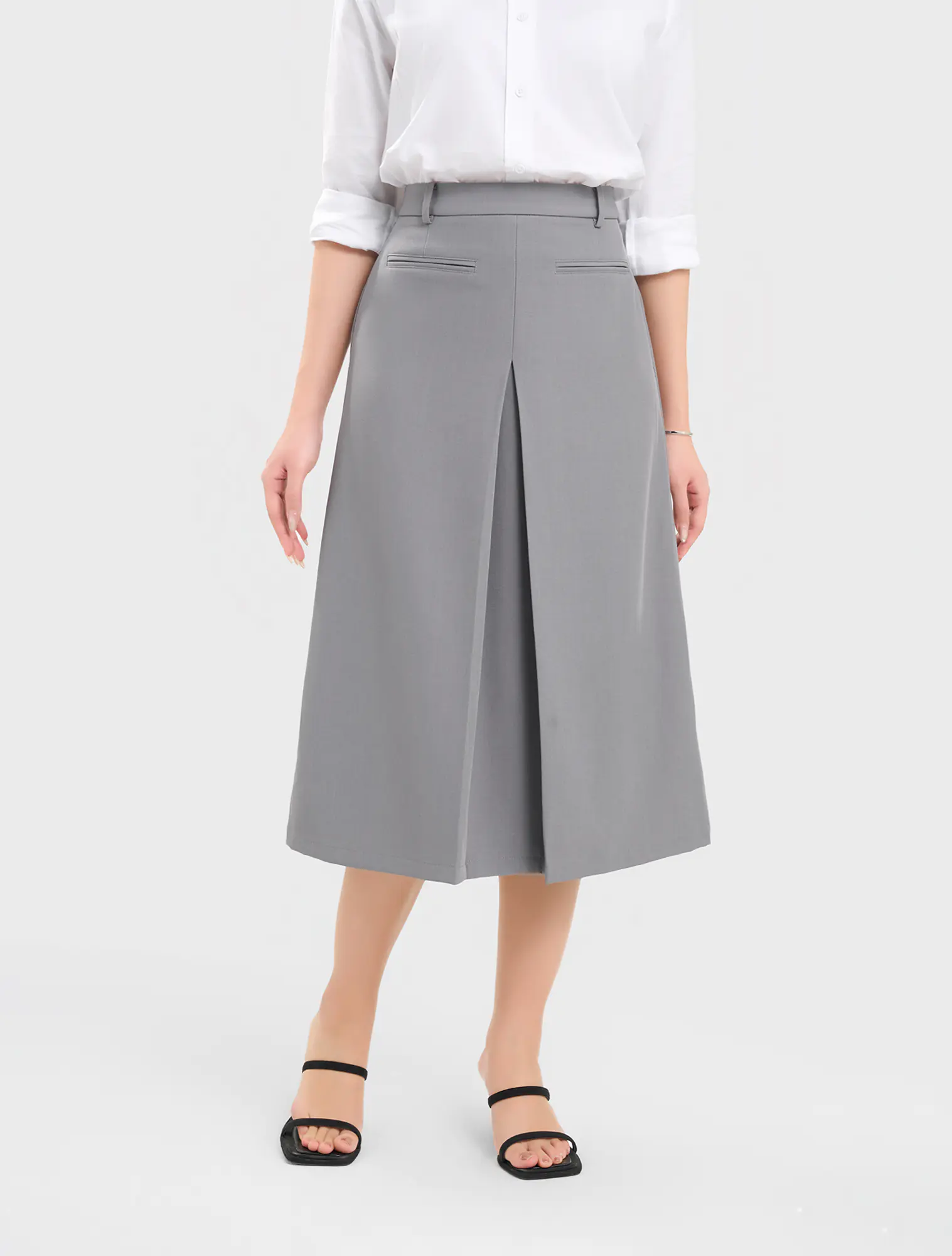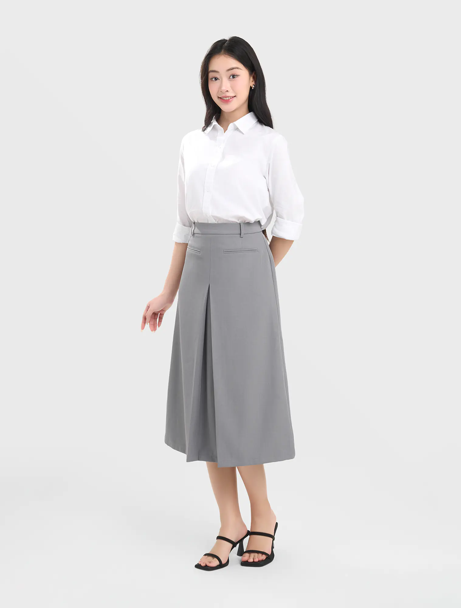 Chân váy nữ dáng A xếp ly. Chất liệu poly pha mềm mại, đứng phom, phù hợp với môi trường văn phòng, công sở.