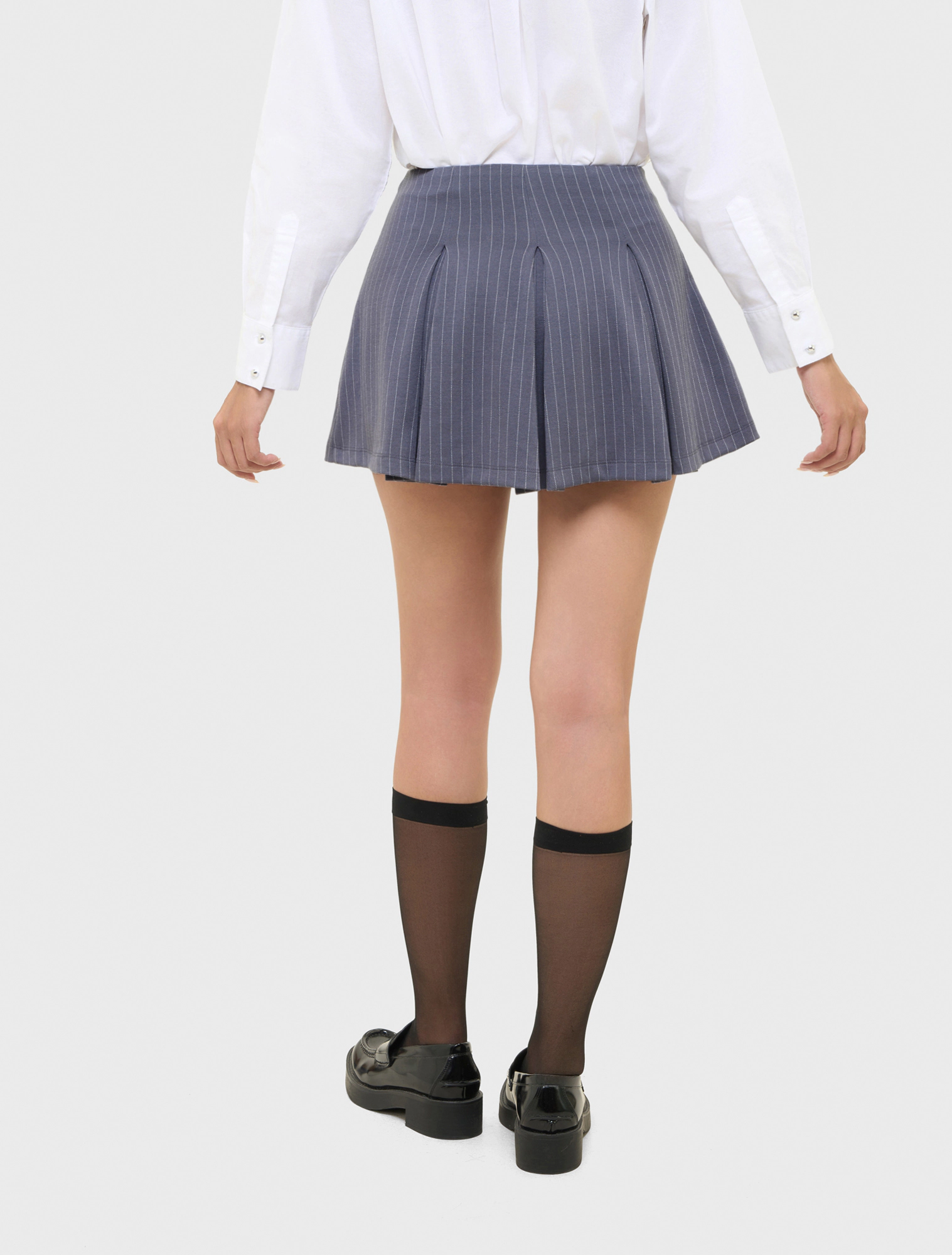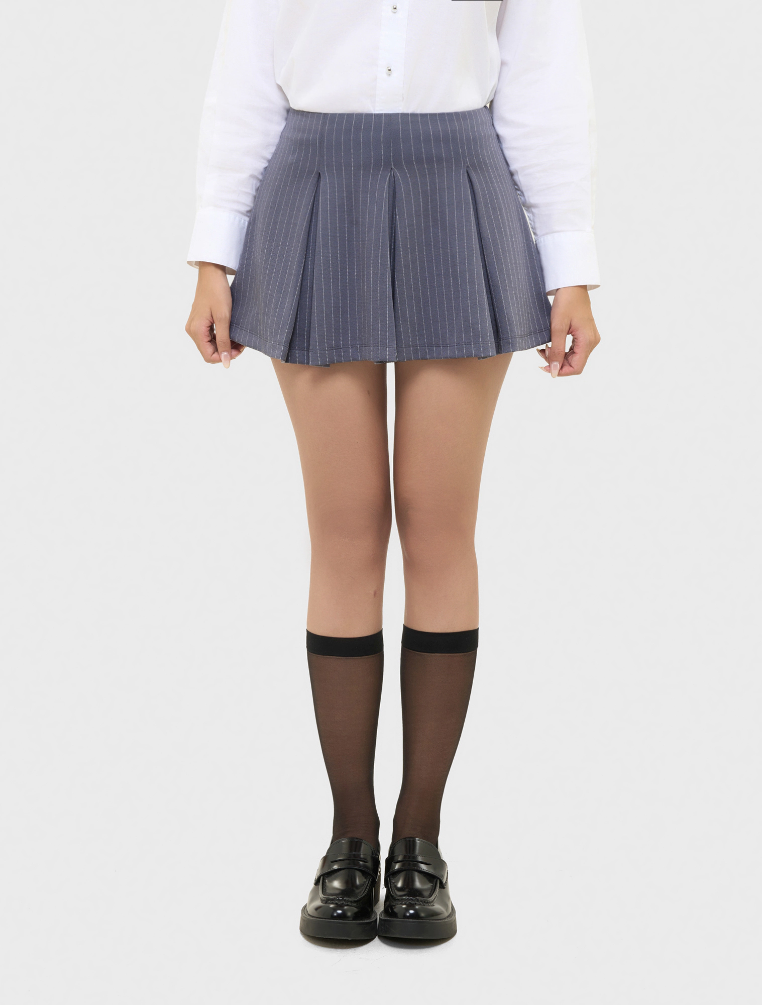 Chân váy nữ ngắn dáng xoè, với các chi tiết xếp ly to tạo độ xoè và vải dệt kẻ sọc nhỏ, thiết kế váy ngắn với quần bên trong tạo sự an toàn tối đa khi sử dụng.
