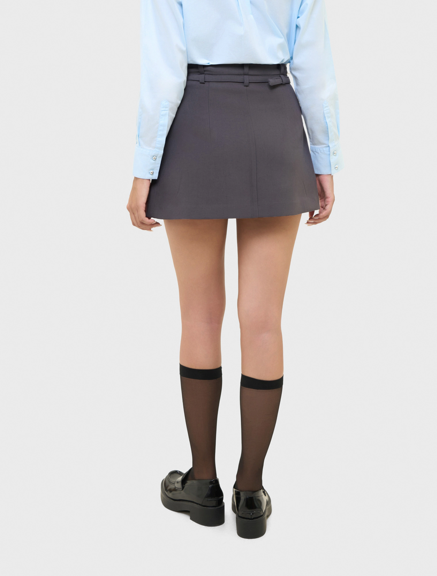 Chân váy nữ xếp ly, dáng ngắn, kéo khóa, có quần lót bên trong, có chi tiết thắt đai ở eo. Chất liệu polyester pha mềm mại. Phù hợp với môi trường đi chơi, dạo phố.