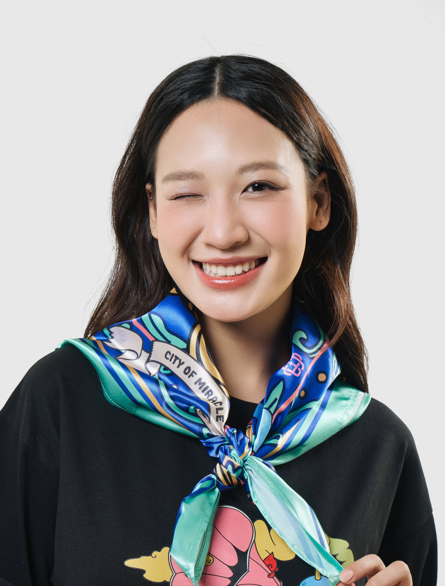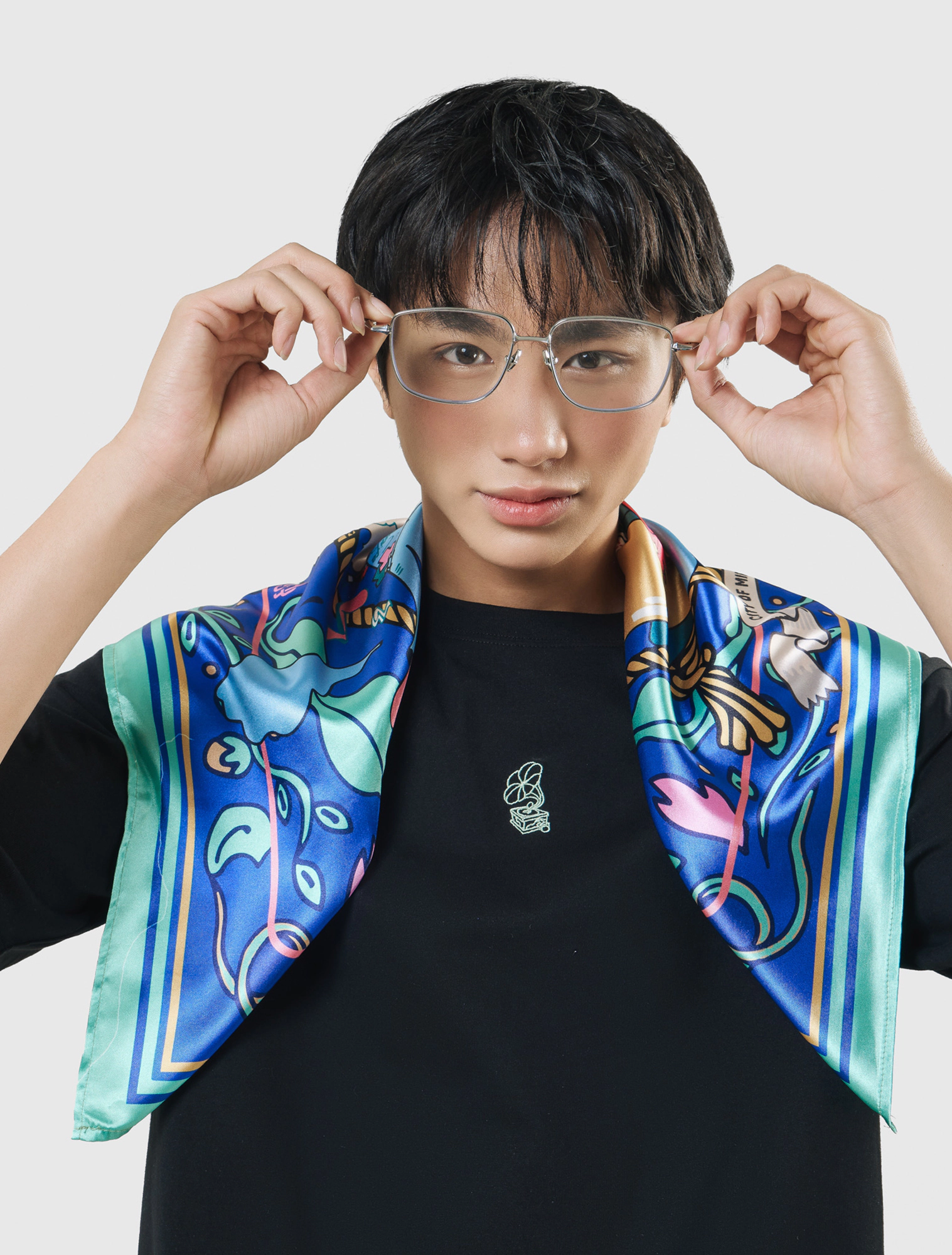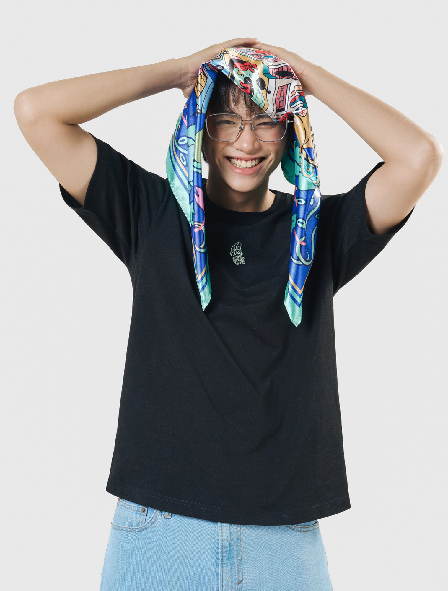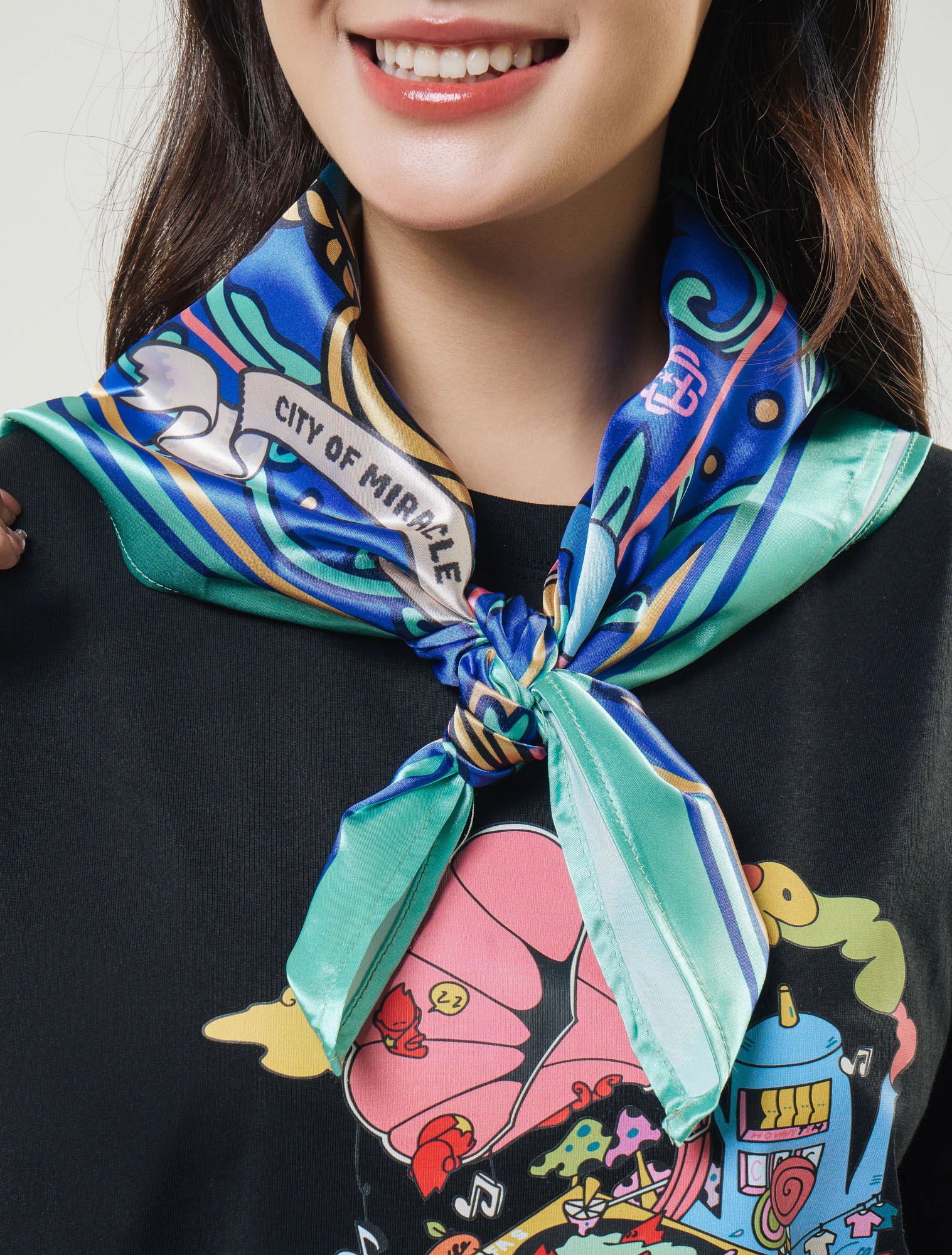 Khăn bandana nổi bật với artwork thành phố mơ màng lênh đênh giữa mây trời, bao quanh bởi khung dây thừng và lá bay, bảng màu rực rỡ hơi hướng pop-art, dễ dàng nâng cấp mọi set đồ streetstyle.